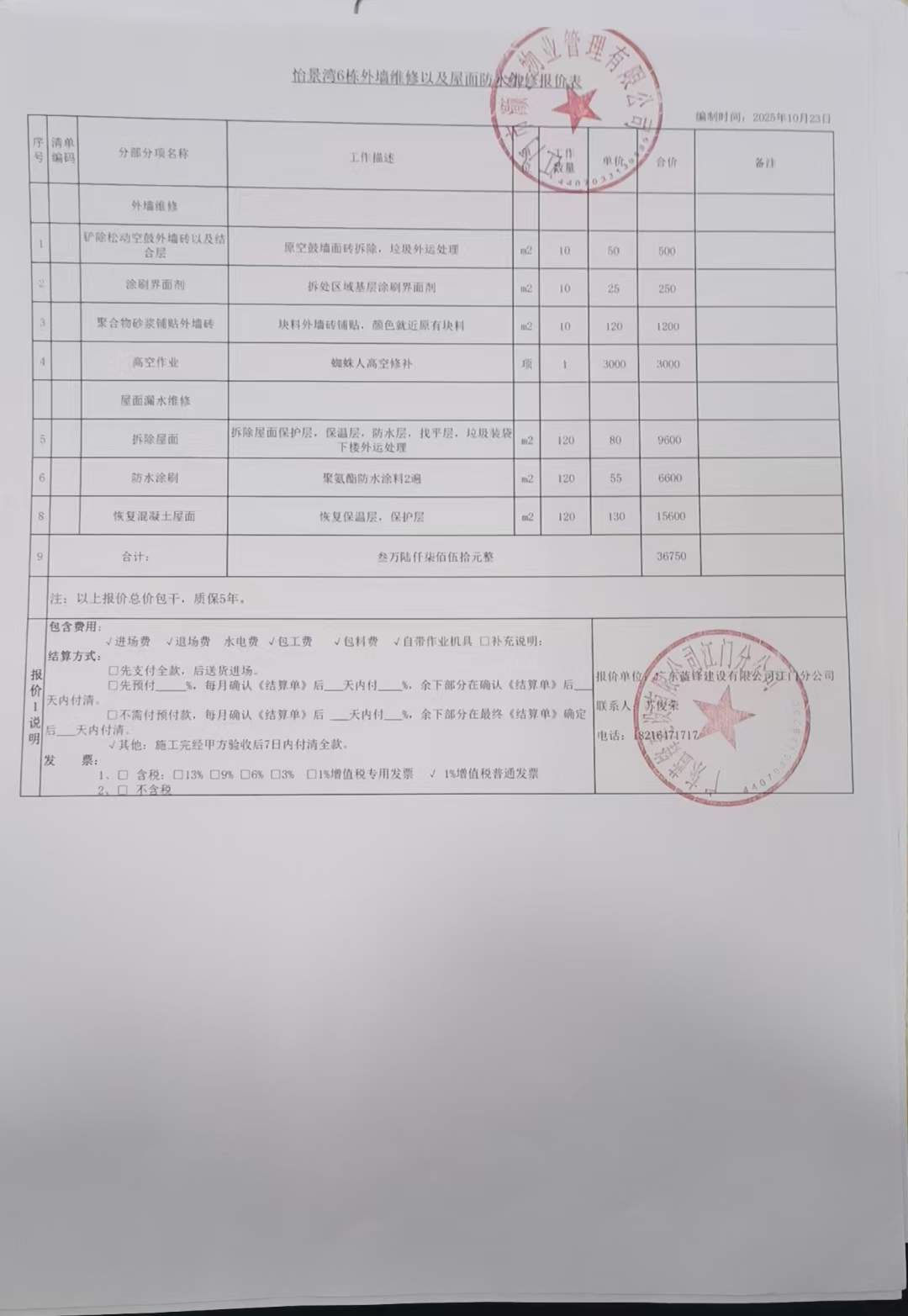 <td VALIGN="top" VALUES="" STYLE="border-width:0" BINDTYPE="0" ROWSPAN="17" COLSPAN="7" DATASOURCE="投票结果" ><font style=" font-family:方正小标宋简体;font-size:14pt;"><p style="line-height: 1.75em;"><span style="font-family: 宋体, SimSun;">各位尊敬的业主:</span><br/></p><p style="text-indent: 2em; line-height: 1.75em;"><span style="font-family: 宋体, SimSun;">根据法律法规的规定,本小区业主利用“江门市物业事项表决管理系统”已对本小区公共事务决策事项(<span style="font-family: 宋体; text-indent: 32px;">蓬江区怡景湾6幢外墙维修以及屋面防水维修工程使用维修资金的投票</span>)进行了表决,在经过7日的询异公示期后,未收到业主有效的异议。现将投票结果公告,并就产生的法律效力说明如下:</span></p><p style="line-height: 1.75em; text-indent: 0em;"><strong style="text-indent: 2em;"><span style="font-family: 宋体, SimSun;">一、投票范围</span></strong></p><p style="text-indent: 2em; line-height: 1.75em;"><span style="font-family: 宋体, SimSun;">蓬江区怡景湾蓬江区怡景湾花园6幢</span></p><p style="text-indent: 2em; line-height: 1.75em;"><span style="font-family: 宋体, SimSun;">总人数(专有部分人数之和):63</span></p><p style="text-indent: 2em; line-height: 1.75em;"><span style="font-family: 宋体, SimSun;"><span style="font-family: 宋体, SimSun; text-indent: 32px;"><span style="font-family: 宋体; text-indent: 32px;"><span style="font-family: 宋体; text-indent: 32px;">总户数:66</span></span></span></span></p><p style="text-indent: 2em; line-height: 1.75em;"><span style="font-family: 宋体, SimSun;">建筑物总面积(专有部分面积之和):7309.13㎡</span></p><p style="line-height: 1.75em;"><strong><span style="font-family: 宋体, SimSun;">二、投票结果公告时间</span></strong></p><p style="text-indent: 2em; line-height: 1.75em;"><span style="font-family: 宋体, SimSun;"><span style="font-family: 宋体, SimSun; text-indent: 32px;">从2026年01月19日开始</span></span></p><p style="line-height: 1.75em;"><strong><span style="font-family: 宋体, SimSun;">三、计票规则</span></strong></p><p style="text-indent: 2em; line-height: 1.75em;"><span style="font-family: 宋体, SimSun;">表决事项:蓬江区怡景湾6幢外墙维修以及屋面防水维修工程使用维修资金<br /><p style='font-family: 宋体, SimSun;line-height: 1.75em; text-indent: 2em;'>计票规则:弃权票不并入其它项&nbsp;&nbsp;&nbsp;&nbsp;未表决票不并入其它项</p></span></p><p style="line-height: 1.75em;"><strong><span style="font-family: 宋体, SimSun;">四、通过规则</span></strong></p><p style="line-height: 1.75em;"><strong><span style="font-family: 宋体, SimSun;">&nbsp; 根据《中华人民共和国民法典》第二百七十八条规定:业主共同决定事项,应当由专有部分面积占比三分之二以上的业主且人数占比三分之二以上的业主参与表决。</span></strong></p><p style="text-indent: 2em; line-height: 1.75em;"><span style="font-family: 宋体, SimSun;"><span style="font-family: 宋体, SimSun; text-indent: 32px;">表决事项:蓬江区怡景湾6幢外墙维修以及屋面防水维修工程使用维修资金<br /><p style='font-family: 宋体, SimSun;line-height: 1.75em; text-indent: 2em;'>通过规则:双2/3以上参与表决,参与表决双过半同意</p></span></span></p><p style="line-height: 1.75em;"><strong><span style="font-family: 宋体, SimSun;">五、投票结果</span></strong></p><p style="line-height: 1.75em; text-indent: 2em;"><span style="font-family: 宋体, SimSun; text-indent: 2em;"><div id='resultTable'><table style='table-layout: fixed; font-size:12px; margin-top:10px' width='100%' border='0' cellspacing='0' cellpadding='0'><tr><td height='28' colspan='10' align='center' style='border: 1px solid #666'><strong style='font-size: 14px;'> 蓬江区怡景湾6幢外墙维修以及屋面防水维修工程使用维修资金</strong></td> </tr><tr id='trfirst'><td height='28' colspan='4' style='border-left: 1px solid #666; border-bottom: 1px solid #666'><strong>&nbsp;申报单位:</strong> 江门市灏宇物业管理有限公司</td><td colspan='3' style='border-left: 1px solid #666; border-bottom: 1px solid #666'><strong>&nbsp;联系方式:</strong> </td><td colspan='3' style='border-left: 1px solid #666; border-bottom: 1px solid #666; border-right: 1px solid #666'><strong>&nbsp;申报日期:</strong> 2025年11月25日 </td></tr><tr> <td height='28' colspan='5' style='border-left: 1px solid #666; border-bottom: 1px solid #666'><strong>&nbsp;列支总人数(专有部分人数之和):</strong>63人 </td><td colspan='5' style='border-left: 1px solid #666; border-bottom: 1px solid #666; border-right: 1px solid #666'><strong>&nbsp;列支建筑物总面积(专有部分面积之和):</strong>7309.13㎡ </td> </tr><tr><td height='28' colspan='10' bgcolor='#F3F3F3' style='border-left: 1px solid #666;border-bottom: 1px solid #666;border-right: 1px solid #666'><strong>&nbsp;参与表决人数及面积统计</strong></td></tr><tr><td height='28' colspan='5' style='border-left: 1px solid #666; border-bottom: 1px solid #666'><strong>&nbsp;参与表决人数:</strong>9人</td><td colspan='5' style='border-left: 1px solid #666; border-bottom: 1px solid #666; border-right: 1px solid #666'><strong>&nbsp;参与表决人数占总人数比例:</strong>14.29%</td></tr><tr><td height='28' colspan='5' style='border-left: 1px solid #666; border-bottom: 1px solid #666'><strong>&nbsp;参与表决面积:</strong>968.93㎡</td><td colspan='5' style='border-left: 1px solid #666; border-bottom: 1px solid #666; border-right: 1px solid #666'><strong>&nbsp;参与表决面积占总面积比例:</strong>13.26%</td></tr><tr><td height='28' colspan='10' bgcolor='#F3F3F3' style='border-left: 1px solid #666; border-bottom: 1px solid #666;border-right: 1px solid #666'> <strong>&nbsp;参与表决同