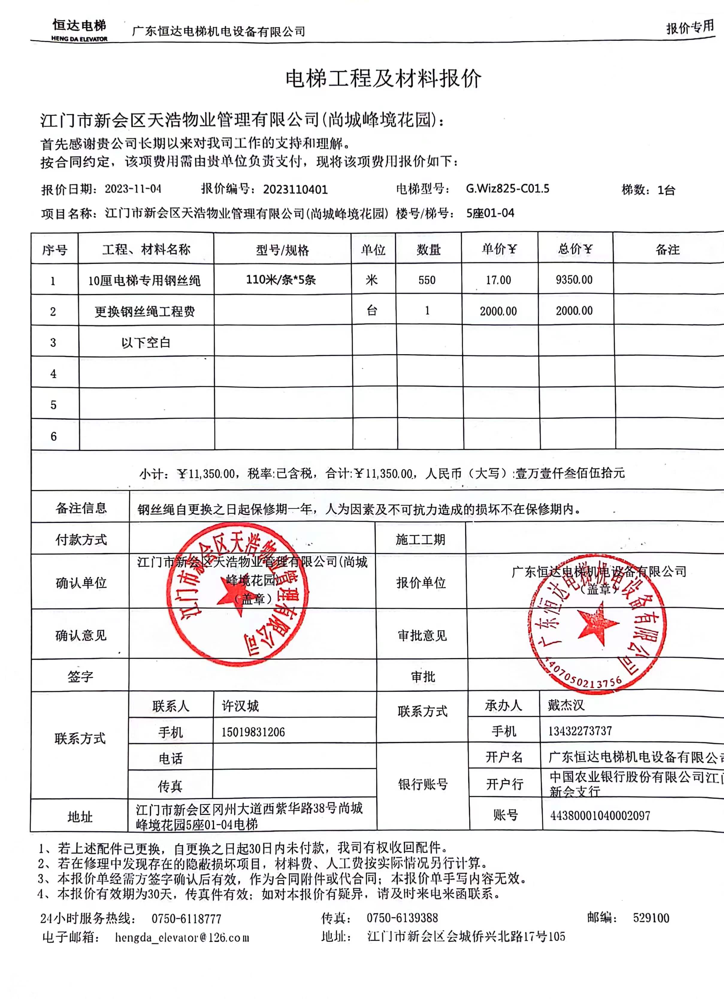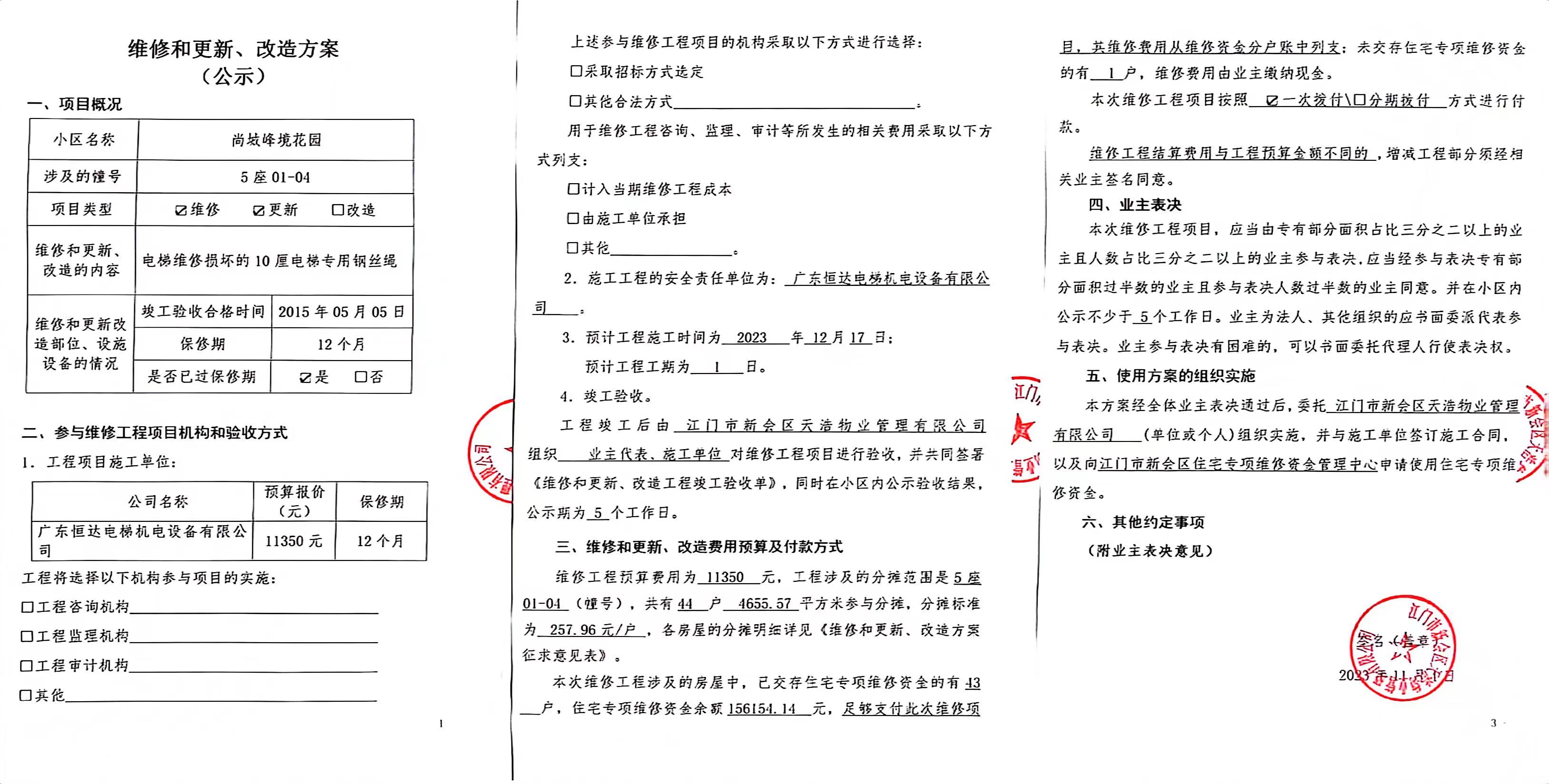 <td VALIGN="top" VALUES="" STYLE="border-width:0" BINDTYPE="0" ROWSPAN="19" COLSPAN="7" DATASOURCE="投票结果" ><font style="font-size:14pt;"><p style="white-space: normal; font-family: 宋体; line-height: 1.75em;">尚城峰境花园尚城峰境花园5座全体业主:</p><p style="white-space: normal; font-family: 宋体; line-height: 1.75em; text-indent: 2em;">本小区关于尚城峰境花园5座01-04电梯(梯粤JX4356)更换电梯专用钢丝绳使用维修资金的投票的投票已表决结束,询异时间从2023年12月12日开始,投票询异公示期间,业主可通过微信查询自己的表决情况或可凭身份证件申请查询自己的表决情况;如公示的业主表决情况与查询的本人表决意见不一致的,可以以书面形式向投票组织机构申诉,投票组织机构予以纠正并重新公示表决结果。异议提出人对投票组织机构的处理仍有异议的,可以向街道办事处(镇人民政府)反映处理,涉及住宅专项维修资金的,可向属地住宅专项维修资金管理中心反映处理。</p><p style="white-space: normal;"><br/></p><p style="white-space: normal; font-family: 宋体; line-height: 1.75em;"><strong>附件:</strong></p><p style="white-space: normal; font-family: 宋体; line-height: 1.75em;"><strong>一、投票范围</strong></p><p style="white-space: normal; font-family: 宋体; line-height: 1.75em; text-indent: 2em;">尚城峰境花园尚城峰境花园5座</p><p style="white-space: normal; font-family: 宋体; line-height: 1.75em; text-indent: 2em;">总人数(专有部分人数之和):44</p><p style="white-space: normal; font-family: 宋体; line-height: 1.75em; text-indent: 2em;"><span style="font-family: 宋体, SimSun;">总户数:44</span></p><p style="white-space: normal; font-family: 宋体; line-height: 1.75em; text-indent: 2em;">建筑物总面积(专有部分面积之和):4655.57㎡</p><p style="white-space: normal; font-family: 宋体; line-height: 1.75em;"><strong>二、询异公示起止时间</strong></p><p dir="ltr" style="white-space: normal; font-family: 宋体; line-height: 1.75em; text-indent: 2em;"><span style="text-indent: 36px;">2023年12月12日至2023年12月18日</span></p><p style="white-space: normal; font-family: 宋体; line-height: 1.75em;"><strong>三、投票详细描述</strong></p><p style="white-space: normal; font-family: 宋体; line-height: 1.75em; text-indent: 2em;"><p><span style="font-family: "Helvetica Neue", Helvetica, Arial, sans-serif; font-size: 14px; text-wrap: wrap; background-color: rgb(255, 255, 255);">尚城峰境花园5座01-04的电梯(梯粤JX4356)10厘电梯专用钢丝绳,经检查确认为</span><span style="font-family: "Helvetica Neue", Helvetica, Arial, sans-serif; font-size: 14px; text-wrap: wrap; background-color: rgb(255, 255, 255);">10厘电梯专用钢丝绳</span><span style="font-family: "Helvetica Neue", Helvetica, Arial, sans-serif; font-size: 14px; text-wrap: wrap; background-color: rgb(255, 255, 255);">损坏,维修和更新改造部位、设施设备已过保修期。现需申请使用维修资金对5座01-04电梯进行维修,工程维修预算金额为11350元,项目最终费用以施工合同签订金额为准。维修费用的分摊标准为按分户分摊,每户分摊257.96元,详见公示附件。如业主手机不能正常通过微信投票,请联系物业公司进行线下纸质投票,物业电话:0750-6682300</span></p></p><p style="white-space: normal; font-family: 宋体; line-height: 1.75em;"><strong>四、计票规则</strong></p><p style="white-space: normal; font-family: 宋体; line-height: 1.75em; text-indent: 2em;">表决事项:使用建筑物及其附属设施的维修资金<br /><p style='text-align: left; font-family: 宋体; font-size: 16px; line-height: 1.75em; text-indent: 2em;'>计票规则:弃权票不并入其它项 未表决票不并入其它项</p></p><p style="white-space: normal; font-family: 宋体; line-height: 1.75em;"><strong>五、通过规则</strong></p><p style="white-space: normal; font-family: 宋体; line-height: 1.75em;"><strong><strong style="white-space: normal;"><span style="font-family: 宋体, SimSun;">&nbsp; 根据《中华人民共和国民法典》第二百七十八条规定:业主共同决定事项,应当由专有部分面积占比三分之二以上的业主且人数占比三分之二以上的业主参与表决。</span></strong></strong></p><p style="white-space: normal; font-family: 宋体; line-height: 1.75em; text-indent: 2em;">表决事项:使用建筑物及其附属设施的维修资金<br /><p style='text-align: left; font-family: 宋体; font-size: 16px; line-height: 1.75em; text-indent: 2em;'>通过规则:参与表决专有部分面积过半数的业主且参与表决人数过半数的业主同意</p></p><p style="white-space: normal; font-family: 宋体; line-height: 1.75em;"><strong>六、投票结果</strong></p><p style="white-space: normal; font-family: 宋体; line-height: 1.75em; text-indent: 2em;"><div id='resultTable'><table style='table-layout: fixed; font-size:12px; margin-top:10px' width='100%' border='0' cellspacing='0' cellpadding='0'><tr><td height='28' colspan='10' align='center' style='border: 1px solid #666'><strong style='font-size: 14px;'> 使用建筑物及其附属设施的维修资金</strong></td> </tr><tr id='trfirst'><td height='28' colspan='4' style='border-left: 1px solid #666; border-bottom: 1px solid #666'><strong> 申报单位:</strong> 江门市新会区天浩物业管理有限公司</td><td colspan='3' style='border-left: 1px solid #666; border-bottom: 1px solid #666'><strong> 联系方式:</strong> </td><td colspan='3' style='border-left: 1px solid #666; border-bottom: 1px solid #666; border-right: 1px solid #666'><strong> 申报日期:</strong> 2023年11月10日 </td></tr><tr> <td height='28' colspan='5' style='border-left: 1px solid #666; border-bottom: 1px solid #666'><strong> 总人数(专有部分人数之和):</strong>44人 </td><td cols