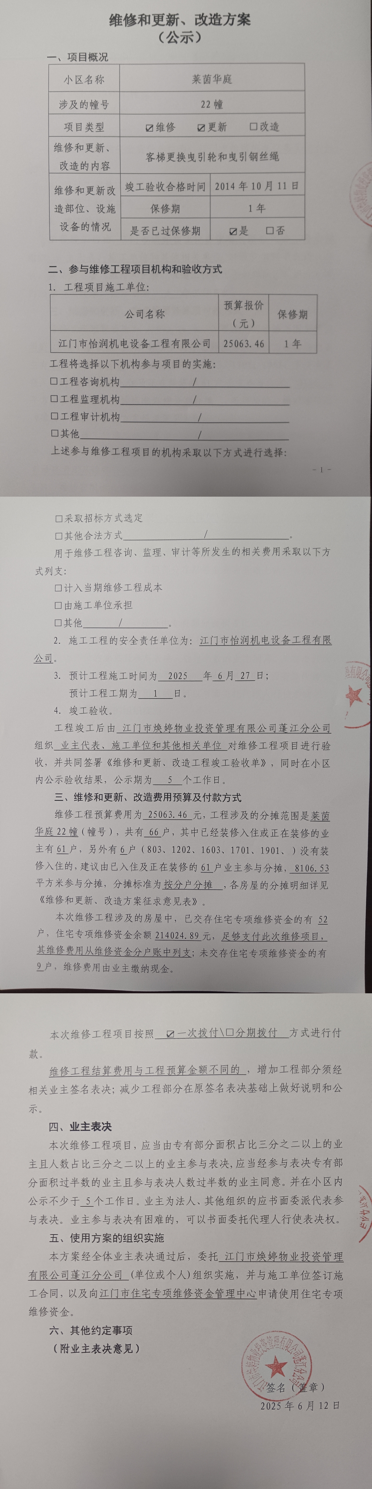 <td VALIGN="top" VALUES="" STYLE="border-width:0" BINDTYPE="0" ROWSPAN="19" COLSPAN="7" DATASOURCE="投票结果" ><font style="font-size:14pt;"><p style="white-space: normal; font-family: 宋体; line-height: 1.75em;">莱茵华庭蓬江区莱茵华庭22幢全体业主:</p><p style="white-space: normal; font-family: 宋体; line-height: 1.75em; text-indent: 2em;">本小区关于莱茵华庭小区22幢客梯更换曳引轮和曳引钢丝绳使用维修资金的投票的投票已表决结束,询异时间从2025年07月16日开始,投票询异公示期间,业主可通过微信查询自己的表决情况或可凭身份证件申请查询自己的表决情况;如公示的业主表决情况与查询的本人表决意见不一致的,可以以书面形式向投票组织机构申诉,投票组织机构予以纠正并重新公示表决结果。异议提出人对投票组织机构的处理仍有异议的,可以向街道办事处(镇人民政府)反映处理,涉及住宅专项维修资金的,可向属地住宅专项维修资金管理中心反映处理。</p><p style="white-space: normal;"><br/></p><p style="white-space: normal; font-family: 宋体; line-height: 1.75em;"><strong>附件:</strong></p><p style="white-space: normal; font-family: 宋体; line-height: 1.75em;"><strong>一、投票范围</strong></p><p style="white-space: normal; font-family: 宋体; line-height: 1.75em; text-indent: 2em;">莱茵华庭蓬江区莱茵华庭22幢</p><p style="white-space: normal; font-family: 宋体; line-height: 1.75em; text-indent: 2em;">总人数(专有部分人数之和):61</p><p style="white-space: normal; font-family: 宋体; line-height: 1.75em; text-indent: 2em;"><span style="font-family: 宋体, SimSun;"><span style="font-family: 宋体; text-indent: 32px;"><span style="font-family: 宋体; text-indent: 32px;">总户数:61</span></span></span></p><p style="white-space: normal; font-family: 宋体; line-height: 1.75em; text-indent: 2em;">建筑物总面积(专有部分面积之和):8106.53㎡</p><p style="white-space: normal; font-family: 宋体; line-height: 1.75em;"><strong>二、询异公示起止时间</strong></p><p dir="ltr" style="white-space: normal; font-family: 宋体; line-height: 1.75em; text-indent: 2em;"><span style="text-indent: 36px;">2025年07月16日至2025年07月26日</span></p><p style="white-space: normal; font-family: 宋体; line-height: 1.75em;"><strong>三、投票详细描述</strong></p><p style="white-space: normal; font-family: 宋体; line-height: 1.75em; text-indent: 2em;"><p> 小区22幢的客梯运行时出现异响,经电梯维保公司检查发现曳引轮绳槽磨损下陷,曳引钢丝绳严重锈蚀、磨损导致钢丝绳跳槽而产生异响,需要更换电梯曳引钢丝绳和曳引轮才能恢复电梯的正常运行。</p><p> 现对22幢客梯进行维修,工程维修预算金额为25063.46元,项目最终费用以施工合同签订金额为准。因已过保修期,维修费用由相关业主按分户分摊,每户约410.88元,详见公示附件。如业主手机不能正常通过微信投票,请联系物业公司进行线下纸质投票,物业电话:0750-3212633。</p><p><br style="font-family: "Helvetica Neue", Helvetica, Arial, sans-serif; font-size: 14px; white-space: normal; background-color: rgb(255, 255, 255);"/></p><p><br style="font-family: "Helvetica Neue", Helvetica, Arial, sans-serif; font-size: 14px; white-space: normal; background-color: rgb(255, 255, 255);"/></p><p><br/></p></p><p style="white-space: normal; font-family: 宋体; line-height: 1.75em;"><strong>四、计票规则</strong></p><p style="white-space: normal; font-family: 宋体; line-height: 1.75em; text-indent: 2em;">表决事项:使用建筑物及其附属设施的维修资金<br /><p style='text-align: left; font-family: 宋体; font-size: 16px; line-height: 1.75em; text-indent: 2em;'>计票规则:弃权票不并入其它项 未表决票不并入其它项</p></p><p style="white-space: normal; font-family: 宋体; line-height: 1.75em;"><strong>五、通过规则</strong></p><p style="white-space: normal; font-family: 宋体; line-height: 1.75em;"><strong><strong style="white-space: normal;"><span style="font-family: 宋体, SimSun;"> 根据《中华人民共和国民法典》第二百七十八条规定:业主共同决定事项,应当由专有部分面积占比三分之二以上的业主且人数占比三分之二以上的业主参与表决。</span></strong></strong></p><p style="white-space: normal; font-family: 宋体; line-height: 1.75em; text-indent: 2em;">表决事项:使用建筑物及其附属设施的维修资金<br /><p style='text-align: left; font-family: 宋体; font-size: 16px; line-height: 1.75em; text-indent: 2em;'>通过规则:双2/3以上参与表决,参与表决双过半同意</p></p><p style="white-space: normal; font-family: 宋体; line-height: 1.75em;"><strong>六、投票结果</strong></p><p style="white-space: normal; font-family: 宋体; line-height: 1.75em; text-indent: 2em;"><div id='resultTable'><table style='table-layout: fixed; font-size:12px; margin-top:10px' width='100%' border='0' cellspacing='0' cellpadding='0'><tr><td height='28' colspan='10' align='center' style='border: 1px solid #666'><strong style='font-size: 14px;'> 使用建筑物及其附属设施的维修资金</strong></td> </tr><tr id='trfirst'><td height='28' colspan='4' style='border-left: 1px solid #666; border-bottom: 1px solid #666'><strong> 申报单位:</strong> 江门市焕婷物业投资管理有限公司蓬江分公司</td><td colspan='3' style='border-left: 1px solid #666; border-bottom: 1px solid #666'><strong> 联系方式:</strong> 3211392 </td><td colspan='3' style='border-left: 1px solid #666; border-bottom: 1px solid #666; border-right: 1px solid #666'><strong> 申报日期:</strong> 2025年6月12日 </td></tr><tr> <td height='28' colspan='5' style='border-left: 1px solid #666; border-bottom: 1px solid #666'><strong> 总人数(专有部分人数之和):</strong>61人 </td>