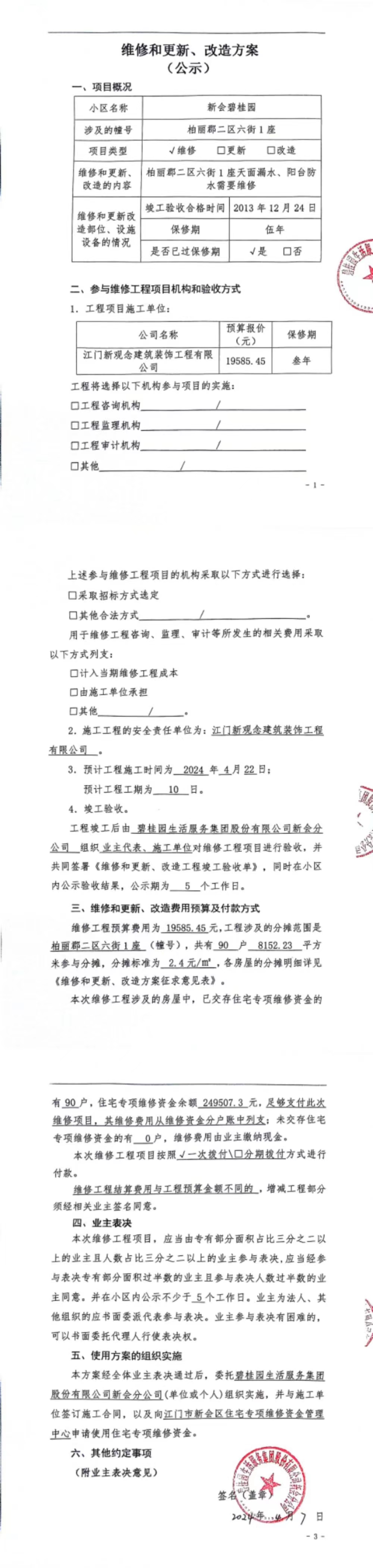 <td VALIGN="top" VALUES="" STYLE="border-width:0" BINDTYPE="0" ROWSPAN="19" COLSPAN="7" DATASOURCE="投票结果" ><font style="font-size:14pt;"><p style="white-space: normal; font-family: 宋体; line-height: 1.75em;">新会碧桂园柏丽郡二区六街1座全体业主:</p><p style="white-space: normal; font-family: 宋体; line-height: 1.75em; text-indent: 2em;">本小区关于新会碧桂园柏丽郡二区六街1座天面漏水、阳台防水维修使用维修资金的投票的投票已表决结束,询异时间从2024年06月25日开始,投票询异公示期间,业主可通过微信查询自己的表决情况或可凭身份证件申请查询自己的表决情况;如公示的业主表决情况与查询的本人表决意见不一致的,可以以书面形式向投票组织机构申诉,投票组织机构予以纠正并重新公示表决结果。异议提出人对投票组织机构的处理仍有异议的,可以向街道办事处(镇人民政府)反映处理,涉及住宅专项维修资金的,可向属地住宅专项维修资金管理中心反映处理。</p><p style="white-space: normal;"><br/></p><p style="white-space: normal; font-family: 宋体; line-height: 1.75em;"><strong>附件:</strong></p><p style="white-space: normal; font-family: 宋体; line-height: 1.75em;"><strong>一、投票范围</strong></p><p style="white-space: normal; font-family: 宋体; line-height: 1.75em; text-indent: 2em;">新会碧桂园柏丽郡二区六街1座</p><p style="white-space: normal; font-family: 宋体; line-height: 1.75em; text-indent: 2em;">总人数(专有部分人数之和):87</p><p style="white-space: normal; font-family: 宋体; line-height: 1.75em; text-indent: 2em;"><span style="font-family: 宋体, SimSun;"><span style="font-family: 宋体; text-indent: 32px;"><span style="font-family: 宋体; text-indent: 32px;">总户数:90</span></span></span></p><p style="white-space: normal; font-family: 宋体; line-height: 1.75em; text-indent: 2em;">建筑物总面积(专有部分面积之和):8152.23㎡</p><p style="white-space: normal; font-family: 宋体; line-height: 1.75em;"><strong>二、询异公示起止时间</strong></p><p dir="ltr" style="white-space: normal; font-family: 宋体; line-height: 1.75em; text-indent: 2em;"><span style="text-indent: 36px;">2024年06月25日至2024年07月01日</span></p><p style="white-space: normal; font-family: 宋体; line-height: 1.75em;"><strong>三、投票详细描述</strong></p><p style="white-space: normal; font-family: 宋体; line-height: 1.75em; text-indent: 2em;"><p><span style="font-family: "Helvetica Neue", Helvetica, Arial, sans-serif; font-size: 14px; background-color: rgb(255, 255, 255);">新会碧桂园柏丽郡二区六街1座天面渗漏水,经检查,是由于交楼有9年时间防水层部份已失效,导致天面出现漏水现象,已过保修期。现申请使用维修资金对新会碧桂园柏丽郡二区六街1座天面及其顶楼几个阳台进行维修和做防水,工程维修预算约19585.45元,项目最终费用以施工合同签订为准,维修费用的分摊标准按建筑面积分摊,每平方约2.4元,详见公示,如果有业主手机不能正常通过微信投票的,请联系物业公司进行线下纸质投票,物业电话18088896996温管家.</span></p></p><p style="white-space: normal; font-family: 宋体; line-height: 1.75em;"><strong>四、计票规则</strong></p><p style="white-space: normal; font-family: 宋体; line-height: 1.75em; text-indent: 2em;">表决事项:使用建筑物及其附属设施的维修资金<br /><p style='text-align: left; font-family: 宋体; font-size: 16px; line-height: 1.75em; text-indent: 2em;'>计票规则:弃权票不并入其它项 未表决票不并入其它项</p></p><p style="white-space: normal; font-family: 宋体; line-height: 1.75em;"><strong>五、通过规则</strong></p><p style="white-space: normal; font-family: 宋体; line-height: 1.75em;"><strong><strong style="white-space: normal;"><span style="font-family: 宋体, SimSun;"> 根据《中华人民共和国民法典》第二百七十八条规定:业主共同决定事项,应当由专有部分面积占比三分之二以上的业主且人数占比三分之二以上的业主参与表决。</span></strong></strong></p><p style="white-space: normal; font-family: 宋体; line-height: 1.75em; text-indent: 2em;">表决事项:使用建筑物及其附属设施的维修资金<br /><p style='text-align: left; font-family: 宋体; font-size: 16px; line-height: 1.75em; text-indent: 2em;'>通过规则:双2/3以上参与表决,参与表决双过半同意</p></p><p style="white-space: normal; font-family: 宋体; line-height: 1.75em;"><strong>六、投票结果</strong></p><p style="white-space: normal; font-family: 宋体; line-height: 1.75em; text-indent: 2em;"><div id='resultTable'><table style='table-layout: fixed; font-size:12px; margin-top:10px' width='100%' border='0' cellspacing='0' cellpadding='0'><tr><td height='28' colspan='10' align='center' style='border: 1px solid #666'><strong style='font-size: 14px;'> 使用建筑物及其附属设施的维修资金</strong></td> </tr><tr id='trfirst'><td height='28' colspan='4' style='border-left: 1px solid #666; border-bottom: 1px solid #666'><strong> 申报单位:</strong> 碧桂园生活服务集团股份有限公司新会分公司</td><td colspan='3' style='border-left: 1px solid #666; border-bottom: 1px solid #666'><strong> 联系方式:</strong> </td><td colspan='3' style='border-left: 1px solid #666; border-bottom: 1px solid #666; border-right: 1px solid #666'><strong> 申报日期:</strong> 2024年4月19日 </td></tr><tr> <td height='28' colspan='5' style='border-left: 1px solid #666; border-bottom: 1px solid #666'><strong> 总人数(专有部分人数之和):</strong>87人 </td><td colspan='5' style='border-left: 1px solid #666; border-bottom: 1px solid #666; border-right: 1px solid #666'><strong> 建筑物总面积(专有部分面积之和):</strong>8152.23㎡ </td> </tr><tr><td 