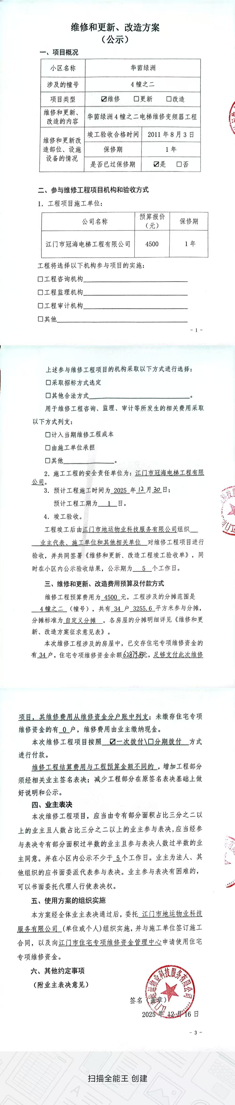 <td VALIGN="top" VALUES="" STYLE="border-width:0" BINDTYPE="0" ROWSPAN="17" COLSPAN="7" DATASOURCE="投票结果" ><font style=" font-family:方正小标宋简体;font-size:14pt;"><p style="line-height: 1.75em;"><span style="font-family: 宋体, SimSun;">各位尊敬的业主:</span><br/></p><p style="text-indent: 2em; line-height: 1.75em;"><span style="font-family: 宋体, SimSun;">根据法律法规的规定,本小区业主利用“江门市物业事项表决管理系统”已对本小区公共事务决策事项(<span style="font-family: 宋体; text-indent: 32px;">华茵绿洲4幢之二电梯维修变频器工程使用维修资金的投票</span>)进行了表决,在经过7日的询异公示期后,未收到业主有效的异议。现将投票结果公告,并就产生的法律效力说明如下:</span></p><p style="line-height: 1.75em; text-indent: 0em;"><strong style="text-indent: 2em;"><span style="font-family: 宋体, SimSun;">一、投票范围</span></strong></p><p style="text-indent: 2em; line-height: 1.75em;"><span style="font-family: 宋体, SimSun;">华茵绿洲江门市江海区华茵绿洲4幢</span></p><p style="text-indent: 2em; line-height: 1.75em;"><span style="font-family: 宋体, SimSun;">总人数(专有部分人数之和):34</span></p><p style="text-indent: 2em; line-height: 1.75em;"><span style="font-family: 宋体, SimSun;"><span style="font-family: 宋体, SimSun; text-indent: 32px;"><span style="font-family: 宋体; text-indent: 32px;"><span style="font-family: 宋体; text-indent: 32px;">总户数:34</span></span></span></span></p><p style="text-indent: 2em; line-height: 1.75em;"><span style="font-family: 宋体, SimSun;">建筑物总面积(专有部分面积之和):3255.60㎡</span></p><p style="line-height: 1.75em;"><strong><span style="font-family: 宋体, SimSun;">二、投票结果公告时间</span></strong></p><p style="text-indent: 2em; line-height: 1.75em;"><span style="font-family: 宋体, SimSun;"><span style="font-family: 宋体, SimSun; text-indent: 32px;">从2026年01月05日开始</span></span></p><p style="line-height: 1.75em;"><strong><span style="font-family: 宋体, SimSun;">三、计票规则</span></strong></p><p style="text-indent: 2em; line-height: 1.75em;"><span style="font-family: 宋体, SimSun;">表决事项:华茵绿洲4幢之二电梯维修变频器工程使用维修资金的投票<br /><p style='font-family: 宋体, SimSun;line-height: 1.75em; text-indent: 2em;'>计票规则:弃权票不并入其它项&nbsp;&nbsp;&nbsp;&nbsp;未表决票不并入其它项</p></span></p><p style="line-height: 1.75em;"><strong><span style="font-family: 宋体, SimSun;">四、通过规则</span></strong></p><p style="line-height: 1.75em;"><strong><span style="font-family: 宋体, SimSun;">&nbsp; 根据《中华人民共和国民法典》第二百七十八条规定:业主共同决定事项,应当由专有部分面积占比三分之二以上的业主且人数占比三分之二以上的业主参与表决。</span></strong></p><p style="text-indent: 2em; line-height: 1.75em;"><span style="font-family: 宋体, SimSun;"><span style="font-family: 宋体, SimSun; text-indent: 32px;">表决事项:华茵绿洲4幢之二电梯维修变频器工程使用维修资金的投票<br /><p style='font-family: 宋体, SimSun;line-height: 1.75em; text-indent: 2em;'>通过规则:双2/3以上参与表决,参与表决双过半同意</p></span></span></p><p style="line-height: 1.75em;"><strong><span style="font-family: 宋体, SimSun;">五、投票结果</span></strong></p><p style="line-height: 1.75em; text-indent: 2em;"><span style="font-family: 宋体, SimSun; text-indent: 2em;"><div id='resultTable'><table style='table-layout: fixed; font-size:12px; margin-top:10px' width='100%' border='0' cellspacing='0' cellpadding='0'><tr><td height='28' colspan='10' align='center' style='border: 1px solid #666'><strong style='font-size: 14px;'> 华茵绿洲4幢之二电梯维修变频器工程使用维修资金的投票</strong></td> </tr><tr id='trfirst'><td height='28' colspan='4' style='border-left: 1px solid #666; border-bottom: 1px solid #666'><strong>&nbsp;申报单位:</strong> 江门市地运物业科技服务有限公司</td><td colspan='3' style='border-left: 1px solid #666; border-bottom: 1px solid #666'><strong>&nbsp;联系方式:</strong> </td><td colspan='3' style='border-left: 1px solid #666; border-bottom: 1px solid #666; border-right: 1px solid #666'><strong>&nbsp;申报日期:</strong> 2025年12月16日 </td></tr><tr> <td height='28' colspan='5' style='border-left: 1px solid #666; border-bottom: 1px solid #666'><strong>&nbsp;列支总人数(专有部分人数之和):</strong>34人 </td><td colspan='5' style='border-left: 1px solid #666; border-bottom: 1px solid #666; border-right: 1px solid #666'><strong>&nbsp;列支建筑物总面积(专有部分面积之和):</strong>3255.60㎡ </td> </tr><tr><td height='28' colspan='10' bgcolor='#F3F3F3' style='border-left: 1px solid #666;border-bottom: 1px solid #666;border-right: 1px solid #666'><strong>&nbsp;参与表决人数及面积统计</strong></td></tr><tr><td height='28' colspan='5' style='border-left: 1px solid #666; border-bottom: 1px solid #666'><strong>&nbsp;参与表决人数:</strong>28人</td><td colspan='5' style='border-left: 1px solid #666; border-bottom: 1px solid #666; border-right: 1px solid #666'><strong>&nbsp;参与表决人数占总人数比例:</strong>82.35%</td></tr><tr><td height='28' colspan='5' style='border-left: 1px solid #666; border-bottom: 1px solid #666'><strong>&nbsp;参与表决面积:</strong>2607.84㎡</td><td colspan='5' style='border-left: 1px solid #666; border-bottom: 1px solid #666; border-right: 1px solid #666'><strong>&nbsp;参与表决面积占总面积比例:</strong>80.10%</td></tr><tr><td height='28' colspan='10' bgcolor='#F3F3F3' style='border-left: 1px solid #666; border-bottom: 1px solid #666;border-right: 1px solid #666'> <strong>&nbsp;参与表决同意人数及面积统计<
