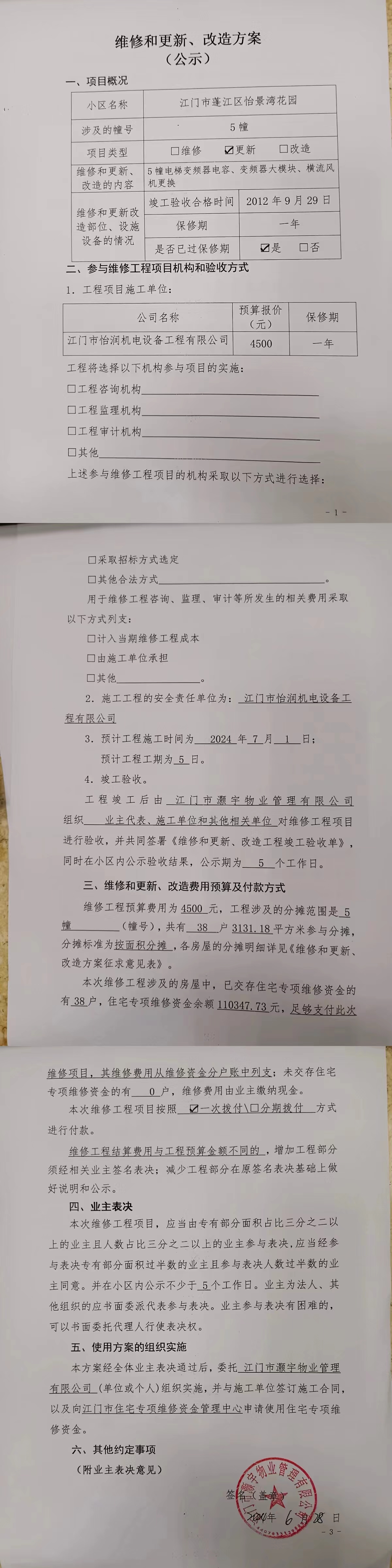 <td VALIGN="top" VALUES="" STYLE="border-width:0" BINDTYPE="0" ROWSPAN="17" COLSPAN="7" DATASOURCE="投票结果" ><font style=" font-family:方正小标宋简体;font-size:14pt;"><p style="line-height: 1.75em;"><span style="font-family: 宋体, SimSun;">各位尊敬的业主:</span><br/></p><p style="text-indent: 2em; line-height: 1.75em;"><span style="font-family: 宋体, SimSun;">根据法律法规的规定,本小区业主利用“江门市物业事项表决管理系统”已对本小区公共事务决策事项进行了表决,在经过7日的询异公示期后,未收到业主有效的异议。现将投票结果公告,并就产生的法律效力说明如下:</span></p><p style="line-height: 1.75em; text-indent: 0em;"><strong style="text-indent: 2em;"><span style="font-family: 宋体, SimSun;">一、投票范围</span></strong></p><p style="text-indent: 2em; line-height: 1.75em;"><span style="font-family: 宋体, SimSun;">蓬江区怡景湾蓬江区怡景湾花园5幢</span></p><p style="text-indent: 2em; line-height: 1.75em;"><span style="font-family: 宋体, SimSun;">总人数(专有部分人数之和):23</span></p><p style="text-indent: 2em; line-height: 1.75em;"><span style="font-family: 宋体, SimSun;"><span style="font-family: 宋体, SimSun; text-indent: 32px;"><span style="font-family: 宋体; text-indent: 32px;"><span style="font-family: 宋体; text-indent: 32px;">总户数:38</span></span></span></span></p><p style="text-indent: 2em; line-height: 1.75em;"><span style="font-family: 宋体, SimSun;">建筑物总面积(专有部分面积之和):3131.18㎡</span></p><p style="line-height: 1.75em;"><strong><span style="font-family: 宋体, SimSun;">二、投票结果公告时间</span></strong></p><p style="text-indent: 2em; line-height: 1.75em;"><span style="font-family: 宋体, SimSun;"><span style="font-family: 宋体, SimSun; text-indent: 32px;">从2024年07月31日开始</span></span></p><p style="line-height: 1.75em;"><strong><span style="font-family: 宋体, SimSun;">三、计票规则</span></strong></p><p style="text-indent: 2em; line-height: 1.75em;"><span style="font-family: 宋体, SimSun;">表决事项:使用建筑物及其附属设施的维修资金<br /><p style='font-family: 宋体, SimSun;line-height: 1.75em; text-indent: 2em;'>计票规则:弃权票不并入其它项&nbsp;&nbsp;&nbsp;&nbsp;未表决票不并入其它项</p></span></p><p style="line-height: 1.75em;"><strong><span style="font-family: 宋体, SimSun;">四、通过规则</span></strong></p><p style="line-height: 1.75em;"><strong><span style="font-family: 宋体, SimSun;">&nbsp; 根据《中华人民共和国民法典》第二百七十八条规定:业主共同决定事项,应当由专有部分面积占比三分之二以上的业主且人数占比三分之二以上的业主参与表决。</span></strong></p><p style="text-indent: 2em; line-height: 1.75em;"><span style="font-family: 宋体, SimSun;"><span style="font-family: 宋体, SimSun; text-indent: 32px;">表决事项:使用建筑物及其附属设施的维修资金<br /><p style='font-family: 宋体, SimSun;line-height: 1.75em; text-indent: 2em;'>通过规则:双2/3以上参与表决,参与表决双过半同意</p></span></span></p><p style="line-height: 1.75em;"><strong><span style="font-family: 宋体, SimSun;">五、投票结果</span></strong></p><p style="line-height: 1.75em; text-indent: 2em;"><span style="font-family: 宋体, SimSun; text-indent: 2em;"><div id='resultTable'><table style='table-layout: fixed; font-size:12px; margin-top:10px' width='100%' border='0' cellspacing='0' cellpadding='0'><tr><td height='28' colspan='10' align='center' style='border: 1px solid #666'><strong style='font-size: 14px;'> 使用建筑物及其附属设施的维修资金</strong></td> </tr><tr id='trfirst'><td height='28' colspan='4' style='border-left: 1px solid #666; border-bottom: 1px solid #666'><strong>&nbsp;申报单位:</strong> 江门市灏宇物业管理有限公司</td><td colspan='3' style='border-left: 1px solid #666; border-bottom: 1px solid #666'><strong>&nbsp;联系方式:</strong> </td><td colspan='3' style='border-left: 1px solid #666; border-bottom: 1px solid #666; border-right: 1px solid #666'><strong>&nbsp;申报日期:</strong> 2024年6月28日 </td></tr><tr> <td height='28' colspan='5' style='border-left: 1px solid #666; border-bottom: 1px solid #666'><strong>&nbsp;总人数(专有部分人数之和):</strong>23人 </td><td colspan='5' style='border-left: 1px solid #666; border-bottom: 1px solid #666; border-right: 1px solid #666'><strong>&nbsp;建筑物总面积(专有部分面积之和):</strong>3131.18㎡ </td> </tr><tr><td height='28' colspan='10' bgcolor='#F3F3F3' style='border-left: 1px solid #666;border-bottom: 1px solid #666;border-right: 1px solid #666'><strong>&nbsp;参与表决人数及面积统计</strong></td></tr><tr><td height='28' colspan='5' style='border-left: 1px solid #666; border-bottom: 1px solid #666'><strong>&nbsp;参与表决人数:</strong>21人</td><td colspan='5' style='border-left: 1px solid #666; border-bottom: 1px solid #666; border-right: 1px solid #666'><strong>&nbsp;参与表决人数占总人数比例:</strong>91.30%</td></tr><tr><td height='28' colspan='5' style='border-left: 1px solid #666; border-bottom: 1px solid #666'><strong>&nbsp;参与表决面积:</strong>2855.89㎡</td><td colspan='5' style='border-left: 1px solid #666; border-bottom: 1px solid #666; border-right: 1px solid #666'><strong>&nbsp;参与表决面积占总面积比例:</strong>91.21%</td></tr><tr><td height='28' colspan='10' bgcolor='#F3F3F3' style='border-left: 1px solid #666; border-bottom: 1px solid #666;border-right: 1px solid #666'> <strong>&nbsp;参与表决同意人数及面积统计</strong></td> </tr><tr><td height='28' colspan='5' style='border-left: 1px solid #666; border-bottom: 1px solid #666'><strong>&nbsp;参与表决同意人数:</strong>21人 </td><td colspan='5' style='border-left: 1px solid #666; border-bottom