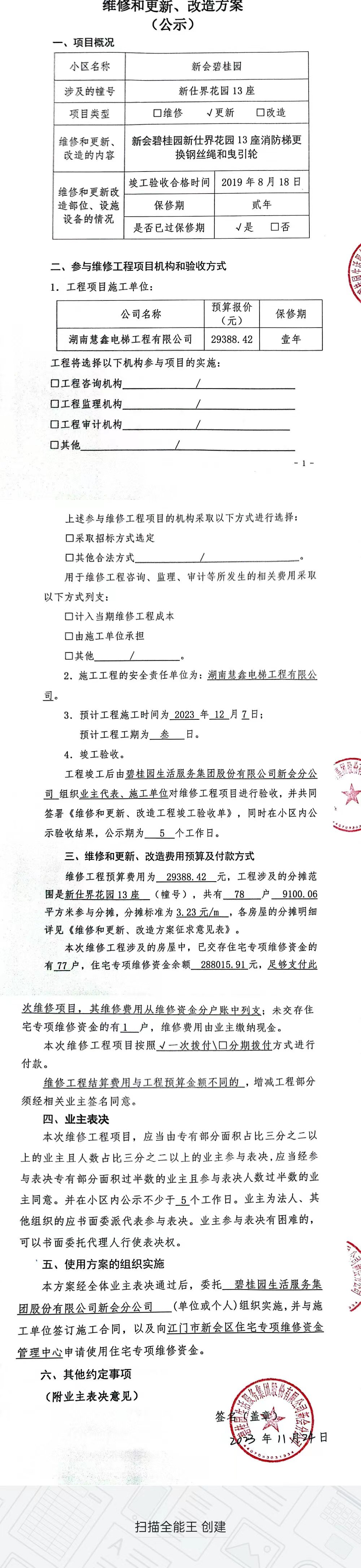 <td valign="top" values="" style="border-width:0" bindtype="0" rowspan="17" colspan="7" datasource="投票结果"><font style=" font-family:方正小标宋简体;font-size:14pt;"><p style="line-height: 1.75em;"><span style="font-family: 宋体, SimSun;">各位尊敬的业主:</span><br></p><p style="text-indent: 2em; line-height: 1.75em;"><span style="font-family: 宋体, SimSun;">根据法律法规的规定,本小区业主利用“江门市物业事项表决管理系统”已对本小区公共事务决策事项进行了表决,在经过7日的询异公示期后,未收到业主有效的异议。现将投票结果公告,并就产生的法律效力说明如下:</span></p><p style="line-height: 1.75em; text-indent: 0em;"><strong style="text-indent: 2em;"><span style="font-family: 宋体, SimSun;">一、投票范围</span></strong></p><p style="text-indent: 2em; line-height: 1.75em;"><span style="font-family: 宋体, SimSun;">新仕界花园新仕界花园13座</span></p><p style="text-indent: 2em; line-height: 1.75em;"><span style="font-family: 宋体, SimSun;">总人数(专有部分人数之和):78</span></p><p style="text-indent: 2em; line-height: 1.75em;"><span style="font-family: 宋体, SimSun;"><span style="font-family: 宋体, SimSun; text-indent: 32px;"><span style="font-family: 宋体; text-indent: 32px;">总户数:78</span></span></span></p><p style="text-indent: 2em; line-height: 1.75em;"><span style="font-family: 宋体, SimSun;">建筑物总面积(专有部分面积之和):9100.06㎡</span></p><p style="line-height: 1.75em;"><strong><span style="font-family: 宋体, SimSun;">二、投票结果公告时间</span></strong></p><p style="text-indent: 2em; line-height: 1.75em;"><span style="font-family: 宋体, SimSun;">从2023年12月07日开始</span></p><p style="line-height: 1.75em;"><strong><span style="font-family: 宋体, SimSun;">三、计票规则</span></strong></p><p style="text-indent: 2em; line-height: 1.75em;"><span style="font-family: 宋体, SimSun;">表决事项:使用建筑物及其附属设施的维修资金<br></span></p><p style="font-family: 宋体, SimSun;line-height: 1.75em; text-indent: 2em;">计票规则:弃权票不并入其它项 未表决票不并入其它项</p><p></p><p style="line-height: 1.75em;"><strong><span style="font-family: 宋体, SimSun;">四、通过规则</span></strong></p><p style="line-height: 1.75em;"><strong><span style="font-family: 宋体, SimSun;"> 根据《中华人民共和国民法典》第二百七十八条规定:业主共同决定事项,应当由专有部分面积占比三分之二以上的业主且人数占比三分之二以上的业主参与表决。</span></strong></p><p style="text-indent: 2em; line-height: 1.75em;"><span style="font-family: 宋体, SimSun;"><span style="font-family: 宋体, SimSun; text-indent: 32px;">表决事项:使用建筑物及其附属设施的维修资金<br></span></span></p><p style="font-family: 宋体, SimSun;line-height: 1.75em; text-indent: 2em;">通过规则:参与表决专有部分面积过半数的业主且参与表决人数过半数的业主同意</p><p></p><p style="line-height: 1.75em;"><strong><span style="font-family: 宋体, SimSun;">五、投票结果</span></strong></p><p style="line-height: 1.75em; text-indent: 2em;"><span style="font-family: 宋体, SimSun; text-indent: 2em;"></span></p><div id="resultTable"><table style="table-layout: fixed; font-size:12px; margin-top:10px" width="100%" border="0" cellspacing="0" cellpadding="0"><tbody><tr><td height="28" colspan="10" align="center" style="border: 1px solid #666"><strong style="font-size: 14px;"> 使用建筑物及其附属设施的维修资金</strong></td> </tr><tr id="trfirst"><td height="28" colspan="4" style="border-left: 1px solid #666; border-bottom: 1px solid #666"><strong> 申报单位:</strong> 碧桂园生活服务集团股份有限公司新会分公司</td><td colspan="3" style="border-left: 1px solid #666; border-bottom: 1px solid #666"><strong> 联系方式:</strong> </td><td colspan="3" style="border-left: 1px solid #666; border-bottom: 1px solid #666; border-right: 1px solid #666"><strong> 申报日期:</strong> 2023年11月24日 </td></tr><tr> <td height="28" colspan="5" style="border-left: 1px solid #666; border-bottom: 1px solid #666"><strong> 总人数(专有部分人数之和):</strong>78人 </td><td colspan="5" style="border-left: 1px solid #666; border-bottom: 1px solid #666; border-right: 1px solid #666"><strong> 建筑物总面积(专有部分面积之和):</strong>9100.06㎡ </td> </tr><tr><td height="28" colspan="10" bgcolor="#F3F3F3" style="border-left: 1px solid #666;border-bottom: 1px solid #666;border-right: 1px solid #666"><strong> 参与人数及面积统计</strong></td></tr><tr><td height="28" colspan="5" style="border-left: 1px solid #666; border-bottom: 1px solid #666"><strong> 参与表决专有部分人数之和:</strong>55人</td><td colspan="5" style="border-left: 1px solid #666; border-bottom: 1px solid #666; border-right: 1px solid #666"><strong> 参与表决占有表决权总人数比例:</strong>70.51%</td></tr><tr><td height="28" colspan="5" style="border-left: 1px solid #666; border-bottom: 1px solid #666"><strong> 参与表决专有部分面积之和:</strong>6376.01㎡</td><td colspan="5" style="border-left: 1px solid #666; border-bottom: 1px solid #666; border-right: 1px solid #666"><strong> 参与表决占有表决权总面积比例:</strong>70.07%</td></tr><tr><td height="28" colspan="10" bgcolor="#F3F3F3" style="border-left: 1px solid #666; border-bottom: 1px solid #666;border-right: 1px solid #666"> <strong> 未参与人数及面积统计</strong></td> </tr><tr><td height="28" colspan="5" style="border-left: 1px solid #666; border-bottom: 1px solid #666"><strong> 未参与表决专有部分人数之和:</strong>23人 </td><td colspan="5" style="border-left: 1px solid #666; border-bottom: 1px solid #666; border-right: 1px solid #666"><strong> 未参与表决占有表决权总人