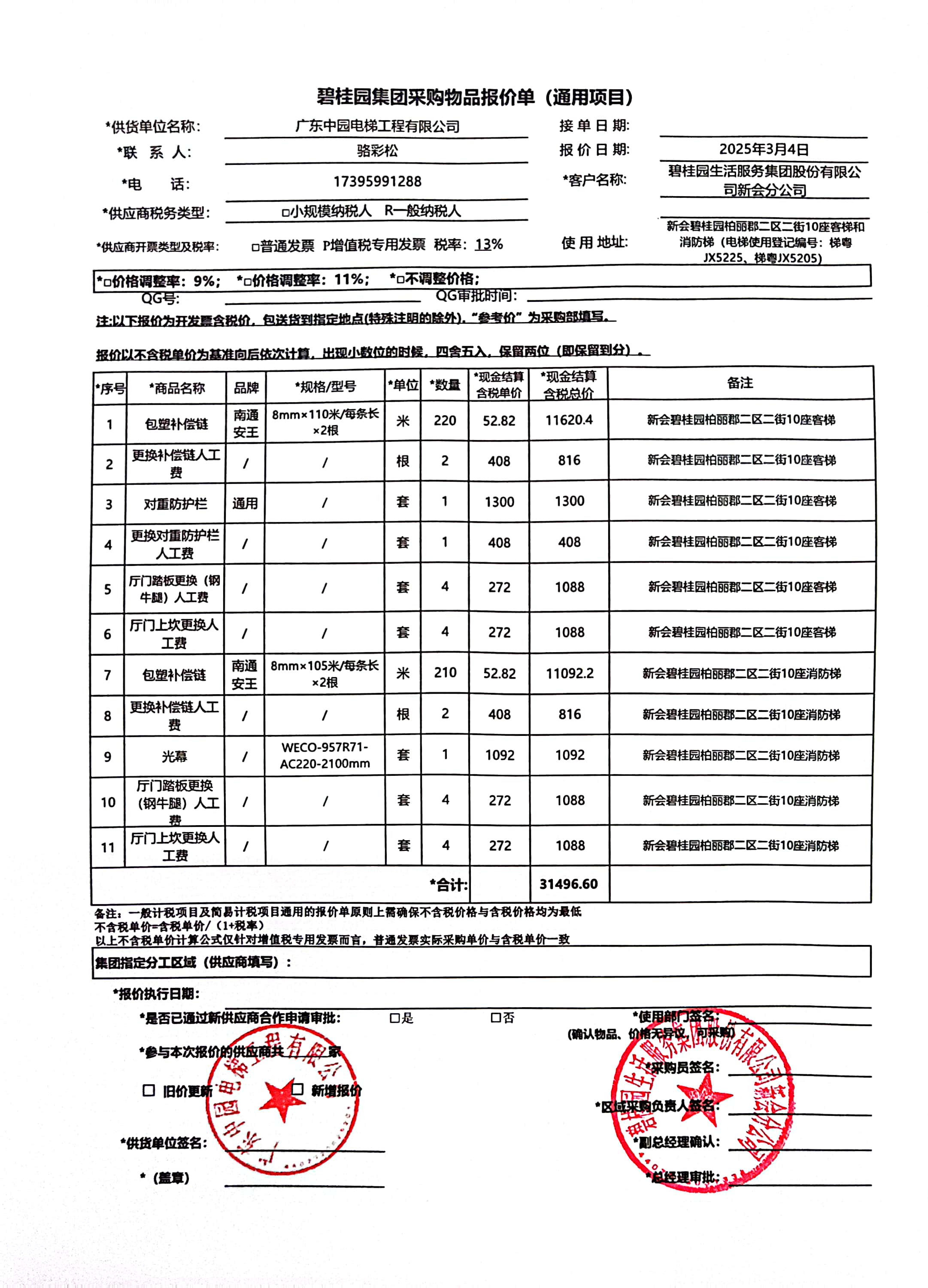 <td VALIGN="top" VALUES="" STYLE="border-width:0" BINDTYPE="0" ROWSPAN="19" COLSPAN="7" DATASOURCE="投票结果" ><font style="font-size:14pt;"><p style="white-space: normal; font-family: 宋体; line-height: 1.75em;">新会碧桂园碧桂园柏丽郡二区二街10座全体业主:</p><p style="white-space: normal; font-family: 宋体; line-height: 1.75em; text-indent: 2em;">本小区关于新会碧桂园柏丽郡二区二街10座客梯(梯粤JX5225)更换包塑补偿链、对重防护栏和消防梯(梯粤JX5205)更换包塑补偿链、光幕使用维修资金的投票的投票已表决结束,询异时间从2025年04月17日开始,投票询异公示期间,业主可通过微信查询自己的表决情况或可凭身份证件申请查询自己的表决情况;如公示的业主表决情况与查询的本人表决意见不一致的,可以以书面形式向投票组织机构申诉,投票组织机构予以纠正并重新公示表决结果。异议提出人对投票组织机构的处理仍有异议的,可以向街道办事处(镇人民政府)反映处理,涉及住宅专项维修资金的,可向属地住宅专项维修资金管理中心反映处理。</p><p style="white-space: normal;"><br/></p><p style="white-space: normal; font-family: 宋体; line-height: 1.75em;"><strong>附件:</strong></p><p style="white-space: normal; font-family: 宋体; line-height: 1.75em;"><strong>一、投票范围</strong></p><p style="white-space: normal; font-family: 宋体; line-height: 1.75em; text-indent: 2em;">新会碧桂园碧桂园柏丽郡二区二街10座</p><p style="white-space: normal; font-family: 宋体; line-height: 1.75em; text-indent: 2em;">总人数(专有部分人数之和):94</p><p style="white-space: normal; font-family: 宋体; line-height: 1.75em; text-indent: 2em;"><span style="font-family: 宋体, SimSun;"><span style="font-family: 宋体; text-indent: 32px;"><span style="font-family: 宋体; text-indent: 32px;">总户数:94</span></span></span></p><p style="white-space: normal; font-family: 宋体; line-height: 1.75em; text-indent: 2em;">建筑物总面积(专有部分面积之和):11286.83㎡</p><p style="white-space: normal; font-family: 宋体; line-height: 1.75em;"><strong>二、询异公示起止时间</strong></p><p dir="ltr" style="white-space: normal; font-family: 宋体; line-height: 1.75em; text-indent: 2em;"><span style="text-indent: 36px;">2025年04月17日至2025年04月27日</span></p><p style="white-space: normal; font-family: 宋体; line-height: 1.75em;"><strong>三、投票详细描述</strong></p><p style="white-space: normal; font-family: 宋体; line-height: 1.75em; text-indent: 2em;"><p>新会碧桂园柏丽郡二区二街10座客梯和消防梯(梯粤JX5225、梯粤JX5205)出现异常,经检查,是客梯和消防梯包塑补偿链外皮破损导致电梯发生抖动和异响,客梯底坑对重护栏缺失需要重新安装,消防梯光幕失效容易夹到业主。已过保修期。现申请使用维修资金对新会碧桂园柏丽郡二区二街10座客梯(梯粤JX5225)包塑补偿链、对重防护栏和消防梯(梯粤JX5205)包塑补偿链、光幕进行更换,工程维修预算约31496.6元,项目最终费用以施工合同签订为准,维修费用的分摊标准按建筑面积分摊,每平方约2.79元,详见公示,如果有业主手机不能正常通过微信投票的,请联系物业公司进行线下纸质投票,物业电话17308202886梁珍华.</p></p><p style="white-space: normal; font-family: 宋体; line-height: 1.75em;"><strong>四、计票规则</strong></p><p style="white-space: normal; font-family: 宋体; line-height: 1.75em; text-indent: 2em;">表决事项:使用建筑物及其附属设施的维修资金<br /><p style='text-align: left; font-family: 宋体; font-size: 16px; line-height: 1.75em; text-indent: 2em;'>计票规则:弃权票不并入其它项 未表决票不并入其它项</p></p><p style="white-space: normal; font-family: 宋体; line-height: 1.75em;"><strong>五、通过规则</strong></p><p style="white-space: normal; font-family: 宋体; line-height: 1.75em;"><strong><strong style="white-space: normal;"><span style="font-family: 宋体, SimSun;"> 根据《中华人民共和国民法典》第二百七十八条规定:业主共同决定事项,应当由专有部分面积占比三分之二以上的业主且人数占比三分之二以上的业主参与表决。</span></strong></strong></p><p style="white-space: normal; font-family: 宋体; line-height: 1.75em; text-indent: 2em;">表决事项:使用建筑物及其附属设施的维修资金<br /><p style='text-align: left; font-family: 宋体; font-size: 16px; line-height: 1.75em; text-indent: 2em;'>通过规则:双2/3以上参与表决,参与表决双过半同意</p></p><p style="white-space: normal; font-family: 宋体; line-height: 1.75em;"><strong>六、投票结果</strong></p><p style="white-space: normal; font-family: 宋体; line-height: 1.75em; text-indent: 2em;"><div id='resultTable'><table style='table-layout: fixed; font-size:12px; margin-top:10px' width='100%' border='0' cellspacing='0' cellpadding='0'><tr><td height='28' colspan='10' align='center' style='border: 1px solid #666'><strong style='font-size: 14px;'> 使用建筑物及其附属设施的维修资金</strong></td> </tr><tr id='trfirst'><td height='28' colspan='4' style='border-left: 1px solid #666; border-bottom: 1px solid #666'><strong> 申报单位:</strong> 碧桂园生活服务集团股份有限公司新会分公司</td><td colspan='3' style='border-left: 1px solid #666; border-bottom: 1px solid #666'><strong> 联系方式:</strong> </td><td colspan='3' style='border-left: 1px solid #666; border-bottom: 1px solid #666; border-right: 1px solid #666'><strong> 申报日期:</strong> 2025年3月21日 </td></tr><tr> <td height='28' colspan='5' style='border-left: 1px solid #666; border-bottom: 1px solid #666'><strong> 总人数(专有部分人数之和):</strong>94人 </td><td colspan='5' style='border-left: 1px sol