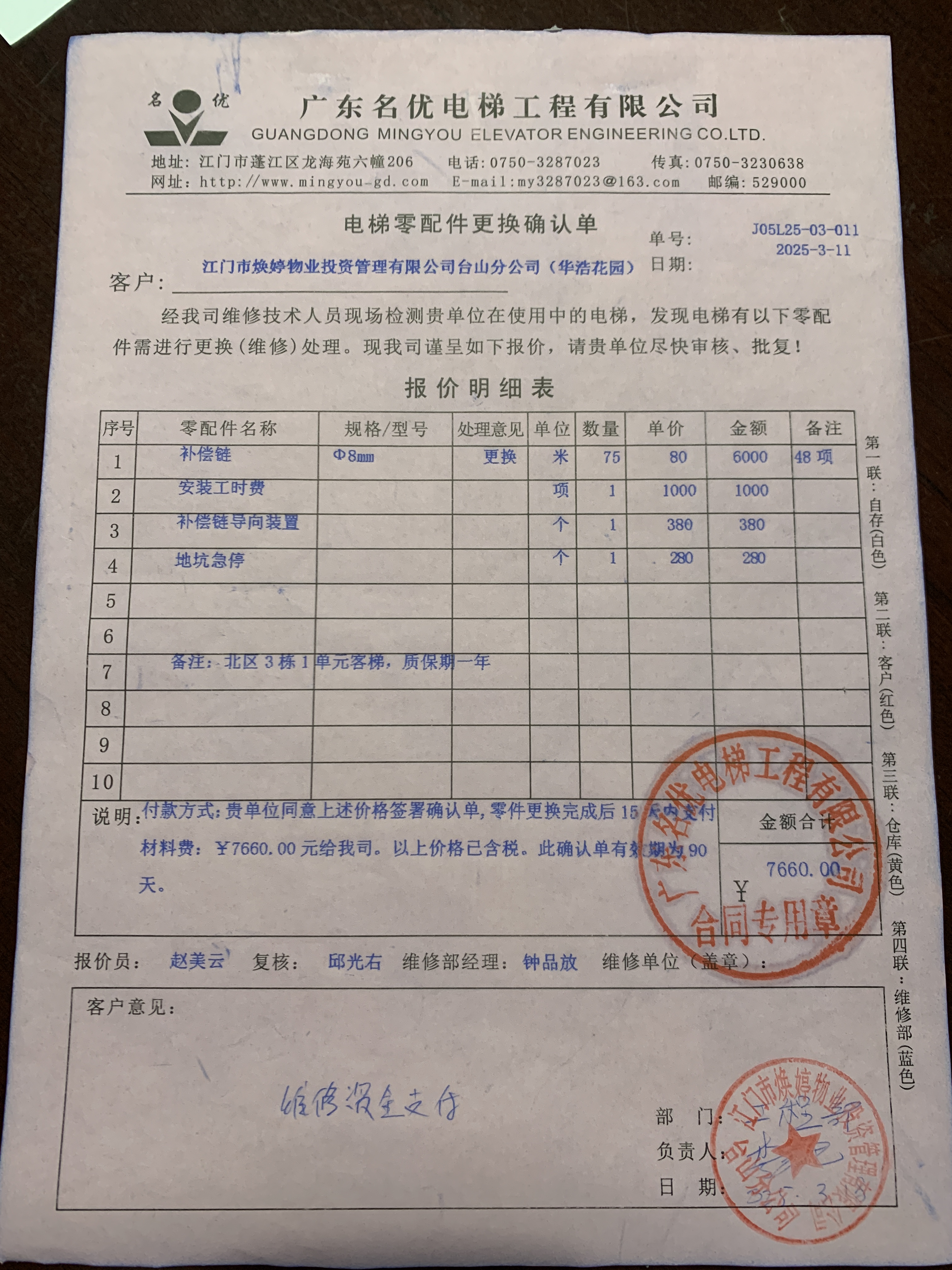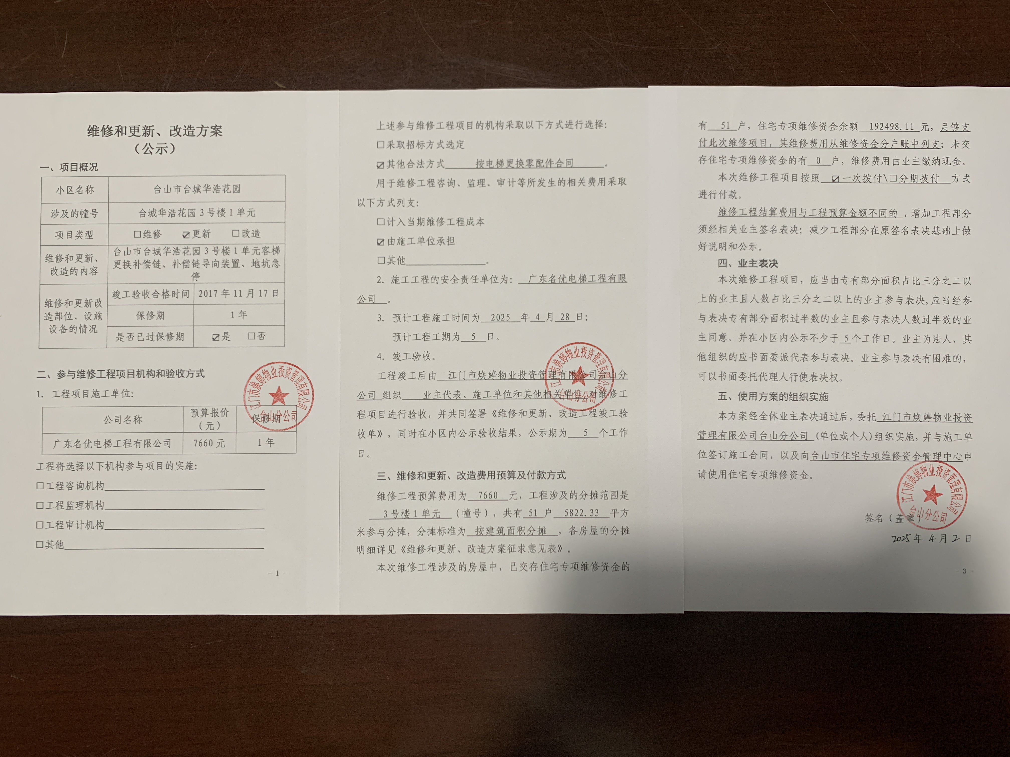 <td VALIGN="top" VALUES="" STYLE="border-width:0" BINDTYPE="0" ROWSPAN="19" COLSPAN="7" DATASOURCE="投票结果" ><font style="font-size:14pt;"><p style="white-space: normal; font-family: 宋体; line-height: 1.75em;">台山市华浩花园华浩花园3号全体业主:</p><p style="white-space: normal; font-family: 宋体; line-height: 1.75em; text-indent: 2em;">本小区关于华浩花园3栋1单元客梯更换补偿链、补偿链导向装置、地坑急停的使用维修资金投票的投票已表决结束,询异时间从2025年05月21日开始,投票询异公示期间,业主可通过微信查询自己的表决情况或可凭身份证件申请查询自己的表决情况;如公示的业主表决情况与查询的本人表决意见不一致的,可以以书面形式向投票组织机构申诉,投票组织机构予以纠正并重新公示表决结果。异议提出人对投票组织机构的处理仍有异议的,可以向街道办事处(镇人民政府)反映处理,涉及住宅专项维修资金的,可向属地住宅专项维修资金管理中心反映处理。</p><p style="white-space: normal;"><br/></p><p style="white-space: normal; font-family: 宋体; line-height: 1.75em;"><strong>附件:</strong></p><p style="white-space: normal; font-family: 宋体; line-height: 1.75em;"><strong>一、投票范围</strong></p><p style="white-space: normal; font-family: 宋体; line-height: 1.75em; text-indent: 2em;">台山市华浩花园华浩花园3号</p><p style="white-space: normal; font-family: 宋体; line-height: 1.75em; text-indent: 2em;">总人数(专有部分人数之和):51</p><p style="white-space: normal; font-family: 宋体; line-height: 1.75em; text-indent: 2em;"><span style="font-family: 宋体, SimSun;"><span style="font-family: 宋体; text-indent: 32px;"><span style="font-family: 宋体; text-indent: 32px;">总户数:51</span></span></span></p><p style="white-space: normal; font-family: 宋体; line-height: 1.75em; text-indent: 2em;">建筑物总面积(专有部分面积之和):5822.33㎡</p><p style="white-space: normal; font-family: 宋体; line-height: 1.75em;"><strong>二、询异公示起止时间</strong></p><p dir="ltr" style="white-space: normal; font-family: 宋体; line-height: 1.75em; text-indent: 2em;"><span style="text-indent: 36px;">2025年05月21日至2025年05月31日</span></p><p style="white-space: normal; font-family: 宋体; line-height: 1.75em;"><strong>三、投票详细描述</strong></p><p style="white-space: normal; font-family: 宋体; line-height: 1.75em; text-indent: 2em;"><p><span style="font-size: 14px; letter-spacing: 0px; text-wrap: wrap; font-family: 宋体; background: rgb(255, 255, 255);"> 小区</span><span style="font-size: 14px; letter-spacing: 0px; text-wrap: wrap; font-family: Calibri; background: rgb(255, 255, 255);">3<span style="font-family: 宋体;">号楼1</span></span><span style="font-size: 14px; letter-spacing: 0px; text-wrap: wrap; font-family: 宋体; background: rgb(255, 255, 255);">单元的电梯经检查,电梯的补偿链、补偿链导向装置因使用时间较长出现老化龟裂、磨损严重的情况,同时底坑急停开关出现氧化、接触不良,对电梯运行存在安全隐患。</span><span style="font-size: 14px; letter-spacing: 0px; text-wrap: wrap; font-family: 宋体; background: rgb(255, 255, 255);"><br/></span><span style="font-size: 14px; letter-spacing: 0px; text-wrap: wrap; font-family: 宋体; background: rgb(255, 255, 255);"> 现对</span><span style="font-size: 14px; letter-spacing: 0px; text-wrap: wrap; font-family: Calibri; background: rgb(255, 255, 255);"></span><span style="letter-spacing: 0px; text-wrap: wrap; font-size: 14px; font-family: Calibri; background: rgb(255, 255, 255);">3<span style="font-family: 宋体;">号楼1</span></span><span style="letter-spacing: 0px; text-wrap: wrap; font-size: 14px; font-family: 宋体; background: rgb(255, 255, 255);">单元</span><span style="font-size: 14px; letter-spacing: 0px; text-wrap: wrap; font-family: 宋体; background: rgb(255, 255, 255);">电梯进行维修,工程维修预算金额为</span><span style="font-size: 14px; letter-spacing: 0px; text-wrap: wrap; font-family: Calibri; background: rgb(255, 255, 255);">7660</span><span style="font-size: 14px; letter-spacing: 0px; text-wrap: wrap; font-family: 宋体; background: rgb(255, 255, 255);">元,项目最终费用以施工合同签订金额为准。因已过保修期,维修费用由相关业主按建筑面积分摊,每平方约1.3156元,详见公示附件。如业主手机不能正常通过微信投票,请联系物业公司进行线下纸质投票,物业电话:</span><span style="font-size: 14px; letter-spacing: 0px; text-wrap: wrap; font-family: Calibri; background: rgb(255, 255, 255);">0750-5555630</span><span style="font-size: 14px; letter-spacing: 0px; text-wrap: wrap; font-family: 宋体; background: rgb(255, 255, 255);">。</span></p></p><p style="white-space: normal; font-family: 宋体; line-height: 1.75em;"><strong>四、计票规则</strong></p><p style="white-space: normal; font-family: 宋体; line-height: 1.75em; text-indent: 2em;">表决事项:使用建筑物及其附属设施的维修资金<br /><p style='text-align: left; font-family: 宋体; font-size: 16px; line-height: 1.75em; text-indent: 2em;'>计票规则:弃权票不并入其它项 未表决票不并入其它项</p></p><p style="white-space: normal; font-family: 宋体; line-height: 1.75em;"><strong>五、通过规则</strong></p><p style="white-space: normal; font-family: 宋体; line-height: 1.75em;"><strong><strong style="white-space: normal;"><span style="font-family: 宋体, SimSun;"> 根据《中华人民共和国民法典》第二百七十八条规定:业主共同决定事项,应当由专有部分面积占比三分之二以上的业主且人数占比三分之二以上的业主参与表决。</span></strong></strong></p><p style="white-space: normal; font-family: 宋体; line-height: 1.75em; text-indent: 2em;">表
