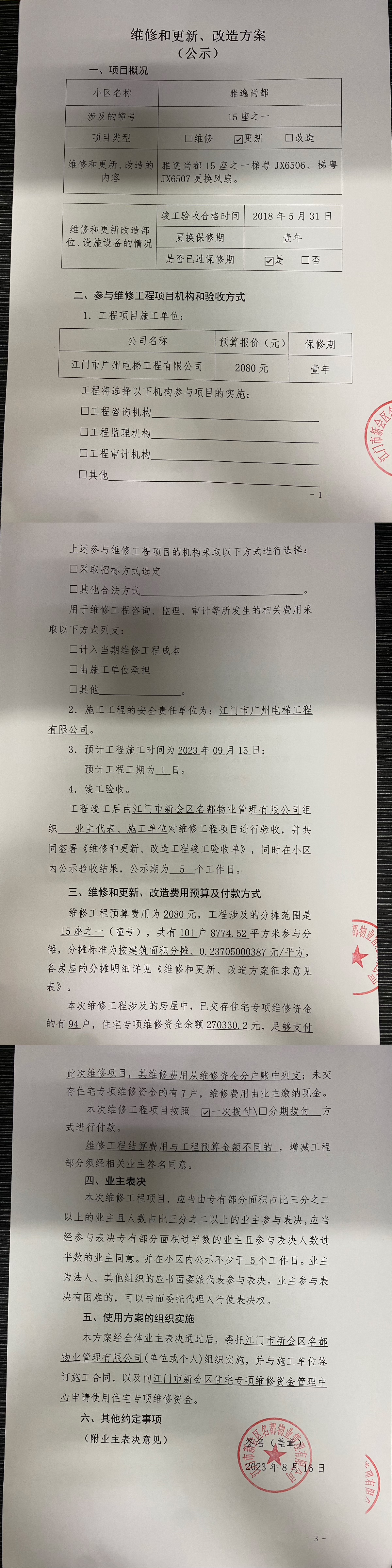 <td VALIGN="top" VALUES="" STYLE="border-width:0" BINDTYPE="0" ROWSPAN="19" COLSPAN="7" DATASOURCE="投票结果" ><font style="font-size:14pt;"><p style="white-space: normal; font-family: 宋体; line-height: 1.75em;">雅逸尚都雅逸尚都15座之一全体业主:</p><p style="white-space: normal; font-family: 宋体; line-height: 1.75em; text-indent: 2em;">本小区关于雅逸尚都15座之一梯粤JX6506、梯粤JX6507更换风扇使用维修资金的投票的投票已表决结束,询异时间从2023年09月25日开始,投票询异公示期间,业主可通过微信查询自己的表决情况或可凭身份证件申请查询自己的表决情况;如公示的业主表决情况与查询的本人表决意见不一致的,可以以书面形式向投票组织机构申诉,投票组织机构予以纠正并重新公示表决结果。异议提出人对投票组织机构的处理仍有异议的,可以向街道办事处(镇人民政府)反映处理,涉及住宅专项维修资金的,可向属地住宅专项维修资金管理中心反映处理。</p><p style="white-space: normal;"><br/></p><p style="white-space: normal; font-family: 宋体; line-height: 1.75em;"><strong>附件:</strong></p><p style="white-space: normal; font-family: 宋体; line-height: 1.75em;"><strong>一、投票范围</strong></p><p style="white-space: normal; font-family: 宋体; line-height: 1.75em; text-indent: 2em;">雅逸尚都雅逸尚都15座之一</p><p style="white-space: normal; font-family: 宋体; line-height: 1.75em; text-indent: 2em;">总人数(专有部分人数之和):101</p><p style="white-space: normal; font-family: 宋体; line-height: 1.75em; text-indent: 2em;"><span style="font-family: 宋体, SimSun;">总户数:101</span></p><p style="white-space: normal; font-family: 宋体; line-height: 1.75em; text-indent: 2em;">建筑物总面积(专有部分面积之和):8774.52㎡</p><p style="white-space: normal; font-family: 宋体; line-height: 1.75em;"><strong>二、询异公示起止时间</strong></p><p dir="ltr" style="white-space: normal; font-family: 宋体; line-height: 1.75em; text-indent: 2em;"><span style="text-indent: 36px;">2023年09月25日至2023年10月01日</span></p><p style="white-space: normal; font-family: 宋体; line-height: 1.75em;"><strong>三、投票详细描述</strong></p><p style="white-space: normal; font-family: 宋体; line-height: 1.75em; text-indent: 2em;"><p><span style="text-wrap: wrap; font-family: "Helvetica Neue", Helvetica, Arial, sans-serif; font-size: 14px; background-color: rgb(255, 255, 255);">本小区15座之一梯粤JX6506、梯粤JX6507发现轿厢风扇自然损坏,需要更换。现需申请使用维修资金对</span><span style="text-wrap: wrap; font-family: "Helvetica Neue", Helvetica, Arial, sans-serif; font-size: 14px; background-color: rgb(255, 255, 255);">15座之一</span><span style="text-wrap: wrap; font-family: "Helvetica Neue", Helvetica, Arial, sans-serif; font-size: 14px; background-color: rgb(255, 255, 255);">电梯进行维修更换,工程维修预算金额为2080元,项目最终费用以施工合同签订金额为准。维修费用的分摊标准为按建筑面积分摊,每平方约0.23705000387元详见公示附件。如业主手机不能正常通过微信投票,请联系物业公司进行线下纸质投票,物业电话:0750-6609908。</span></p></p><p style="white-space: normal; font-family: 宋体; line-height: 1.75em;"><strong>四、计票规则</strong></p><p style="white-space: normal; font-family: 宋体; line-height: 1.75em; text-indent: 2em;">表决事项:使用建筑物及其附属设施的维修资金<br /><p style='text-align: left; font-family: 宋体; font-size: 16px; line-height: 1.75em; text-indent: 2em;'>计票规则:弃权票不并入其它项 未表决票不并入其它项</p></p><p style="white-space: normal; font-family: 宋体; line-height: 1.75em;"><strong>五、通过规则</strong></p><p style="white-space: normal; font-family: 宋体; line-height: 1.75em; text-indent: 2em;">表决事项:使用建筑物及其附属设施的维修资金<br /><p style='text-align: left; font-family: 宋体; font-size: 16px; line-height: 1.75em; text-indent: 2em;'>通过规则:参与表决专有部分面积过半数的业主且参与表决人数过半数的业主同意</p></p><p style="white-space: normal; font-family: 宋体; line-height: 1.75em;"><strong>六、投票结果</strong></p><p style="white-space: normal; font-family: 宋体; line-height: 1.75em; text-indent: 2em;"><div id='resultTable'><table style='table-layout: fixed; font-size:12px; margin-top:10px' width='100%' border='0' cellspacing='0' cellpadding='0'><tr><td height='28' colspan='10' align='center' style='border: 1px solid #666'><strong style='font-size: 14px;'> 使用建筑物及其附属设施的维修资金</strong></td> </tr><tr id='trfirst'><td height='28' colspan='4' style='border-left: 1px solid #666; border-bottom: 1px solid #666'><strong> 申报单位:</strong> 江门市新会区名都物业管理有限公司</td><td colspan='3' style='border-left: 1px solid #666; border-bottom: 1px solid #666'><strong> 联系方式:</strong> 6609908 </td><td colspan='3' style='border-left: 1px solid #666; border-bottom: 1px solid #666; border-right: 1px solid #666'><strong> 申报日期:</strong> 2023年8月16日 </td></tr><tr> <td height='28' colspan='5' style='border-left: 1px solid #666; border-bottom: 1px solid #666'><strong> 总人数(专有部分人数之和):</strong>101人 </td><td colspan='5' style='border-left: 1px solid #666; border-bottom: 1px solid #666; border-right: 1px solid #666'><strong> 建筑物总面积(专有部分面积之和):</strong>8774.52㎡ </td> </tr><tr><td height='28' colspan='10' bgcolor='#F3F3F3' style='border-left: 1px solid #666;border-bottom: 1px solid #666;border-right: 1px solid #666'><strong> 参与人数及面积统计</strong></td></tr><tr><td height='28' colspan='5' style='border-left: 1px solid #666; border-bottom: 1px solid #666'><stro
