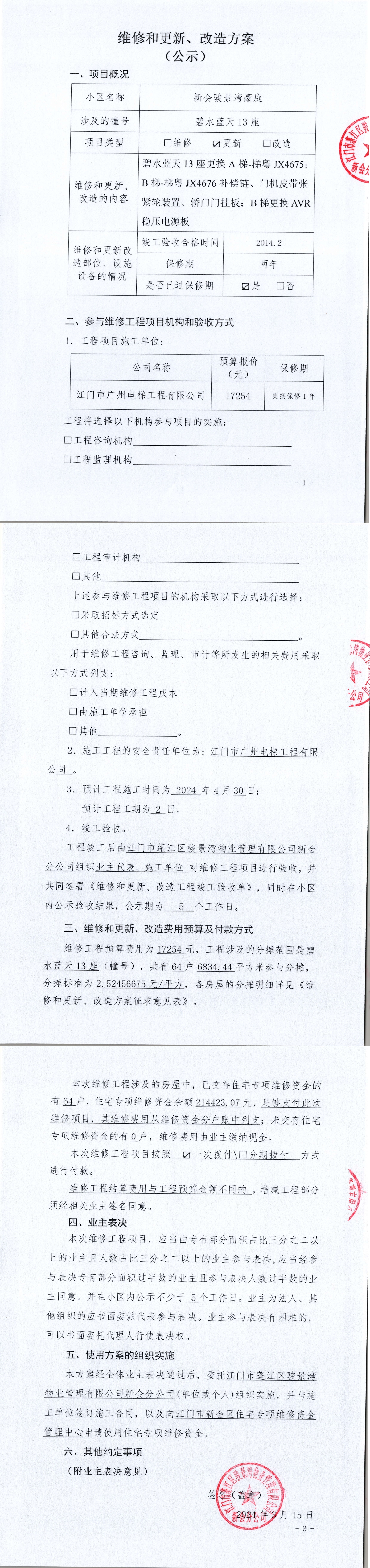 <td VALIGN="top" VALUES="" STYLE="border-width:0" BINDTYPE="0" ROWSPAN="17" COLSPAN="7" DATASOURCE="投票结果" ><font style=" font-family:方正小标宋简体;font-size:14pt;"><p style="line-height: 1.75em;"><span style="font-family: 宋体, SimSun;">各位尊敬的业主:</span><br/></p><p style="text-indent: 2em; line-height: 1.75em;"><span style="font-family: 宋体, SimSun;">根据法律法规的规定,本小区业主利用“江门市物业事项表决管理系统”已对本小区公共事务决策事项进行了表决,在经过7日的询异公示期后,未收到业主有效的异议。现将投票结果公告,并就产生的法律效力说明如下:</span></p><p style="line-height: 1.75em; text-indent: 0em;"><strong style="text-indent: 2em;"><span style="font-family: 宋体, SimSun;">一、投票范围</span></strong></p><p style="text-indent: 2em; line-height: 1.75em;"><span style="font-family: 宋体, SimSun;">新会骏景湾豪庭碧水蓝天13座</span></p><p style="text-indent: 2em; line-height: 1.75em;"><span style="font-family: 宋体, SimSun;">总人数(专有部分人数之和):64</span></p><p style="text-indent: 2em; line-height: 1.75em;"><span style="font-family: 宋体, SimSun;"><span style="font-family: 宋体, SimSun; text-indent: 32px;"><span style="font-family: 宋体; text-indent: 32px;"><span style="font-family: 宋体; text-indent: 32px;">总户数:64</span></span></span></span></p><p style="text-indent: 2em; line-height: 1.75em;"><span style="font-family: 宋体, SimSun;">建筑物总面积(专有部分面积之和):6834.44㎡</span></p><p style="line-height: 1.75em;"><strong><span style="font-family: 宋体, SimSun;">二、投票结果公告时间</span></strong></p><p style="text-indent: 2em; line-height: 1.75em;"><span style="font-family: 宋体, SimSun;">从2024年04月24日开始</span></p><p style="line-height: 1.75em;"><strong><span style="font-family: 宋体, SimSun;">三、计票规则</span></strong></p><p style="text-indent: 2em; line-height: 1.75em;"><span style="font-family: 宋体, SimSun;">表决事项:使用建筑物及其附属设施的维修资金<br /><p style='font-family: 宋体, SimSun;line-height: 1.75em; text-indent: 2em;'>计票规则:弃权票不并入其它项&nbsp;&nbsp;&nbsp;&nbsp;未表决票不并入其它项</p></span></p><p style="line-height: 1.75em;"><strong><span style="font-family: 宋体, SimSun;">四、通过规则</span></strong></p><p style="line-height: 1.75em;"><strong><span style="font-family: 宋体, SimSun;">&nbsp; 根据《中华人民共和国民法典》第二百七十八条规定:业主共同决定事项,应当由专有部分面积占比三分之二以上的业主且人数占比三分之二以上的业主参与表决。</span></strong></p><p style="text-indent: 2em; line-height: 1.75em;"><span style="font-family: 宋体, SimSun;"><span style="font-family: 宋体, SimSun; text-indent: 32px;">表决事项:使用建筑物及其附属设施的维修资金<br /><p style='font-family: 宋体, SimSun;line-height: 1.75em; text-indent: 2em;'>通过规则:双2/3以上参与表决,参与表决双过半同意</p></span></span></p><p style="line-height: 1.75em;"><strong><span style="font-family: 宋体, SimSun;">五、投票结果</span></strong></p><p style="line-height: 1.75em; text-indent: 2em;"><span style="font-family: 宋体, SimSun; text-indent: 2em;"><div id='resultTable'><table style='table-layout: fixed; font-size:12px; margin-top:10px' width='100%' border='0' cellspacing='0' cellpadding='0'><tr><td height='28' colspan='10' align='center' style='border: 1px solid #666'><strong style='font-size: 14px;'> 使用建筑物及其附属设施的维修资金</strong></td> </tr><tr id='trfirst'><td height='28' colspan='4' style='border-left: 1px solid #666; border-bottom: 1px solid #666'><strong>&nbsp;申报单位:</strong> 江门市蓬江区骏景湾物业管理有限公司新会分公司</td><td colspan='3' style='border-left: 1px solid #666; border-bottom: 1px solid #666'><strong>&nbsp;联系方式:</strong> </td><td colspan='3' style='border-left: 1px solid #666; border-bottom: 1px solid #666; border-right: 1px solid #666'><strong>&nbsp;申报日期:</strong> 2024年3月18日 </td></tr><tr> <td height='28' colspan='5' style='border-left: 1px solid #666; border-bottom: 1px solid #666'><strong>&nbsp;列支总人数(专有部分人数之和):</strong>64人 </td><td colspan='5' style='border-left: 1px solid #666; border-bottom: 1px solid #666; border-right: 1px solid #666'><strong>&nbsp;列支建筑物总面积(专有部分面积之和):</strong>6834.44㎡ </td> </tr><tr><td height='28' colspan='10' bgcolor='#F3F3F3' style='border-left: 1px solid #666;border-bottom: 1px solid #666;border-right: 1px solid #666'><strong>&nbsp;参与表决人数及面积统计</strong></td></tr><tr><td height='28' colspan='5' style='border-left: 1px solid #666; border-bottom: 1px solid #666'><strong>&nbsp;参与表决人数:</strong>45人</td><td colspan='5' style='border-left: 1px solid #666; border-bottom: 1px solid #666; border-right: 1px solid #666'><strong>&nbsp;参与表决人数占总人数比例:</strong>70.31%</td></tr><tr><td height='28' colspan='5' style='border-left: 1px solid #666; border-bottom: 1px solid #666'><strong>&nbsp;参与表决面积:</strong>4868.19㎡</td><td colspan='5' style='border-left: 1px solid #666; border-bottom: 1px solid #666; border-right: 1px solid #666'><strong>&nbsp;参与表决面积占总面积比例:</strong>71.23%</td></tr><tr><td height='28' colspan='10' bgcolor='#F3F3F3' style='border-left: 1px solid #666; border-bottom: 1px solid #666;border-right: 1px solid #666'> <strong>&nbsp;参与表决同意人数及面积统计</strong></td> </tr><tr><td height='28' colspan='5' style='border-left: 1px solid #666; border-bottom: 1px solid #666'><strong>&nbsp;参与表决同意人数:</strong>45人 </td><td colspan='5' style='border-left: 1px solid #666; border-bottom: 1px solid #666; border-right: 1px so