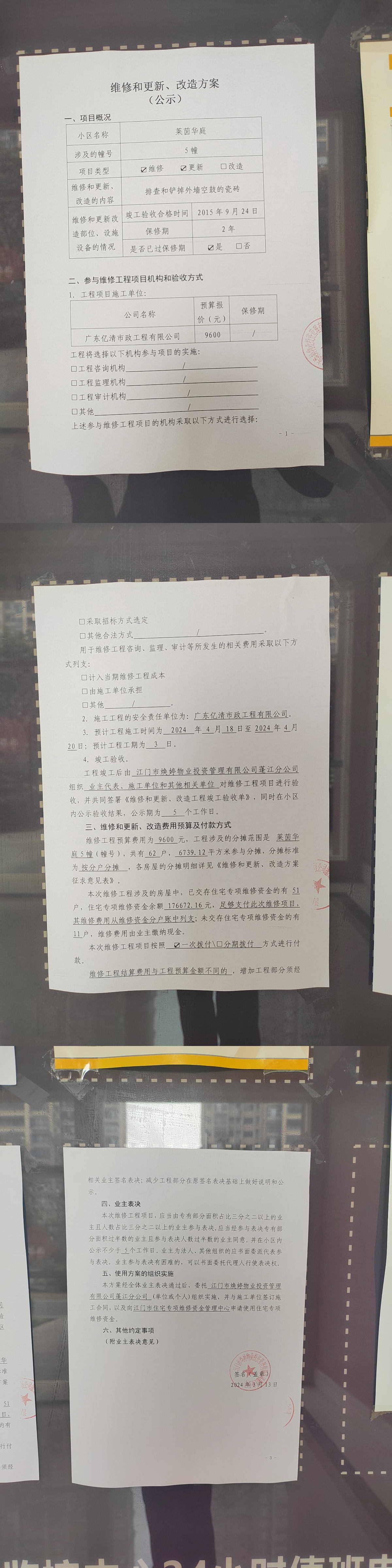 <td VALIGN="top" VALUES="" STYLE="border-width:0" BINDTYPE="0" ROWSPAN="19" COLSPAN="7" DATASOURCE="投票结果" ><font style="font-size:14pt;"><p style="white-space: normal; font-family: 宋体; line-height: 1.75em;">莱茵华庭蓬江区莱茵华庭5幢全体业主:</p><p style="white-space: normal; font-family: 宋体; line-height: 1.75em; text-indent: 2em;">本小区关于莱茵华庭小区5幢排查和铲掉外墙空鼓的瓷砖使用维修资金的投票的投票已表决结束,询异时间从2024年03月27日开始,投票询异公示期间,业主可通过微信查询自己的表决情况或可凭身份证件申请查询自己的表决情况;如公示的业主表决情况与查询的本人表决意见不一致的,可以以书面形式向投票组织机构申诉,投票组织机构予以纠正并重新公示表决结果。异议提出人对投票组织机构的处理仍有异议的,可以向街道办事处(镇人民政府)反映处理,涉及住宅专项维修资金的,可向属地住宅专项维修资金管理中心反映处理。</p><p style="white-space: normal;"><br/></p><p style="white-space: normal; font-family: 宋体; line-height: 1.75em;"><strong>附件:</strong></p><p style="white-space: normal; font-family: 宋体; line-height: 1.75em;"><strong>一、投票范围</strong></p><p style="white-space: normal; font-family: 宋体; line-height: 1.75em; text-indent: 2em;">莱茵华庭蓬江区莱茵华庭5幢</p><p style="white-space: normal; font-family: 宋体; line-height: 1.75em; text-indent: 2em;">总人数(专有部分人数之和):62</p><p style="white-space: normal; font-family: 宋体; line-height: 1.75em; text-indent: 2em;"><span style="font-family: 宋体, SimSun;"><span style="font-family: 宋体; text-indent: 32px;"><span style="font-family: 宋体; text-indent: 32px;">总户数:62</span></span></span></p><p style="white-space: normal; font-family: 宋体; line-height: 1.75em; text-indent: 2em;">建筑物总面积(专有部分面积之和):6739.12㎡</p><p style="white-space: normal; font-family: 宋体; line-height: 1.75em;"><strong>二、询异公示起止时间</strong></p><p dir="ltr" style="white-space: normal; font-family: 宋体; line-height: 1.75em; text-indent: 2em;"><span style="text-indent: 36px;">2024年03月27日至2024年04月02日</span></p><p style="white-space: normal; font-family: 宋体; line-height: 1.75em;"><strong>三、投票详细描述</strong></p><p style="white-space: normal; font-family: 宋体; line-height: 1.75em; text-indent: 2em;"><p><span style="font-family: "Helvetica Neue", Helvetica, Arial, sans-serif; font-size: 14px; background-color: rgb(255, 255, 255);">本小区 5幢的建筑外墙瓷砖出现空鼓脱落,已过保修期。现需申请使用维修资金对5幢空鼓的外墙瓷砖进行排查,工程维修预算金额为9600元,项目最终费用以施工合同签订金额为准。维修费用的分摊标准为按分户分摊 每户约154.84元,详见公示附件。如业主手机不能正常通过微信投票,请联系物业公司进行线下纸质投票,物业公司联系电话:0750-3212633。</span></p></p><p style="white-space: normal; font-family: 宋体; line-height: 1.75em;"><strong>四、计票规则</strong></p><p style="white-space: normal; font-family: 宋体; line-height: 1.75em; text-indent: 2em;">表决事项:使用建筑物及其附属设施的维修资金<br /><p style='text-align: left; font-family: 宋体; font-size: 16px; line-height: 1.75em; text-indent: 2em;'>计票规则:弃权票不并入其它项 未表决票不并入其它项</p></p><p style="white-space: normal; font-family: 宋体; line-height: 1.75em;"><strong>五、通过规则</strong></p><p style="white-space: normal; font-family: 宋体; line-height: 1.75em;"><strong><strong style="white-space: normal;"><span style="font-family: 宋体, SimSun;"> 根据《中华人民共和国民法典》第二百七十八条规定:业主共同决定事项,应当由专有部分面积占比三分之二以上的业主且人数占比三分之二以上的业主参与表决。</span></strong></strong></p><p style="white-space: normal; font-family: 宋体; line-height: 1.75em; text-indent: 2em;">表决事项:使用建筑物及其附属设施的维修资金<br /><p style='text-align: left; font-family: 宋体; font-size: 16px; line-height: 1.75em; text-indent: 2em;'>通过规则:双2/3以上参与表决,参与表决双过半同意</p></p><p style="white-space: normal; font-family: 宋体; line-height: 1.75em;"><strong>六、投票结果</strong></p><p style="white-space: normal; font-family: 宋体; line-height: 1.75em; text-indent: 2em;"><div id='resultTable'><table style='table-layout: fixed; font-size:12px; margin-top:10px' width='100%' border='0' cellspacing='0' cellpadding='0'><tr><td height='28' colspan='10' align='center' style='border: 1px solid #666'><strong style='font-size: 14px;'> 使用建筑物及其附属设施的维修资金</strong></td> </tr><tr id='trfirst'><td height='28' colspan='4' style='border-left: 1px solid #666; border-bottom: 1px solid #666'><strong> 申报单位:</strong> 江门市焕婷物业投资管理有限公司蓬江分公司</td><td colspan='3' style='border-left: 1px solid #666; border-bottom: 1px solid #666'><strong> 联系方式:</strong> 3211392 </td><td colspan='3' style='border-left: 1px solid #666; border-bottom: 1px solid #666; border-right: 1px solid #666'><strong> 申报日期:</strong> 2024年3月15日 </td></tr><tr> <td height='28' colspan='5' style='border-left: 1px solid #666; border-bottom: 1px solid #666'><strong> 总人数(专有部分人数之和):</strong>62人 </td><td colspan='5' style='border-left: 1px solid #666; border-bottom: 1px solid #666; border-right: 1px solid #666'><strong> 建筑物总面积(专有部分面积之和):</strong>6739.12㎡ </td> </tr><tr><td height='28' colspan='10' bgcolor='#F3F3F3' style='border-left: 1px solid #666;border-bottom: 1px solid #666;border-right: 1px solid #666'><strong> 参