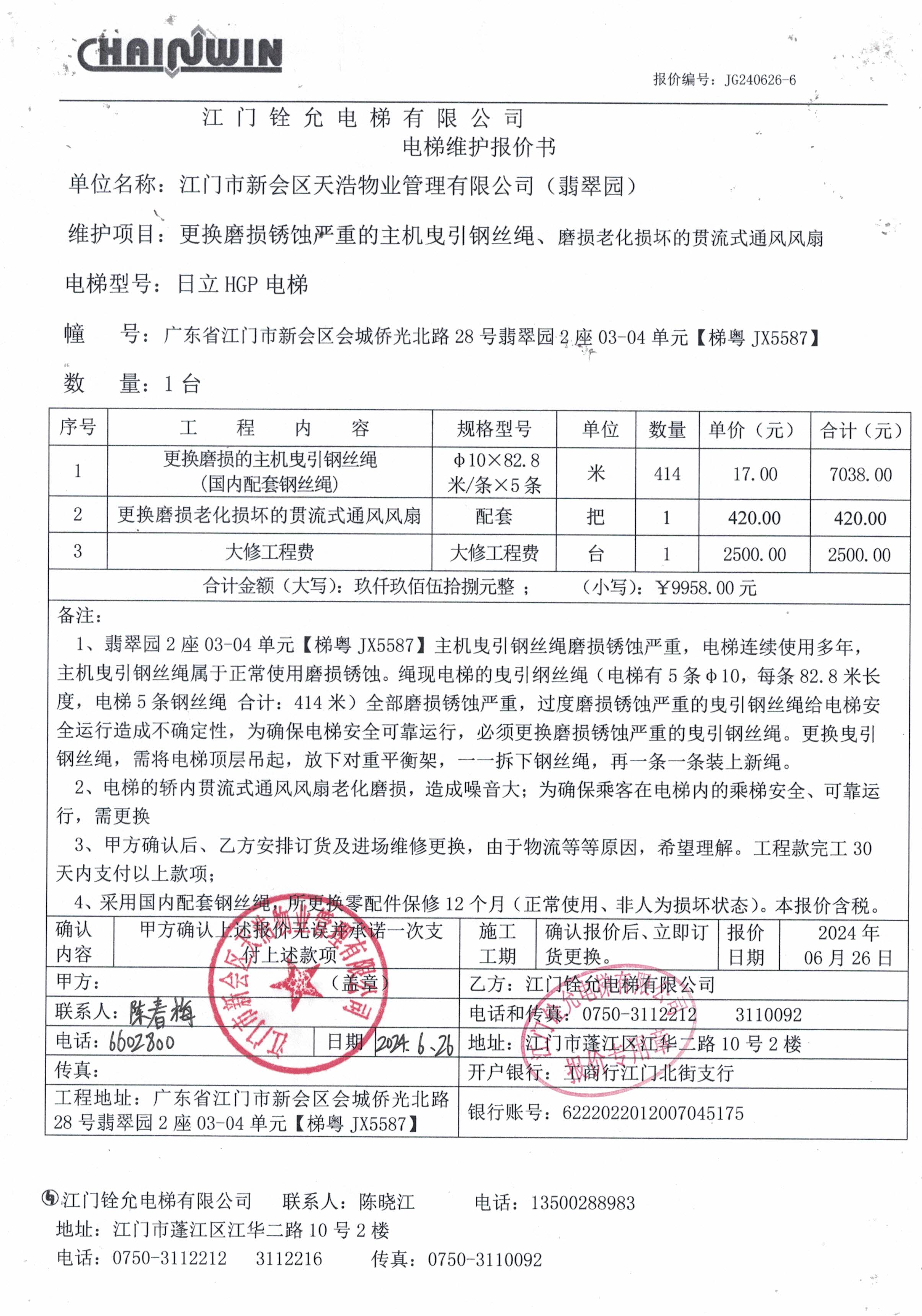 <td VALIGN="top" VALUES="" STYLE="border-width:0" BINDTYPE="0" ROWSPAN="19" COLSPAN="7" DATASOURCE="投票结果" ><font style="font-size:14pt;"><p style="white-space: normal; font-family: 宋体; line-height: 1.75em;">翡翠园翡翠园2座全体业主:</p><p style="white-space: normal; font-family: 宋体; line-height: 1.75em; text-indent: 2em;">本小区关于翡翠园2座03-04【梯粤JX5587】更换磨损的主机曳引钢丝绳和损坏的贯流式通风风扇使用维修资金的投票的投票已表决结束,询异时间从2024年08月08日开始,投票询异公示期间,业主可通过微信查询自己的表决情况或可凭身份证件申请查询自己的表决情况;如公示的业主表决情况与查询的本人表决意见不一致的,可以以书面形式向投票组织机构申诉,投票组织机构予以纠正并重新公示表决结果。异议提出人对投票组织机构的处理仍有异议的,可以向街道办事处(镇人民政府)反映处理,涉及住宅专项维修资金的,可向属地住宅专项维修资金管理中心反映处理。</p><p style="white-space: normal;"><br/></p><p style="white-space: normal; font-family: 宋体; line-height: 1.75em;"><strong>附件:</strong></p><p style="white-space: normal; font-family: 宋体; line-height: 1.75em;"><strong>一、投票范围</strong></p><p style="white-space: normal; font-family: 宋体; line-height: 1.75em; text-indent: 2em;">翡翠园翡翠园2座</p><p style="white-space: normal; font-family: 宋体; line-height: 1.75em; text-indent: 2em;">总人数(专有部分人数之和):25</p><p style="white-space: normal; font-family: 宋体; line-height: 1.75em; text-indent: 2em;"><span style="font-family: 宋体, SimSun;"><span style="font-family: 宋体; text-indent: 32px;"><span style="font-family: 宋体; text-indent: 32px;">总户数:42</span></span></span></p><p style="white-space: normal; font-family: 宋体; line-height: 1.75em; text-indent: 2em;">建筑物总面积(专有部分面积之和):3524.35㎡</p><p style="white-space: normal; font-family: 宋体; line-height: 1.75em;"><strong>二、询异公示起止时间</strong></p><p dir="ltr" style="white-space: normal; font-family: 宋体; line-height: 1.75em; text-indent: 2em;"><span style="text-indent: 36px;">2024年08月08日至2024年08月14日</span></p><p style="white-space: normal; font-family: 宋体; line-height: 1.75em;"><strong>三、投票详细描述</strong></p><p style="white-space: normal; font-family: 宋体; line-height: 1.75em; text-indent: 2em;"><p style="text-wrap: wrap;"><span style="font-family: "Helvetica Neue", Helvetica, Arial, sans-serif; font-size: 14px; background-color: rgb(255, 255, 255);"> 小区2座03-04单元电梯【梯粤JX5587】报故障,经检查,是由于电梯曳引钢丝绳磨损锈蚀严重和电梯的轿内贯流式通风风扇老化磨损,为确保电梯安全可靠运行,需更换磨损的主机曳引钢丝绳和损坏的贯流式通风风扇。</span></p><p style="text-wrap: wrap;"><span style="background-color: rgb(255, 255, 255); font-family: "Helvetica Neue", Helvetica, Arial, sans-serif; font-size: 14px;"> 现对2座03-04单元电梯【梯粤JX5587】进行维修,</span><span style="background-color: rgb(255, 255, 255); font-family: "Helvetica Neue", Helvetica, Arial, sans-serif; font-size: 14px;">工程维修预算金额为9958元,项目最终费用以施工合同签订金额为准。</span><span style="background-color: rgb(255, 255, 255); font-family: "Helvetica Neue", Helvetica, Arial, sans-serif; font-size: 14px;">因已过保修期,</span><span style="background-color: rgb(255, 255, 255); font-size: 14px; font-family: 宋体;"><span style="font-family: "Helvetica Neue", Helvetica, Arial, sans-serif;">维修费用由相关业主</span></span><span style="background-color: rgb(255, 255, 255); font-family: "Helvetica Neue", Helvetica, Arial, sans-serif; font-size: 14px;">按建筑面积分摊 ,每平方约2.825485元,详见公示附件。如业主手机不能正常通过微信投票,请联系物业公司进行线下纸质投票,物业电话:0750-6602800</span></p></p><p style="white-space: normal; font-family: 宋体; line-height: 1.75em;"><strong>四、计票规则</strong></p><p style="white-space: normal; font-family: 宋体; line-height: 1.75em; text-indent: 2em;">表决事项:使用建筑物及其附属设施的维修资金<br /><p style='text-align: left; font-family: 宋体; font-size: 16px; line-height: 1.75em; text-indent: 2em;'>计票规则:弃权票不并入其它项 未表决票不并入其它项</p></p><p style="white-space: normal; font-family: 宋体; line-height: 1.75em;"><strong>五、通过规则</strong></p><p style="white-space: normal; font-family: 宋体; line-height: 1.75em;"><strong><strong style="white-space: normal;"><span style="font-family: 宋体, SimSun;"> 根据《中华人民共和国民法典》第二百七十八条规定:业主共同决定事项,应当由专有部分面积占比三分之二以上的业主且人数占比三分之二以上的业主参与表决。</span></strong></strong></p><p style="white-space: normal; font-family: 宋体; line-height: 1.75em; text-indent: 2em;">表决事项:使用建筑物及其附属设施的维修资金<br /><p style='text-align: left; font-family: 宋体; font-size: 16px; line-height: 1.75em; text-indent: 2em;'>通过规则:双2/3以上参与表决,参与表决双过半同意</p></p><p style="white-space: normal; font-family: 宋体; line-height: 1.75em;"><strong>六、投票结果</strong></p><p style="white-space: normal; font-family: 宋体; line-height: 1.75em; text-indent: 2em;"><div id='resultTable'><table style='table-layout: fixed; font-size:12px; margin-top:10px' width='100%' border='0' cellspacing='0' cellpadding='0'><tr><td height='28' colspan='10' align='center' style='border: 1px solid #666'><strong style='font-size: 14px;'> 使用建筑物及其附属设施的维修资金</strong></td> </tr><tr id='trfirst'><td heig