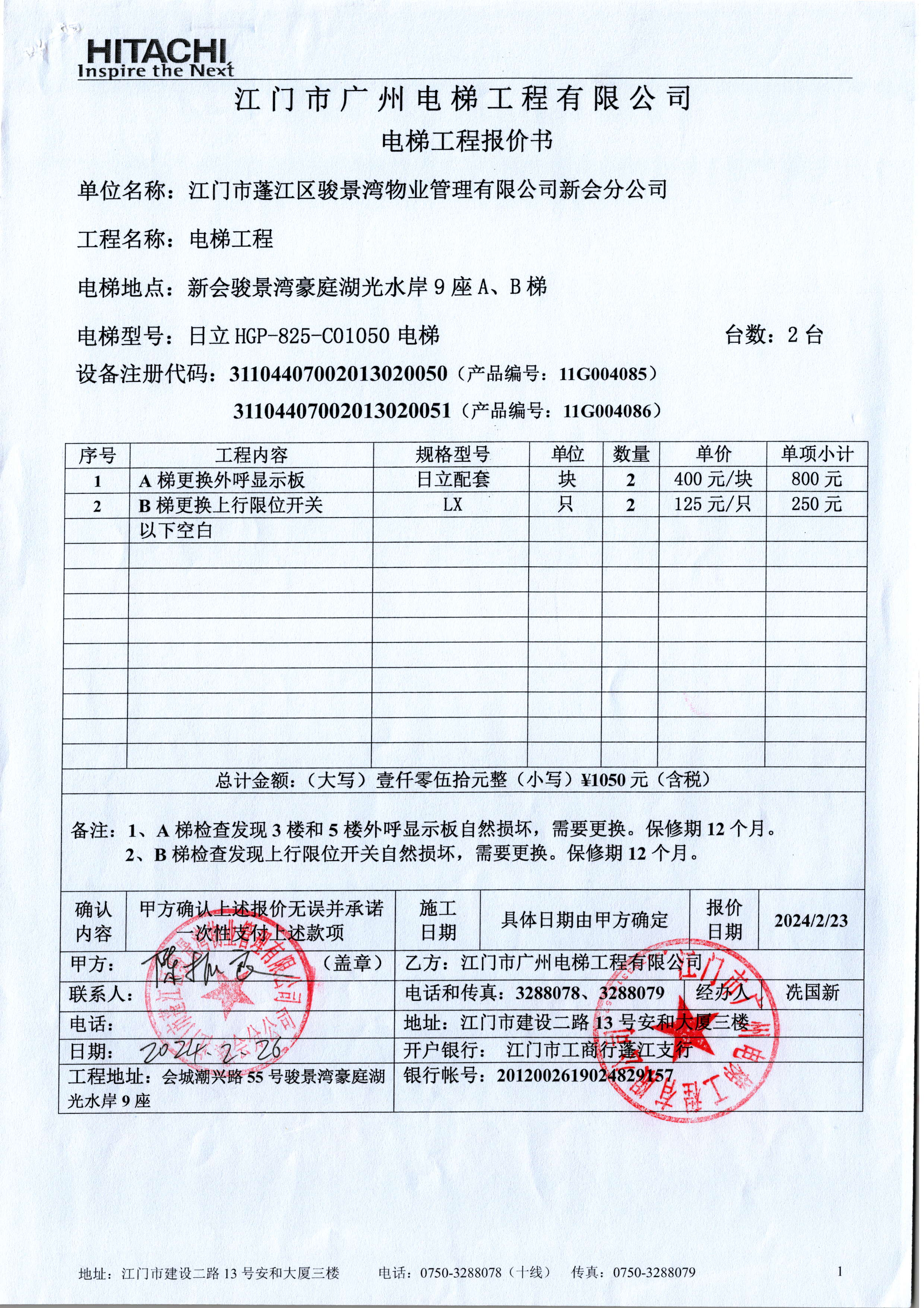 <td VALIGN="top" VALUES="" STYLE="border-width:0" BINDTYPE="0" ROWSPAN="19" COLSPAN="7" DATASOURCE="投票结果" ><font style="font-size:14pt;"><p style="white-space: normal; font-family: 宋体; line-height: 1.75em;">新会骏景湾豪庭湖光水岸9座全体业主:</p><p style="white-space: normal; font-family: 宋体; line-height: 1.75em; text-indent: 2em;">本小区关于新会骏景湾豪庭湖光水岸9座A梯更换外呼显示板、B梯更换上行限位开关使用维修资金的投票的投票已表决结束,询异时间从2024年05月05日开始,投票询异公示期间,业主可通过微信查询自己的表决情况或可凭身份证件申请查询自己的表决情况;如公示的业主表决情况与查询的本人表决意见不一致的,可以以书面形式向投票组织机构申诉,投票组织机构予以纠正并重新公示表决结果。异议提出人对投票组织机构的处理仍有异议的,可以向街道办事处(镇人民政府)反映处理,涉及住宅专项维修资金的,可向属地住宅专项维修资金管理中心反映处理。</p><p style="white-space: normal;"><br/></p><p style="white-space: normal; font-family: 宋体; line-height: 1.75em;"><strong>附件:</strong></p><p style="white-space: normal; font-family: 宋体; line-height: 1.75em;"><strong>一、投票范围</strong></p><p style="white-space: normal; font-family: 宋体; line-height: 1.75em; text-indent: 2em;">新会骏景湾豪庭湖光水岸9座</p><p style="white-space: normal; font-family: 宋体; line-height: 1.75em; text-indent: 2em;">总人数(专有部分人数之和):68</p><p style="white-space: normal; font-family: 宋体; line-height: 1.75em; text-indent: 2em;"><span style="font-family: 宋体, SimSun;"><span style="font-family: 宋体; text-indent: 32px;"><span style="font-family: 宋体; text-indent: 32px;">总户数:68</span></span></span></p><p style="white-space: normal; font-family: 宋体; line-height: 1.75em; text-indent: 2em;">建筑物总面积(专有部分面积之和):7729.75㎡</p><p style="white-space: normal; font-family: 宋体; line-height: 1.75em;"><strong>二、询异公示起止时间</strong></p><p dir="ltr" style="white-space: normal; font-family: 宋体; line-height: 1.75em; text-indent: 2em;"><span style="text-indent: 36px;">2024年05月05日至2024年05月11日</span></p><p style="white-space: normal; font-family: 宋体; line-height: 1.75em;"><strong>三、投票详细描述</strong></p><p style="white-space: normal; font-family: 宋体; line-height: 1.75em; text-indent: 2em;"><p style="margin-top: 0px; margin-bottom: 0px; padding: 0px;"> 小区湖光水岸9座A梯3楼和5楼外呼显示板不显示,经检查,发现是3楼和5楼外呼显示板自然损坏,B梯日常运行时出现异响,经检查,是使用时间较长,上行限位开关自然损坏,需要更换。</p><p style="margin-top: 0px; margin-bottom: 0px; padding: 0px;"> 现对湖光水岸9座A、B进行维修,工程维修预算金额为1050元,项目最终费用以施工合同签订金额为准。因已过保修期,维修费用由相关业主按建筑面积分摊,每平方约0.1358388046185元,详见公示附件。如业主手机不能正常通过微信投票,请联系物业公司进行线下纸质投票,物业电话:0750-6179992。</p><p style="margin-top: 0px; margin-bottom: 0px; padding: 0px;"><br style="white-space: normal;"/></p><p style="margin-top: 0px; margin-bottom: 0px; padding: 0px;"><br/></p></p><p style="white-space: normal; font-family: 宋体; line-height: 1.75em;"><strong>四、计票规则</strong></p><p style="white-space: normal; font-family: 宋体; line-height: 1.75em; text-indent: 2em;">表决事项:使用建筑物及其附属设施的维修资金<br /><p style='text-align: left; font-family: 宋体; font-size: 16px; line-height: 1.75em; text-indent: 2em;'>计票规则:弃权票不并入其它项 未表决票不并入其它项</p></p><p style="white-space: normal; font-family: 宋体; line-height: 1.75em;"><strong>五、通过规则</strong></p><p style="white-space: normal; font-family: 宋体; line-height: 1.75em;"><strong><strong style="white-space: normal;"><span style="font-family: 宋体, SimSun;"> 根据《中华人民共和国民法典》第二百七十八条规定:业主共同决定事项,应当由专有部分面积占比三分之二以上的业主且人数占比三分之二以上的业主参与表决。</span></strong></strong></p><p style="white-space: normal; font-family: 宋体; line-height: 1.75em; text-indent: 2em;">表决事项:使用建筑物及其附属设施的维修资金<br /><p style='text-align: left; font-family: 宋体; font-size: 16px; line-height: 1.75em; text-indent: 2em;'>通过规则:双2/3以上参与表决,参与表决双过半同意</p></p><p style="white-space: normal; font-family: 宋体; line-height: 1.75em;"><strong>六、投票结果</strong></p><p style="white-space: normal; font-family: 宋体; line-height: 1.75em; text-indent: 2em;"><div id='resultTable'><table style='table-layout: fixed; font-size:12px; margin-top:10px' width='100%' border='0' cellspacing='0' cellpadding='0'><tr><td height='28' colspan='10' align='center' style='border: 1px solid #666'><strong style='font-size: 14px;'> 使用建筑物及其附属设施的维修资金</strong></td> </tr><tr id='trfirst'><td height='28' colspan='4' style='border-left: 1px solid #666; border-bottom: 1px solid #666'><strong> 申报单位:</strong> 江门市蓬江区骏景湾物业管理有限公司新会分公司</td><td colspan='3' style='border-left: 1px solid #666; border-bottom: 1px solid #666'><strong> 联系方式:</strong> </td><td colspan='3' style='border-left: 1px solid #666; border-bottom: 1px solid #666; border-right: 1px solid #666'><strong> 申报日期:</strong> 2024年2月27日 </td></tr><tr> <td height='28' colspan='5' style='border-left: 1px solid #666; border-bottom: 1px solid #666'><strong> 总人数(专有部分人数之和):</strong>68人 </td><td colspan='