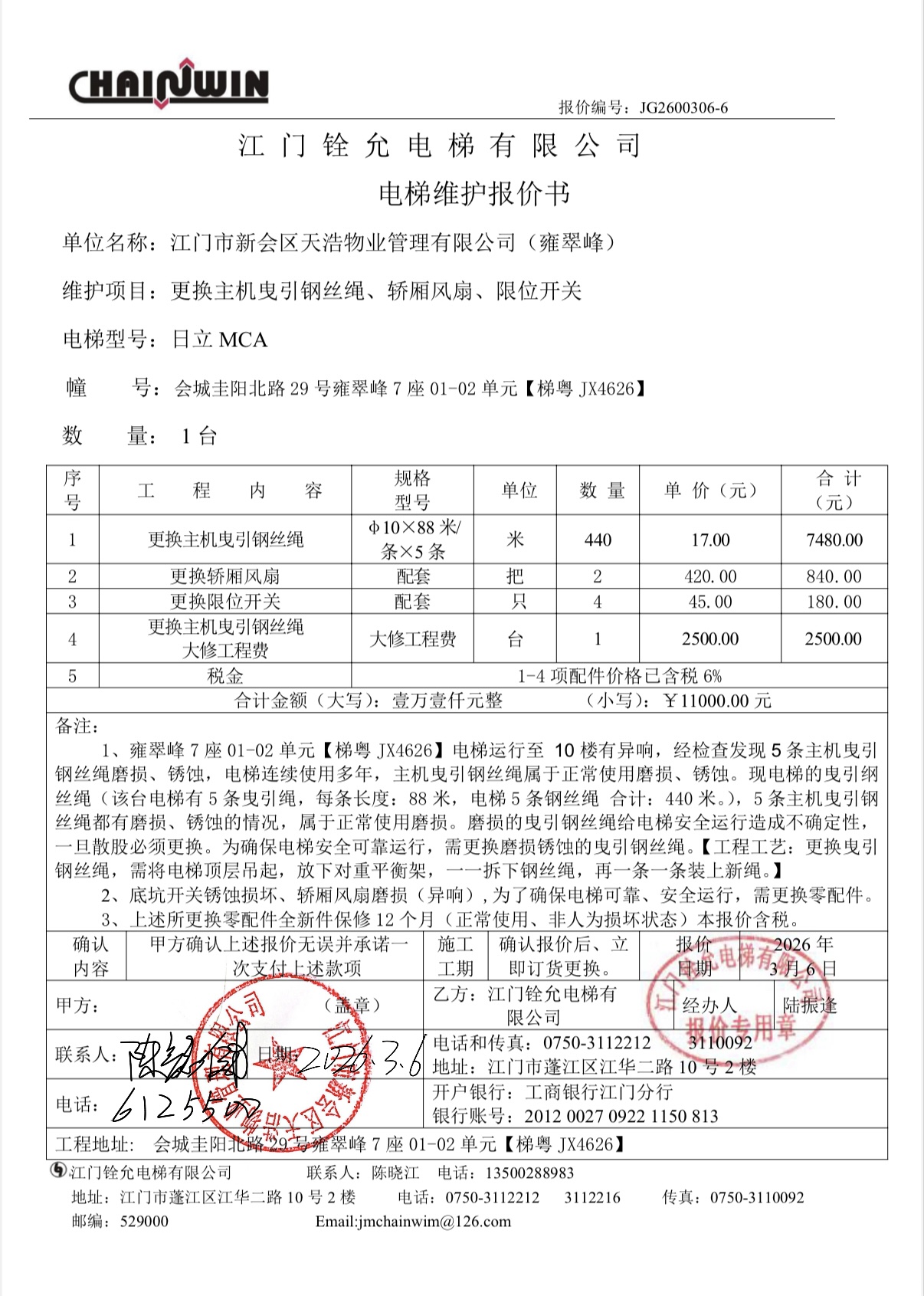 <td VALIGN="top" VALUES="" STYLE="border-width:0" BINDTYPE="0" ROWSPAN="19" COLSPAN="7" DATASOURCE="投票结果" ><font style="font-size:14pt;"><p style="white-space: normal; font-family: 宋体; line-height: 1.75em;">雍翠峰雍翠峰7座全体业主:</p><p style="white-space: normal; font-family: 宋体; line-height: 1.75em; text-indent: 2em;">本小区关于雍翠峰7座01-02单元电梯【梯粤JX4626】更换主机曳引钢丝绳、轿厢风扇和限位开关使用维修资金的投票的投票已表决结束,询异时间从2026年03月09日开始,投票询异公示期间,业主可通过微信查询自己的表决情况或可凭身份证件申请查询自己的表决情况;如公示的业主表决情况与查询的本人表决意见不一致的,可以以书面形式向投票组织机构申诉,投票组织机构予以纠正并重新公示表决结果。异议提出人对投票组织机构的处理仍有异议的,可以向街道办事处(镇人民政府)反映处理,涉及住宅专项维修资金的,可向属地住宅专项维修资金管理中心反映处理。</p><p style="white-space: normal;"><br/></p><p style="white-space: normal; font-family: 宋体; line-height: 1.75em;"><strong>附件:</strong></p><p style="white-space: normal; font-family: 宋体; line-height: 1.75em;"><strong>一、投票范围</strong></p><p style="white-space: normal; font-family: 宋体; line-height: 1.75em; text-indent: 2em;">雍翠峰雍翠峰7座</p><p style="white-space: normal; font-family: 宋体; line-height: 1.75em; text-indent: 2em;">总人数(专有部分人数之和):20</p><p style="white-space: normal; font-family: 宋体; line-height: 1.75em; text-indent: 2em;"><span style="font-family: 宋体, SimSun;"><span style="font-family: 宋体; text-indent: 32px;"><span style="font-family: 宋体; text-indent: 32px;">总户数:20</span></span></span></p><p style="white-space: normal; font-family: 宋体; line-height: 1.75em; text-indent: 2em;">建筑物总面积(专有部分面积之和):2342.33㎡</p><p style="white-space: normal; font-family: 宋体; line-height: 1.75em;"><strong>二、询异公示起止时间</strong></p><p dir="ltr" style="white-space: normal; font-family: 宋体; line-height: 1.75em; text-indent: 2em;"><span style="text-indent: 36px;">2026年03月09日至2026年03月19日</span></p><p style="white-space: normal; font-family: 宋体; line-height: 1.75em;"><strong>三、投票详细描述</strong></p><p style="white-space: normal; font-family: 宋体; line-height: 1.75em; text-indent: 2em;"><p> 雍翠峰7座01-02单元电梯【梯粤JX4626】,电梯上报运行至10楼有响声,经检查发现5条主机曳引钢丝绳锈蚀磨损、底坑开关锈蚀损坏和轿厢风扇异响,配件日常使用自然损坏,已过保修期。</p><p> 现需申请使用维修资金对7座01-02单元电梯【梯粤JX4626】进行维修,工程维修预算金额为11000元,项目最终费用以施工合同签订金额为准。维修费用的分摊标准为按分户分摊,每户分摊550元,详见公示附件。如业主不能正常通过微信投票,请联系物业公司进行线下纸质投票,物业电话:0750-6125500</p><p><br/></p></p><p style="white-space: normal; font-family: 宋体; line-height: 1.75em;"><strong>四、计票规则</strong></p><p style="white-space: normal; font-family: 宋体; line-height: 1.75em; text-indent: 2em;">表决事项:使用建筑物及其附属设施的维修资金<br /><p style='text-align: left; font-family: 宋体; font-size: 16px; line-height: 1.75em; text-indent: 2em;'>计票规则:弃权票不并入其它项 未表决票不并入其它项</p></p><p style="white-space: normal; font-family: 宋体; line-height: 1.75em;"><strong>五、通过规则</strong></p><p style="white-space: normal; font-family: 宋体; line-height: 1.75em;"><strong><strong style="white-space: normal;"><span style="font-family: 宋体, SimSun;"> 根据《中华人民共和国民法典》第二百七十八条规定:业主共同决定事项,应当由专有部分面积占比三分之二以上的业主且人数占比三分之二以上的业主参与表决。</span></strong></strong></p><p style="white-space: normal; font-family: 宋体; line-height: 1.75em; text-indent: 2em;">表决事项:使用建筑物及其附属设施的维修资金<br /><p style='text-align: left; font-family: 宋体; font-size: 16px; line-height: 1.75em; text-indent: 2em;'>通过规则:双2/3以上参与表决,参与表决双过半同意</p></p><p style="white-space: normal; font-family: 宋体; line-height: 1.75em;"><strong>六、投票结果</strong></p><p style="white-space: normal; font-family: 宋体; line-height: 1.75em; text-indent: 2em;"><div id='resultTable'><table style='table-layout: fixed; font-size:12px; margin-top:10px' width='100%' border='0' cellspacing='0' cellpadding='0'><tr><td height='28' colspan='10' align='center' style='border: 1px solid #666'><strong style='font-size: 14px;'> 使用建筑物及其附属设施的维修资金</strong></td> </tr><tr id='trfirst'><td height='28' colspan='4' style='border-left: 1px solid #666; border-bottom: 1px solid #666'><strong> 申报单位:</strong> 江门市新会区天浩物业管理有限公司</td><td colspan='3' style='border-left: 1px solid #666; border-bottom: 1px solid #666'><strong> 联系方式:</strong> </td><td colspan='3' style='border-left: 1px solid #666; border-bottom: 1px solid #666; border-right: 1px solid #666'><strong> 申报日期:</strong> 2026年3月6日 </td></tr><tr> <td height='28' colspan='5' style='border-left: 1px solid #666; border-bottom: 1px solid #666'><strong> 总人数(专有部分人数之和):</strong>20人 </td><td colspan='5' style='border-left: 1px solid #666; border-bottom: 1px solid #666; border-right: 1px solid #666'><strong> 建筑物总面积(专有部分面积之和):</strong>2342.33㎡ </td> </tr><tr><td height='28' colspan='10' bgcolor='#F3F3F3' style='border-left: 1px solid #666;border-bottom: 1px solid #666;borde