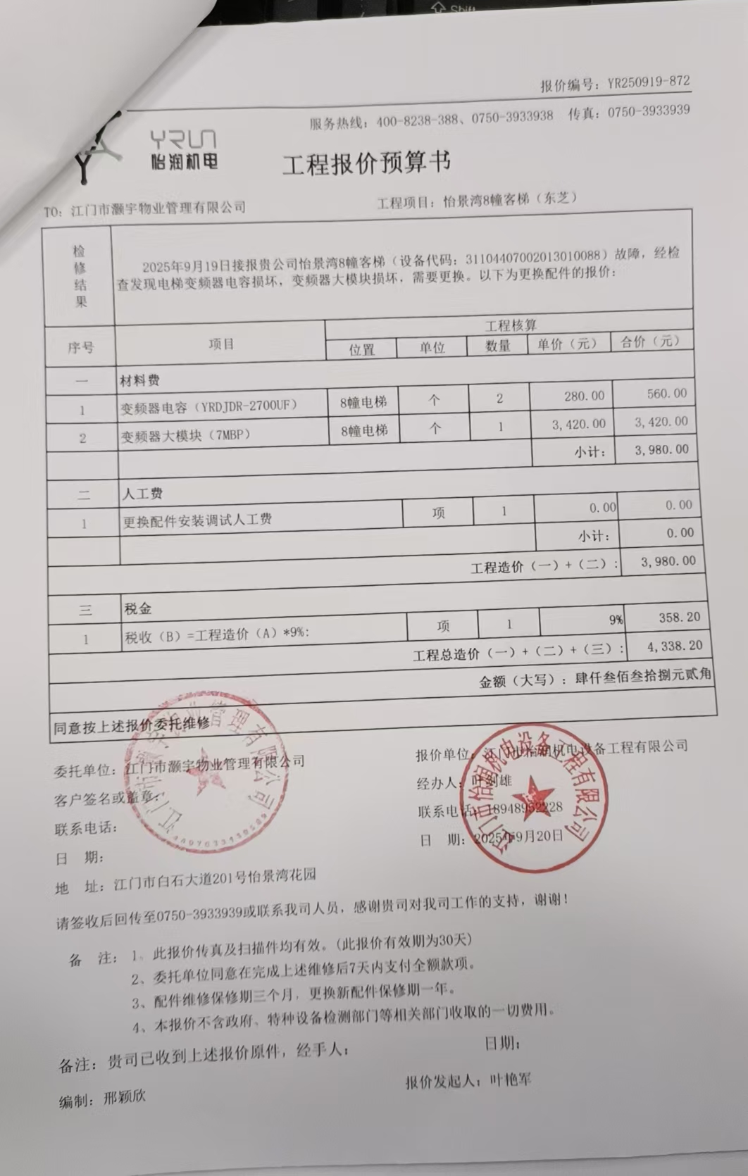 <td VALIGN="top" VALUES="" STYLE="border-width:0" BINDTYPE="0" ROWSPAN="17" COLSPAN="7" DATASOURCE="投票结果" ><font style=" font-family:方正小标宋简体;font-size:14pt;"><p style="line-height: 1.75em;"><span style="font-family: 宋体, SimSun;">各位尊敬的业主:</span><br/></p><p style="text-indent: 2em; line-height: 1.75em;"><span style="font-family: 宋体, SimSun;">根据法律法规的规定,本小区业主利用“江门市物业事项表决管理系统”已对本小区公共事务决策事项(<span style="font-family: 宋体; text-indent: 32px;">蓬江区怡景湾8幢客梯变频器电容2个、大模块1个更换维修使用维修资金的投票</span>)进行了表决,在经过7日的询异公示期后,未收到业主有效的异议。现将投票结果公告,并就产生的法律效力说明如下:</span></p><p style="line-height: 1.75em; text-indent: 0em;"><strong style="text-indent: 2em;"><span style="font-family: 宋体, SimSun;">一、投票范围</span></strong></p><p style="text-indent: 2em; line-height: 1.75em;"><span style="font-family: 宋体, SimSun;">蓬江区怡景湾蓬江区怡景湾花园8幢</span></p><p style="text-indent: 2em; line-height: 1.75em;"><span style="font-family: 宋体, SimSun;">总人数(专有部分人数之和):68</span></p><p style="text-indent: 2em; line-height: 1.75em;"><span style="font-family: 宋体, SimSun;"><span style="font-family: 宋体, SimSun; text-indent: 32px;"><span style="font-family: 宋体; text-indent: 32px;"><span style="font-family: 宋体; text-indent: 32px;">总户数:68</span></span></span></span></p><p style="text-indent: 2em; line-height: 1.75em;"><span style="font-family: 宋体, SimSun;">建筑物总面积(专有部分面积之和):8221.21㎡</span></p><p style="line-height: 1.75em;"><strong><span style="font-family: 宋体, SimSun;">二、投票结果公告时间</span></strong></p><p style="text-indent: 2em; line-height: 1.75em;"><span style="font-family: 宋体, SimSun;"><span style="font-family: 宋体, SimSun; text-indent: 32px;">从2025年12月27日开始</span></span></p><p style="line-height: 1.75em;"><strong><span style="font-family: 宋体, SimSun;">三、计票规则</span></strong></p><p style="text-indent: 2em; line-height: 1.75em;"><span style="font-family: 宋体, SimSun;">表决事项:蓬江区怡景湾8幢客梯变频器电容2个、大模块1个设施设备维修使用维修资金的投票<br /><p style='font-family: 宋体, SimSun;line-height: 1.75em; text-indent: 2em;'>计票规则:弃权票不并入其它项&nbsp;&nbsp;&nbsp;&nbsp;未表决票不并入其它项</p></span></p><p style="line-height: 1.75em;"><strong><span style="font-family: 宋体, SimSun;">四、通过规则</span></strong></p><p style="line-height: 1.75em;"><strong><span style="font-family: 宋体, SimSun;">&nbsp; 根据《中华人民共和国民法典》第二百七十八条规定:业主共同决定事项,应当由专有部分面积占比三分之二以上的业主且人数占比三分之二以上的业主参与表决。</span></strong></p><p style="text-indent: 2em; line-height: 1.75em;"><span style="font-family: 宋体, SimSun;"><span style="font-family: 宋体, SimSun; text-indent: 32px;">表决事项:蓬江区怡景湾8幢客梯变频器电容2个、大模块1个设施设备维修使用维修资金的投票<br /><p style='font-family: 宋体, SimSun;line-height: 1.75em; text-indent: 2em;'>通过规则:双2/3以上参与表决,参与表决双过半同意</p></span></span></p><p style="line-height: 1.75em;"><strong><span style="font-family: 宋体, SimSun;">五、投票结果</span></strong></p><p style="line-height: 1.75em; text-indent: 2em;"><span style="font-family: 宋体, SimSun; text-indent: 2em;"><div id='resultTable'><table style='table-layout: fixed; font-size:12px; margin-top:10px' width='100%' border='0' cellspacing='0' cellpadding='0'><tr><td height='28' colspan='10' align='center' style='border: 1px solid #666'><strong style='font-size: 14px;'> 蓬江区怡景湾8幢客梯变频器电容2个、大模块1个设施设备维修使用维修资金的投票</strong></td> </tr><tr id='trfirst'><td height='28' colspan='4' style='border-left: 1px solid #666; border-bottom: 1px solid #666'><strong>&nbsp;申报单位:</strong> 江门市灏宇物业管理有限公司</td><td colspan='3' style='border-left: 1px solid #666; border-bottom: 1px solid #666'><strong>&nbsp;联系方式:</strong> </td><td colspan='3' style='border-left: 1px solid #666; border-bottom: 1px solid #666; border-right: 1px solid #666'><strong>&nbsp;申报日期:</strong> 2025年10月28日 </td></tr><tr> <td height='28' colspan='5' style='border-left: 1px solid #666; border-bottom: 1px solid #666'><strong>&nbsp;列支总人数(专有部分人数之和):</strong>68人 </td><td colspan='5' style='border-left: 1px solid #666; border-bottom: 1px solid #666; border-right: 1px solid #666'><strong>&nbsp;列支建筑物总面积(专有部分面积之和):</strong>8221.21㎡ </td> </tr><tr><td height='28' colspan='10' bgcolor='#F3F3F3' style='border-left: 1px solid #666;border-bottom: 1px solid #666;border-right: 1px solid #666'><strong>&nbsp;参与表决人数及面积统计</strong></td></tr><tr><td height='28' colspan='5' style='border-left: 1px solid #666; border-bottom: 1px solid #666'><strong>&nbsp;参与表决人数:</strong>52人</td><td colspan='5' style='border-left: 1px solid #666; border-bottom: 1px solid #666; border-right: 1px solid #666'><strong>&nbsp;参与表决人数占总人数比例:</strong>76.47%</td></tr><tr><td height='28' colspan='5' style='border-left: 1px solid #666; border-bottom: 1px solid #666'><strong>&nbsp;参与表决面积:</strong>6272.16㎡</td><td colspan='5' style='border-left: 1px solid #666; border-bottom: 1px solid #666; border-right: 1px solid #666'><strong>&nbsp;参与表决面积占总面积比例:</strong>76.29%</td></tr><tr><td height='28' colspan='10' bgcolor='#F3F3F3' style='border-left: 1px solid #666;