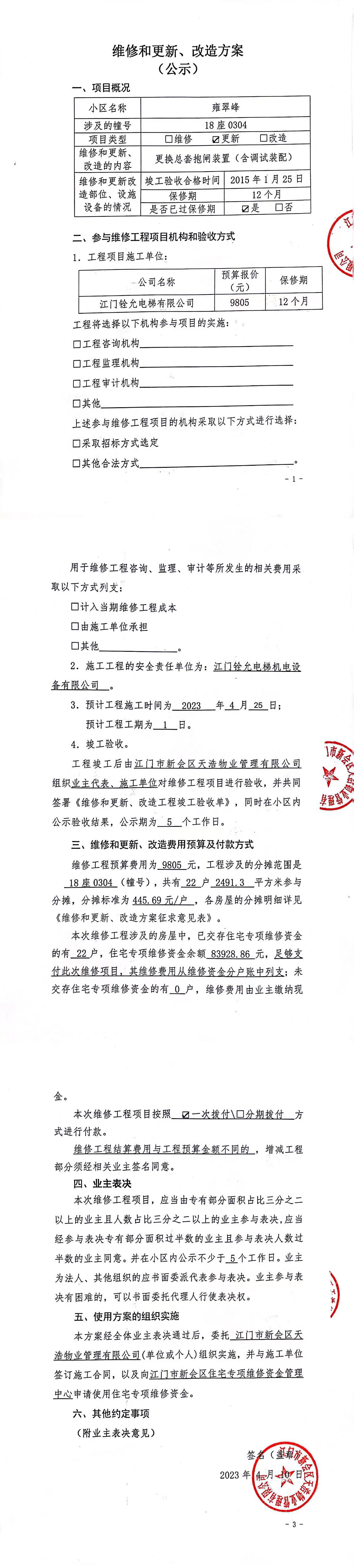 <td valign="top" values="" style="border-width:0" bindtype="0" rowspan="17" colspan="7" datasource="投票结果"><font style=" font-family:方正小标宋简体;font-size:14pt;"><p style="line-height: 1.75em;"><span style="font-family: 宋体, SimSun;">各位尊敬的业主:</span><br></p><p style="text-indent: 2em; line-height: 1.75em;"><span style="font-family: 宋体, SimSun;">根据法律法规的规定,本小区业主利用“物业公共事务决策系统”已对本小区公共事务决策事项进行了表决,在经过7日的询异公示期后,未收到业主有效的异议。现将投票结果公告,并就产生的法律效力说明如下:</span></p><p style="line-height: 1.75em; text-indent: 0em;"><strong style="text-indent: 2em;"><span style="font-family: 宋体, SimSun;">一、投票范围</span></strong></p><p style="text-indent: 2em; line-height: 1.75em;"><span style="font-family: 宋体, SimSun;">雍翠峰雍翠峰18座</span></p><p style="text-indent: 2em; line-height: 1.75em;"><span style="font-family: 宋体, SimSun;">总人数(专有部分人数之和):22</span></p><p style="text-indent: 2em; line-height: 1.75em;"><span style="font-family: 宋体, SimSun;"><span style="font-family: 宋体, SimSun; text-indent: 32px;">总户数:22</span></span></p><p style="text-indent: 2em; line-height: 1.75em;"><span style="font-family: 宋体, SimSun;">建筑物总面积(专有部分面积之和):2491.30㎡</span></p><p style="line-height: 1.75em;"><strong><span style="font-family: 宋体, SimSun;">二、投票起止时间</span></strong></p><p style="text-indent: 2em; line-height: 1.75em;"><span style="font-family: 宋体, SimSun;">投票表决时间:从2023年04月12日到2023年05月08日止</span></p><p style="text-indent: 2em; line-height: 1.75em;"><span style="font-family: 宋体, SimSun;">投票询异公示时间:从2023年05月09日开始</span></p><p style="text-indent: 2em; line-height: 1.75em;"><span style="font-family: 宋体, SimSun;">投票结果通知公告时间:从2023年05月16日开始</span></p><p style="line-height: 1.75em;"><strong><span style="font-family: 宋体, SimSun;">三、计票规则</span></strong></p><p style="text-indent: 2em; line-height: 1.75em;"><span style="font-family: 宋体, SimSun;">表决事项:使用建筑物及其附属设施的维修资金<br></span></p><p style="font-family: 宋体, SimSun;line-height: 1.75em; text-indent: 2em;">计票规则:弃权票并入计入表决多数票 未表决票不并入其它项</p><p></p><p style="line-height: 1.75em;"><strong><span style="font-family: 宋体, SimSun;">四、通过规则</span></strong></p><p style="text-indent: 2em; line-height: 1.75em;"><span style="font-family: 宋体, SimSun;"><span style="font-family: 宋体, SimSun; text-indent: 32px;">表决事项:使用建筑物及其附属设施的维修资金<br></span></span></p><p style="font-family: 宋体, SimSun;line-height: 1.75em; text-indent: 2em;">通过规则:参与表决专有部分面积过半数的业主且参与表决人数过半数的业主同意</p><p></p><p style="line-height: 1.75em;"><strong><span style="font-family: 宋体, SimSun;">五、投票结果</span></strong></p><p style="line-height: 1.75em; text-indent: 2em;"><span style="font-family: 宋体, SimSun; text-indent: 2em;"></span></p><div id="resultTable"><table style="table-layout: fixed; font-size:12px; margin-top:10px" width="100%" border="0" cellspacing="0" cellpadding="0"><tbody><tr><td height="28" colspan="10" align="center" style="border: 1px solid #666"><strong style="font-size: 14px;"> 使用建筑物及其附属设施的维修资金</strong></td> </tr><tr id="trfirst"><td height="28" colspan="4" style="border-left: 1px solid #666; border-bottom: 1px solid #666"><strong> 申报单位:</strong> 江门市新会区天浩物业管理有限公司</td><td colspan="3" style="border-left: 1px solid #666; border-bottom: 1px solid #666"><strong> 联系方式:</strong> </td><td colspan="3" style="border-left: 1px solid #666; border-bottom: 1px solid #666; border-right: 1px solid #666"><strong> 申报日期:</strong> 2023年4月12日 </td></tr><tr> <td height="28" colspan="5" style="border-left: 1px solid #666; border-bottom: 1px solid #666"><strong> 总人数(专有部分人数之和):</strong>22人 </td><td colspan="5" style="border-left: 1px solid #666; border-bottom: 1px solid #666; border-right: 1px solid #666"><strong> 建筑物总面积(专有部分面积之和):</strong>2491.30㎡ </td> </tr><tr><td height="28" colspan="10" bgcolor="#F3F3F3" style="border-left: 1px solid #666;border-bottom: 1px solid #666;border-right: 1px solid #666"><strong> 参与人数及面积统计</strong></td></tr><tr><td height="28" colspan="5" style="border-left: 1px solid #666; border-bottom: 1px solid #666"><strong> 参与表决专有部分人数之和:</strong>15人</td><td colspan="5" style="border-left: 1px solid #666; border-bottom: 1px solid #666; border-right: 1px solid #666"><strong> 参与表决占有表决权总人数比例:</strong>68.18%</td></tr><tr><td height="28" colspan="5" style="border-left: 1px solid #666; border-bottom: 1px solid #666"><strong> 参与表决专有部分面积之和:</strong>1722.93㎡</td><td colspan="5" style="border-left: 1px solid #666; border-bottom: 1px solid #666; border-right: 1px solid #666"><strong> 参与表决占有表决权总面积比例:</strong>69.16%</td></tr><tr><td height="28" colspan="10" bgcolor="#F3F3F3" style="border-left: 1px solid #666; border-bottom: 1px solid #666;border-right: 1px solid #666"> <strong> 未参与人数及面积统计</strong></td> </tr><tr><td height="28" colspan="5" style="border-left: 1px solid #666; border-bottom: 1px solid #666"><strong> 未参与表决专有部分人数之和:</strong>7人 </td><td colspan="5" style="border-left: 1px solid #666; border-bottom: 1px solid #666; border-right: 1px solid #666"><strong> 未参与表决占有表决权总人数比例:</strong>31.82%</td></tr><tr><td height="28" co
