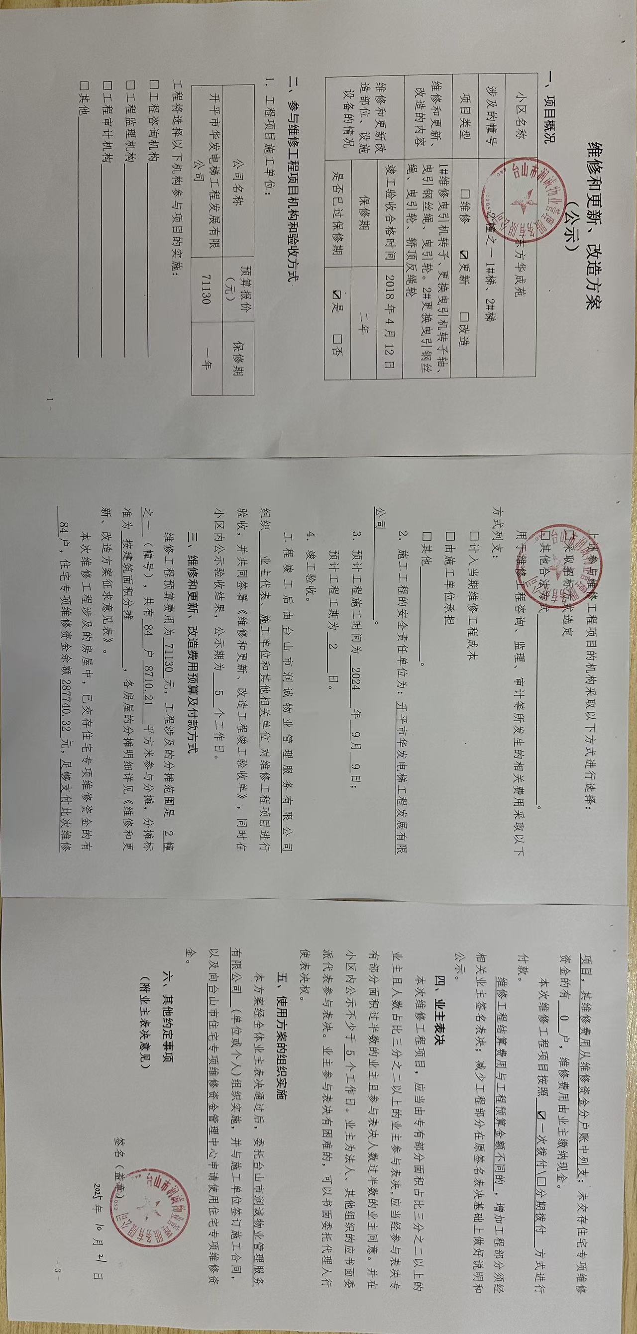 <td VALIGN="top" VALUES="" STYLE="border-width:0" BINDTYPE="0" ROWSPAN="17" COLSPAN="7" DATASOURCE="投票结果" ><font style=" font-family:方正小标宋简体;font-size:14pt;"><p style="line-height: 1.75em;"><span style="font-family: 宋体, SimSun;">各位尊敬的业主:</span><br/></p><p style="text-indent: 2em; line-height: 1.75em;"><span style="font-family: 宋体, SimSun;">根据法律法规的规定,本小区业主利用“江门市物业事项表决管理系统”已对本小区公共事务决策事项(<span style="font-family: 宋体; text-indent: 32px;">东方华成苑2幢之一1#和2#电梯更换曳引钢丝绳、曳引轮等配件的使用维修资金投票</span>)进行了表决,在经过7日的询异公示期后,未收到业主有效的异议。现将投票结果公告,并就产生的法律效力说明如下:</span></p><p style="line-height: 1.75em; text-indent: 0em;"><strong style="text-indent: 2em;"><span style="font-family: 宋体, SimSun;">一、投票范围</span></strong></p><p style="text-indent: 2em; line-height: 1.75em;"><span style="font-family: 宋体, SimSun;">台城东方华成苑2座1梯</span></p><p style="text-indent: 2em; line-height: 1.75em;"><span style="font-family: 宋体, SimSun;">总人数(专有部分人数之和):84</span></p><p style="text-indent: 2em; line-height: 1.75em;"><span style="font-family: 宋体, SimSun;"><span style="font-family: 宋体, SimSun; text-indent: 32px;"><span style="font-family: 宋体; text-indent: 32px;"><span style="font-family: 宋体; text-indent: 32px;">总户数:84</span></span></span></span></p><p style="text-indent: 2em; line-height: 1.75em;"><span style="font-family: 宋体, SimSun;">建筑物总面积(专有部分面积之和):8710.21㎡</span></p><p style="line-height: 1.75em;"><strong><span style="font-family: 宋体, SimSun;">二、投票结果公告时间</span></strong></p><p style="text-indent: 2em; line-height: 1.75em;"><span style="font-family: 宋体, SimSun;"><span style="font-family: 宋体, SimSun; text-indent: 32px;">从2025年11月28日开始</span></span></p><p style="line-height: 1.75em;"><strong><span style="font-family: 宋体, SimSun;">三、计票规则</span></strong></p><p style="text-indent: 2em; line-height: 1.75em;"><span style="font-family: 宋体, SimSun;">表决事项:使用建筑物及其附属设施的维修资金<br /><p style='font-family: 宋体, SimSun;line-height: 1.75em; text-indent: 2em;'>计票规则:弃权票不并入其它项&nbsp;&nbsp;&nbsp;&nbsp;未表决票不并入其它项</p></span></p><p style="line-height: 1.75em;"><strong><span style="font-family: 宋体, SimSun;">四、通过规则</span></strong></p><p style="line-height: 1.75em;"><strong><span style="font-family: 宋体, SimSun;">&nbsp; 根据《中华人民共和国民法典》第二百七十八条规定:业主共同决定事项,应当由专有部分面积占比三分之二以上的业主且人数占比三分之二以上的业主参与表决。</span></strong></p><p style="text-indent: 2em; line-height: 1.75em;"><span style="font-family: 宋体, SimSun;"><span style="font-family: 宋体, SimSun; text-indent: 32px;">表决事项:使用建筑物及其附属设施的维修资金<br /><p style='font-family: 宋体, SimSun;line-height: 1.75em; text-indent: 2em;'>通过规则:双2/3以上参与表决,参与表决双过半同意</p></span></span></p><p style="line-height: 1.75em;"><strong><span style="font-family: 宋体, SimSun;">五、投票结果</span></strong></p><p style="line-height: 1.75em; text-indent: 2em;"><span style="font-family: 宋体, SimSun; text-indent: 2em;"><div id='resultTable'><table style='table-layout: fixed; font-size:12px; margin-top:10px' width='100%' border='0' cellspacing='0' cellpadding='0'><tr><td height='28' colspan='10' align='center' style='border: 1px solid #666'><strong style='font-size: 14px;'> 使用建筑物及其附属设施的维修资金</strong></td> </tr><tr id='trfirst'><td height='28' colspan='4' style='border-left: 1px solid #666; border-bottom: 1px solid #666'><strong>&nbsp;申报单位:</strong> 台山市润诚物业管理服务有限公司</td><td colspan='3' style='border-left: 1px solid #666; border-bottom: 1px solid #666'><strong>&nbsp;联系方式:</strong> 13790301587 </td><td colspan='3' style='border-left: 1px solid #666; border-bottom: 1px solid #666; border-right: 1px solid #666'><strong>&nbsp;申报日期:</strong> 2025年10月22日 </td></tr><tr> <td height='28' colspan='5' style='border-left: 1px solid #666; border-bottom: 1px solid #666'><strong>&nbsp;列支总人数(专有部分人数之和):</strong>84人 </td><td colspan='5' style='border-left: 1px solid #666; border-bottom: 1px solid #666; border-right: 1px solid #666'><strong>&nbsp;列支建筑物总面积(专有部分面积之和):</strong>8710.21㎡ </td> </tr><tr><td height='28' colspan='10' bgcolor='#F3F3F3' style='border-left: 1px solid #666;border-bottom: 1px solid #666;border-right: 1px solid #666'><strong>&nbsp;参与表决人数及面积统计</strong></td></tr><tr><td height='28' colspan='5' style='border-left: 1px solid #666; border-bottom: 1px solid #666'><strong>&nbsp;参与表决人数:</strong>7人</td><td colspan='5' style='border-left: 1px solid #666; border-bottom: 1px solid #666; border-right: 1px solid #666'><strong>&nbsp;参与表决人数占总人数比例:</strong>8.33%</td></tr><tr><td height='28' colspan='5' style='border-left: 1px solid #666; border-bottom: 1px solid #666'><strong>&nbsp;参与表决面积:</strong>712.21㎡</td><td colspan='5' style='border-left: 1px solid #666; border-bottom: 1px solid #666; border-right: 1px solid #666'><strong>&nbsp;参与表决面积占总面积比例:</strong>8.18%</td></tr><tr><td height='28' colspan='10' bgcolor='#F3F3F3' style='border-left: 1px solid #666; border-bottom: 1px solid #666;border-right: 1px solid #666'> <strong>&nbsp;参与表决同意人数及面积统计</strong></td> </tr><tr><td height='28' colspan='5' style='bord
