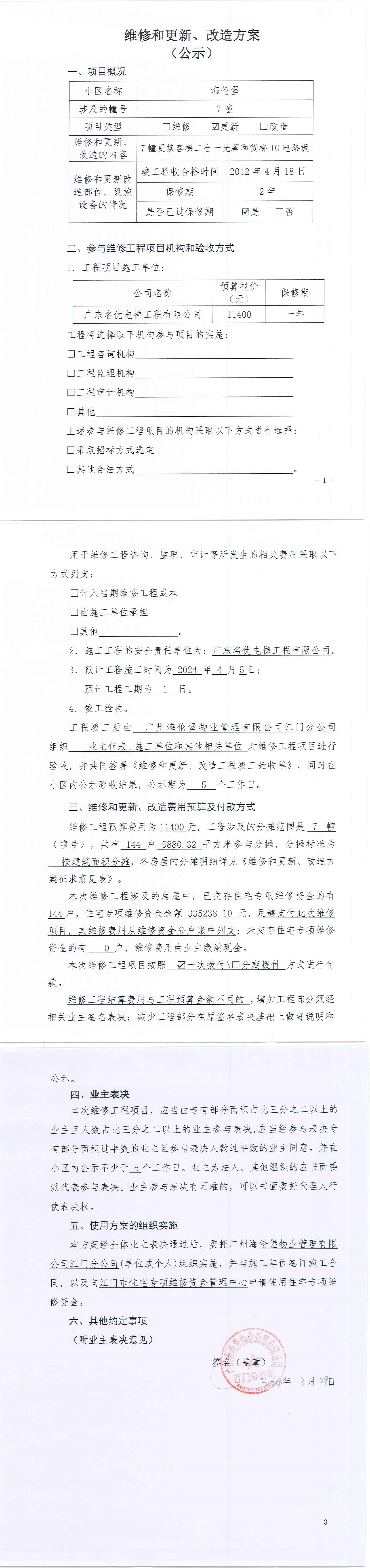 <td VALIGN="top" VALUES="" STYLE="border-width:0" BINDTYPE="0" ROWSPAN="17" COLSPAN="7" DATASOURCE="投票结果" ><font style=" font-family:方正小标宋简体;font-size:14pt;"><p style="line-height: 1.75em;"><span style="font-family: 宋体, SimSun;">各位尊敬的业主:</span><br/></p><p style="text-indent: 2em; line-height: 1.75em;"><span style="font-family: 宋体, SimSun;">根据法律法规的规定,本小区业主利用“江门市物业事项表决管理系统”已对本小区公共事务决策事项进行了表决,在经过7日的询异公示期后,未收到业主有效的异议。现将投票结果公告,并就产生的法律效力说明如下:</span></p><p style="line-height: 1.75em; text-indent: 0em;"><strong style="text-indent: 2em;"><span style="font-family: 宋体, SimSun;">一、投票范围</span></strong></p><p style="text-indent: 2em; line-height: 1.75em;"><span style="font-family: 宋体, SimSun;">海伦堡蓬江区海伦堡7幢</span></p><p style="text-indent: 2em; line-height: 1.75em;"><span style="font-family: 宋体, SimSun;">总人数(专有部分人数之和):83</span></p><p style="text-indent: 2em; line-height: 1.75em;"><span style="font-family: 宋体, SimSun;"><span style="font-family: 宋体, SimSun; text-indent: 32px;"><span style="font-family: 宋体; text-indent: 32px;"><span style="font-family: 宋体; text-indent: 32px;">总户数:144</span></span></span></span></p><p style="text-indent: 2em; line-height: 1.75em;"><span style="font-family: 宋体, SimSun;">建筑物总面积(专有部分面积之和):9880.32㎡</span></p><p style="line-height: 1.75em;"><strong><span style="font-family: 宋体, SimSun;">二、投票结果公告时间</span></strong></p><p style="text-indent: 2em; line-height: 1.75em;"><span style="font-family: 宋体, SimSun;">从2024年04月16日开始</span></p><p style="line-height: 1.75em;"><strong><span style="font-family: 宋体, SimSun;">三、计票规则</span></strong></p><p style="text-indent: 2em; line-height: 1.75em;"><span style="font-family: 宋体, SimSun;">表决事项:使用建筑物及其附属设施的维修资金<br /><p style='font-family: 宋体, SimSun;line-height: 1.75em; text-indent: 2em;'>计票规则:弃权票不并入其它项&nbsp;&nbsp;&nbsp;&nbsp;未表决票不并入其它项</p></span></p><p style="line-height: 1.75em;"><strong><span style="font-family: 宋体, SimSun;">四、通过规则</span></strong></p><p style="line-height: 1.75em;"><strong><span style="font-family: 宋体, SimSun;">&nbsp; 根据《中华人民共和国民法典》第二百七十八条规定:业主共同决定事项,应当由专有部分面积占比三分之二以上的业主且人数占比三分之二以上的业主参与表决。</span></strong></p><p style="text-indent: 2em; line-height: 1.75em;"><span style="font-family: 宋体, SimSun;"><span style="font-family: 宋体, SimSun; text-indent: 32px;">表决事项:使用建筑物及其附属设施的维修资金<br /><p style='font-family: 宋体, SimSun;line-height: 1.75em; text-indent: 2em;'>通过规则:双2/3以上参与表决,参与表决双过半同意</p></span></span></p><p style="line-height: 1.75em;"><strong><span style="font-family: 宋体, SimSun;">五、投票结果</span></strong></p><p style="line-height: 1.75em; text-indent: 2em;"><span style="font-family: 宋体, SimSun; text-indent: 2em;"><div id='resultTable'><table style='table-layout: fixed; font-size:12px; margin-top:10px' width='100%' border='0' cellspacing='0' cellpadding='0'><tr><td height='28' colspan='10' align='center' style='border: 1px solid #666'><strong style='font-size: 14px;'> 使用建筑物及其附属设施的维修资金</strong></td> </tr><tr id='trfirst'><td height='28' colspan='4' style='border-left: 1px solid #666; border-bottom: 1px solid #666'><strong>&nbsp;申报单位:</strong> 广州海伦堡物业管理有限公司江门分公司</td><td colspan='3' style='border-left: 1px solid #666; border-bottom: 1px solid #666'><strong>&nbsp;联系方式:</strong> 0750-3380006 </td><td colspan='3' style='border-left: 1px solid #666; border-bottom: 1px solid #666; border-right: 1px solid #666'><strong>&nbsp;申报日期:</strong> 2024年3月29日 </td></tr><tr> <td height='28' colspan='5' style='border-left: 1px solid #666; border-bottom: 1px solid #666'><strong>&nbsp;列支总人数(专有部分人数之和):</strong>83人 </td><td colspan='5' style='border-left: 1px solid #666; border-bottom: 1px solid #666; border-right: 1px solid #666'><strong>&nbsp;列支建筑物总面积(专有部分面积之和):</strong>9880.32㎡ </td> </tr><tr><td height='28' colspan='10' bgcolor='#F3F3F3' style='border-left: 1px solid #666;border-bottom: 1px solid #666;border-right: 1px solid #666'><strong>&nbsp;参与表决人数及面积统计</strong></td></tr><tr><td height='28' colspan='5' style='border-left: 1px solid #666; border-bottom: 1px solid #666'><strong>&nbsp;参与表决人数:</strong>63人</td><td colspan='5' style='border-left: 1px solid #666; border-bottom: 1px solid #666; border-right: 1px solid #666'><strong>&nbsp;参与表决人数占总人数比例:</strong>75.90%</td></tr><tr><td height='28' colspan='5' style='border-left: 1px solid #666; border-bottom: 1px solid #666'><strong>&nbsp;参与表决面积:</strong>7392.31㎡</td><td colspan='5' style='border-left: 1px solid #666; border-bottom: 1px solid #666; border-right: 1px solid #666'><strong>&nbsp;参与表决面积占总面积比例:</strong>74.82%</td></tr><tr><td height='28' colspan='10' bgcolor='#F3F3F3' style='border-left: 1px solid #666; border-bottom: 1px solid #666;border-right: 1px solid #666'> <strong>&nbsp;参与表决同意人数及面积统计</strong></td> </tr><tr><td height='28' colspan='5' style='border-left: 1px solid #666; border-bottom: 1px solid #666'><strong>&nbsp;参与表决同意人数:</strong>61人 </td><td colspan='5' style='border-left: 1px solid #666; border-bottom: 1px solid #666; border-right: 1px solid #