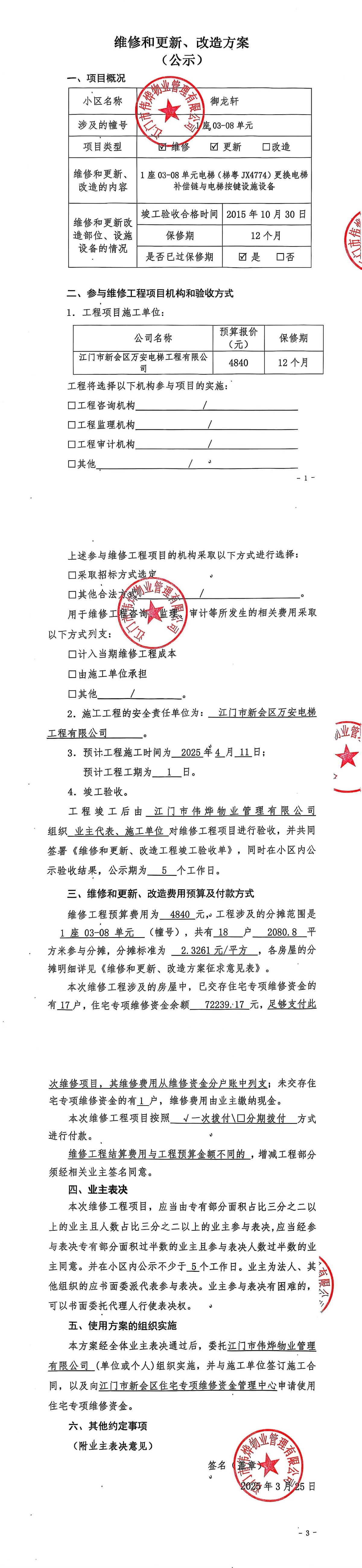 <td VALIGN="top" VALUES="" STYLE="border-width:0" BINDTYPE="0" ROWSPAN="17" COLSPAN="7" DATASOURCE="投票结果" ><font style=" font-family:方正小标宋简体;font-size:14pt;"><p style="line-height: 1.75em;"><span style="font-family: 宋体, SimSun;">各位尊敬的业主:</span><br/></p><p style="text-indent: 2em; line-height: 1.75em;"><span style="font-family: 宋体, SimSun;">根据法律法规的规定,本小区业主利用“江门市物业事项表决管理系统”已对本小区公共事务决策事项(<span style="font-family: 宋体; text-indent: 32px;">御龙轩1座03-08单元电梯(梯粤JX4774)更换电梯补偿链与电梯按键使用维修资金的投票</span>)进行了表决,在经过7日的询异公示期后,未收到业主有效的异议。现将投票结果公告,并就产生的法律效力说明如下:</span></p><p style="line-height: 1.75em; text-indent: 0em;"><strong style="text-indent: 2em;"><span style="font-family: 宋体, SimSun;">一、投票范围</span></strong></p><p style="text-indent: 2em; line-height: 1.75em;"><span style="font-family: 宋体, SimSun;">御龙轩御龙轩1座</span></p><p style="text-indent: 2em; line-height: 1.75em;"><span style="font-family: 宋体, SimSun;">总人数(专有部分人数之和):18</span></p><p style="text-indent: 2em; line-height: 1.75em;"><span style="font-family: 宋体, SimSun;"><span style="font-family: 宋体, SimSun; text-indent: 32px;"><span style="font-family: 宋体; text-indent: 32px;"><span style="font-family: 宋体; text-indent: 32px;">总户数:18</span></span></span></span></p><p style="text-indent: 2em; line-height: 1.75em;"><span style="font-family: 宋体, SimSun;">建筑物总面积(专有部分面积之和):2080.80㎡</span></p><p style="line-height: 1.75em;"><strong><span style="font-family: 宋体, SimSun;">二、投票结果公告时间</span></strong></p><p style="text-indent: 2em; line-height: 1.75em;"><span style="font-family: 宋体, SimSun;"><span style="font-family: 宋体, SimSun; text-indent: 32px;">从2025年05月13日开始</span></span></p><p style="line-height: 1.75em;"><strong><span style="font-family: 宋体, SimSun;">三、计票规则</span></strong></p><p style="text-indent: 2em; line-height: 1.75em;"><span style="font-family: 宋体, SimSun;">表决事项:使用建筑物及其附属设施的维修资金<br /><p style='font-family: 宋体, SimSun;line-height: 1.75em; text-indent: 2em;'>计票规则:弃权票不并入其它项&nbsp;&nbsp;&nbsp;&nbsp;未表决票不并入其它项</p></span></p><p style="line-height: 1.75em;"><strong><span style="font-family: 宋体, SimSun;">四、通过规则</span></strong></p><p style="line-height: 1.75em;"><strong><span style="font-family: 宋体, SimSun;">&nbsp; 根据《中华人民共和国民法典》第二百七十八条规定:业主共同决定事项,应当由专有部分面积占比三分之二以上的业主且人数占比三分之二以上的业主参与表决。</span></strong></p><p style="text-indent: 2em; line-height: 1.75em;"><span style="font-family: 宋体, SimSun;"><span style="font-family: 宋体, SimSun; text-indent: 32px;">表决事项:使用建筑物及其附属设施的维修资金<br /><p style='font-family: 宋体, SimSun;line-height: 1.75em; text-indent: 2em;'>通过规则:双2/3以上参与表决,参与表决双过半同意</p></span></span></p><p style="line-height: 1.75em;"><strong><span style="font-family: 宋体, SimSun;">五、投票结果</span></strong></p><p style="line-height: 1.75em; text-indent: 2em;"><span style="font-family: 宋体, SimSun; text-indent: 2em;"><div id='resultTable'><table style='table-layout: fixed; font-size:12px; margin-top:10px' width='100%' border='0' cellspacing='0' cellpadding='0'><tr><td height='28' colspan='10' align='center' style='border: 1px solid #666'><strong style='font-size: 14px;'> 使用建筑物及其附属设施的维修资金</strong></td> </tr><tr id='trfirst'><td height='28' colspan='4' style='border-left: 1px solid #666; border-bottom: 1px solid #666'><strong>&nbsp;申报单位:</strong> 江门市伟烨物业管理有限公司</td><td colspan='3' style='border-left: 1px solid #666; border-bottom: 1px solid #666'><strong>&nbsp;联系方式:</strong> 0750-6123828 </td><td colspan='3' style='border-left: 1px solid #666; border-bottom: 1px solid #666; border-right: 1px solid #666'><strong>&nbsp;申报日期:</strong> 2025年3月26日 </td></tr><tr> <td height='28' colspan='5' style='border-left: 1px solid #666; border-bottom: 1px solid #666'><strong>&nbsp;列支总人数(专有部分人数之和):</strong>18人 </td><td colspan='5' style='border-left: 1px solid #666; border-bottom: 1px solid #666; border-right: 1px solid #666'><strong>&nbsp;列支建筑物总面积(专有部分面积之和):</strong>2080.80㎡ </td> </tr><tr><td height='28' colspan='10' bgcolor='#F3F3F3' style='border-left: 1px solid #666;border-bottom: 1px solid #666;border-right: 1px solid #666'><strong>&nbsp;参与表决人数及面积统计</strong></td></tr><tr><td height='28' colspan='5' style='border-left: 1px solid #666; border-bottom: 1px solid #666'><strong>&nbsp;参与表决人数:</strong>13人</td><td colspan='5' style='border-left: 1px solid #666; border-bottom: 1px solid #666; border-right: 1px solid #666'><strong>&nbsp;参与表决人数占总人数比例:</strong>72.22%</td></tr><tr><td height='28' colspan='5' style='border-left: 1px solid #666; border-bottom: 1px solid #666'><strong>&nbsp;参与表决面积:</strong>1532.94㎡</td><td colspan='5' style='border-left: 1px solid #666; border-bottom: 1px solid #666; border-right: 1px solid #666'><strong>&nbsp;参与表决面积占总面积比例:</strong>73.67%</td></tr><tr><td height='28' colspan='10' bgcolor='#F3F3F3' style='border-left: 1px solid #666; border-bottom: 1px solid #666;border-right: 1px solid #666'> <strong>&nbsp;参与表决同意人数及面积统计</strong></td> </tr><tr><td height='28' colspan='5' style='border-left: 