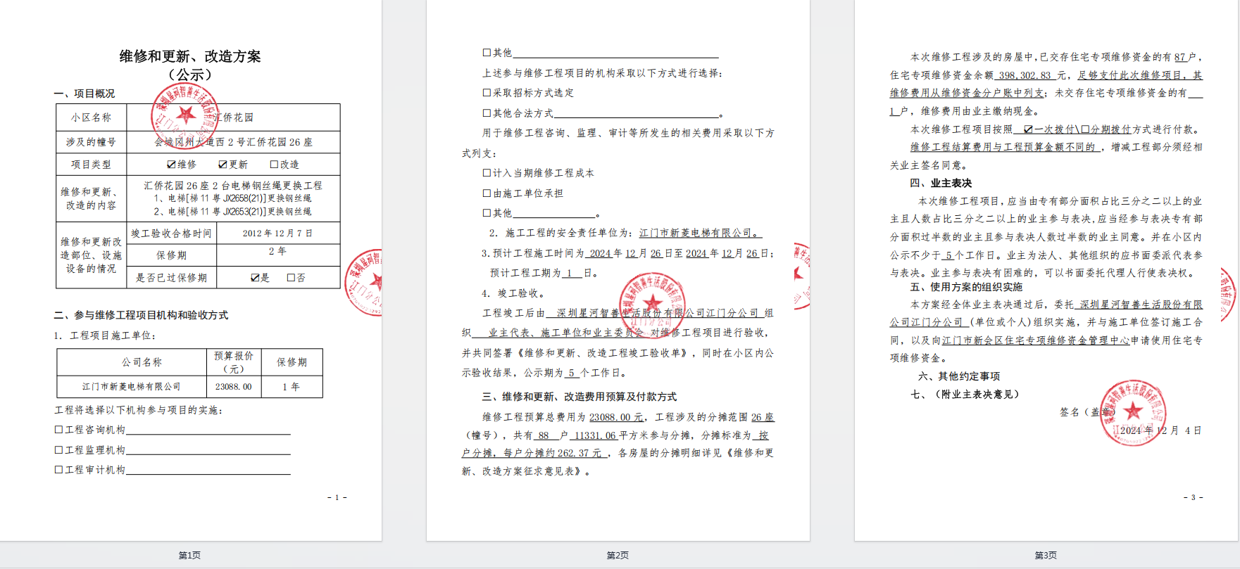 <td VALIGN="top" VALUES="" STYLE="border-width:0" BINDTYPE="0" ROWSPAN="19" COLSPAN="7" DATASOURCE="投票结果" ><font style="font-size:14pt;"><p style="white-space: normal; font-family: 宋体; line-height: 1.75em;">汇侨花园汇侨花园26座全体业主:</p><p style="white-space: normal; font-family: 宋体; line-height: 1.75em; text-indent: 2em;">本小区关于汇侨花园26座2台电梯钢丝绳更换工程使用维修资金的投票的投票已表决结束,询异时间从2024年12月10日开始,投票询异公示期间,业主可通过微信查询自己的表决情况或可凭身份证件申请查询自己的表决情况;如公示的业主表决情况与查询的本人表决意见不一致的,可以以书面形式向投票组织机构申诉,投票组织机构予以纠正并重新公示表决结果。异议提出人对投票组织机构的处理仍有异议的,可以向街道办事处(镇人民政府)反映处理,涉及住宅专项维修资金的,可向属地住宅专项维修资金管理中心反映处理。</p><p style="white-space: normal;"><br/></p><p style="white-space: normal; font-family: 宋体; line-height: 1.75em;"><strong>附件:</strong></p><p style="white-space: normal; font-family: 宋体; line-height: 1.75em;"><strong>一、投票范围</strong></p><p style="white-space: normal; font-family: 宋体; line-height: 1.75em; text-indent: 2em;">汇侨花园汇侨花园26座</p><p style="white-space: normal; font-family: 宋体; line-height: 1.75em; text-indent: 2em;">总人数(专有部分人数之和):87</p><p style="white-space: normal; font-family: 宋体; line-height: 1.75em; text-indent: 2em;"><span style="font-family: 宋体, SimSun;"><span style="font-family: 宋体; text-indent: 32px;"><span style="font-family: 宋体; text-indent: 32px;">总户数:88</span></span></span></p><p style="white-space: normal; font-family: 宋体; line-height: 1.75em; text-indent: 2em;">建筑物总面积(专有部分面积之和):11331.06㎡</p><p style="white-space: normal; font-family: 宋体; line-height: 1.75em;"><strong>二、询异公示起止时间</strong></p><p dir="ltr" style="white-space: normal; font-family: 宋体; line-height: 1.75em; text-indent: 2em;"><span style="text-indent: 36px;">2024年12月10日至2024年12月20日</span></p><p style="white-space: normal; font-family: 宋体; line-height: 1.75em;"><strong>三、投票详细描述</strong></p><p style="white-space: normal; font-family: 宋体; line-height: 1.75em; text-indent: 2em;"><p><span style="font-size: 14px;">小区26座电梯[梯11粤JX2658(21)]运行出现异响,经检查是钢丝绳爆股,影响电梯运行安全,需要更换;26座另一台电梯[梯11粤JX2653(21)]由于使用时间较长,钢丝绳生锈严重,存在安全隐患需要及时更换,该2台电梯已过保修期。现需申请使用维修资金现对26座2台电梯钢丝绳<span style="font-size: 14px; text-wrap: wrap;">进行</span>更换,工程预算为23088.00元,项目最终费用以施工合同签订金额为准。因已过保修期,维修费用由相关业主按分户分摊,每户约262.37元。<span style="font-size: 14px; text-wrap: wrap; background-color: rgb(255, 255, 255); font-family: 宋体;">详见公示附件。<span style="font-size: 14px; text-wrap: wrap; background-color: rgb(255, 255, 255); font-family: 微软雅黑, "Microsoft YaHei";">如业主手机不能正常通过微信投票,请联系物业公司进行线下纸质投票,物业电话:13555625107,管家电话:18026779942。</span></span></span></p></p><p style="white-space: normal; font-family: 宋体; line-height: 1.75em;"><strong>四、计票规则</strong></p><p style="white-space: normal; font-family: 宋体; line-height: 1.75em; text-indent: 2em;">表决事项:使用建筑物及其附属设施的维修资金<br /><p style='text-align: left; font-family: 宋体; font-size: 16px; line-height: 1.75em; text-indent: 2em;'>计票规则:弃权票不并入其它项 未表决票不并入其它项</p></p><p style="white-space: normal; font-family: 宋体; line-height: 1.75em;"><strong>五、通过规则</strong></p><p style="white-space: normal; font-family: 宋体; line-height: 1.75em;"><strong><strong style="white-space: normal;"><span style="font-family: 宋体, SimSun;"> 根据《中华人民共和国民法典》第二百七十八条规定:业主共同决定事项,应当由专有部分面积占比三分之二以上的业主且人数占比三分之二以上的业主参与表决。</span></strong></strong></p><p style="white-space: normal; font-family: 宋体; line-height: 1.75em; text-indent: 2em;">表决事项:使用建筑物及其附属设施的维修资金<br /><p style='text-align: left; font-family: 宋体; font-size: 16px; line-height: 1.75em; text-indent: 2em;'>通过规则:双2/3以上参与表决,参与表决双过半同意</p></p><p style="white-space: normal; font-family: 宋体; line-height: 1.75em;"><strong>六、投票结果</strong></p><p style="white-space: normal; font-family: 宋体; line-height: 1.75em; text-indent: 2em;"><div id='resultTable'><table style='table-layout: fixed; font-size:12px; margin-top:10px' width='100%' border='0' cellspacing='0' cellpadding='0'><tr><td height='28' colspan='10' align='center' style='border: 1px solid #666'><strong style='font-size: 14px;'> 使用建筑物及其附属设施的维修资金</strong></td> </tr><tr id='trfirst'><td height='28' colspan='4' style='border-left: 1px solid #666; border-bottom: 1px solid #666'><strong> 申报单位:</strong> 深圳星河智善生活股份有限公司江门分公司</td><td colspan='3' style='border-left: 1px solid #666; border-bottom: 1px solid #666'><strong> 联系方式:</strong> (0750) 3871336 3829717 </td><td colspan='3' style='border-left: 1px solid #666; border-bottom: 1px solid #666; border-right: 1px solid #666'><strong> 申报日期:</strong> 2024年12月4日 </td></tr><tr> <td height='28' colspan='5' style='border-left: 1px solid #666; border-bottom: 1px solid #6
