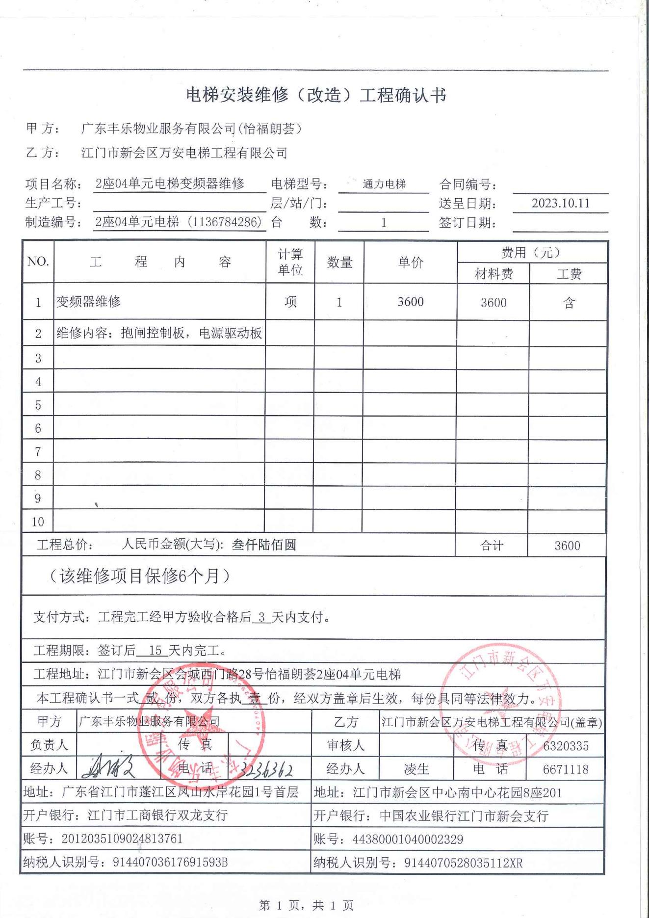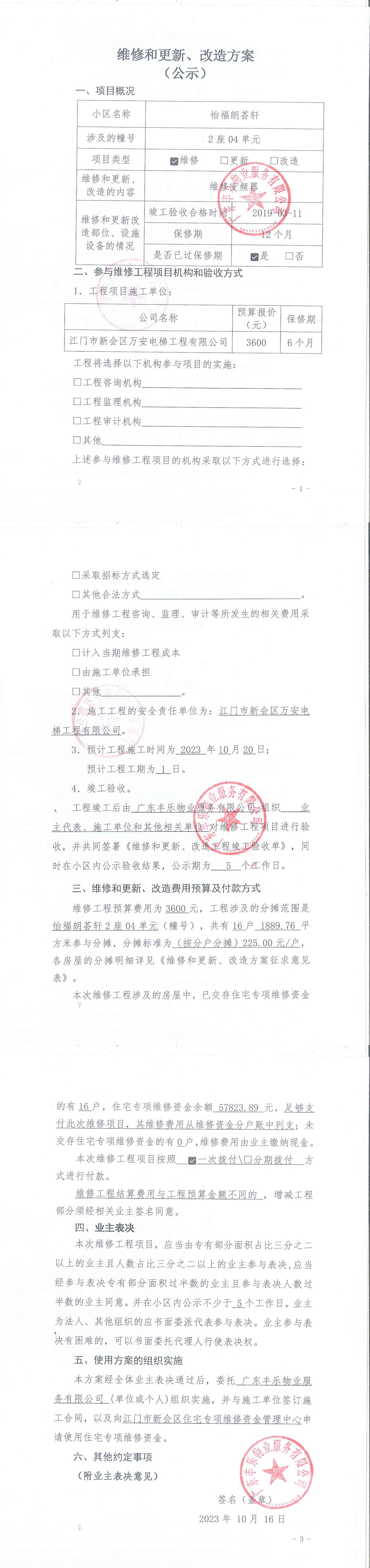 <td VALIGN="top" VALUES="" STYLE="border-width:0" BINDTYPE="0" ROWSPAN="19" COLSPAN="7" DATASOURCE="投票结果" ><font style="font-size:14pt;"><p style="white-space: normal; font-family: 宋体; line-height: 1.75em;">怡福朗荟轩2座全体业主:</p><p style="white-space: normal; font-family: 宋体; line-height: 1.75em; text-indent: 2em;">本小区关于怡福朗荟轩2座04单元电梯维修变频器使用维修资金的投票的投票已表决结束,询异时间从2023年10月21日开始,投票询异公示期间,业主可通过微信查询自己的表决情况或可凭身份证件申请查询自己的表决情况;如公示的业主表决情况与查询的本人表决意见不一致的,可以以书面形式向投票组织机构申诉,投票组织机构予以纠正并重新公示表决结果。异议提出人对投票组织机构的处理仍有异议的,可以向街道办事处(镇人民政府)反映处理,涉及住宅专项维修资金的,可向属地住宅专项维修资金管理中心反映处理。</p><p style="white-space: normal;"><br/></p><p style="white-space: normal; font-family: 宋体; line-height: 1.75em;"><strong>附件:</strong></p><p style="white-space: normal; font-family: 宋体; line-height: 1.75em;"><strong>一、投票范围</strong></p><p style="white-space: normal; font-family: 宋体; line-height: 1.75em; text-indent: 2em;">怡福朗荟轩2座</p><p style="white-space: normal; font-family: 宋体; line-height: 1.75em; text-indent: 2em;">总人数(专有部分人数之和):16</p><p style="white-space: normal; font-family: 宋体; line-height: 1.75em; text-indent: 2em;"><span style="font-family: 宋体, SimSun;">总户数:16</span></p><p style="white-space: normal; font-family: 宋体; line-height: 1.75em; text-indent: 2em;">建筑物总面积(专有部分面积之和):1889.76㎡</p><p style="white-space: normal; font-family: 宋体; line-height: 1.75em;"><strong>二、询异公示起止时间</strong></p><p dir="ltr" style="white-space: normal; font-family: 宋体; line-height: 1.75em; text-indent: 2em;"><span style="text-indent: 36px;">2023年10月21日至2023年10月27日</span></p><p style="white-space: normal; font-family: 宋体; line-height: 1.75em;"><strong>三、投票详细描述</strong></p><p style="white-space: normal; font-family: 宋体; line-height: 1.75em; text-indent: 2em;"><p><span style="font-family: "Helvetica Neue", Helvetica, Arial, sans-serif; font-size: 14px; background-color: rgb(255, 255, 255);">怡福朗荟轩2座04单元电梯日常运行时出现故障,电梯门不能正常关闭,经检查,是由于电梯变频器故障导致,已过保修期。现需申请使用维修资金对<span style="font-family: "Helvetica Neue", Helvetica, Arial, sans-serif; font-size: 14px; background-color: rgb(255, 255, 255);">2座04单元电梯</span>维修,工程维修预算金额为3600 元,项目最终费用以施工合同签订金额为准。维修费用的分摊标准为按分户分摊,共16户,每户为:225元,详见公示附件。物业公司联系电话:0750-6633316</span></p></p><p style="white-space: normal; font-family: 宋体; line-height: 1.75em;"><strong>四、计票规则</strong></p><p style="white-space: normal; font-family: 宋体; line-height: 1.75em; text-indent: 2em;">表决事项:使用建筑物及其附属设施的维修资金<br /><p style='text-align: left; font-family: 宋体; font-size: 16px; line-height: 1.75em; text-indent: 2em;'>计票规则:弃权票不并入其它项 未表决票不并入其它项</p></p><p style="white-space: normal; font-family: 宋体; line-height: 1.75em;"><strong>五、通过规则</strong></p><p style="white-space: normal; font-family: 宋体; line-height: 1.75em;"><strong><strong style="white-space: normal;"><span style="font-family: 宋体, SimSun;">&nbsp; 根据《中华人民共和国民法典》第二百七十八条规定:业主共同决定事项,应当由专有部分面积占比三分之二以上的业主且人数占比三分之二以上的业主参与表决。</span></strong></strong></p><p style="white-space: normal; font-family: 宋体; line-height: 1.75em; text-indent: 2em;">表决事项:使用建筑物及其附属设施的维修资金<br /><p style='text-align: left; font-family: 宋体; font-size: 16px; line-height: 1.75em; text-indent: 2em;'>通过规则:参与表决专有部分面积过半数的业主且参与表决人数过半数的业主同意</p></p><p style="white-space: normal; font-family: 宋体; line-height: 1.75em;"><strong>六、投票结果</strong></p><p style="white-space: normal; font-family: 宋体; line-height: 1.75em; text-indent: 2em;"><div id='resultTable'><table style='table-layout: fixed; font-size:12px; margin-top:10px' width='100%' border='0' cellspacing='0' cellpadding='0'><tr><td height='28' colspan='10' align='center' style='border: 1px solid #666'><strong style='font-size: 14px;'> 使用建筑物及其附属设施的维修资金</strong></td> </tr><tr id='trfirst'><td height='28' colspan='4' style='border-left: 1px solid #666; border-bottom: 1px solid #666'><strong> 申报单位:</strong> 广东丰乐物业服务有限公司</td><td colspan='3' style='border-left: 1px solid #666; border-bottom: 1px solid #666'><strong> 联系方式:</strong> 0750-3236369 </td><td colspan='3' style='border-left: 1px solid #666; border-bottom: 1px solid #666; border-right: 1px solid #666'><strong> 申报日期:</strong> 2023年10月16日 </td></tr><tr> <td height='28' colspan='5' style='border-left: 1px solid #666; border-bottom: 1px solid #666'><strong> 总人数(专有部分人数之和):</strong>16人 </td><td colspan='5' style='border-left: 1px solid #666; border-bottom: 1px solid #666; border-right: 1px solid #666'><strong> 建筑物总面积(专有部分面积之和):</strong>1889.76㎡ </td> </tr><tr><td height='28' colspan='10' bgcolor='#F3F3F3' style='border-left: 1px solid #666;border-bottom: 1px solid #666;border-right: 1px solid #666'><strong> 参与人数及面积