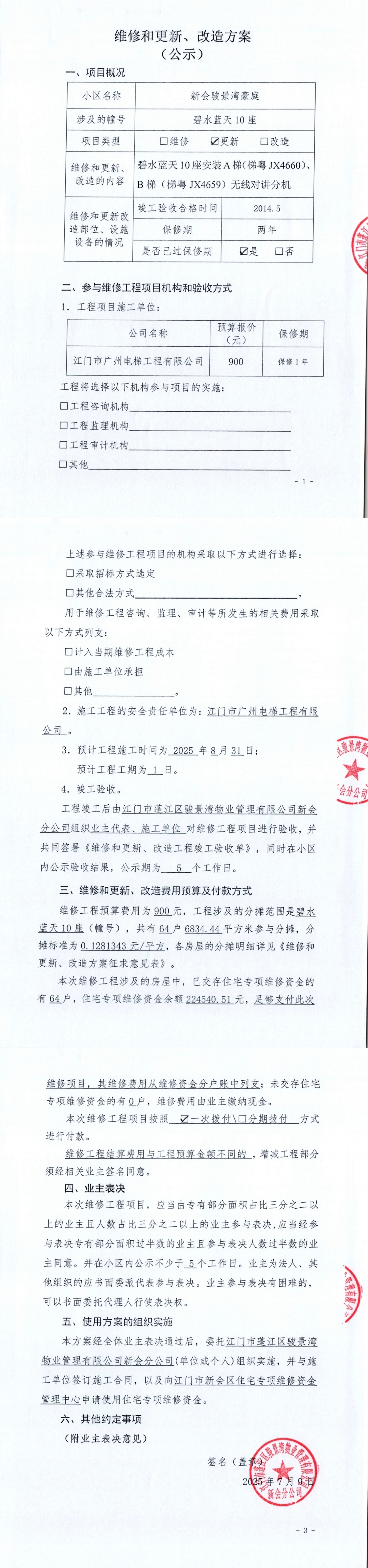 <td VALIGN="top" VALUES="" STYLE="border-width:0" BINDTYPE="0" ROWSPAN="17" COLSPAN="7" DATASOURCE="投票结果" ><font style=" font-family:方正小标宋简体;font-size:14pt;"><p style="line-height: 1.75em;"><span style="font-family: 宋体, SimSun;">各位尊敬的业主:</span><br/></p><p style="text-indent: 2em; line-height: 1.75em;"><span style="font-family: 宋体, SimSun;">根据法律法规的规定,本小区业主利用“江门市物业事项表决管理系统”已对本小区公共事务决策事项(<span style="font-family: 宋体; text-indent: 32px;">新会骏景湾豪庭碧水蓝天10座A梯(梯粤JX4660)、B梯(梯粤JX4659)安装无线对讲分机使用维修资金的投票</span>)进行了表决,在经过7日的询异公示期后,未收到业主有效的异议。现将投票结果公告,并就产生的法律效力说明如下:</span></p><p style="line-height: 1.75em; text-indent: 0em;"><strong style="text-indent: 2em;"><span style="font-family: 宋体, SimSun;">一、投票范围</span></strong></p><p style="text-indent: 2em; line-height: 1.75em;"><span style="font-family: 宋体, SimSun;">新会骏景湾豪庭碧水蓝天10座</span></p><p style="text-indent: 2em; line-height: 1.75em;"><span style="font-family: 宋体, SimSun;">总人数(专有部分人数之和):64</span></p><p style="text-indent: 2em; line-height: 1.75em;"><span style="font-family: 宋体, SimSun;"><span style="font-family: 宋体, SimSun; text-indent: 32px;"><span style="font-family: 宋体; text-indent: 32px;"><span style="font-family: 宋体; text-indent: 32px;">总户数:64</span></span></span></span></p><p style="text-indent: 2em; line-height: 1.75em;"><span style="font-family: 宋体, SimSun;">建筑物总面积(专有部分面积之和):6834.44㎡</span></p><p style="line-height: 1.75em;"><strong><span style="font-family: 宋体, SimSun;">二、投票结果公告时间</span></strong></p><p style="text-indent: 2em; line-height: 1.75em;"><span style="font-family: 宋体, SimSun;"><span style="font-family: 宋体, SimSun; text-indent: 32px;">从2025年09月27日开始</span></span></p><p style="line-height: 1.75em;"><strong><span style="font-family: 宋体, SimSun;">三、计票规则</span></strong></p><p style="text-indent: 2em; line-height: 1.75em;"><span style="font-family: 宋体, SimSun;">表决事项:使用建筑物及其附属设施的维修资金<br /><p style='font-family: 宋体, SimSun;line-height: 1.75em; text-indent: 2em;'>计票规则:弃权票不并入其它项&nbsp;&nbsp;&nbsp;&nbsp;未表决票不并入其它项</p></span></p><p style="line-height: 1.75em;"><strong><span style="font-family: 宋体, SimSun;">四、通过规则</span></strong></p><p style="line-height: 1.75em;"><strong><span style="font-family: 宋体, SimSun;">&nbsp; 根据《中华人民共和国民法典》第二百七十八条规定:业主共同决定事项,应当由专有部分面积占比三分之二以上的业主且人数占比三分之二以上的业主参与表决。</span></strong></p><p style="text-indent: 2em; line-height: 1.75em;"><span style="font-family: 宋体, SimSun;"><span style="font-family: 宋体, SimSun; text-indent: 32px;">表决事项:使用建筑物及其附属设施的维修资金<br /><p style='font-family: 宋体, SimSun;line-height: 1.75em; text-indent: 2em;'>通过规则:双2/3以上参与表决,参与表决双过半同意</p></span></span></p><p style="line-height: 1.75em;"><strong><span style="font-family: 宋体, SimSun;">五、投票结果</span></strong></p><p style="line-height: 1.75em; text-indent: 2em;"><span style="font-family: 宋体, SimSun; text-indent: 2em;"><div id='resultTable'><table style='table-layout: fixed; font-size:12px; margin-top:10px' width='100%' border='0' cellspacing='0' cellpadding='0'><tr><td height='28' colspan='10' align='center' style='border: 1px solid #666'><strong style='font-size: 14px;'> 使用建筑物及其附属设施的维修资金</strong></td> </tr><tr id='trfirst'><td height='28' colspan='4' style='border-left: 1px solid #666; border-bottom: 1px solid #666'><strong>&nbsp;申报单位:</strong> 江门市蓬江区骏景湾物业管理有限公司新会分公司</td><td colspan='3' style='border-left: 1px solid #666; border-bottom: 1px solid #666'><strong>&nbsp;联系方式:</strong> </td><td colspan='3' style='border-left: 1px solid #666; border-bottom: 1px solid #666; border-right: 1px solid #666'><strong>&nbsp;申报日期:</strong> 2025年7月15日 </td></tr><tr> <td height='28' colspan='5' style='border-left: 1px solid #666; border-bottom: 1px solid #666'><strong>&nbsp;列支总人数(专有部分人数之和):</strong>64人 </td><td colspan='5' style='border-left: 1px solid #666; border-bottom: 1px solid #666; border-right: 1px solid #666'><strong>&nbsp;列支建筑物总面积(专有部分面积之和):</strong>6834.44㎡ </td> </tr><tr><td height='28' colspan='10' bgcolor='#F3F3F3' style='border-left: 1px solid #666;border-bottom: 1px solid #666;border-right: 1px solid #666'><strong>&nbsp;参与表决人数及面积统计</strong></td></tr><tr><td height='28' colspan='5' style='border-left: 1px solid #666; border-bottom: 1px solid #666'><strong>&nbsp;参与表决人数:</strong>46人</td><td colspan='5' style='border-left: 1px solid #666; border-bottom: 1px solid #666; border-right: 1px solid #666'><strong>&nbsp;参与表决人数占总人数比例:</strong>71.88%</td></tr><tr><td height='28' colspan='5' style='border-left: 1px solid #666; border-bottom: 1px solid #666'><strong>&nbsp;参与表决面积:</strong>4881.04㎡</td><td colspan='5' style='border-left: 1px solid #666; border-bottom: 1px solid #666; border-right: 1px solid #666'><strong>&nbsp;参与表决面积占总面积比例:</strong>71.42%</td></tr><tr><td height='28' colspan='10' bgcolor='#F3F3F3' style='border-left: 1px solid #666; border-bottom: 1px solid #666;border-right: 1px solid #666'> <strong>&nbsp;参与表决同意人数及面积统计</strong></td> </tr><