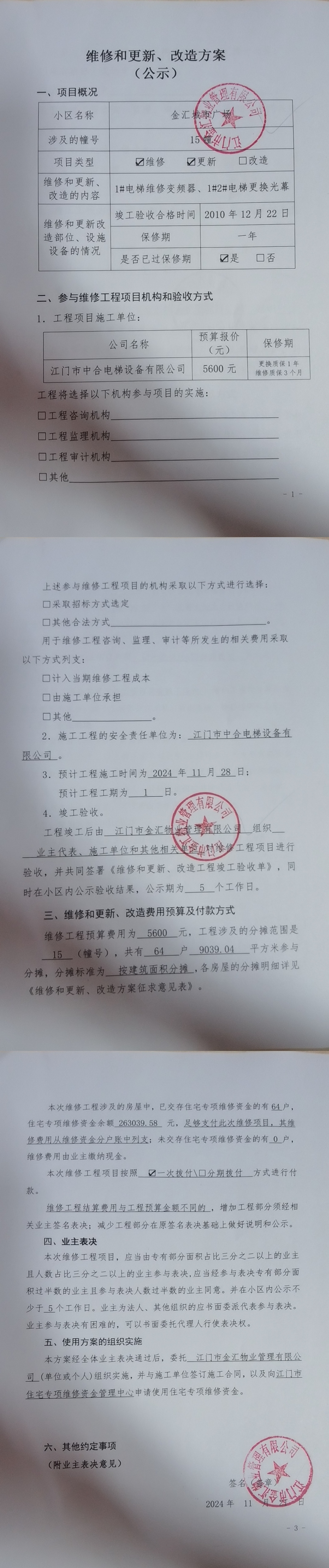 <td VALIGN="top" VALUES="" STYLE="border-width:0" BINDTYPE="0" ROWSPAN="19" COLSPAN="7" DATASOURCE="投票结果" ><font style="font-size:14pt;"><p style="white-space: normal; font-family: 宋体; line-height: 1.75em;">金汇城市广场蓬江区金汇城市广场15幢全体业主:</p><p style="white-space: normal; font-family: 宋体; line-height: 1.75em; text-indent: 2em;">本小区关于金汇城市广场关于15幢1#2#电梯更换光幕、1#电梯维修变频器工程使用维修资金的投票的投票已表决结束,询异时间从2025年02月11日开始,投票询异公示期间,业主可通过微信查询自己的表决情况或可凭身份证件申请查询自己的表决情况;如公示的业主表决情况与查询的本人表决意见不一致的,可以以书面形式向投票组织机构申诉,投票组织机构予以纠正并重新公示表决结果。异议提出人对投票组织机构的处理仍有异议的,可以向街道办事处(镇人民政府)反映处理,涉及住宅专项维修资金的,可向属地住宅专项维修资金管理中心反映处理。</p><p style="white-space: normal;"><br/></p><p style="white-space: normal; font-family: 宋体; line-height: 1.75em;"><strong>附件:</strong></p><p style="white-space: normal; font-family: 宋体; line-height: 1.75em;"><strong>一、投票范围</strong></p><p style="white-space: normal; font-family: 宋体; line-height: 1.75em; text-indent: 2em;">金汇城市广场蓬江区金汇城市广场15幢</p><p style="white-space: normal; font-family: 宋体; line-height: 1.75em; text-indent: 2em;">总人数(专有部分人数之和):64</p><p style="white-space: normal; font-family: 宋体; line-height: 1.75em; text-indent: 2em;"><span style="font-family: 宋体, SimSun;"><span style="font-family: 宋体; text-indent: 32px;"><span style="font-family: 宋体; text-indent: 32px;">总户数:64</span></span></span></p><p style="white-space: normal; font-family: 宋体; line-height: 1.75em; text-indent: 2em;">建筑物总面积(专有部分面积之和):9039.04㎡</p><p style="white-space: normal; font-family: 宋体; line-height: 1.75em;"><strong>二、询异公示起止时间</strong></p><p dir="ltr" style="white-space: normal; font-family: 宋体; line-height: 1.75em; text-indent: 2em;"><span style="text-indent: 36px;">2025年02月11日至2025年02月21日</span></p><p style="white-space: normal; font-family: 宋体; line-height: 1.75em;"><strong>三、投票详细描述</strong></p><p style="white-space: normal; font-family: 宋体; line-height: 1.75em; text-indent: 2em;"><p style="font-family: "Helvetica Neue", Helvetica, Arial, sans-serif; font-size: 14px; white-space: normal; background-color: rgb(255, 255, 255);">金汇城市广场小区15幢的1#2#电梯日常运行时出现异响,不能呼梯,经检查,是由于15幢1#2#电梯光幕、1#电梯变频器出现老化而不能正常运行。</p><p style="font-family: "Helvetica Neue", Helvetica, Arial, sans-serif; font-size: 14px; white-space: normal; background-color: rgb(255, 255, 255);"> 现对15幢的1#2#电梯进行更新改造,工程维修预算金额为5600元,项目最终费用以施工合同签订金额为准。因已过保修期,维修费用由相关业主按建筑面积分摊,每平方约0.61元,详见公示附件。如业主手机不能正常通过微信投票,请联系物业公司进行线下纸质投票,物业电话:3929003.</p><p><br/></p></p><p style="white-space: normal; font-family: 宋体; line-height: 1.75em;"><strong>四、计票规则</strong></p><p style="white-space: normal; font-family: 宋体; line-height: 1.75em; text-indent: 2em;">表决事项:使用建筑物及其附属设施的维修资金<br /><p style='text-align: left; font-family: 宋体; font-size: 16px; line-height: 1.75em; text-indent: 2em;'>计票规则:弃权票不并入其它项 未表决票不并入其它项</p></p><p style="white-space: normal; font-family: 宋体; line-height: 1.75em;"><strong>五、通过规则</strong></p><p style="white-space: normal; font-family: 宋体; line-height: 1.75em;"><strong><strong style="white-space: normal;"><span style="font-family: 宋体, SimSun;"> 根据《中华人民共和国民法典》第二百七十八条规定:业主共同决定事项,应当由专有部分面积占比三分之二以上的业主且人数占比三分之二以上的业主参与表决。</span></strong></strong></p><p style="white-space: normal; font-family: 宋体; line-height: 1.75em; text-indent: 2em;">表决事项:使用建筑物及其附属设施的维修资金<br /><p style='text-align: left; font-family: 宋体; font-size: 16px; line-height: 1.75em; text-indent: 2em;'>通过规则:双2/3以上参与表决,参与表决双过半同意</p></p><p style="white-space: normal; font-family: 宋体; line-height: 1.75em;"><strong>六、投票结果</strong></p><p style="white-space: normal; font-family: 宋体; line-height: 1.75em; text-indent: 2em;"><div id='resultTable'><table style='table-layout: fixed; font-size:12px; margin-top:10px' width='100%' border='0' cellspacing='0' cellpadding='0'><tr><td height='28' colspan='10' align='center' style='border: 1px solid #666'><strong style='font-size: 14px;'> 使用建筑物及其附属设施的维修资金</strong></td> </tr><tr id='trfirst'><td height='28' colspan='4' style='border-left: 1px solid #666; border-bottom: 1px solid #666'><strong> 申报单位:</strong> 江门市金汇物业管理有限公司</td><td colspan='3' style='border-left: 1px solid #666; border-bottom: 1px solid #666'><strong> 联系方式:</strong> 3929003 </td><td colspan='3' style='border-left: 1px solid #666; border-bottom: 1px solid #666; border-right: 1px solid #666'><strong> 申报日期:</strong> 2024年11月26日 </td></tr><tr> <td height='28' colspan='5' style='border-left: 1px solid #666; border-bottom: 1px solid #666'><strong> 总人数(专有部分人数之和):</strong>64人 </td><td colspan='5' style='border-left: 1px solid #666; border-bottom: 1p