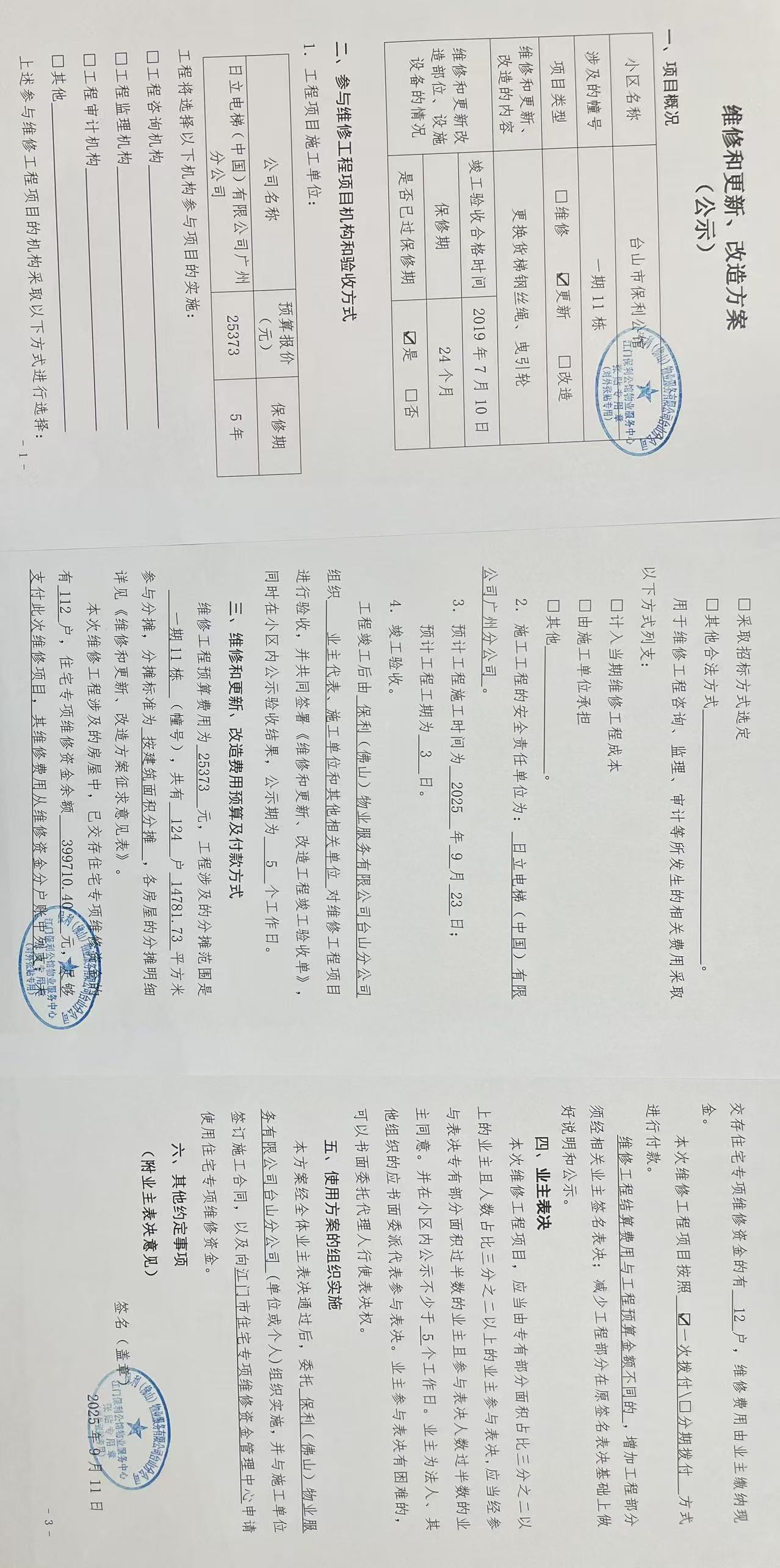 <td VALIGN="top" VALUES="" STYLE="border-width:0" BINDTYPE="0" ROWSPAN="19" COLSPAN="7" DATASOURCE="投票结果" ><font style="font-size:14pt;"><p style="white-space: normal; font-family: 宋体; line-height: 1.75em;">台山市保利公馆保利公馆11号楼全体业主:</p><p style="white-space: normal; font-family: 宋体; line-height: 1.75em; text-indent: 2em;">本小区关于保利公馆11栋货梯更换曳引轮、曳引钢丝绳的使用维修资金投票的投票已表决结束,询异时间从2025年09月22日开始,投票询异公示期间,业主可通过微信查询自己的表决情况或可凭身份证件申请查询自己的表决情况;如公示的业主表决情况与查询的本人表决意见不一致的,可以以书面形式向投票组织机构申诉,投票组织机构予以纠正并重新公示表决结果。异议提出人对投票组织机构的处理仍有异议的,可以向街道办事处(镇人民政府)反映处理,涉及住宅专项维修资金的,可向属地住宅专项维修资金管理中心反映处理。</p><p style="white-space: normal;"><br/></p><p style="white-space: normal; font-family: 宋体; line-height: 1.75em;"><strong>附件:</strong></p><p style="white-space: normal; font-family: 宋体; line-height: 1.75em;"><strong>一、投票范围</strong></p><p style="white-space: normal; font-family: 宋体; line-height: 1.75em; text-indent: 2em;">台山市保利公馆保利公馆11号楼</p><p style="white-space: normal; font-family: 宋体; line-height: 1.75em; text-indent: 2em;">总人数(专有部分人数之和):124</p><p style="white-space: normal; font-family: 宋体; line-height: 1.75em; text-indent: 2em;"><span style="font-family: 宋体, SimSun;"><span style="font-family: 宋体; text-indent: 32px;"><span style="font-family: 宋体; text-indent: 32px;">总户数:124</span></span></span></p><p style="white-space: normal; font-family: 宋体; line-height: 1.75em; text-indent: 2em;">建筑物总面积(专有部分面积之和):14781.73㎡</p><p style="white-space: normal; font-family: 宋体; line-height: 1.75em;"><strong>二、询异公示起止时间</strong></p><p dir="ltr" style="white-space: normal; font-family: 宋体; line-height: 1.75em; text-indent: 2em;"><span style="text-indent: 36px;">2025年09月22日至2025年10月02日</span></p><p style="white-space: normal; font-family: 宋体; line-height: 1.75em;"><strong>三、投票详细描述</strong></p><p style="white-space: normal; font-family: 宋体; line-height: 1.75em; text-indent: 2em;"><p><span style="font-size: 14px; text-wrap-mode: wrap; background-color: rgb(255, 255, 255); font-family: 宋体;">保利公馆</span><span style="font-size: 14px; text-wrap-mode: wrap; font-family: 宋体; background: rgb(255, 255, 0);"><span style="font-family: Calibri;">11</span>幢</span><span style="font-size: 14px; text-wrap-mode: wrap; background-color: rgb(255, 255, 255); font-family: 宋体;">的</span><span style="font-size: 14px; text-wrap-mode: wrap; font-family: 宋体; background: rgb(255, 255, 0);">货梯日常运行时出现异响</span><span style="font-size: 14px; text-wrap-mode: wrap; background-color: rgb(255, 255, 255); font-family: 宋体;">,经检查,是由于</span><span style="font-size: 14px; text-wrap-mode: wrap; font-family: 宋体; background: rgb(255, 255, 0);">货梯<span style="font-family: 宋体; font-size: 14px; text-wrap-mode: wrap; background-color: rgb(255, 255, 0);">因使用时间较长,</span>曳引钢丝绳断股脱离绳槽不能运行导致</span><span style="font-size: 14px; text-wrap-mode: wrap; background-color: rgb(255, 255, 255); font-family: 宋体;">。<br/></span><span style="font-family: "Helvetica Neue", Helvetica, Arial, sans-serif; font-size: 14px; text-wrap-mode: wrap; background-color: rgb(255, 255, 255);"></span><span style="font-size: 14px; text-wrap-mode: wrap; background-color: rgb(255, 255, 255); font-family: 宋体;"> 现对</span><span style="font-size: 14px; text-wrap-mode: wrap; font-family: 宋体; background: rgb(255, 255, 0);"><span style="font-family: Calibri;">11</span>幢货梯进行维修</span><span style="font-size: 14px; text-wrap-mode: wrap; background-color: rgb(255, 255, 255); font-family: 宋体;">,工程维修预算金额为</span><span style="font-size: 14px; text-wrap-mode: wrap; font-family: 宋体; background: rgb(255, 255, 0);"><span style="font-family: Calibri;">25373</span>元</span><span style="font-size: 14px; text-wrap-mode: wrap; background-color: rgb(255, 255, 255); font-family: 宋体;">,项目最终费用以施工合同签订金额为准。因已过保修期,维修费用由相关业主</span><span style="font-size: 14px; text-wrap-mode: wrap; font-family: 宋体; background: rgb(255, 255, 0);">按建筑面积</span><span style="font-size: 14px; text-wrap-mode: wrap; background-color: rgb(255, 255, 255); font-family: 宋体;">分摊,</span><span style="font-size: 14px; text-wrap-mode: wrap; font-family: 宋体; background: rgb(255, 255, 0);">每平方约<span style="font-family: Calibri;">1.71</span>元</span><span style="font-size: 14px; text-wrap-mode: wrap; background-color: rgb(255, 255, 255); font-family: 宋体;">,详见公示附件。如业主手机不能正常通过微信投票,请联系物业公司进行线下纸质投票,物业电话</span><span style="font-size: 14px; text-wrap-mode: wrap; font-family: 宋体; background: rgb(255, 255, 0);">:<span style="font-family: Calibri;">0750-5555725</span></span><span style="font-size: 14px; text-wrap-mode: wrap; background-color: rgb(255, 255, 255); font-family: 宋体;">。</span></p></p><p style="white-space: normal; font-family: 宋体; line-height: 1.75em;"><strong>四、计票规则</strong></p><p style="white-space: normal; font-family: 宋体; line-height: 1.75em; text-indent: 2em;">表决事项:使用建筑物及其附属设施的维修资金<br /><p style='text-align: left; font-family: 宋体; font-size: 16px; line-height: 1.75em; text-indent: 2