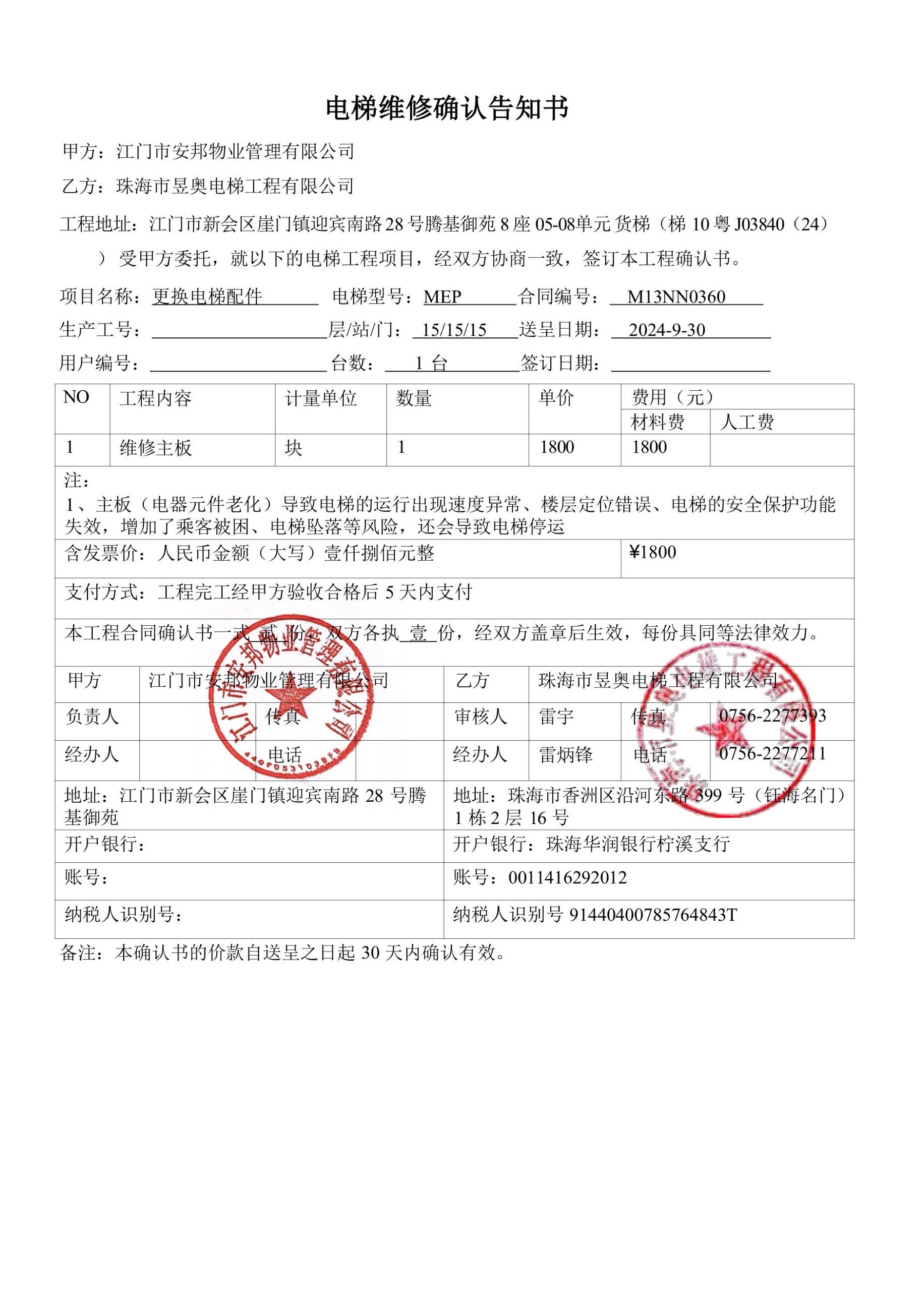 <td VALIGN="top" VALUES="" STYLE="border-width:0" BINDTYPE="0" ROWSPAN="19" COLSPAN="7" DATASOURCE="投票结果" ><font style="font-size:14pt;"><p style="white-space: normal; font-family: 宋体; line-height: 1.75em;">腾基御苑腾基御苑8座全体业主:</p><p style="white-space: normal; font-family: 宋体; line-height: 1.75em; text-indent: 2em;">本小区关于腾基御苑8座05-08单元货梯维修主板使用维修资金的投票的投票已表决结束,询异时间从2024年12月13日开始,投票询异公示期间,业主可通过微信查询自己的表决情况或可凭身份证件申请查询自己的表决情况;如公示的业主表决情况与查询的本人表决意见不一致的,可以以书面形式向投票组织机构申诉,投票组织机构予以纠正并重新公示表决结果。异议提出人对投票组织机构的处理仍有异议的,可以向街道办事处(镇人民政府)反映处理,涉及住宅专项维修资金的,可向属地住宅专项维修资金管理中心反映处理。</p><p style="white-space: normal;"><br/></p><p style="white-space: normal; font-family: 宋体; line-height: 1.75em;"><strong>附件:</strong></p><p style="white-space: normal; font-family: 宋体; line-height: 1.75em;"><strong>一、投票范围</strong></p><p style="white-space: normal; font-family: 宋体; line-height: 1.75em; text-indent: 2em;">腾基御苑腾基御苑8座</p><p style="white-space: normal; font-family: 宋体; line-height: 1.75em; text-indent: 2em;">总人数(专有部分人数之和):56</p><p style="white-space: normal; font-family: 宋体; line-height: 1.75em; text-indent: 2em;"><span style="font-family: 宋体, SimSun;"><span style="font-family: 宋体; text-indent: 32px;"><span style="font-family: 宋体; text-indent: 32px;">总户数:56</span></span></span></p><p style="white-space: normal; font-family: 宋体; line-height: 1.75em; text-indent: 2em;">建筑物总面积(专有部分面积之和):4536.00㎡</p><p style="white-space: normal; font-family: 宋体; line-height: 1.75em;"><strong>二、询异公示起止时间</strong></p><p dir="ltr" style="white-space: normal; font-family: 宋体; line-height: 1.75em; text-indent: 2em;"><span style="text-indent: 36px;">2024年12月13日至2024年12月23日</span></p><p style="white-space: normal; font-family: 宋体; line-height: 1.75em;"><strong>三、投票详细描述</strong></p><p style="white-space: normal; font-family: 宋体; line-height: 1.75em; text-indent: 2em;"><p>本小区8座05-08单元的货梯出现故障,无法运行,经检查,是由于电梯主板电器元件老化的问题,已过保修期。现需申请使用维修资金维修8座05-08单元货梯的主板,工程维修预算金额为1800.00元,项目最终费用以施工合同签订金额为准。维修费用的分摊标准为按分户分摊32.15元/户,详见公示附件。如业主手机不能正常通过微信投票,请联系物业公司进行线下纸质投票,物业电话:13923073998。 </p></p><p style="white-space: normal; font-family: 宋体; line-height: 1.75em;"><strong>四、计票规则</strong></p><p style="white-space: normal; font-family: 宋体; line-height: 1.75em; text-indent: 2em;">表决事项:使用建筑物及其附属设施的维修资金<br /><p style='text-align: left; font-family: 宋体; font-size: 16px; line-height: 1.75em; text-indent: 2em;'>计票规则:弃权票不并入其它项 未表决票不并入其它项</p></p><p style="white-space: normal; font-family: 宋体; line-height: 1.75em;"><strong>五、通过规则</strong></p><p style="white-space: normal; font-family: 宋体; line-height: 1.75em;"><strong><strong style="white-space: normal;"><span style="font-family: 宋体, SimSun;"> 根据《中华人民共和国民法典》第二百七十八条规定:业主共同决定事项,应当由专有部分面积占比三分之二以上的业主且人数占比三分之二以上的业主参与表决。</span></strong></strong></p><p style="white-space: normal; font-family: 宋体; line-height: 1.75em; text-indent: 2em;">表决事项:使用建筑物及其附属设施的维修资金<br /><p style='text-align: left; font-family: 宋体; font-size: 16px; line-height: 1.75em; text-indent: 2em;'>通过规则:双2/3以上参与表决,参与表决双过半同意</p></p><p style="white-space: normal; font-family: 宋体; line-height: 1.75em;"><strong>六、投票结果</strong></p><p style="white-space: normal; font-family: 宋体; line-height: 1.75em; text-indent: 2em;"><div id='resultTable'><table style='table-layout: fixed; font-size:12px; margin-top:10px' width='100%' border='0' cellspacing='0' cellpadding='0'><tr><td height='28' colspan='10' align='center' style='border: 1px solid #666'><strong style='font-size: 14px;'> 使用建筑物及其附属设施的维修资金</strong></td> </tr><tr id='trfirst'><td height='28' colspan='4' style='border-left: 1px solid #666; border-bottom: 1px solid #666'><strong> 申报单位:</strong> 江门市安邦物业管理有限公司</td><td colspan='3' style='border-left: 1px solid #666; border-bottom: 1px solid #666'><strong> 联系方式:</strong> 13923073998 </td><td colspan='3' style='border-left: 1px solid #666; border-bottom: 1px solid #666; border-right: 1px solid #666'><strong> 申报日期:</strong> 2024年10月14日 </td></tr><tr> <td height='28' colspan='5' style='border-left: 1px solid #666; border-bottom: 1px solid #666'><strong> 总人数(专有部分人数之和):</strong>56人 </td><td colspan='5' style='border-left: 1px solid #666; border-bottom: 1px solid #666; border-right: 1px solid #666'><strong> 建筑物总面积(专有部分面积之和):</strong>4536.00㎡ </td> </tr><tr><td height='28' colspan='10' bgcolor='#F3F3F3' style='border-left: 1px solid #666;border-bottom: 1px solid #666;border-right: 1px solid #666'><strong> 参与人数及面积统计</strong></td></tr><tr><td height='28' colspan='5' style='border-left: 1px solid #666; border-bottom: 1px solid #666