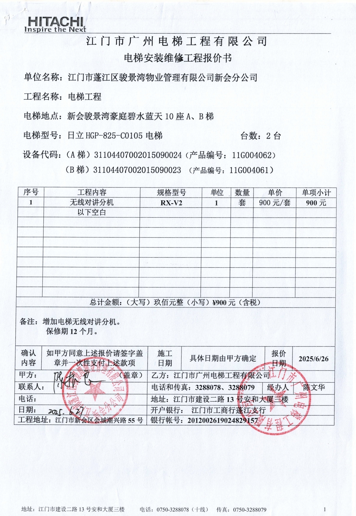 <td VALIGN="top" VALUES="" STYLE="border-width:0" BINDTYPE="0" ROWSPAN="19" COLSPAN="7" DATASOURCE="投票结果" ><font style="font-size:14pt;"><p style="white-space: normal; font-family: 宋体; line-height: 1.75em;">新会骏景湾豪庭碧水蓝天10座全体业主:</p><p style="white-space: normal; font-family: 宋体; line-height: 1.75em; text-indent: 2em;">本小区关于新会骏景湾豪庭碧水蓝天10座A梯(梯粤JX4660)、B梯(梯粤JX4659)安装无线对讲分机使用维修资金的投票的投票已表决结束,询异时间从2025年09月16日开始,投票询异公示期间,业主可通过微信查询自己的表决情况或可凭身份证件申请查询自己的表决情况;如公示的业主表决情况与查询的本人表决意见不一致的,可以以书面形式向投票组织机构申诉,投票组织机构予以纠正并重新公示表决结果。异议提出人对投票组织机构的处理仍有异议的,可以向街道办事处(镇人民政府)反映处理,涉及住宅专项维修资金的,可向属地住宅专项维修资金管理中心反映处理。</p><p style="white-space: normal;"><br/></p><p style="white-space: normal; font-family: 宋体; line-height: 1.75em;"><strong>附件:</strong></p><p style="white-space: normal; font-family: 宋体; line-height: 1.75em;"><strong>一、投票范围</strong></p><p style="white-space: normal; font-family: 宋体; line-height: 1.75em; text-indent: 2em;">新会骏景湾豪庭碧水蓝天10座</p><p style="white-space: normal; font-family: 宋体; line-height: 1.75em; text-indent: 2em;">总人数(专有部分人数之和):64</p><p style="white-space: normal; font-family: 宋体; line-height: 1.75em; text-indent: 2em;"><span style="font-family: 宋体, SimSun;"><span style="font-family: 宋体; text-indent: 32px;"><span style="font-family: 宋体; text-indent: 32px;">总户数:64</span></span></span></p><p style="white-space: normal; font-family: 宋体; line-height: 1.75em; text-indent: 2em;">建筑物总面积(专有部分面积之和):6834.44㎡</p><p style="white-space: normal; font-family: 宋体; line-height: 1.75em;"><strong>二、询异公示起止时间</strong></p><p dir="ltr" style="white-space: normal; font-family: 宋体; line-height: 1.75em; text-indent: 2em;"><span style="text-indent: 36px;">2025年09月16日至2025年09月26日</span></p><p style="white-space: normal; font-family: 宋体; line-height: 1.75em;"><strong>三、投票详细描述</strong></p><p style="white-space: normal; font-family: 宋体; line-height: 1.75em; text-indent: 2em;"><p>新会骏景湾豪庭碧水蓝天10座A梯(梯粤JX4660)、B梯(梯粤JX4659)检查时五方通话出现故障,为确保电梯五方通话能正常对讲,需要安装AB梯无线对讲分机。</p><p>现对碧水蓝天10座A梯(梯粤JX4660)、B梯(梯粤JX4659)进行维修,工程维修预算金额为900元,项目最终费用以施工合同签订金额为准。因已过保修期,维修费用由相关业主按建筑面积分摊,每平方约0.1281343元,详见公示附件。如业主手机不能正常通过微信投票,请联系物业公司进行线下纸质投票,物业电话:0750-6179992。 </p></p><p style="white-space: normal; font-family: 宋体; line-height: 1.75em;"><strong>四、计票规则</strong></p><p style="white-space: normal; font-family: 宋体; line-height: 1.75em; text-indent: 2em;">表决事项:使用建筑物及其附属设施的维修资金<br /><p style='text-align: left; font-family: 宋体; font-size: 16px; line-height: 1.75em; text-indent: 2em;'>计票规则:弃权票不并入其它项 未表决票不并入其它项</p></p><p style="white-space: normal; font-family: 宋体; line-height: 1.75em;"><strong>五、通过规则</strong></p><p style="white-space: normal; font-family: 宋体; line-height: 1.75em;"><strong><strong style="white-space: normal;"><span style="font-family: 宋体, SimSun;"> 根据《中华人民共和国民法典》第二百七十八条规定:业主共同决定事项,应当由专有部分面积占比三分之二以上的业主且人数占比三分之二以上的业主参与表决。</span></strong></strong></p><p style="white-space: normal; font-family: 宋体; line-height: 1.75em; text-indent: 2em;">表决事项:使用建筑物及其附属设施的维修资金<br /><p style='text-align: left; font-family: 宋体; font-size: 16px; line-height: 1.75em; text-indent: 2em;'>通过规则:双2/3以上参与表决,参与表决双过半同意</p></p><p style="white-space: normal; font-family: 宋体; line-height: 1.75em;"><strong>六、投票结果</strong></p><p style="white-space: normal; font-family: 宋体; line-height: 1.75em; text-indent: 2em;"><div id='resultTable'><table style='table-layout: fixed; font-size:12px; margin-top:10px' width='100%' border='0' cellspacing='0' cellpadding='0'><tr><td height='28' colspan='10' align='center' style='border: 1px solid #666'><strong style='font-size: 14px;'> 使用建筑物及其附属设施的维修资金</strong></td> </tr><tr id='trfirst'><td height='28' colspan='4' style='border-left: 1px solid #666; border-bottom: 1px solid #666'><strong> 申报单位:</strong> 江门市蓬江区骏景湾物业管理有限公司新会分公司</td><td colspan='3' style='border-left: 1px solid #666; border-bottom: 1px solid #666'><strong> 联系方式:</strong> </td><td colspan='3' style='border-left: 1px solid #666; border-bottom: 1px solid #666; border-right: 1px solid #666'><strong> 申报日期:</strong> 2025年7月15日 </td></tr><tr> <td height='28' colspan='5' style='border-left: 1px solid #666; border-bottom: 1px solid #666'><strong> 总人数(专有部分人数之和):</strong>64人 </td><td colspan='5' style='border-left: 1px solid #666; border-bottom: 1px solid #666; border-right: 1px solid #666'><strong> 建筑物总面积(专有部分面积之和):</strong>6834.44㎡ </td> </tr><tr><td height='28' colspan='10' bgcolor='#F3F3F3' style='border-left: 1px solid #666;border-bottom: 1px 