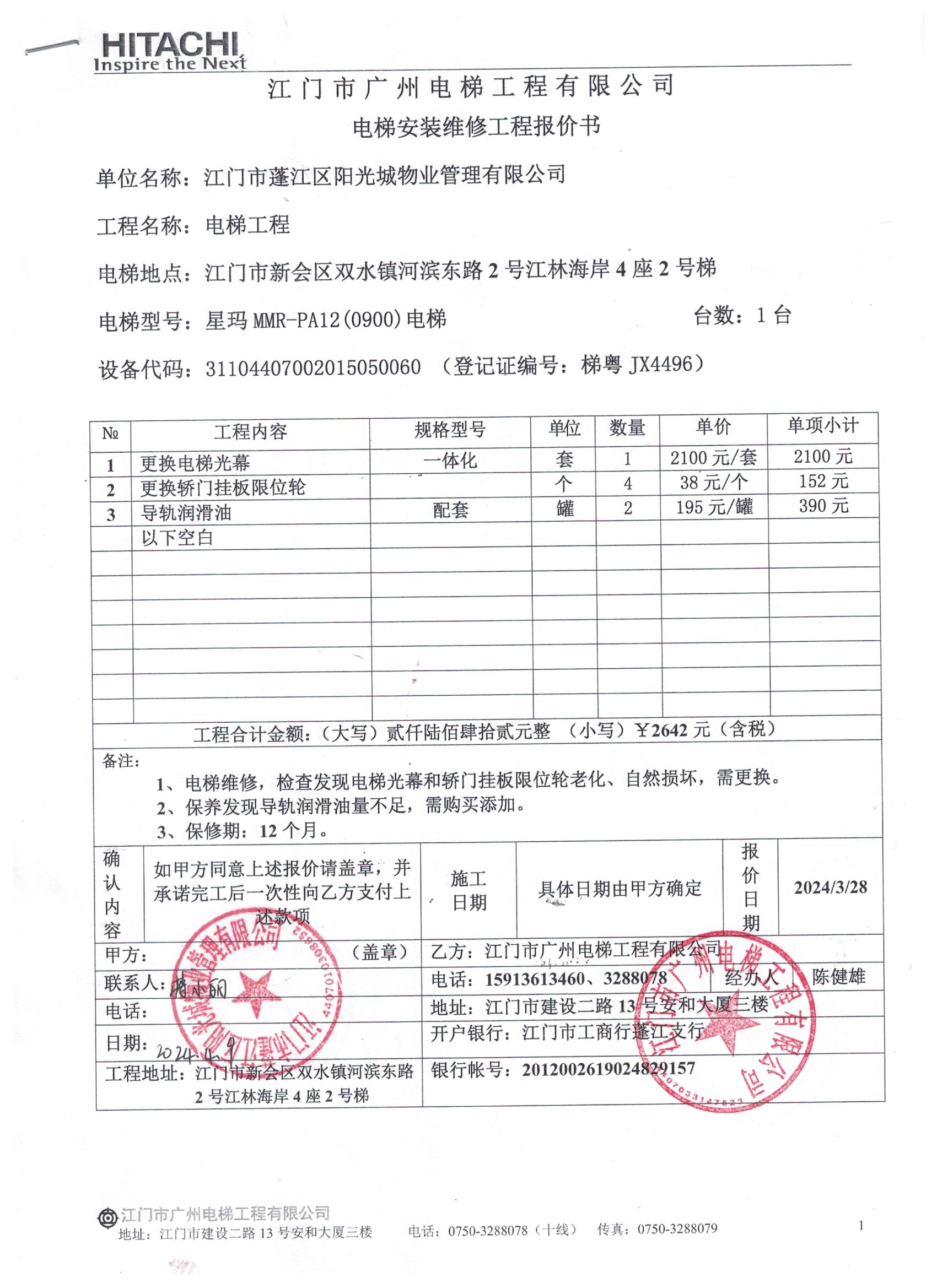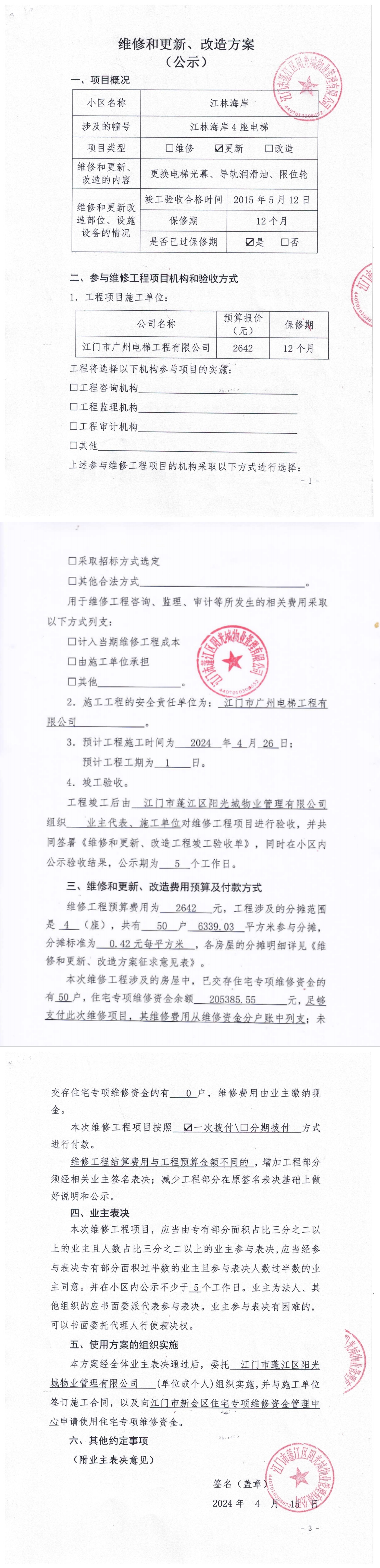 <td VALIGN="top" VALUES="" STYLE="border-width:0" BINDTYPE="0" ROWSPAN="19" COLSPAN="7" DATASOURCE="投票结果" ><font style="font-size:14pt;"><p style="white-space: normal; font-family: 宋体; line-height: 1.75em;">江林海岸江林海岸4座全体业主:</p><p style="white-space: normal; font-family: 宋体; line-height: 1.75em; text-indent: 2em;">本小区关于江林海岸4座电梯(梯粤JX4496)更换光幕、限位轮、导轨油使用维修资金的投票的投票已表决结束,询异时间从2024年04月30日开始,投票询异公示期间,业主可通过微信查询自己的表决情况或可凭身份证件申请查询自己的表决情况;如公示的业主表决情况与查询的本人表决意见不一致的,可以以书面形式向投票组织机构申诉,投票组织机构予以纠正并重新公示表决结果。异议提出人对投票组织机构的处理仍有异议的,可以向街道办事处(镇人民政府)反映处理,涉及住宅专项维修资金的,可向属地住宅专项维修资金管理中心反映处理。</p><p style="white-space: normal;"><br/></p><p style="white-space: normal; font-family: 宋体; line-height: 1.75em;"><strong>附件:</strong></p><p style="white-space: normal; font-family: 宋体; line-height: 1.75em;"><strong>一、投票范围</strong></p><p style="white-space: normal; font-family: 宋体; line-height: 1.75em; text-indent: 2em;">江林海岸江林海岸4座</p><p style="white-space: normal; font-family: 宋体; line-height: 1.75em; text-indent: 2em;">总人数(专有部分人数之和):46</p><p style="white-space: normal; font-family: 宋体; line-height: 1.75em; text-indent: 2em;"><span style="font-family: 宋体, SimSun;"><span style="font-family: 宋体; text-indent: 32px;"><span style="font-family: 宋体; text-indent: 32px;">总户数:50</span></span></span></p><p style="white-space: normal; font-family: 宋体; line-height: 1.75em; text-indent: 2em;">建筑物总面积(专有部分面积之和):6339.03㎡</p><p style="white-space: normal; font-family: 宋体; line-height: 1.75em;"><strong>二、询异公示起止时间</strong></p><p dir="ltr" style="white-space: normal; font-family: 宋体; line-height: 1.75em; text-indent: 2em;"><span style="text-indent: 36px;">2024年04月30日至2024年05月06日</span></p><p style="white-space: normal; font-family: 宋体; line-height: 1.75em;"><strong>三、投票详细描述</strong></p><p style="white-space: normal; font-family: 宋体; line-height: 1.75em; text-indent: 2em;"><p> 小区4座的2号电梯日常运行时电梯门经常关不上门导致运行不了,运行时出现异响声,经检查是由于电梯光幕和挂板限位轮老化损坏,同时检查发现导轨润滑油量不足导致发出异声。<br/></p><p> 现对4座的2号电梯进行更换光幕、限位轮、导轨油,工程预算金额2642元,项目最终费用以施工合同签订金额为准。因已过保修期,维修费用由相关业主按建筑面积分摊,每平方约0.42元,详见公示附件。如业主手机不能正常通过微信投票,请联系物业公司进行线下纸质投票,物业电话:0750-6412233。</p></p><p style="white-space: normal; font-family: 宋体; line-height: 1.75em;"><strong>四、计票规则</strong></p><p style="white-space: normal; font-family: 宋体; line-height: 1.75em; text-indent: 2em;">表决事项:使用建筑物及其附属设施的维修资金<br /><p style='text-align: left; font-family: 宋体; font-size: 16px; line-height: 1.75em; text-indent: 2em;'>计票规则:弃权票不并入其它项 未表决票不并入其它项</p></p><p style="white-space: normal; font-family: 宋体; line-height: 1.75em;"><strong>五、通过规则</strong></p><p style="white-space: normal; font-family: 宋体; line-height: 1.75em;"><strong><strong style="white-space: normal;"><span style="font-family: 宋体, SimSun;"> 根据《中华人民共和国民法典》第二百七十八条规定:业主共同决定事项,应当由专有部分面积占比三分之二以上的业主且人数占比三分之二以上的业主参与表决。</span></strong></strong></p><p style="white-space: normal; font-family: 宋体; line-height: 1.75em; text-indent: 2em;">表决事项:使用建筑物及其附属设施的维修资金<br /><p style='text-align: left; font-family: 宋体; font-size: 16px; line-height: 1.75em; text-indent: 2em;'>通过规则:双2/3以上参与表决,参与表决双过半同意</p></p><p style="white-space: normal; font-family: 宋体; line-height: 1.75em;"><strong>六、投票结果</strong></p><p style="white-space: normal; font-family: 宋体; line-height: 1.75em; text-indent: 2em;"><div id='resultTable'><table style='table-layout: fixed; font-size:12px; margin-top:10px' width='100%' border='0' cellspacing='0' cellpadding='0'><tr><td height='28' colspan='10' align='center' style='border: 1px solid #666'><strong style='font-size: 14px;'> 使用建筑物及其附属设施的维修资金</strong></td> </tr><tr id='trfirst'><td height='28' colspan='4' style='border-left: 1px solid #666; border-bottom: 1px solid #666'><strong> 申报单位:</strong> 江门市蓬江区阳光城物业管理有限公司</td><td colspan='3' style='border-left: 1px solid #666; border-bottom: 1px solid #666'><strong> 联系方式:</strong> 3332898 </td><td colspan='3' style='border-left: 1px solid #666; border-bottom: 1px solid #666; border-right: 1px solid #666'><strong> 申报日期:</strong> 2024年4月18日 </td></tr><tr> <td height='28' colspan='5' style='border-left: 1px solid #666; border-bottom: 1px solid #666'><strong> 总人数(专有部分人数之和):</strong>46人 </td><td colspan='5' style='border-left: 1px solid #666; border-bottom: 1px solid #666; border-right: 1px solid #666'><strong> 建筑物总面积(专有部分面积之和):</strong>6339.03㎡ </td> </tr><tr><td height='28' colspan='10' bgcolor='#F3F3F3' style='border-left: 1px solid #666;border-bottom: 1px solid #666;border-right: 1px so