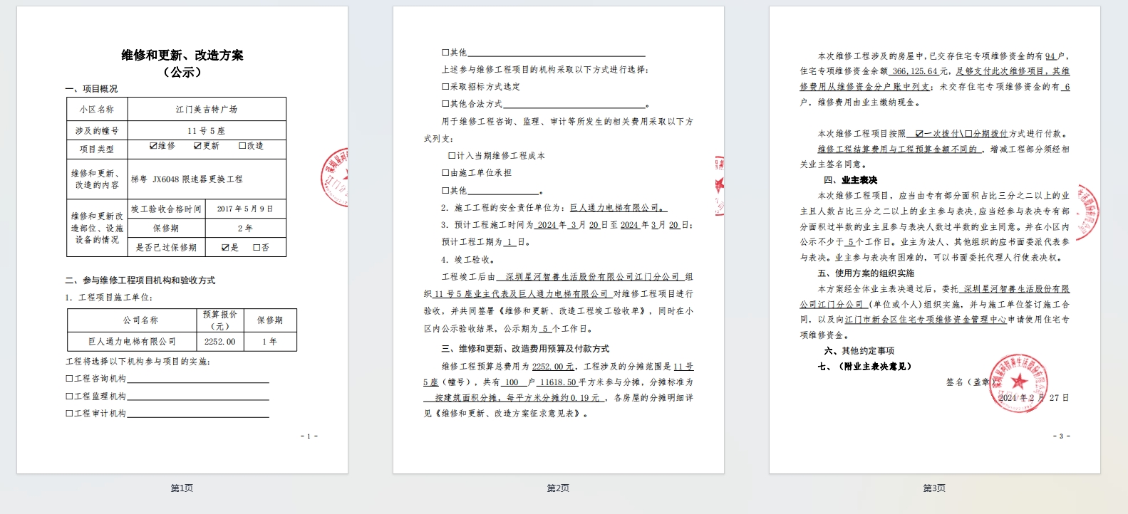 <td VALIGN="top" VALUES="" STYLE="border-width:0" BINDTYPE="0" ROWSPAN="19" COLSPAN="7" DATASOURCE="投票结果" ><font style="font-size:14pt;"><p style="white-space: normal; font-family: 宋体; line-height: 1.75em;">江门美吉特广场会城启超大道11号5座全体业主:</p><p style="white-space: normal; font-family: 宋体; line-height: 1.75em; text-indent: 2em;">本小区关于江门美吉特广场11号5座梯粤JX6048限速器更换工程使用维修资金的投票的投票已表决结束,询异时间从2024年03月12日开始,投票询异公示期间,业主可通过微信查询自己的表决情况或可凭身份证件申请查询自己的表决情况;如公示的业主表决情况与查询的本人表决意见不一致的,可以以书面形式向投票组织机构申诉,投票组织机构予以纠正并重新公示表决结果。异议提出人对投票组织机构的处理仍有异议的,可以向街道办事处(镇人民政府)反映处理,涉及住宅专项维修资金的,可向属地住宅专项维修资金管理中心反映处理。</p><p style="white-space: normal;"><br/></p><p style="white-space: normal; font-family: 宋体; line-height: 1.75em;"><strong>附件:</strong></p><p style="white-space: normal; font-family: 宋体; line-height: 1.75em;"><strong>一、投票范围</strong></p><p style="white-space: normal; font-family: 宋体; line-height: 1.75em; text-indent: 2em;">江门美吉特广场会城启超大道11号5座</p><p style="white-space: normal; font-family: 宋体; line-height: 1.75em; text-indent: 2em;">总人数(专有部分人数之和):100</p><p style="white-space: normal; font-family: 宋体; line-height: 1.75em; text-indent: 2em;"><span style="font-family: 宋体, SimSun;"><span style="font-family: 宋体; text-indent: 32px;"><span style="font-family: 宋体; text-indent: 32px;">总户数:100</span></span></span></p><p style="white-space: normal; font-family: 宋体; line-height: 1.75em; text-indent: 2em;">建筑物总面积(专有部分面积之和):11618.50㎡</p><p style="white-space: normal; font-family: 宋体; line-height: 1.75em;"><strong>二、询异公示起止时间</strong></p><p dir="ltr" style="white-space: normal; font-family: 宋体; line-height: 1.75em; text-indent: 2em;"><span style="text-indent: 36px;">2024年03月12日至2024年03月18日</span></p><p style="white-space: normal; font-family: 宋体; line-height: 1.75em;"><strong>三、投票详细描述</strong></p><p style="white-space: normal; font-family: 宋体; line-height: 1.75em; text-indent: 2em;"><p> 江门美吉特广场11号5座梯粤JX6048日常运行出行停运情况,经检查,是由于电梯限速器内圈磨损及其轴承损坏,因使用时间较长磨损严重导致电梯不能正常运行。现对11号5座梯粤JX6048进行维修,工程维修预算金额为2252.00元,项目最终费用以施工合同签订金额为准。因已过保修期,维修费用由相关业主按建筑面积分摊,总面积的建筑面积为11618.50平方米,每平方约0.19元,如业主手机不能正常通过微信投票,请联系物业公司进行线下纸质投票,物业电话:13555625107。</p></p><p style="white-space: normal; font-family: 宋体; line-height: 1.75em;"><strong>四、计票规则</strong></p><p style="white-space: normal; font-family: 宋体; line-height: 1.75em; text-indent: 2em;">表决事项:使用建筑物及其附属设施的维修资金<br /><p style='text-align: left; font-family: 宋体; font-size: 16px; line-height: 1.75em; text-indent: 2em;'>计票规则:弃权票不并入其它项 未表决票不并入其它项</p></p><p style="white-space: normal; font-family: 宋体; line-height: 1.75em;"><strong>五、通过规则</strong></p><p style="white-space: normal; font-family: 宋体; line-height: 1.75em;"><strong><strong style="white-space: normal;"><span style="font-family: 宋体, SimSun;"> 根据《中华人民共和国民法典》第二百七十八条规定:业主共同决定事项,应当由专有部分面积占比三分之二以上的业主且人数占比三分之二以上的业主参与表决。</span></strong></strong></p><p style="white-space: normal; font-family: 宋体; line-height: 1.75em; text-indent: 2em;">表决事项:使用建筑物及其附属设施的维修资金<br /><p style='text-align: left; font-family: 宋体; font-size: 16px; line-height: 1.75em; text-indent: 2em;'>通过规则:双2/3以上参与表决,参与表决双过半同意</p></p><p style="white-space: normal; font-family: 宋体; line-height: 1.75em;"><strong>六、投票结果</strong></p><p style="white-space: normal; font-family: 宋体; line-height: 1.75em; text-indent: 2em;"><div id='resultTable'><table style='table-layout: fixed; font-size:12px; margin-top:10px' width='100%' border='0' cellspacing='0' cellpadding='0'><tr><td height='28' colspan='10' align='center' style='border: 1px solid #666'><strong style='font-size: 14px;'> 使用建筑物及其附属设施的维修资金</strong></td> </tr><tr id='trfirst'><td height='28' colspan='4' style='border-left: 1px solid #666; border-bottom: 1px solid #666'><strong> 申报单位:</strong> 深圳星河智善生活股份有限公司江门分公司</td><td colspan='3' style='border-left: 1px solid #666; border-bottom: 1px solid #666'><strong> 联系方式:</strong> (0750) 3871336 3829717 </td><td colspan='3' style='border-left: 1px solid #666; border-bottom: 1px solid #666; border-right: 1px solid #666'><strong> 申报日期:</strong> 2024年3月1日 </td></tr><tr> <td height='28' colspan='5' style='border-left: 1px solid #666; border-bottom: 1px solid #666'><strong> 总人数(专有部分人数之和):</strong>100人 </td><td colspan='5' style='border-left: 1px solid #666; border-bottom: 1px solid #666; border-right: 1px solid #666'><strong> 建筑物总面积(专有部分面积之和):</strong>11618.50㎡ </td> </tr><tr><td height='28' colspan='10' bgcolor='#F3F3F3' style='border-left: 1px solid #666;border-bottom: 1px solid #6