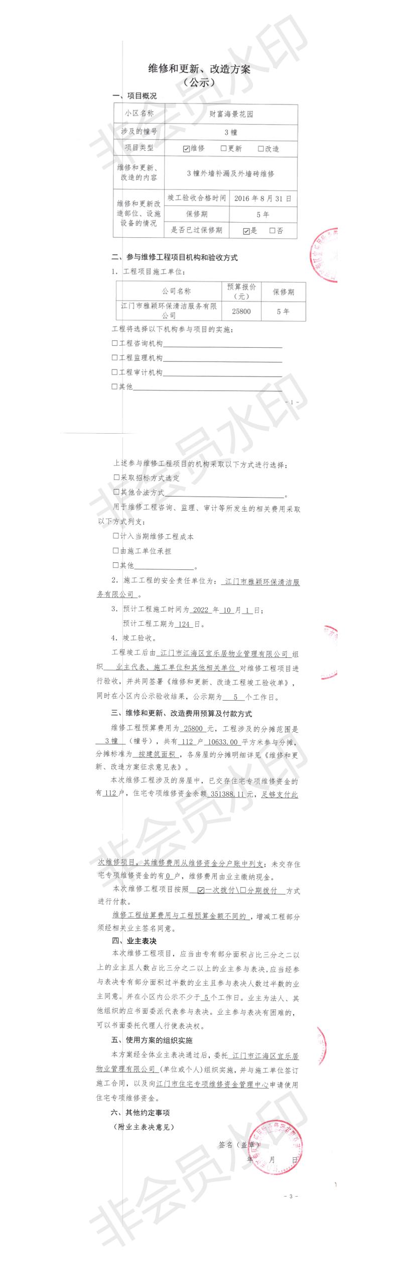 <td VALIGN="top" VALUES="" STYLE="border-width:0" BINDTYPE="0" ROWSPAN="19" COLSPAN="7" DATASOURCE="投票结果" ><font style="font-size:14pt;"><p style="text-align: left; font-family: 宋体; font-size: 16px; line-height: 1.75em;"><span style="font-family: 宋体;">江海区外海财富海景花园江海区外海财富海景花园3幢全体业主:</span></p><p style="text-align: left; font-family: 宋体; font-size: 16px; line-height: 1.75em; text-indent: 2em;">本小区关于江门财富海景花园3幢外墙补漏及外墙砖维修使用维修资金的投票的投票已表决结束,询异时间从2022年10月10日开始,投票询异公示期间,业主可通过微信查询自己的表决情况或可凭身份证件赴发起机构申请查询自己的表决情况;如公示的业主表决情况与在服务平台查询的本人表决意见不一致的,可以以书面形式向发起机构核查。经核查业主反映情况属实的,发起机构应当予以纠正并重新公示表决结果。</p><p><br/></p><p style="text-align: left; font-family: 宋体; font-size: 16px; line-height: 1.75em;"><strong><span style="font-family: 宋体">附件:</span></strong></p><p style="text-align: left; font-family: 宋体; font-size: 16px; line-height: 1.75em;"><strong>一、投票范围</strong></p><p style="text-align: left; font-family: 宋体; font-size: 16px; line-height: 1.75em; text-indent: 2em;">江海区外海财富海景花园江海区外海财富海景花园3幢</p><p style="text-align: left; font-family: 宋体; font-size: 16px; line-height: 1.75em; text-indent: 2em;">总人数(专有部分人数之和):111</p><p style="text-align: left; font-family: 宋体; font-size: 16px; line-height: 1.75em; text-indent: 2em;"><span style="font-family: 宋体, SimSun; text-indent: 32px;">总户数:{TotalHouseCount}</span></p><p style="text-align: left; font-family: 宋体; font-size: 16px; line-height: 1.75em; text-indent: 2em;">建筑物总面积(专有部分面积之和):10633.00㎡</p><p style="text-align: left; font-family: 宋体; font-size: 16px; line-height: 1.75em;"><strong>二、投票起止时间</strong></p><p dir="ltr" style="text-align: left; font-family: 宋体; font-size: 16px; line-height: 1.75em; text-indent: 2em;">投票表决时间:从2022年09月19日到2022年10月09日止</p><p dir="ltr" style="text-align: left; font-family: 宋体; font-size: 16px; line-height: 1.75em; text-indent: 2em;">投票询异公示时间:从2022年10月10日开始</p><p dir="ltr" style="text-align: left; font-family: 宋体; font-size: 16px; line-height: 1.75em; text-indent: 2em;">投票结果通知公告时间:从2022年10月17日开始<br/></p><p style="text-align: left; font-family: 宋体; font-size: 16px; line-height: 1.75em;"><strong>三、投票详细描述</strong></p><p style="text-align: left; font-family: 宋体; font-size: 16px; line-height: 1.75em; text-indent: 2em;"><p style="font-family: &quot;Helvetica Neue&quot;, Helvetica, Arial, sans-serif; font-size: 14px; white-space: normal; background-color: rgb(255, 255, 255); text-indent: 2em; line-height: 1.75em;"><span style="font-family: 宋体, SimSun; text-decoration: none;">本小区3幢多户屋内墙体渗水,经检查,是由于外墙渗水,已过保修期。且3幢部分外墙砖出现松动,存在安全隐患。</span></p><p style="font-family: &quot;Helvetica Neue&quot;, Helvetica, Arial, sans-serif; font-size: 14px; white-space: normal; background-color: rgb(255, 255, 255); text-indent: 2em; line-height: 1.75em;"><span style="font-family: 宋体, SimSun; text-decoration: none;">现需申请使用维修资金对3幢部分外墙补漏及外墙砖维修,工程维修预算金额为25800元,项目最终费用以施工合同签订金额为准。维修费用的分摊标准为按建筑面积分摊,每平方约2.43元,详见公示附件。如业主手机不能正常通过微信投票,请联系物业服务中心进行线下纸质投票,物业服务中心电话:0750-3813899。</span></p></p><p style="text-align: left; font-family: 宋体; font-size: 16px; line-height: 1.75em;"><strong>四、计票规则</strong></p><p style="text-align: left; font-family: 宋体; font-size: 16px; line-height: 1.75em; text-indent: 2em;">表决事项:使用建筑物及其附属设施的维修资金<br /><p style='text-align: left; font-family: 宋体; font-size: 16px; line-height: 1.75em; text-indent: 2em;'>计票规则:弃权票不并入其它项&nbsp;&nbsp;&nbsp;&nbsp;未表决票不并入其它项</p></p><p style="text-align: left; font-family: 宋体; font-size: 16px; line-height: 1.75em;"><strong>五、通过规则</strong></p><p style="text-align: left; font-family: 宋体; font-size: 16px; line-height: 1.75em; text-indent: 2em;"><span style="font-family: 宋体; text-indent: 32px;">表决事项:使用建筑物及其附属设施的维修资金<br /><p style='text-align: left; font-family: 宋体; font-size: 16px; line-height: 1.75em; text-indent: 2em;'>通过规则:参与表决专有部分面积过半数的业主且参与表决人数过半数的业主同意</p></span></p><p style="text-align: left; font-family: 宋体; font-size: 16px; line-height: 1.75em;"><strong>六、投票结果</strong></p><p style="text-align: left; font-family: 宋体; font-size: 16px; line-height: 1.75em; text-indent: 2em;"><div id='resultTable'><table style='table-layout: fixed; font-size:12px; margin-top:10px' width='100%' border='0' cellspacing='0' cellpadding='0'><tr><td height='28' colspan='10' align='center' style='border: 1px solid #666'><strong style='font-size: 14px;'> 使用建筑物及其附属设施的维修资金</strong></td> </tr><tr id='trfirst'><td height='28' colspan='4' style='border-left: 1px solid #666; border-bottom: 1px solid #666'><strong>&nbsp;申报单位:</strong> 江门市江海区宜乐居物业管理有限公司</td><td colspan='3' style='border-left: 1px solid #666; border-bottom: 1px solid #666'><strong>&nbsp;联系方式:</strong> </td><td colspan='3' s
