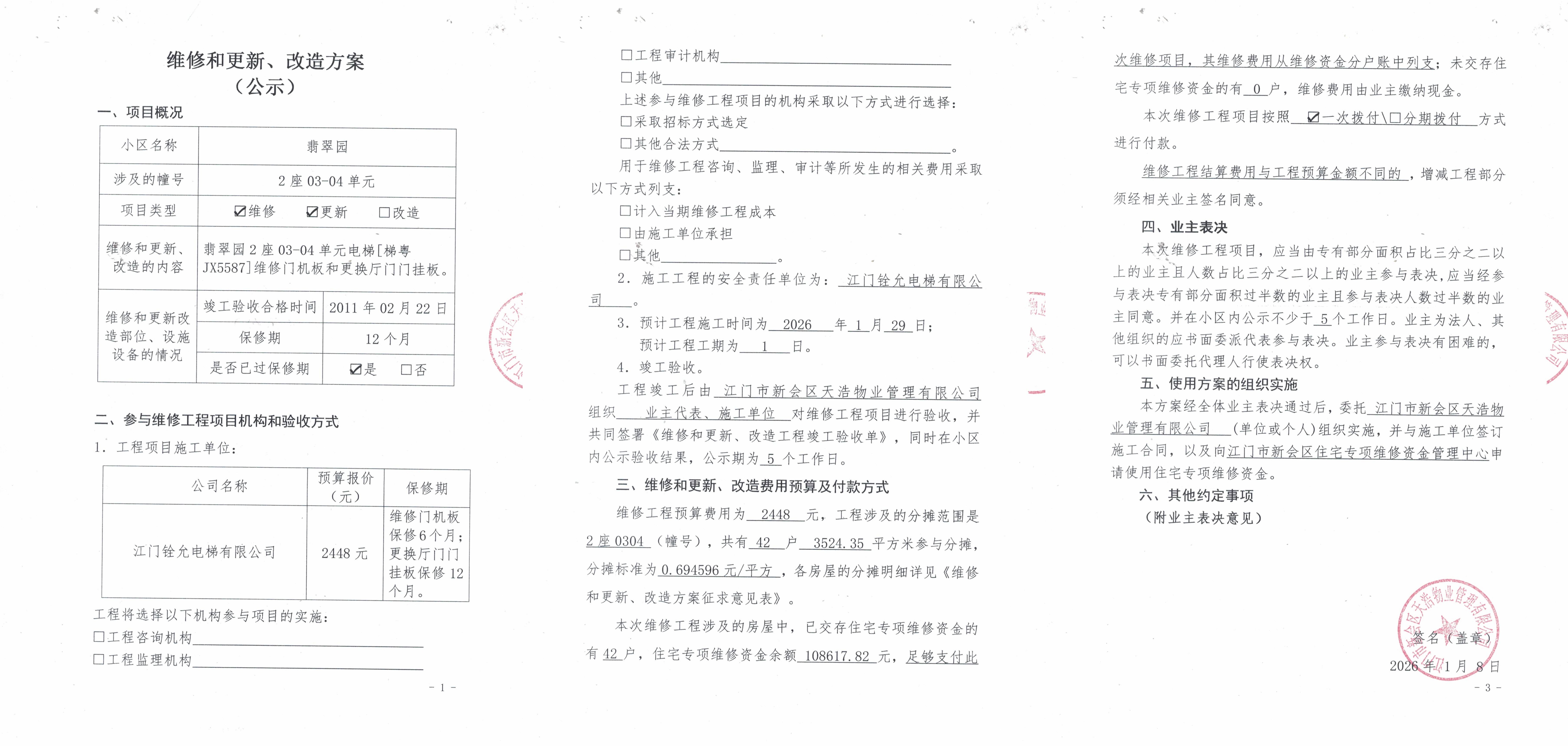 <td VALIGN="top" VALUES="" STYLE="border-width:0" BINDTYPE="0" ROWSPAN="19" COLSPAN="7" DATASOURCE="投票结果" ><font style="font-size:14pt;"><p style="white-space: normal; font-family: 宋体; line-height: 1.75em;">翡翠园翡翠园2座全体业主:</p><p style="white-space: normal; font-family: 宋体; line-height: 1.75em; text-indent: 2em;">本小区关于翡翠园2座0304单元电梯【梯粤JX5587】维修门机板和更换厅门门挂板使用维修资金的投票的投票已表决结束,询异时间从2026年01月19日开始,投票询异公示期间,业主可通过微信查询自己的表决情况或可凭身份证件申请查询自己的表决情况;如公示的业主表决情况与查询的本人表决意见不一致的,可以以书面形式向投票组织机构申诉,投票组织机构予以纠正并重新公示表决结果。异议提出人对投票组织机构的处理仍有异议的,可以向街道办事处(镇人民政府)反映处理,涉及住宅专项维修资金的,可向属地住宅专项维修资金管理中心反映处理。</p><p style="white-space: normal;"><br/></p><p style="white-space: normal; font-family: 宋体; line-height: 1.75em;"><strong>附件:</strong></p><p style="white-space: normal; font-family: 宋体; line-height: 1.75em;"><strong>一、投票范围</strong></p><p style="white-space: normal; font-family: 宋体; line-height: 1.75em; text-indent: 2em;">翡翠园翡翠园2座</p><p style="white-space: normal; font-family: 宋体; line-height: 1.75em; text-indent: 2em;">总人数(专有部分人数之和):26</p><p style="white-space: normal; font-family: 宋体; line-height: 1.75em; text-indent: 2em;"><span style="font-family: 宋体, SimSun;"><span style="font-family: 宋体; text-indent: 32px;"><span style="font-family: 宋体; text-indent: 32px;">总户数:42</span></span></span></p><p style="white-space: normal; font-family: 宋体; line-height: 1.75em; text-indent: 2em;">建筑物总面积(专有部分面积之和):3524.35㎡</p><p style="white-space: normal; font-family: 宋体; line-height: 1.75em;"><strong>二、询异公示起止时间</strong></p><p dir="ltr" style="white-space: normal; font-family: 宋体; line-height: 1.75em; text-indent: 2em;"><span style="text-indent: 36px;">2026年01月19日至2026年01月29日</span></p><p style="white-space: normal; font-family: 宋体; line-height: 1.75em;"><strong>三、投票详细描述</strong></p><p style="white-space: normal; font-family: 宋体; line-height: 1.75em; text-indent: 2em;"><p><span style="font-family: 宋体, SimSun; font-size: 14px;"> 翡翠园2座0304单元电梯(梯粤JX5587)门机控制驱动板故障,9楼、8楼、4楼厅门门挂板老化磨损,配件日常使用自然损坏,已过保修期。</span></p><p><span style="font-family: 宋体, SimSun; font-size: 14px;"> 现需申请使用维修资金对2座0304单元电梯(梯粤JX5587)进行维修,工程维修预算金额为2448元,项目最终费用以施工合同签订金额为准。因已过保修期,维修费用由相关业主按建筑面积分摊,每平方约0.694596元,详见公示附件。如业主手机不能正常通过微信投票,请联系物业公司进行线下纸质投票,物业电话:0750-6602800。</span></p><p><br/></p></p><p style="white-space: normal; font-family: 宋体; line-height: 1.75em;"><strong>四、计票规则</strong></p><p style="white-space: normal; font-family: 宋体; line-height: 1.75em; text-indent: 2em;">表决事项:使用建筑物及其附属设施的维修资金<br /><p style='text-align: left; font-family: 宋体; font-size: 16px; line-height: 1.75em; text-indent: 2em;'>计票规则:弃权票不并入其它项 未表决票不并入其它项</p></p><p style="white-space: normal; font-family: 宋体; line-height: 1.75em;"><strong>五、通过规则</strong></p><p style="white-space: normal; font-family: 宋体; line-height: 1.75em;"><strong><strong style="white-space: normal;"><span style="font-family: 宋体, SimSun;"> 根据《中华人民共和国民法典》第二百七十八条规定:业主共同决定事项,应当由专有部分面积占比三分之二以上的业主且人数占比三分之二以上的业主参与表决。</span></strong></strong></p><p style="white-space: normal; font-family: 宋体; line-height: 1.75em; text-indent: 2em;">表决事项:使用建筑物及其附属设施的维修资金<br /><p style='text-align: left; font-family: 宋体; font-size: 16px; line-height: 1.75em; text-indent: 2em;'>通过规则:双2/3以上参与表决,参与表决双过半同意</p></p><p style="white-space: normal; font-family: 宋体; line-height: 1.75em;"><strong>六、投票结果</strong></p><p style="white-space: normal; font-family: 宋体; line-height: 1.75em; text-indent: 2em;"><div id='resultTable'><table style='table-layout: fixed; font-size:12px; margin-top:10px' width='100%' border='0' cellspacing='0' cellpadding='0'><tr><td height='28' colspan='10' align='center' style='border: 1px solid #666'><strong style='font-size: 14px;'> 使用建筑物及其附属设施的维修资金</strong></td> </tr><tr id='trfirst'><td height='28' colspan='4' style='border-left: 1px solid #666; border-bottom: 1px solid #666'><strong> 申报单位:</strong> 江门市新会区天浩物业管理有限公司</td><td colspan='3' style='border-left: 1px solid #666; border-bottom: 1px solid #666'><strong> 联系方式:</strong> </td><td colspan='3' style='border-left: 1px solid #666; border-bottom: 1px solid #666; border-right: 1px solid #666'><strong> 申报日期:</strong> 2026年1月10日 </td></tr><tr> <td height='28' colspan='5' style='border-left: 1px solid #666; border-bottom: 1px solid #666'><strong> 总人数(专有部分人数之和):</strong>26人 </td><td colspan='5' style='border-left: 1px solid #666; border-bottom: 1px solid #666; border-right: 1px solid #666'><strong> 建筑物总面积(专有部分面积之和):</strong>3524.35㎡ </td> </tr><tr><td height='28' colspan='10' bgcolor='#F