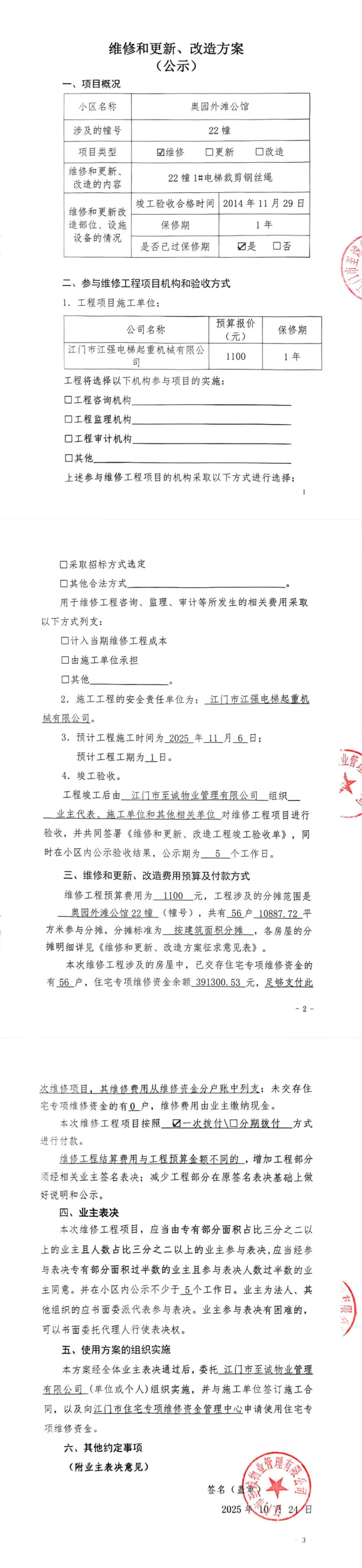 <td VALIGN="top" VALUES="" STYLE="border-width:0" BINDTYPE="0" ROWSPAN="17" COLSPAN="7" DATASOURCE="投票结果" ><font style=" font-family:方正小标宋简体;font-size:14pt;"><p style="line-height: 1.75em;"><span style="font-family: 宋体, SimSun;">各位尊敬的业主:</span><br/></p><p style="text-indent: 2em; line-height: 1.75em;"><span style="font-family: 宋体, SimSun;">根据法律法规的规定,本小区业主利用“江门市物业事项表决管理系统”已对本小区公共事务决策事项(<span style="font-family: 宋体; text-indent: 32px;">奥园外滩公馆22幢1#电梯裁剪钢丝绳使用维修资金的投票</span>)进行了表决,在经过7日的询异公示期后,未收到业主有效的异议。现将投票结果公告,并就产生的法律效力说明如下:</span></p><p style="line-height: 1.75em; text-indent: 0em;"><strong style="text-indent: 2em;"><span style="font-family: 宋体, SimSun;">一、投票范围</span></strong></p><p style="text-indent: 2em; line-height: 1.75em;"><span style="font-family: 宋体, SimSun;">奥园外滩公馆蓬江区棠下镇奥园外滩公馆22幢</span></p><p style="text-indent: 2em; line-height: 1.75em;"><span style="font-family: 宋体, SimSun;">总人数(专有部分人数之和):55</span></p><p style="text-indent: 2em; line-height: 1.75em;"><span style="font-family: 宋体, SimSun;"><span style="font-family: 宋体, SimSun; text-indent: 32px;"><span style="font-family: 宋体; text-indent: 32px;"><span style="font-family: 宋体; text-indent: 32px;">总户数:56</span></span></span></span></p><p style="text-indent: 2em; line-height: 1.75em;"><span style="font-family: 宋体, SimSun;">建筑物总面积(专有部分面积之和):10887.72㎡</span></p><p style="line-height: 1.75em;"><strong><span style="font-family: 宋体, SimSun;">二、投票结果公告时间</span></strong></p><p style="text-indent: 2em; line-height: 1.75em;"><span style="font-family: 宋体, SimSun;"><span style="font-family: 宋体, SimSun; text-indent: 32px;">从2025年11月23日开始</span></span></p><p style="line-height: 1.75em;"><strong><span style="font-family: 宋体, SimSun;">三、计票规则</span></strong></p><p style="text-indent: 2em; line-height: 1.75em;"><span style="font-family: 宋体, SimSun;">表决事项:使用建筑物及其附属设施的维修资金<br /><p style='font-family: 宋体, SimSun;line-height: 1.75em; text-indent: 2em;'>计票规则:弃权票不并入其它项&nbsp;&nbsp;&nbsp;&nbsp;未表决票不并入其它项</p></span></p><p style="line-height: 1.75em;"><strong><span style="font-family: 宋体, SimSun;">四、通过规则</span></strong></p><p style="line-height: 1.75em;"><strong><span style="font-family: 宋体, SimSun;">&nbsp; 根据《中华人民共和国民法典》第二百七十八条规定:业主共同决定事项,应当由专有部分面积占比三分之二以上的业主且人数占比三分之二以上的业主参与表决。</span></strong></p><p style="text-indent: 2em; line-height: 1.75em;"><span style="font-family: 宋体, SimSun;"><span style="font-family: 宋体, SimSun; text-indent: 32px;">表决事项:使用建筑物及其附属设施的维修资金<br /><p style='font-family: 宋体, SimSun;line-height: 1.75em; text-indent: 2em;'>通过规则:双2/3以上参与表决,参与表决双过半同意</p></span></span></p><p style="line-height: 1.75em;"><strong><span style="font-family: 宋体, SimSun;">五、投票结果</span></strong></p><p style="line-height: 1.75em; text-indent: 2em;"><span style="font-family: 宋体, SimSun; text-indent: 2em;"><div id='resultTable'><table style='table-layout: fixed; font-size:12px; margin-top:10px' width='100%' border='0' cellspacing='0' cellpadding='0'><tr><td height='28' colspan='10' align='center' style='border: 1px solid #666'><strong style='font-size: 14px;'> 使用建筑物及其附属设施的维修资金</strong></td> </tr><tr id='trfirst'><td height='28' colspan='4' style='border-left: 1px solid #666; border-bottom: 1px solid #666'><strong>&nbsp;申报单位:</strong> 江门市至诚物业管理有限公司</td><td colspan='3' style='border-left: 1px solid #666; border-bottom: 1px solid #666'><strong>&nbsp;联系方式:</strong> 3851968 </td><td colspan='3' style='border-left: 1px solid #666; border-bottom: 1px solid #666; border-right: 1px solid #666'><strong>&nbsp;申报日期:</strong> 2025年10月24日 </td></tr><tr> <td height='28' colspan='5' style='border-left: 1px solid #666; border-bottom: 1px solid #666'><strong>&nbsp;列支总人数(专有部分人数之和):</strong>55人 </td><td colspan='5' style='border-left: 1px solid #666; border-bottom: 1px solid #666; border-right: 1px solid #666'><strong>&nbsp;列支建筑物总面积(专有部分面积之和):</strong>10887.72㎡ </td> </tr><tr><td height='28' colspan='10' bgcolor='#F3F3F3' style='border-left: 1px solid #666;border-bottom: 1px solid #666;border-right: 1px solid #666'><strong>&nbsp;参与表决人数及面积统计</strong></td></tr><tr><td height='28' colspan='5' style='border-left: 1px solid #666; border-bottom: 1px solid #666'><strong>&nbsp;参与表决人数:</strong>40人</td><td colspan='5' style='border-left: 1px solid #666; border-bottom: 1px solid #666; border-right: 1px solid #666'><strong>&nbsp;参与表决人数占总人数比例:</strong>72.73%</td></tr><tr><td height='28' colspan='5' style='border-left: 1px solid #666; border-bottom: 1px solid #666'><strong>&nbsp;参与表决面积:</strong>7848.84㎡</td><td colspan='5' style='border-left: 1px solid #666; border-bottom: 1px solid #666; border-right: 1px solid #666'><strong>&nbsp;参与表决面积占总面积比例:</strong>72.09%</td></tr><tr><td height='28' colspan='10' bgcolor='#F3F3F3' style='border-left: 1px solid #666; border-bottom: 1px solid #666;border-right: 1px solid #666'> <strong>&nbsp;参与表决同意人数及面积统计</strong></td> </tr><tr><td height='28' colspan='5' style='border-left: