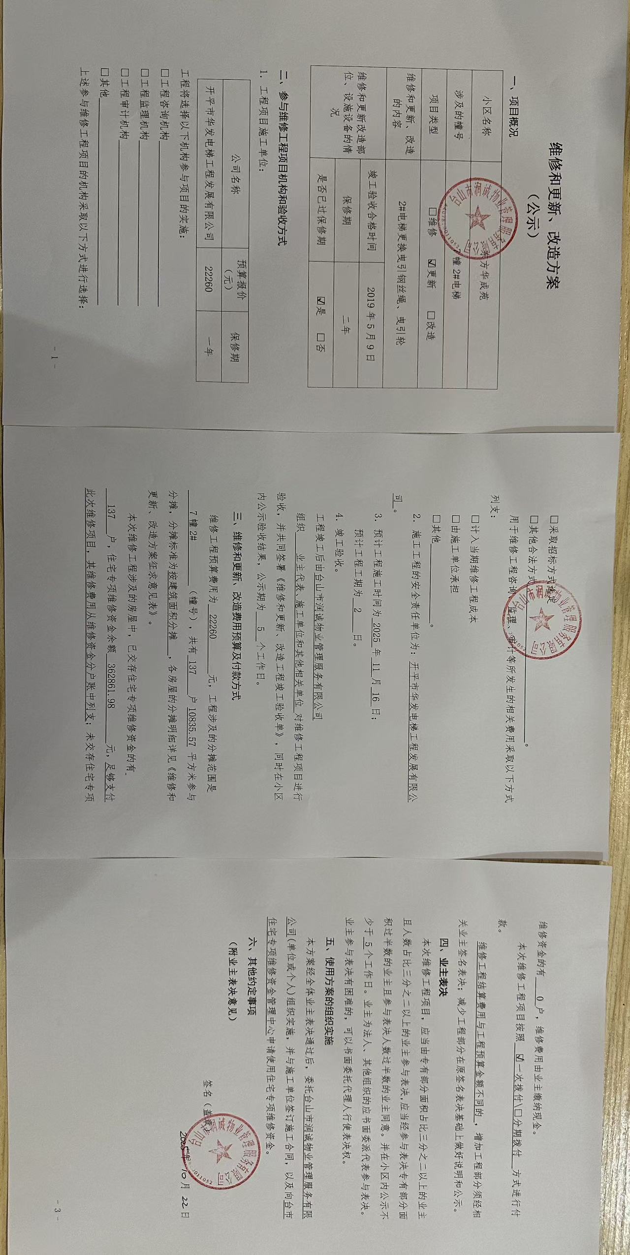 <td VALIGN="top" VALUES="" STYLE="border-width:0" BINDTYPE="0" ROWSPAN="19" COLSPAN="7" DATASOURCE="投票结果" ><font style="font-size:14pt;"><p style="white-space: normal; font-family: 宋体; line-height: 1.75em;">台城东方华成苑东方华成苑7座全体业主:</p><p style="white-space: normal; font-family: 宋体; line-height: 1.75em; text-indent: 2em;">本小区关于东方华成苑7幢2#电梯更换曳引钢丝绳、曳引轮的使用维修资金投票的投票已表决结束,询异时间从2025年11月17日开始,投票询异公示期间,业主可通过微信查询自己的表决情况或可凭身份证件申请查询自己的表决情况;如公示的业主表决情况与查询的本人表决意见不一致的,可以以书面形式向投票组织机构申诉,投票组织机构予以纠正并重新公示表决结果。异议提出人对投票组织机构的处理仍有异议的,可以向街道办事处(镇人民政府)反映处理,涉及住宅专项维修资金的,可向属地住宅专项维修资金管理中心反映处理。</p><p style="white-space: normal;"><br/></p><p style="white-space: normal; font-family: 宋体; line-height: 1.75em;"><strong>附件:</strong></p><p style="white-space: normal; font-family: 宋体; line-height: 1.75em;"><strong>一、投票范围</strong></p><p style="white-space: normal; font-family: 宋体; line-height: 1.75em; text-indent: 2em;">台城东方华成苑东方华成苑7座</p><p style="white-space: normal; font-family: 宋体; line-height: 1.75em; text-indent: 2em;">总人数(专有部分人数之和):136</p><p style="white-space: normal; font-family: 宋体; line-height: 1.75em; text-indent: 2em;"><span style="font-family: 宋体, SimSun;"><span style="font-family: 宋体; text-indent: 32px;"><span style="font-family: 宋体; text-indent: 32px;">总户数:137</span></span></span></p><p style="white-space: normal; font-family: 宋体; line-height: 1.75em; text-indent: 2em;">建筑物总面积(专有部分面积之和):10835.57㎡</p><p style="white-space: normal; font-family: 宋体; line-height: 1.75em;"><strong>二、询异公示起止时间</strong></p><p dir="ltr" style="white-space: normal; font-family: 宋体; line-height: 1.75em; text-indent: 2em;"><span style="text-indent: 36px;">2025年11月17日至2025年11月27日</span></p><p style="white-space: normal; font-family: 宋体; line-height: 1.75em;"><strong>三、投票详细描述</strong></p><p style="white-space: normal; font-family: 宋体; line-height: 1.75em; text-indent: 2em;"><p style="margin-top: 5px;">小区7幢2#电梯日常运行时出现异常,经维保检查钢丝绳1条断股、其余4条钢丝绳也磨损严重,主机曳引轮绳槽磨损有深痕,不能正常运行。<br/></p><p style="margin-top: 5px;">现对7幢2#电梯,工程维修预算金额为22260元,项目最终费用以施工合同签订金额为准。因已过保修期,维修费用由相关业主按建筑面积分摊,每平方约2.05元,详见公示附件。如业主手机不能正常通过微信投票,请联系物业公司进行线下纸质投票,物业电话:0750-5555956</p></p><p style="white-space: normal; font-family: 宋体; line-height: 1.75em;"><strong>四、计票规则</strong></p><p style="white-space: normal; font-family: 宋体; line-height: 1.75em; text-indent: 2em;">表决事项:使用建筑物及其附属设施的维修资金<br /><p style='text-align: left; font-family: 宋体; font-size: 16px; line-height: 1.75em; text-indent: 2em;'>计票规则:弃权票不并入其它项 未表决票不并入其它项</p></p><p style="white-space: normal; font-family: 宋体; line-height: 1.75em;"><strong>五、通过规则</strong></p><p style="white-space: normal; font-family: 宋体; line-height: 1.75em;"><strong><strong style="white-space: normal;"><span style="font-family: 宋体, SimSun;"> 根据《中华人民共和国民法典》第二百七十八条规定:业主共同决定事项,应当由专有部分面积占比三分之二以上的业主且人数占比三分之二以上的业主参与表决。</span></strong></strong></p><p style="white-space: normal; font-family: 宋体; line-height: 1.75em; text-indent: 2em;">表决事项:使用建筑物及其附属设施的维修资金<br /><p style='text-align: left; font-family: 宋体; font-size: 16px; line-height: 1.75em; text-indent: 2em;'>通过规则:双2/3以上参与表决,参与表决双过半同意</p></p><p style="white-space: normal; font-family: 宋体; line-height: 1.75em;"><strong>六、投票结果</strong></p><p style="white-space: normal; font-family: 宋体; line-height: 1.75em; text-indent: 2em;"><div id='resultTable'><table style='table-layout: fixed; font-size:12px; margin-top:10px' width='100%' border='0' cellspacing='0' cellpadding='0'><tr><td height='28' colspan='10' align='center' style='border: 1px solid #666'><strong style='font-size: 14px;'> 使用建筑物及其附属设施的维修资金</strong></td> </tr><tr id='trfirst'><td height='28' colspan='4' style='border-left: 1px solid #666; border-bottom: 1px solid #666'><strong> 申报单位:</strong> 台山市润诚物业管理服务有限公司</td><td colspan='3' style='border-left: 1px solid #666; border-bottom: 1px solid #666'><strong> 联系方式:</strong> 13790301587 </td><td colspan='3' style='border-left: 1px solid #666; border-bottom: 1px solid #666; border-right: 1px solid #666'><strong> 申报日期:</strong> 2025年10月22日 </td></tr><tr> <td height='28' colspan='5' style='border-left: 1px solid #666; border-bottom: 1px solid #666'><strong> 总人数(专有部分人数之和):</strong>136人 </td><td colspan='5' style='border-left: 1px solid #666; border-bottom: 1px solid #666; border-right: 1px solid #666'><strong> 建筑物总面积(专有部分面积之和):</strong>10835.57㎡ </td> </tr><tr><td height='28' colspan='10' bgcolor='#F3F3F3' style='border-left: 1px solid #666;border-bottom: 1px solid #666;border-right: 1px solid #666'><strong> 参与人数