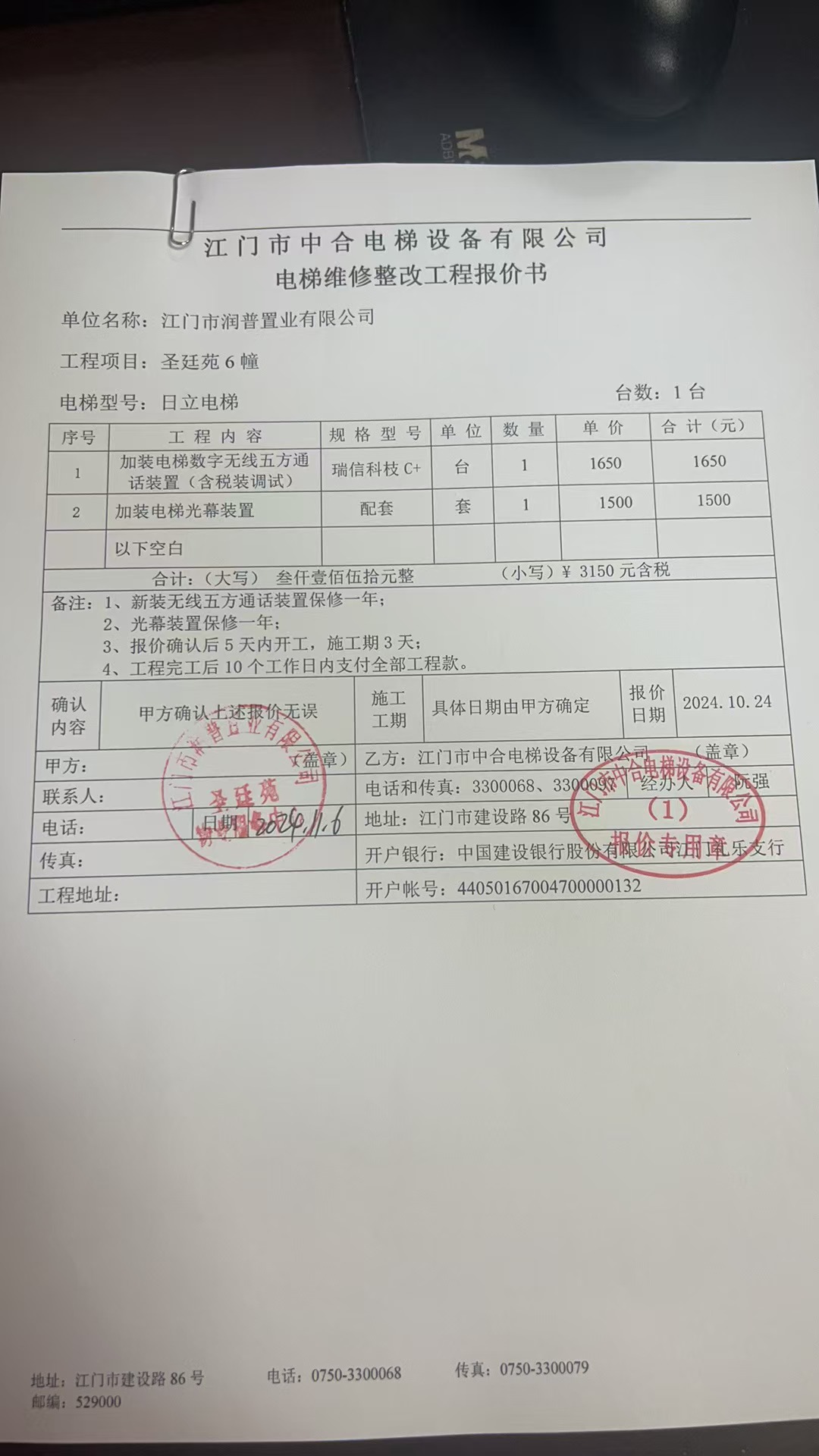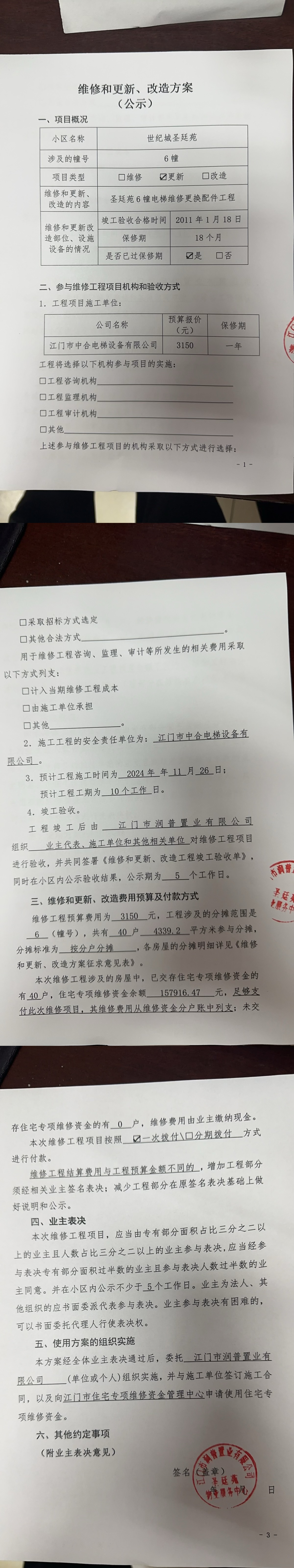 <td VALIGN="top" VALUES="" STYLE="border-width:0" BINDTYPE="0" ROWSPAN="19" COLSPAN="7" DATASOURCE="投票结果" ><font style="font-size:14pt;"><p style="white-space: normal; font-family: 宋体; line-height: 1.75em;">世纪城蓬江区圣廷苑6幢全体业主:</p><p style="white-space: normal; font-family: 宋体; line-height: 1.75em; text-indent: 2em;">本小区关于圣廷苑小区6幢电梯维修更换配件工程使用维修资金的投票的投票已表决结束,询异时间从2026年01月07日开始,投票询异公示期间,业主可通过微信查询自己的表决情况或可凭身份证件申请查询自己的表决情况;如公示的业主表决情况与查询的本人表决意见不一致的,可以以书面形式向投票组织机构申诉,投票组织机构予以纠正并重新公示表决结果。异议提出人对投票组织机构的处理仍有异议的,可以向街道办事处(镇人民政府)反映处理,涉及住宅专项维修资金的,可向属地住宅专项维修资金管理中心反映处理。</p><p style="white-space: normal;"><br/></p><p style="white-space: normal; font-family: 宋体; line-height: 1.75em;"><strong>附件:</strong></p><p style="white-space: normal; font-family: 宋体; line-height: 1.75em;"><strong>一、投票范围</strong></p><p style="white-space: normal; font-family: 宋体; line-height: 1.75em; text-indent: 2em;">世纪城蓬江区圣廷苑6幢</p><p style="white-space: normal; font-family: 宋体; line-height: 1.75em; text-indent: 2em;">总人数(专有部分人数之和):40</p><p style="white-space: normal; font-family: 宋体; line-height: 1.75em; text-indent: 2em;"><span style="font-family: 宋体, SimSun;"><span style="font-family: 宋体; text-indent: 32px;"><span style="font-family: 宋体; text-indent: 32px;">总户数:40</span></span></span></p><p style="white-space: normal; font-family: 宋体; line-height: 1.75em; text-indent: 2em;">建筑物总面积(专有部分面积之和):4339.20㎡</p><p style="white-space: normal; font-family: 宋体; line-height: 1.75em;"><strong>二、询异公示起止时间</strong></p><p dir="ltr" style="white-space: normal; font-family: 宋体; line-height: 1.75em; text-indent: 2em;"><span style="text-indent: 36px;">2026年01月07日至2026年01月14日</span></p><p style="white-space: normal; font-family: 宋体; line-height: 1.75em;"><strong>三、投票详细描述</strong></p><p style="white-space: normal; font-family: 宋体; line-height: 1.75em; text-indent: 2em;"><p style="font-family: "Helvetica Neue", Helvetica, Arial, sans-serif; font-size: 14px; text-wrap-mode: wrap; background-color: rgb(255, 255, 255);">一、圣廷苑6幢电梯五方通话和线路老化不能正常通话,由于现场线路老化布线困难,建议更换无线数字对讲装置。</p><p style="font-family: "Helvetica Neue", Helvetica, Arial, sans-serif; font-size: 14px; text-wrap-mode: wrap; background-color: rgb(255, 255, 255);">二、圣廷苑6幢电梯轿门是旧式触板保护装置,经常出现夹人现象,为确保电梯安全使用,建议更换光幕式保护装置。</p><p style="font-family: "Helvetica Neue", Helvetica, Arial, sans-serif; font-size: 14px; text-wrap-mode: wrap; background-color: rgb(255, 255, 255);">现对圣廷苑6幢进行更换配件工程,工程预算金额为3150元,项目最终费用以施工合同签订金额为准。因已过保修期,维修费用由相关业主按分户分摊,每户78.75元,详见公示</p><p style="font-family: "Helvetica Neue", Helvetica, Arial, sans-serif; font-size: 14px; text-wrap-mode: wrap; background-color: rgb(255, 255, 255);">附件。如业主手机不能正常通过微信投票,请联系物业公司进行线下纸质投票,物业电话:0750-3688100。</p><p><br/></p></p><p style="white-space: normal; font-family: 宋体; line-height: 1.75em;"><strong>四、计票规则</strong></p><p style="white-space: normal; font-family: 宋体; line-height: 1.75em; text-indent: 2em;">表决事项:使用建筑物及其附属设施的维修资金<br /><p style='text-align: left; font-family: 宋体; font-size: 16px; line-height: 1.75em; text-indent: 2em;'>计票规则:弃权票不并入其它项 未表决票不并入其它项</p></p><p style="white-space: normal; font-family: 宋体; line-height: 1.75em;"><strong>五、通过规则</strong></p><p style="white-space: normal; font-family: 宋体; line-height: 1.75em;"><strong><strong style="white-space: normal;"><span style="font-family: 宋体, SimSun;"> 根据《中华人民共和国民法典》第二百七十八条规定:业主共同决定事项,应当由专有部分面积占比三分之二以上的业主且人数占比三分之二以上的业主参与表决。</span></strong></strong></p><p style="white-space: normal; font-family: 宋体; line-height: 1.75em; text-indent: 2em;">表决事项:使用建筑物及其附属设施的维修资金<br /><p style='text-align: left; font-family: 宋体; font-size: 16px; line-height: 1.75em; text-indent: 2em;'>通过规则:双2/3以上参与表决,参与表决双过半同意</p></p><p style="white-space: normal; font-family: 宋体; line-height: 1.75em;"><strong>六、投票结果</strong></p><p style="white-space: normal; font-family: 宋体; line-height: 1.75em; text-indent: 2em;"><div id='resultTable'><table style='table-layout: fixed; font-size:12px; margin-top:10px' width='100%' border='0' cellspacing='0' cellpadding='0'><tr><td height='28' colspan='10' align='center' style='border: 1px solid #666'><strong style='font-size: 14px;'> 使用建筑物及其附属设施的维修资金</strong></td> </tr><tr id='trfirst'><td height='28' colspan='4' style='border-left: 1px solid #666; border-bottom: 1px solid #666'><strong> 申报单位:</strong> 江门市润普置业有限公司</td><td colspan='3' style='border-left: 1px solid #666; border-bottom: 1px solid #666'><strong> 联系方式:</strong> (0750) 3871336 3829717 </td><td colspan='3' style='border-left: 1px solid #666; bord