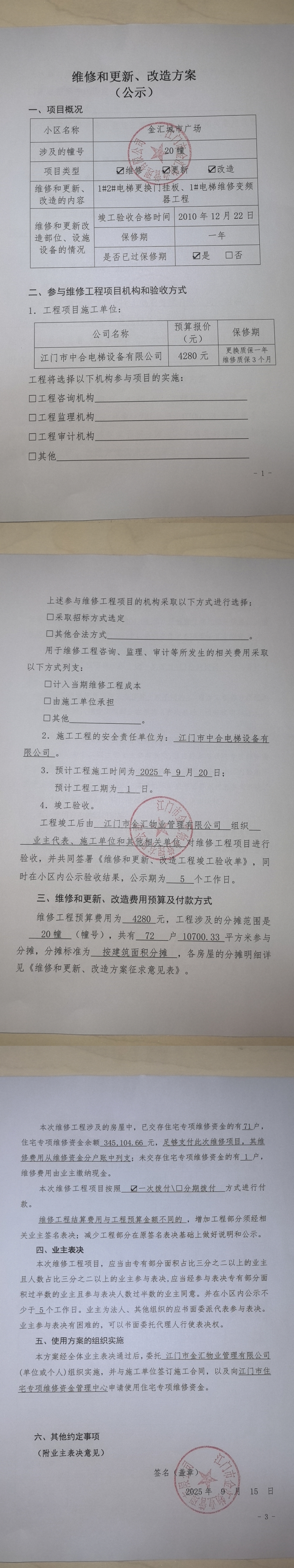 <td VALIGN="top" VALUES="" STYLE="border-width:0" BINDTYPE="0" ROWSPAN="19" COLSPAN="7" DATASOURCE="投票结果" ><font style="font-size:14pt;"><p style="white-space: normal; font-family: 宋体; line-height: 1.75em;">金汇城市广场蓬江区金汇城市广场20幢全体业主:</p><p style="white-space: normal; font-family: 宋体; line-height: 1.75em; text-indent: 2em;">本小区关于金汇城市广场20幢1#2#更换门挂板、1#电梯维修变频器工程维修资金的投票的投票已表决结束,询异时间从2025年11月19日开始,投票询异公示期间,业主可通过微信查询自己的表决情况或可凭身份证件申请查询自己的表决情况;如公示的业主表决情况与查询的本人表决意见不一致的,可以以书面形式向投票组织机构申诉,投票组织机构予以纠正并重新公示表决结果。异议提出人对投票组织机构的处理仍有异议的,可以向街道办事处(镇人民政府)反映处理,涉及住宅专项维修资金的,可向属地住宅专项维修资金管理中心反映处理。</p><p style="white-space: normal;"><br/></p><p style="white-space: normal; font-family: 宋体; line-height: 1.75em;"><strong>附件:</strong></p><p style="white-space: normal; font-family: 宋体; line-height: 1.75em;"><strong>一、投票范围</strong></p><p style="white-space: normal; font-family: 宋体; line-height: 1.75em; text-indent: 2em;">金汇城市广场蓬江区金汇城市广场20幢</p><p style="white-space: normal; font-family: 宋体; line-height: 1.75em; text-indent: 2em;">总人数(专有部分人数之和):72</p><p style="white-space: normal; font-family: 宋体; line-height: 1.75em; text-indent: 2em;"><span style="font-family: 宋体, SimSun;"><span style="font-family: 宋体; text-indent: 32px;"><span style="font-family: 宋体; text-indent: 32px;">总户数:72</span></span></span></p><p style="white-space: normal; font-family: 宋体; line-height: 1.75em; text-indent: 2em;">建筑物总面积(专有部分面积之和):10700.33㎡</p><p style="white-space: normal; font-family: 宋体; line-height: 1.75em;"><strong>二、询异公示起止时间</strong></p><p dir="ltr" style="white-space: normal; font-family: 宋体; line-height: 1.75em; text-indent: 2em;"><span style="text-indent: 36px;">2025年11月19日至2025年11月29日</span></p><p style="white-space: normal; font-family: 宋体; line-height: 1.75em;"><strong>三、投票详细描述</strong></p><p style="white-space: normal; font-family: 宋体; line-height: 1.75em; text-indent: 2em;"><p><span style="font-family: "Helvetica Neue", Helvetica, Arial, sans-serif; font-size: 14px; background-color: rgb(255, 255, 255);">金汇城市广场20幢1#2#电梯突然出现故障,经检查,由</span><span style="font-family: "Helvetica Neue", Helvetica, Arial, sans-serif; font-size: 14px; background-color: rgb(255, 255, 255);">于1#2#电梯门挂板、变频器的</span><span style="font-family: "Helvetica Neue", Helvetica, Arial, sans-serif; font-size: 14px; background-color: rgb(255, 255, 255);">原件出现老化而不能正常运行。</span></p><p><span style="font-family: "Helvetica Neue", Helvetica, Arial, sans-serif; font-size: 14px; background-color: rgb(255, 255, 255);">现对</span><span style="font-family: "Helvetica Neue", Helvetica, Arial, sans-serif; font-size: 14px; background-color: rgb(255, 255, 255);">20幢1#2#电梯</span><span style="font-family: "Helvetica Neue", Helvetica, Arial, sans-serif; font-size: 14px; background-color: rgb(255, 255, 255);">相关设备进行更换,工程维修预算金额为4280元,项目最终费用以施工合同签订金额为准。</span></p><p><span style="font-family: "Helvetica Neue", Helvetica, Arial, sans-serif; font-size: 14px; background-color: rgb(255, 255, 255);">因已过保修期,维修费用由相关业主按建筑面积分摊,每平方约0.4元,详见公示附件。 如业主手机不能正常通过微信投票,请联系物业公司进行线下纸质投票,物业电话:0750-3929003。</span></p></p><p style="white-space: normal; font-family: 宋体; line-height: 1.75em;"><strong>四、计票规则</strong></p><p style="white-space: normal; font-family: 宋体; line-height: 1.75em; text-indent: 2em;">表决事项:使用建筑物及其附属设施的维修资金<br /><p style='text-align: left; font-family: 宋体; font-size: 16px; line-height: 1.75em; text-indent: 2em;'>计票规则:弃权票不并入其它项 未表决票不并入其它项</p></p><p style="white-space: normal; font-family: 宋体; line-height: 1.75em;"><strong>五、通过规则</strong></p><p style="white-space: normal; font-family: 宋体; line-height: 1.75em;"><strong><strong style="white-space: normal;"><span style="font-family: 宋体, SimSun;"> 根据《中华人民共和国民法典》第二百七十八条规定:业主共同决定事项,应当由专有部分面积占比三分之二以上的业主且人数占比三分之二以上的业主参与表决。</span></strong></strong></p><p style="white-space: normal; font-family: 宋体; line-height: 1.75em; text-indent: 2em;">表决事项:使用建筑物及其附属设施的维修资金<br /><p style='text-align: left; font-family: 宋体; font-size: 16px; line-height: 1.75em; text-indent: 2em;'>通过规则:双2/3以上参与表决,参与表决双过半同意</p></p><p style="white-space: normal; font-family: 宋体; line-height: 1.75em;"><strong>六、投票结果</strong></p><p style="white-space: normal; font-family: 宋体; line-height: 1.75em; text-indent: 2em;"><div id='resultTable'><table style='table-layout: fixed; font-size:12px; margin-top:10px' width='100%' border='0' cellspacing='0' cellpadding='0'><tr><td height='28' colspan='10' align='center' style='border: 1px solid #666'><strong style='font-size: 14px;'> 使用建筑物及其附属设施的维修资金</strong></td> </tr><tr id='trfirst'><td height='28' colspan='4' style='border-left: 1px solid #666; border-bottom: 1px