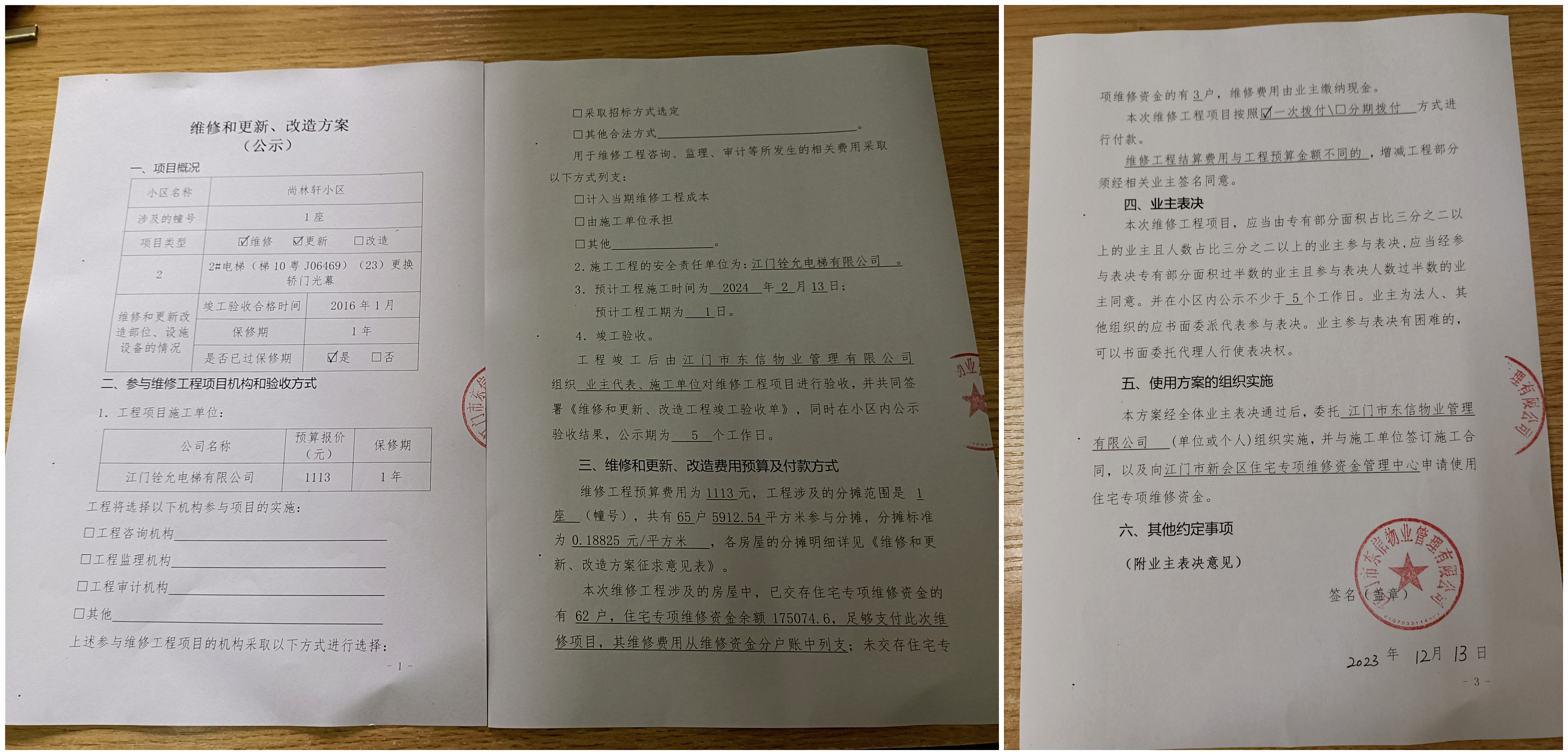 <td valign="top" values="" style="border-width:0" bindtype="0" rowspan="17" colspan="7" datasource="投票结果"><font style=" font-family:方正小标宋简体;font-size:14pt;"><p style="line-height: 1.75em;"><span style="font-family: 宋体, SimSun;">各位尊敬的业主:</span><br></p><p style="text-indent: 2em; line-height: 1.75em;"><span style="font-family: 宋体, SimSun;">根据法律法规的规定,本小区业主利用“江门市物业事项表决管理系统”已对本小区公共事务决策事项进行了表决,在经过7日的询异公示期后,未收到业主有效的异议。现将投票结果公告,并就产生的法律效力说明如下:</span></p><p style="line-height: 1.75em; text-indent: 0em;"><strong style="text-indent: 2em;"><span style="font-family: 宋体, SimSun;">一、投票范围</span></strong></p><p style="text-indent: 2em; line-height: 1.75em;"><span style="font-family: 宋体, SimSun;">尚林轩小区尚林轩1座</span></p><p style="text-indent: 2em; line-height: 1.75em;"><span style="font-family: 宋体, SimSun;">总人数(专有部分人数之和):65</span></p><p style="text-indent: 2em; line-height: 1.75em;"><span style="font-family: 宋体, SimSun;"><span style="font-family: 宋体, SimSun; text-indent: 32px;"><span style="font-family: 宋体; text-indent: 32px;"><span style="font-family: 宋体; text-indent: 32px;">总户数:65</span></span></span></span></p><p style="text-indent: 2em; line-height: 1.75em;"><span style="font-family: 宋体, SimSun;">建筑物总面积(专有部分面积之和):5912.54㎡</span></p><p style="line-height: 1.75em;"><strong><span style="font-family: 宋体, SimSun;">二、投票结果公告时间</span></strong></p><p style="text-indent: 2em; line-height: 1.75em;"><span style="font-family: 宋体, SimSun;">从2023年12月28日开始</span></p><p style="line-height: 1.75em;"><strong><span style="font-family: 宋体, SimSun;">三、计票规则</span></strong></p><p style="text-indent: 2em; line-height: 1.75em;"><span style="font-family: 宋体, SimSun;">表决事项:使用建筑物及其附属设施的维修资金<br></span></p><p style="font-family: 宋体, SimSun;line-height: 1.75em; text-indent: 2em;">计票规则:弃权票不并入其它项 未表决票不并入其它项</p><p></p><p style="line-height: 1.75em;"><strong><span style="font-family: 宋体, SimSun;">四、通过规则</span></strong></p><p style="line-height: 1.75em;"><strong><span style="font-family: 宋体, SimSun;"> 根据《中华人民共和国民法典》第二百七十八条规定:业主共同决定事项,应当由专有部分面积占比三分之二以上的业主且人数占比三分之二以上的业主参与表决。</span></strong></p><p style="text-indent: 2em; line-height: 1.75em;"><span style="font-family: 宋体, SimSun;"><span style="font-family: 宋体, SimSun; text-indent: 32px;">表决事项:使用建筑物及其附属设施的维修资金<br></span></span></p><p style="font-family: 宋体, SimSun;line-height: 1.75em; text-indent: 2em;">通过规则:参与表决专有部分面积过半数的业主且参与表决人数过半数的业主同意</p><p></p><p style="line-height: 1.75em;"><strong><span style="font-family: 宋体, SimSun;">五、投票结果</span></strong></p><p style="line-height: 1.75em; text-indent: 2em;"><span style="font-family: 宋体, SimSun; text-indent: 2em;"></span></p><div id="resultTable"><table style="table-layout: fixed; font-size:12px; margin-top:10px" width="100%" border="0" cellspacing="0" cellpadding="0"><tbody><tr><td height="28" colspan="10" align="center" style="border: 1px solid #666"><strong style="font-size: 14px;"> 使用建筑物及其附属设施的维修资金</strong></td> </tr><tr id="trfirst"><td height="28" colspan="4" style="border-left: 1px solid #666; border-bottom: 1px solid #666"><strong> 申报单位:</strong> 江门市东信物业管理有限公司</td><td colspan="3" style="border-left: 1px solid #666; border-bottom: 1px solid #666"><strong> 联系方式:</strong> 0750-6683199 </td><td colspan="3" style="border-left: 1px solid #666; border-bottom: 1px solid #666; border-right: 1px solid #666"><strong> 申报日期:</strong> 2023年12月14日 </td></tr><tr> <td height="28" colspan="5" style="border-left: 1px solid #666; border-bottom: 1px solid #666"><strong> 总人数(专有部分人数之和):</strong>65人 </td><td colspan="5" style="border-left: 1px solid #666; border-bottom: 1px solid #666; border-right: 1px solid #666"><strong> 建筑物总面积(专有部分面积之和):</strong>5912.54㎡ </td> </tr><tr><td height="28" colspan="10" bgcolor="#F3F3F3" style="border-left: 1px solid #666;border-bottom: 1px solid #666;border-right: 1px solid #666"><strong> 参与人数及面积统计</strong></td></tr><tr><td height="28" colspan="5" style="border-left: 1px solid #666; border-bottom: 1px solid #666"><strong> 参与表决专有部分人数之和:</strong>46人</td><td colspan="5" style="border-left: 1px solid #666; border-bottom: 1px solid #666; border-right: 1px solid #666"><strong> 参与表决占有表决权总人数比例:</strong>70.77%</td></tr><tr><td height="28" colspan="5" style="border-left: 1px solid #666; border-bottom: 1px solid #666"><strong> 参与表决专有部分面积之和:</strong>4184.76㎡</td><td colspan="5" style="border-left: 1px solid #666; border-bottom: 1px solid #666; border-right: 1px solid #666"><strong> 参与表决占有表决权总面积比例:</strong>70.78%</td></tr><tr><td height="28" colspan="10" bgcolor="#F3F3F3" style="border-left: 1px solid #666; border-bottom: 1px solid #666;border-right: 1px solid #666"> <strong> 未参与人数及面积统计</strong></td> </tr><tr><td height="28" colspan="5" style="border-left: 1px solid #666; border-bottom: 1px solid #666"><strong> 未参与表决专有部分人数之和:</strong>19人 </td><td colspan="5" style="border-left: 1px solid #666; border-bottom: 1px solid #666; border-right: 1px solid #666"