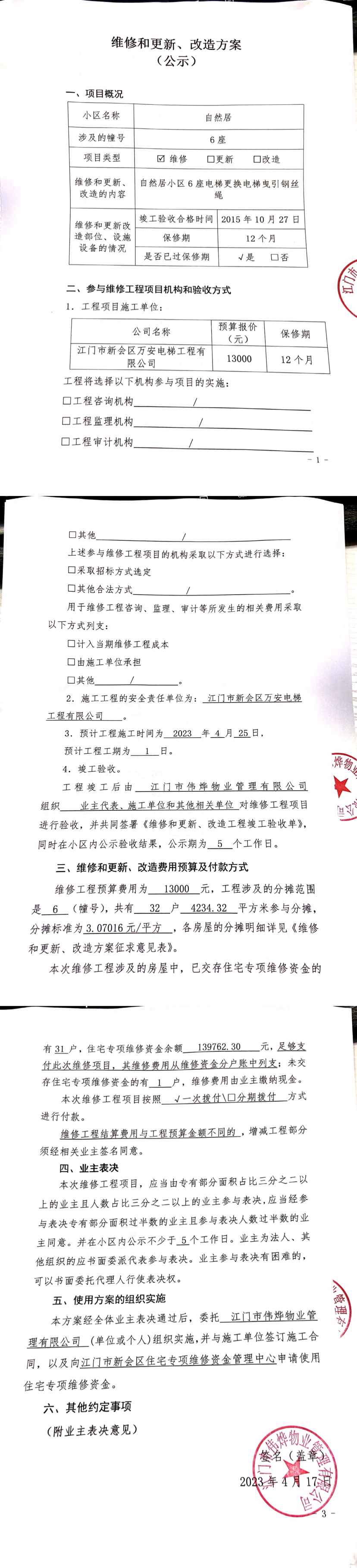 <td valign="top" values="" style="border-width:0" bindtype="0" rowspan="17" colspan="7" datasource="投票结果"><font style=" font-family:方正小标宋简体;font-size:14pt;"><p style="line-height: 1.75em;"><span style="font-family: 宋体, SimSun;">各位尊敬的业主:</span><br></p><p style="text-indent: 2em; line-height: 1.75em;"><span style="font-family: 宋体, SimSun;">根据法律法规的规定,本小区业主利用“物业公共事务决策系统”已对本小区公共事务决策事项进行了表决,在经过7日的询异公示期后,未收到业主有效的异议。现将投票结果公告,并就产生的法律效力说明如下:</span></p><p style="line-height: 1.75em; text-indent: 0em;"><strong style="text-indent: 2em;"><span style="font-family: 宋体, SimSun;">一、投票范围</span></strong></p><p style="text-indent: 2em; line-height: 1.75em;"><span style="font-family: 宋体, SimSun;">自然居自然居6座</span></p><p style="text-indent: 2em; line-height: 1.75em;"><span style="font-family: 宋体, SimSun;">总人数(专有部分人数之和):32</span></p><p style="text-indent: 2em; line-height: 1.75em;"><span style="font-family: 宋体, SimSun;"><span style="font-family: 宋体, SimSun; text-indent: 32px;">总户数:32</span></span></p><p style="text-indent: 2em; line-height: 1.75em;"><span style="font-family: 宋体, SimSun;">建筑物总面积(专有部分面积之和):4234.32㎡</span></p><p style="line-height: 1.75em;"><strong><span style="font-family: 宋体, SimSun;">二、投票起止时间</span></strong></p><p style="text-indent: 2em; line-height: 1.75em;"><span style="font-family: 宋体, SimSun;">投票表决时间:从2023年04月18日到2023年04月20日止</span></p><p style="text-indent: 2em; line-height: 1.75em;"><span style="font-family: 宋体, SimSun;">投票询异公示时间:从2023年04月21日开始</span></p><p style="text-indent: 2em; line-height: 1.75em;"><span style="font-family: 宋体, SimSun;">投票结果通知公告时间:从2023年04月28日开始</span></p><p style="line-height: 1.75em;"><strong><span style="font-family: 宋体, SimSun;">三、计票规则</span></strong></p><p style="text-indent: 2em; line-height: 1.75em;"><span style="font-family: 宋体, SimSun;">表决事项:使用建筑物及其附属设施的维修资金<br></span></p><p style="font-family: 宋体, SimSun;line-height: 1.75em; text-indent: 2em;">计票规则:弃权票不并入其它项 未表决票不并入其它项</p><p></p><p style="line-height: 1.75em;"><strong><span style="font-family: 宋体, SimSun;">四、通过规则</span></strong></p><p style="text-indent: 2em; line-height: 1.75em;"><span style="font-family: 宋体, SimSun;"><span style="font-family: 宋体, SimSun; text-indent: 32px;">表决事项:使用建筑物及其附属设施的维修资金<br></span></span></p><p style="font-family: 宋体, SimSun;line-height: 1.75em; text-indent: 2em;">通过规则:参与表决专有部分面积过半数的业主且参与表决人数过半数的业主同意</p><p></p><p style="line-height: 1.75em;"><strong><span style="font-family: 宋体, SimSun;">五、投票结果</span></strong></p><p style="line-height: 1.75em; text-indent: 2em;"><span style="font-family: 宋体, SimSun; text-indent: 2em;"></span></p><div id="resultTable"><table style="table-layout: fixed; font-size:12px; margin-top:10px" width="100%" border="0" cellspacing="0" cellpadding="0"><tbody><tr><td height="28" colspan="10" align="center" style="border: 1px solid #666"><strong style="font-size: 14px;"> 使用建筑物及其附属设施的维修资金</strong></td> </tr><tr id="trfirst"><td height="28" colspan="4" style="border-left: 1px solid #666; border-bottom: 1px solid #666"><strong> 申报单位:</strong> 江门市伟烨物业管理有限公司</td><td colspan="3" style="border-left: 1px solid #666; border-bottom: 1px solid #666"><strong> 联系方式:</strong> 0750-6123828 </td><td colspan="3" style="border-left: 1px solid #666; border-bottom: 1px solid #666; border-right: 1px solid #666"><strong> 申报日期:</strong> 2023年4月17日 </td></tr><tr> <td height="28" colspan="5" style="border-left: 1px solid #666; border-bottom: 1px solid #666"><strong> 总人数(专有部分人数之和):</strong>32人 </td><td colspan="5" style="border-left: 1px solid #666; border-bottom: 1px solid #666; border-right: 1px solid #666"><strong> 建筑物总面积(专有部分面积之和):</strong>4234.32㎡ </td> </tr><tr><td height="28" colspan="10" bgcolor="#F3F3F3" style="border-left: 1px solid #666;border-bottom: 1px solid #666;border-right: 1px solid #666"><strong> 参与人数及面积统计</strong></td></tr><tr><td height="28" colspan="5" style="border-left: 1px solid #666; border-bottom: 1px solid #666"><strong> 参与表决专有部分人数之和:</strong>23人</td><td colspan="5" style="border-left: 1px solid #666; border-bottom: 1px solid #666; border-right: 1px solid #666"><strong> 参与表决占有表决权总人数比例:</strong>71.88%</td></tr><tr><td height="28" colspan="5" style="border-left: 1px solid #666; border-bottom: 1px solid #666"><strong> 参与表决专有部分面积之和:</strong>3019.13㎡</td><td colspan="5" style="border-left: 1px solid #666; border-bottom: 1px solid #666; border-right: 1px solid #666"><strong> 参与表决占有表决权总面积比例:</strong>71.30%</td></tr><tr><td height="28" colspan="10" bgcolor="#F3F3F3" style="border-left: 1px solid #666; border-bottom: 1px solid #666;border-right: 1px solid #666"> <strong> 未参与人数及面积统计</strong></td> </tr><tr><td height="28" colspan="5" style="border-left: 1px solid #666; border-bottom: 1px solid #666"><strong> 未参与表决专有部分人数之和:</strong>9人 </td><td colspan="5" style="border-left: 1px solid #666; border-bottom: 1px solid #666; border-right: 1px solid #666"><strong> 未参与表决占有表决权总人数比例:</strong>28.13%</td></tr><tr><td height="28" colspan=
