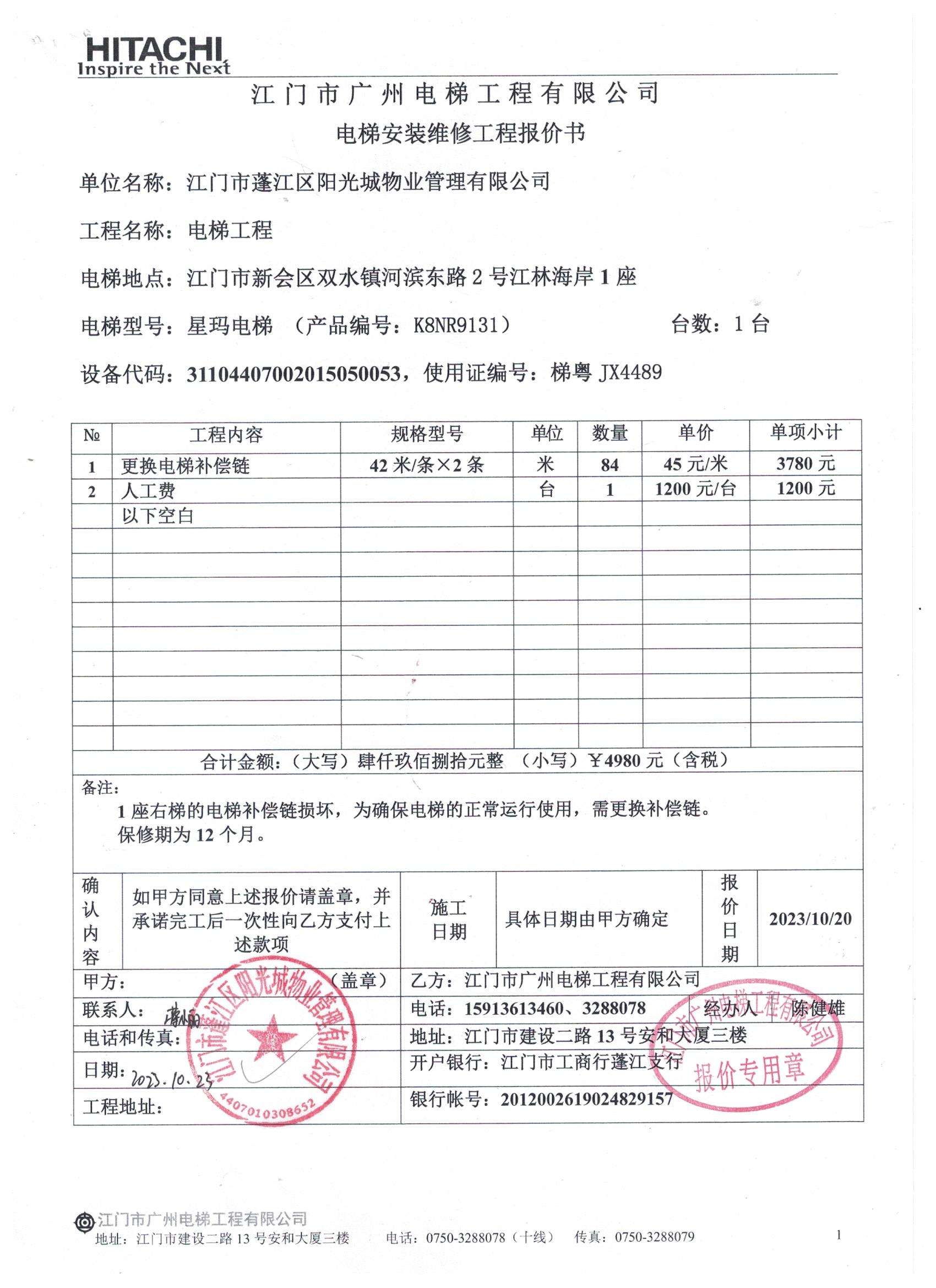 <td VALIGN="top" VALUES="" STYLE="border-width:0" BINDTYPE="0" ROWSPAN="19" COLSPAN="7" DATASOURCE="投票结果" ><font style="font-size:14pt;"><p style="white-space: normal; font-family: 宋体; line-height: 1.75em;">江林海岸江林海岸1座全体业主:</p><p style="white-space: normal; font-family: 宋体; line-height: 1.75em; text-indent: 2em;">本小区关于江林海岸1座电梯(梯粤JX4489)更换补偿链使用维修资金的投票的投票已表决结束,询异时间从2023年11月15日开始,投票询异公示期间,业主可通过微信查询自己的表决情况或可凭身份证件申请查询自己的表决情况;如公示的业主表决情况与查询的本人表决意见不一致的,可以以书面形式向投票组织机构申诉,投票组织机构予以纠正并重新公示表决结果。异议提出人对投票组织机构的处理仍有异议的,可以向街道办事处(镇人民政府)反映处理,涉及住宅专项维修资金的,可向属地住宅专项维修资金管理中心反映处理。</p><p style="white-space: normal;"><br/></p><p style="white-space: normal; font-family: 宋体; line-height: 1.75em;"><strong>附件:</strong></p><p style="white-space: normal; font-family: 宋体; line-height: 1.75em;"><strong>一、投票范围</strong></p><p style="white-space: normal; font-family: 宋体; line-height: 1.75em; text-indent: 2em;">江林海岸江林海岸1座</p><p style="white-space: normal; font-family: 宋体; line-height: 1.75em; text-indent: 2em;">总人数(专有部分人数之和):40</p><p style="white-space: normal; font-family: 宋体; line-height: 1.75em; text-indent: 2em;"><span style="font-family: 宋体, SimSun;">总户数:40</span></p><p style="white-space: normal; font-family: 宋体; line-height: 1.75em; text-indent: 2em;">建筑物总面积(专有部分面积之和):4110.20㎡</p><p style="white-space: normal; font-family: 宋体; line-height: 1.75em;"><strong>二、询异公示起止时间</strong></p><p dir="ltr" style="white-space: normal; font-family: 宋体; line-height: 1.75em; text-indent: 2em;"><span style="text-indent: 36px;">2023年11月15日至2023年11月21日</span></p><p style="white-space: normal; font-family: 宋体; line-height: 1.75em;"><strong>三、投票详细描述</strong></p><p style="white-space: normal; font-family: 宋体; line-height: 1.75em; text-indent: 2em;"><p><span style="text-wrap: wrap;">本小区1座的电梯运行时出异响晃动,经检查,是由于</span><span style="text-wrap: wrap;">电梯补偿链磨损严重</span><span style="text-wrap: wrap;">运行时卡链,已过保修期。现需申请使用维修资金对1座电梯进行更换补偿链,工程维修预算金额为 4980元,项目最终费用以施工合同签订金额为准。维修费用的分摊标准为 每平方米约 1.21 元 ,详见公示附件。如业主手机不能正常通过微信投票,请联系物业公司进行线下纸质投票,物业公司联系电话:0750-6412233</span></p></p><p style="white-space: normal; font-family: 宋体; line-height: 1.75em;"><strong>四、计票规则</strong></p><p style="white-space: normal; font-family: 宋体; line-height: 1.75em; text-indent: 2em;">表决事项:使用建筑物及其附属设施的维修资金<br /><p style='text-align: left; font-family: 宋体; font-size: 16px; line-height: 1.75em; text-indent: 2em;'>计票规则:弃权票不并入其它项 未表决票不并入其它项</p></p><p style="white-space: normal; font-family: 宋体; line-height: 1.75em;"><strong>五、通过规则</strong></p><p style="white-space: normal; font-family: 宋体; line-height: 1.75em;"><strong><strong style="white-space: normal;"><span style="font-family: 宋体, SimSun;">&nbsp; 根据《中华人民共和国民法典》第二百七十八条规定:业主共同决定事项,应当由专有部分面积占比三分之二以上的业主且人数占比三分之二以上的业主参与表决。</span></strong></strong></p><p style="white-space: normal; font-family: 宋体; line-height: 1.75em; text-indent: 2em;">表决事项:使用建筑物及其附属设施的维修资金<br /><p style='text-align: left; font-family: 宋体; font-size: 16px; line-height: 1.75em; text-indent: 2em;'>通过规则:参与表决专有部分面积过半数的业主且参与表决人数过半数的业主同意</p></p><p style="white-space: normal; font-family: 宋体; line-height: 1.75em;"><strong>六、投票结果</strong></p><p style="white-space: normal; font-family: 宋体; line-height: 1.75em; text-indent: 2em;"><div id='resultTable'><table style='table-layout: fixed; font-size:12px; margin-top:10px' width='100%' border='0' cellspacing='0' cellpadding='0'><tr><td height='28' colspan='10' align='center' style='border: 1px solid #666'><strong style='font-size: 14px;'> 使用建筑物及其附属设施的维修资金</strong></td> </tr><tr id='trfirst'><td height='28' colspan='4' style='border-left: 1px solid #666; border-bottom: 1px solid #666'><strong> 申报单位:</strong> 江门市蓬江区阳光城物业管理有限公司</td><td colspan='3' style='border-left: 1px solid #666; border-bottom: 1px solid #666'><strong> 联系方式:</strong> 3332898 </td><td colspan='3' style='border-left: 1px solid #666; border-bottom: 1px solid #666; border-right: 1px solid #666'><strong> 申报日期:</strong> 2023年11月9日 </td></tr><tr> <td height='28' colspan='5' style='border-left: 1px solid #666; border-bottom: 1px solid #666'><strong> 总人数(专有部分人数之和):</strong>40人 </td><td colspan='5' style='border-left: 1px solid #666; border-bottom: 1px solid #666; border-right: 1px solid #666'><strong> 建筑物总面积(专有部分面积之和):</strong>4110.20㎡ </td> </tr><tr><td height='28' colspan='10' bgcolor='#F3F3F3' style='border-left: 1px solid #666;border-bottom: 1px solid #666;border-right: 1px solid #666'><strong> 参与人数及面积统计</strong></td></tr><tr><td height='28' colspan='5' style='border-left