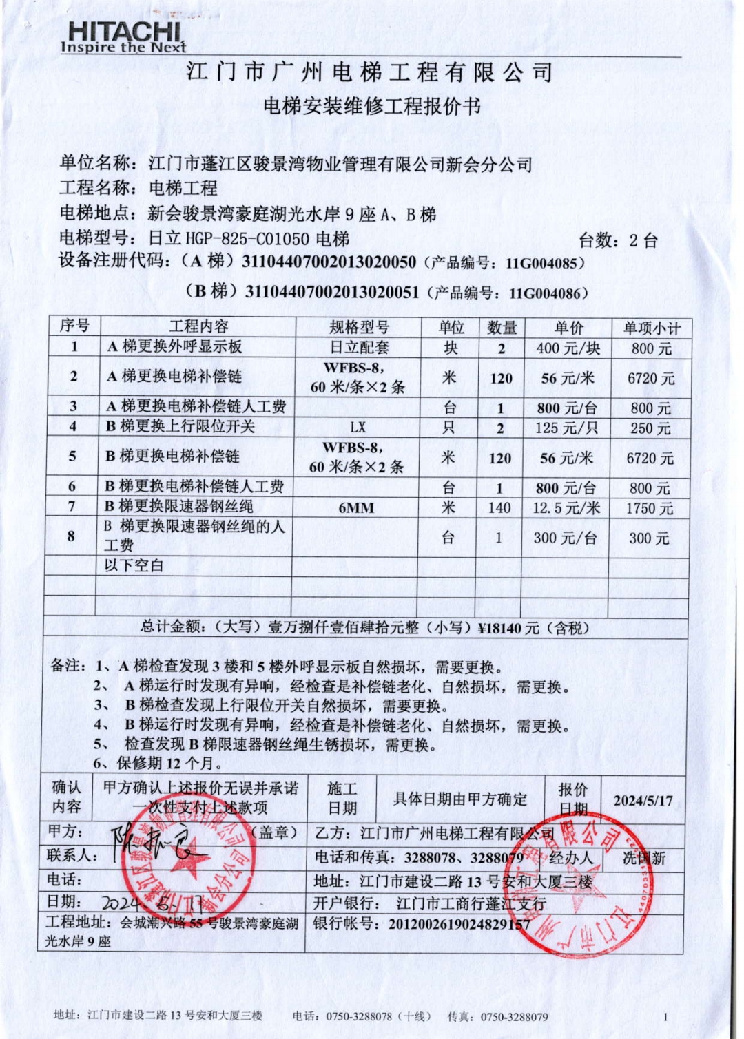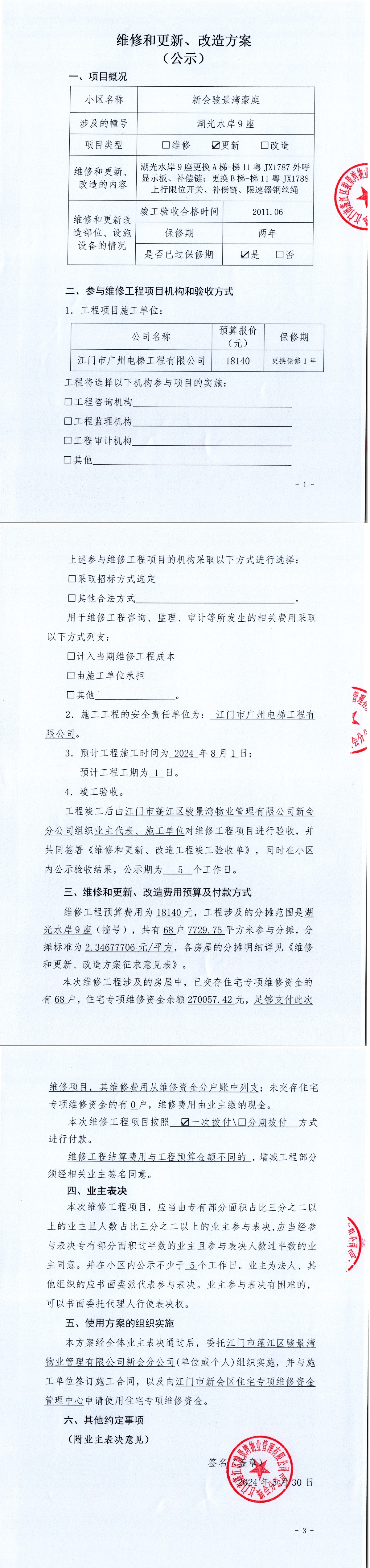 <td VALIGN="top" VALUES="" STYLE="border-width:0" BINDTYPE="0" ROWSPAN="19" COLSPAN="7" DATASOURCE="投票结果" ><font style="font-size:14pt;"><p style="white-space: normal; font-family: 宋体; line-height: 1.75em;">新会骏景湾豪庭湖光水岸9座全体业主:</p><p style="white-space: normal; font-family: 宋体; line-height: 1.75em; text-indent: 2em;">本小区关于新会骏景湾豪庭湖光水岸9座A梯更换外呼显示板、补偿链;B梯更换上行限位开关、补偿链、限速器钢丝绳使用维修资金的投票的投票已表决结束,询异时间从2024年06月18日开始,投票询异公示期间,业主可通过微信查询自己的表决情况或可凭身份证件申请查询自己的表决情况;如公示的业主表决情况与查询的本人表决意见不一致的,可以以书面形式向投票组织机构申诉,投票组织机构予以纠正并重新公示表决结果。异议提出人对投票组织机构的处理仍有异议的,可以向街道办事处(镇人民政府)反映处理,涉及住宅专项维修资金的,可向属地住宅专项维修资金管理中心反映处理。</p><p style="white-space: normal;"><br/></p><p style="white-space: normal; font-family: 宋体; line-height: 1.75em;"><strong>附件:</strong></p><p style="white-space: normal; font-family: 宋体; line-height: 1.75em;"><strong>一、投票范围</strong></p><p style="white-space: normal; font-family: 宋体; line-height: 1.75em; text-indent: 2em;">新会骏景湾豪庭湖光水岸9座</p><p style="white-space: normal; font-family: 宋体; line-height: 1.75em; text-indent: 2em;">总人数(专有部分人数之和):68</p><p style="white-space: normal; font-family: 宋体; line-height: 1.75em; text-indent: 2em;"><span style="font-family: 宋体, SimSun;"><span style="font-family: 宋体; text-indent: 32px;"><span style="font-family: 宋体; text-indent: 32px;">总户数:68</span></span></span></p><p style="white-space: normal; font-family: 宋体; line-height: 1.75em; text-indent: 2em;">建筑物总面积(专有部分面积之和):7729.75㎡</p><p style="white-space: normal; font-family: 宋体; line-height: 1.75em;"><strong>二、询异公示起止时间</strong></p><p dir="ltr" style="white-space: normal; font-family: 宋体; line-height: 1.75em; text-indent: 2em;"><span style="text-indent: 36px;">2024年06月18日至2024年06月24日</span></p><p style="white-space: normal; font-family: 宋体; line-height: 1.75em;"><strong>三、投票详细描述</strong></p><p style="white-space: normal; font-family: 宋体; line-height: 1.75em; text-indent: 2em;"><p> 新会骏景湾豪庭湖光水岸9座的A梯运行时发现异响,经检查,是由于A梯补偿链老化,自然损坏,为确保电梯安全运行,需更换。保养发现A梯3楼、5楼外呼显示板自然损坏,需更换。B梯运行时发现异响,经检查,是由于B梯补偿链老化,自然损坏,上行限位开关自然损坏、限速器钢丝绳生锈损坏,为确保电梯安全运行,需更换。</p><p> 现对湖光水岸9座AB梯进行维修,工程维修预算金额为18140元,项目最终费用以施工合同签订金额为准。因已过保修期,维修费用由相关业主按建筑面积分摊,每平方约2.34677706元,详见公示附件。如业主手机不能正常通过微信投票,请联系物业公司进行线下纸质投票,物业电话:0750-6179992</p><p><br/></p></p><p style="white-space: normal; font-family: 宋体; line-height: 1.75em;"><strong>四、计票规则</strong></p><p style="white-space: normal; font-family: 宋体; line-height: 1.75em; text-indent: 2em;">表决事项:使用建筑物及其附属设施的维修资金<br /><p style='text-align: left; font-family: 宋体; font-size: 16px; line-height: 1.75em; text-indent: 2em;'>计票规则:弃权票不并入其它项 未表决票不并入其它项</p></p><p style="white-space: normal; font-family: 宋体; line-height: 1.75em;"><strong>五、通过规则</strong></p><p style="white-space: normal; font-family: 宋体; line-height: 1.75em;"><strong><strong style="white-space: normal;"><span style="font-family: 宋体, SimSun;"> 根据《中华人民共和国民法典》第二百七十八条规定:业主共同决定事项,应当由专有部分面积占比三分之二以上的业主且人数占比三分之二以上的业主参与表决。</span></strong></strong></p><p style="white-space: normal; font-family: 宋体; line-height: 1.75em; text-indent: 2em;">表决事项:使用建筑物及其附属设施的维修资金<br /><p style='text-align: left; font-family: 宋体; font-size: 16px; line-height: 1.75em; text-indent: 2em;'>通过规则:双2/3以上参与表决,参与表决双过半同意</p></p><p style="white-space: normal; font-family: 宋体; line-height: 1.75em;"><strong>六、投票结果</strong></p><p style="white-space: normal; font-family: 宋体; line-height: 1.75em; text-indent: 2em;"><div id='resultTable'><table style='table-layout: fixed; font-size:12px; margin-top:10px' width='100%' border='0' cellspacing='0' cellpadding='0'><tr><td height='28' colspan='10' align='center' style='border: 1px solid #666'><strong style='font-size: 14px;'> 使用建筑物及其附属设施的维修资金</strong></td> </tr><tr id='trfirst'><td height='28' colspan='4' style='border-left: 1px solid #666; border-bottom: 1px solid #666'><strong> 申报单位:</strong> 江门市蓬江区骏景湾物业管理有限公司新会分公司</td><td colspan='3' style='border-left: 1px solid #666; border-bottom: 1px solid #666'><strong> 联系方式:</strong> </td><td colspan='3' style='border-left: 1px solid #666; border-bottom: 1px solid #666; border-right: 1px solid #666'><strong> 申报日期:</strong> 2024年5月30日 </td></tr><tr> <td height='28' colspan='5' style='border-left: 1px solid #666; border-bottom: 1px solid #666'><strong> 总人数(专有部分人数之和):</strong>68人 </td><td colspan='5' style='border-left: 1px solid #666; border-bottom: 1px solid 