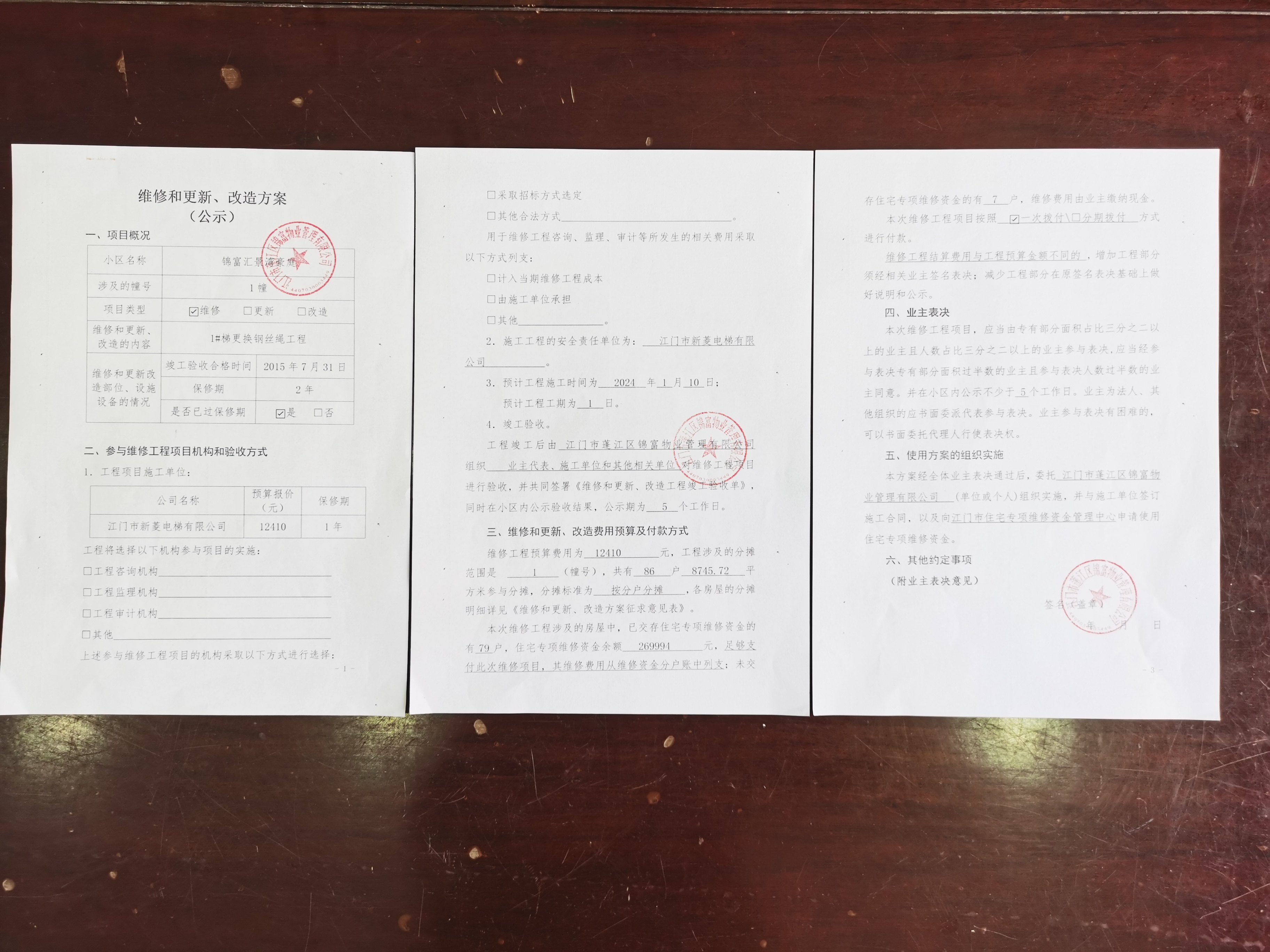 <td VALIGN="top" VALUES="" STYLE="border-width:0" BINDTYPE="0" ROWSPAN="19" COLSPAN="7" DATASOURCE="投票结果" ><font style="font-size:14pt;"><p style="white-space: normal; font-family: 宋体; line-height: 1.75em;">蓬江区锦富汇景湾豪庭蓬江区棠下镇锦富汇景湾豪庭1幢全体业主:</p><p style="white-space: normal; font-family: 宋体; line-height: 1.75em; text-indent: 2em;">本小区关于锦富汇景湾豪庭1幢01电梯更换曳引钢丝绳的投票的投票已表决结束,询异时间从2024年01月16日开始,投票询异公示期间,业主可通过微信查询自己的表决情况或可凭身份证件申请查询自己的表决情况;如公示的业主表决情况与查询的本人表决意见不一致的,可以以书面形式向投票组织机构申诉,投票组织机构予以纠正并重新公示表决结果。异议提出人对投票组织机构的处理仍有异议的,可以向街道办事处(镇人民政府)反映处理,涉及住宅专项维修资金的,可向属地住宅专项维修资金管理中心反映处理。</p><p style="white-space: normal;"><br/></p><p style="white-space: normal; font-family: 宋体; line-height: 1.75em;"><strong>附件:</strong></p><p style="white-space: normal; font-family: 宋体; line-height: 1.75em;"><strong>一、投票范围</strong></p><p style="white-space: normal; font-family: 宋体; line-height: 1.75em; text-indent: 2em;">蓬江区锦富汇景湾豪庭蓬江区棠下镇锦富汇景湾豪庭1幢</p><p style="white-space: normal; font-family: 宋体; line-height: 1.75em; text-indent: 2em;">总人数(专有部分人数之和):85</p><p style="white-space: normal; font-family: 宋体; line-height: 1.75em; text-indent: 2em;"><span style="font-family: 宋体, SimSun;"><span style="font-family: 宋体; text-indent: 32px;"><span style="font-family: 宋体; text-indent: 32px;">总户数:87</span></span></span></p><p style="white-space: normal; font-family: 宋体; line-height: 1.75em; text-indent: 2em;">建筑物总面积(专有部分面积之和):8745.72㎡</p><p style="white-space: normal; font-family: 宋体; line-height: 1.75em;"><strong>二、询异公示起止时间</strong></p><p dir="ltr" style="white-space: normal; font-family: 宋体; line-height: 1.75em; text-indent: 2em;"><span style="text-indent: 36px;">2024年01月16日至2024年01月22日</span></p><p style="white-space: normal; font-family: 宋体; line-height: 1.75em;"><strong>三、投票详细描述</strong></p><p style="white-space: normal; font-family: 宋体; line-height: 1.75em; text-indent: 2em;"><p style="margin-top: 0px; margin-bottom: 0px; padding: 0px; font-family: 宋体; white-space: normal; background-color: rgb(255, 255, 255);">本小区锦富汇景湾豪庭1幢01电梯运行时出现异常,经检查,是由于曳引钢丝绳生锈,磨损严重。</p><p style="margin-top: 0px; margin-bottom: 0px; padding: 0px; font-family: 宋体; white-space: normal; background-color: rgb(255, 255, 255);">因已过保修期。现需申请使用维修资金对<span style="font-family: 宋体; background-color: rgb(255, 255, 255);">锦富汇景湾豪庭1幢01电梯</span>更换曳引钢丝绳,工程维修预算金额为12410元,项目最终费用以施工合同签订金额为准。维修费用的分摊标准为按每户建筑面积分摊,详见公示附件。</p><p style="margin-top: 0px; margin-bottom: 0px; padding: 0px; font-family: 宋体; white-space: normal; background-color: rgb(255, 255, 255);">如业主手机不能正常通过微信投票,请联系物业公司进行线下纸质投票,物业公司联系电话:0750-3598316.</p><p><br/></p></p><p style="white-space: normal; font-family: 宋体; line-height: 1.75em;"><strong>四、计票规则</strong></p><p style="white-space: normal; font-family: 宋体; line-height: 1.75em; text-indent: 2em;">表决事项:锦富汇景湾豪庭1幢01电梯更换曳引钢丝绳的投票<br /><p style='text-align: left; font-family: 宋体; font-size: 16px; line-height: 1.75em; text-indent: 2em;'>计票规则:弃权票不并入其它项 未表决票不并入其它项</p></p><p style="white-space: normal; font-family: 宋体; line-height: 1.75em;"><strong>五、通过规则</strong></p><p style="white-space: normal; font-family: 宋体; line-height: 1.75em;"><strong><strong style="white-space: normal;"><span style="font-family: 宋体, SimSun;"> 根据《中华人民共和国民法典》第二百七十八条规定:业主共同决定事项,应当由专有部分面积占比三分之二以上的业主且人数占比三分之二以上的业主参与表决。</span></strong></strong></p><p style="white-space: normal; font-family: 宋体; line-height: 1.75em; text-indent: 2em;">表决事项:锦富汇景湾豪庭1幢01电梯更换曳引钢丝绳的投票<br /><p style='text-align: left; font-family: 宋体; font-size: 16px; line-height: 1.75em; text-indent: 2em;'>通过规则:参与表决专有部分面积过半数的业主且参与表决人数过半数的业主同意</p></p><p style="white-space: normal; font-family: 宋体; line-height: 1.75em;"><strong>六、投票结果</strong></p><p style="white-space: normal; font-family: 宋体; line-height: 1.75em; text-indent: 2em;"><div id='resultTable'><table style='table-layout: fixed; font-size:12px; margin-top:10px' width='100%' border='0' cellspacing='0' cellpadding='0'><tr><td height='28' colspan='10' align='center' style='border: 1px solid #666'><strong style='font-size: 14px;'> 锦富汇景湾豪庭1幢01电梯更换曳引钢丝绳的投票</strong></td> </tr><tr id='trfirst'><td height='28' colspan='4' style='border-left: 1px solid #666; border-bottom: 1px solid #666'><strong> 申报单位:</strong> 江门市蓬江区锦富物业管理有限公司</td><td colspan='3' style='border-left: 1px solid #666; border-bottom: 1px solid #666'><strong> 联系方式:</strong> 3598316 </td><td colspan='3' style='border-left: 1px solid #666; border-bottom: 1px solid #666; border-right: 1px soli