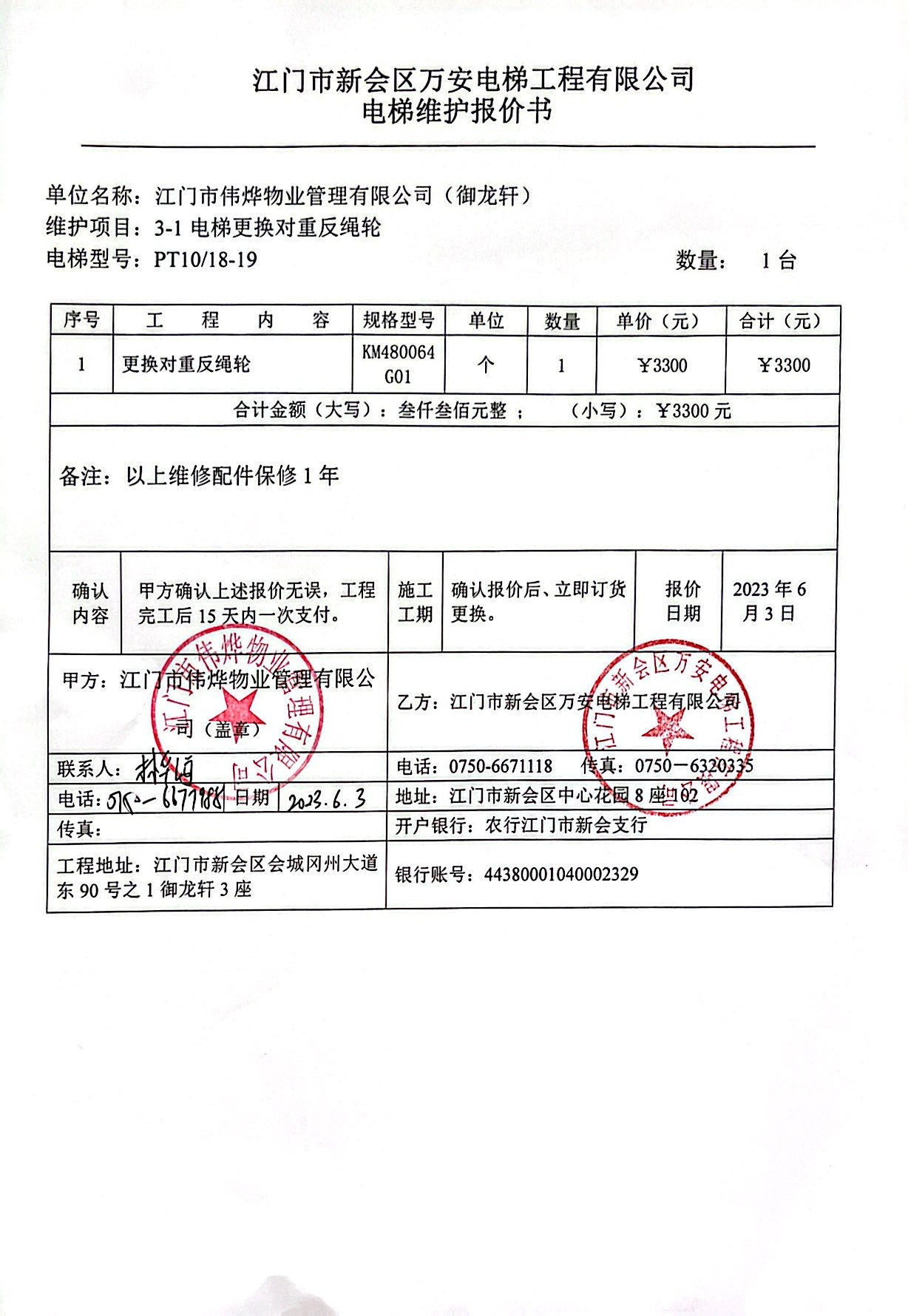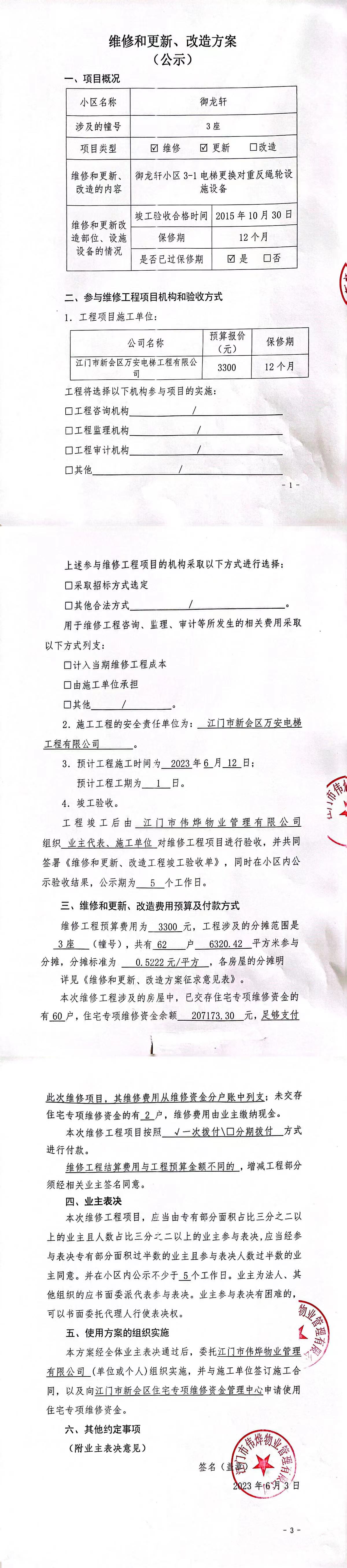 <td valign="top" values="" style="border-width:0" bindtype="0" rowspan="17" colspan="7" datasource="投票结果"><font style=" font-family:方正小标宋简体;font-size:14pt;"><p style="line-height: 1.75em;"><span style="font-family: 宋体, SimSun;">各位尊敬的业主:</span><br></p><p style="text-indent: 2em; line-height: 1.75em;"><span style="font-family: 宋体, SimSun;">根据法律法规的规定,本小区业主利用“物业公共事务决策系统”已对本小区公共事务决策事项进行了表决,在经过7日的询异公示期后,未收到业主有效的异议。现将投票结果公告,并就产生的法律效力说明如下:</span></p><p style="line-height: 1.75em; text-indent: 0em;"><strong style="text-indent: 2em;"><span style="font-family: 宋体, SimSun;">一、投票范围</span></strong></p><p style="text-indent: 2em; line-height: 1.75em;"><span style="font-family: 宋体, SimSun;">御龙轩御龙轩3座</span></p><p style="text-indent: 2em; line-height: 1.75em;"><span style="font-family: 宋体, SimSun;">总人数(专有部分人数之和):62</span></p><p style="text-indent: 2em; line-height: 1.75em;"><span style="font-family: 宋体, SimSun;"><span style="font-family: 宋体, SimSun; text-indent: 32px;">总户数:62</span></span></p><p style="text-indent: 2em; line-height: 1.75em;"><span style="font-family: 宋体, SimSun;">建筑物总面积(专有部分面积之和):6320.42㎡</span></p><p style="line-height: 1.75em;"><strong><span style="font-family: 宋体, SimSun;">二、投票起止时间</span></strong></p><p style="text-indent: 2em; line-height: 1.75em;"><span style="font-family: 宋体, SimSun;">投票表决时间:从2023年06月05日到2023年06月12日止</span></p><p style="text-indent: 2em; line-height: 1.75em;"><span style="font-family: 宋体, SimSun;">投票询异公示时间:从2023年06月13日开始</span></p><p style="text-indent: 2em; line-height: 1.75em;"><span style="font-family: 宋体, SimSun;">投票结果通知公告时间:从2023年06月20日开始</span></p><p style="line-height: 1.75em;"><strong><span style="font-family: 宋体, SimSun;">三、计票规则</span></strong></p><p style="text-indent: 2em; line-height: 1.75em;"><span style="font-family: 宋体, SimSun;">表决事项:使用建筑物及其附属设施的维修资金<br></span></p><p style="font-family: 宋体, SimSun;line-height: 1.75em; text-indent: 2em;">计票规则:弃权票不并入其它项 未表决票不并入其它项</p><p></p><p style="line-height: 1.75em;"><strong><span style="font-family: 宋体, SimSun;">四、通过规则</span></strong></p><p style="text-indent: 2em; line-height: 1.75em;"><span style="font-family: 宋体, SimSun;"><span style="font-family: 宋体, SimSun; text-indent: 32px;">表决事项:使用建筑物及其附属设施的维修资金<br></span></span></p><p style="font-family: 宋体, SimSun;line-height: 1.75em; text-indent: 2em;">通过规则:参与表决专有部分面积过半数的业主且参与表决人数过半数的业主同意</p><p></p><p style="line-height: 1.75em;"><strong><span style="font-family: 宋体, SimSun;">五、投票结果</span></strong></p><p style="line-height: 1.75em; text-indent: 2em;"><span style="font-family: 宋体, SimSun; text-indent: 2em;"></span></p><div id="resultTable"><table style="table-layout: fixed; font-size:12px; margin-top:10px" width="100%" border="0" cellspacing="0" cellpadding="0"><tbody><tr><td height="28" colspan="10" align="center" style="border: 1px solid #666"><strong style="font-size: 14px;"> 使用建筑物及其附属设施的维修资金</strong></td> </tr><tr id="trfirst"><td height="28" colspan="4" style="border-left: 1px solid #666; border-bottom: 1px solid #666"><strong> 申报单位:</strong> 江门市伟烨物业管理有限公司</td><td colspan="3" style="border-left: 1px solid #666; border-bottom: 1px solid #666"><strong> 联系方式:</strong> 0750-6123828 </td><td colspan="3" style="border-left: 1px solid #666; border-bottom: 1px solid #666; border-right: 1px solid #666"><strong> 申报日期:</strong> 2023年6月3日 </td></tr><tr> <td height="28" colspan="5" style="border-left: 1px solid #666; border-bottom: 1px solid #666"><strong> 总人数(专有部分人数之和):</strong>62人 </td><td colspan="5" style="border-left: 1px solid #666; border-bottom: 1px solid #666; border-right: 1px solid #666"><strong> 建筑物总面积(专有部分面积之和):</strong>6320.42㎡ </td> </tr><tr><td height="28" colspan="10" bgcolor="#F3F3F3" style="border-left: 1px solid #666;border-bottom: 1px solid #666;border-right: 1px solid #666"><strong> 参与人数及面积统计</strong></td></tr><tr><td height="28" colspan="5" style="border-left: 1px solid #666; border-bottom: 1px solid #666"><strong> 参与表决专有部分人数之和:</strong>43人</td><td colspan="5" style="border-left: 1px solid #666; border-bottom: 1px solid #666; border-right: 1px solid #666"><strong> 参与表决占有表决权总人数比例:</strong>69.35%</td></tr><tr><td height="28" colspan="5" style="border-left: 1px solid #666; border-bottom: 1px solid #666"><strong> 参与表决专有部分面积之和:</strong>4426.66㎡</td><td colspan="5" style="border-left: 1px solid #666; border-bottom: 1px solid #666; border-right: 1px solid #666"><strong> 参与表决占有表决权总面积比例:</strong>70.04%</td></tr><tr><td height="28" colspan="10" bgcolor="#F3F3F3" style="border-left: 1px solid #666; border-bottom: 1px solid #666;border-right: 1px solid #666"> <strong> 未参与人数及面积统计</strong></td> </tr><tr><td height="28" colspan="5" style="border-left: 1px solid #666; border-bottom: 1px solid #666"><strong> 未参与表决专有部分人数之和:</strong>19人 </td><td colspan="5" style="border-left: 1px solid #666; border-bottom: 1px solid #666; border-right: 1px solid #666"><strong> 未参与表决占有表决权总人数比例:</strong>30.65%</td></tr><tr><td height="28" colspan=