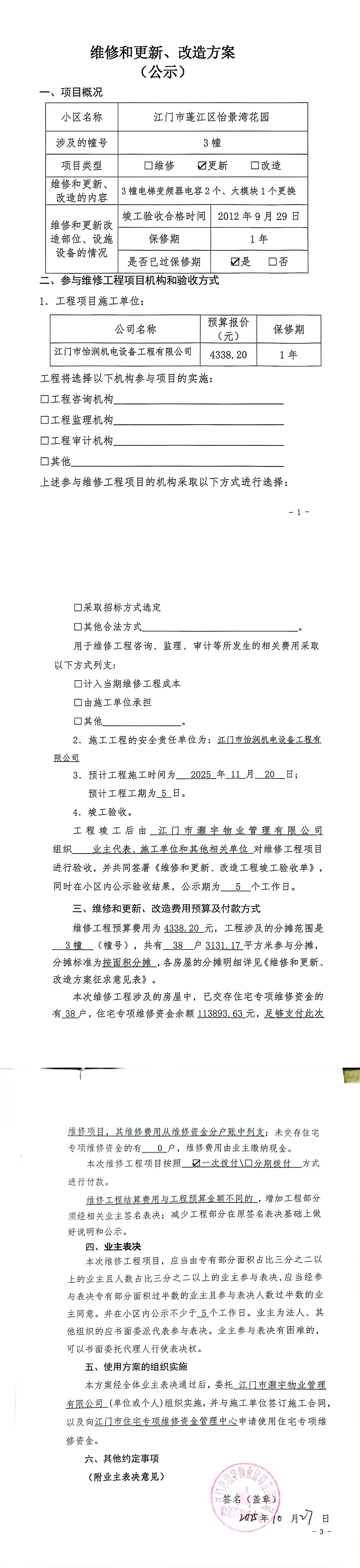 <td VALIGN="top" VALUES="" STYLE="border-width:0" BINDTYPE="0" ROWSPAN="17" COLSPAN="7" DATASOURCE="投票结果" ><font style=" font-family:方正小标宋简体;font-size:14pt;"><p style="line-height: 1.75em;"><span style="font-family: 宋体, SimSun;">各位尊敬的业主:</span><br/></p><p style="text-indent: 2em; line-height: 1.75em;"><span style="font-family: 宋体, SimSun;">根据法律法规的规定,本小区业主利用“江门市物业事项表决管理系统”已对本小区公共事务决策事项(<span style="font-family: 宋体; text-indent: 32px;">蓬江区怡景湾3幢电梯变频器电容2个、大模块1个设施设备维修使用维修资金的投票</span>)进行了表决,在经过7日的询异公示期后,未收到业主有效的异议。现将投票结果公告,并就产生的法律效力说明如下:</span></p><p style="line-height: 1.75em; text-indent: 0em;"><strong style="text-indent: 2em;"><span style="font-family: 宋体, SimSun;">一、投票范围</span></strong></p><p style="text-indent: 2em; line-height: 1.75em;"><span style="font-family: 宋体, SimSun;">蓬江区怡景湾蓬江区怡景湾花园3幢</span></p><p style="text-indent: 2em; line-height: 1.75em;"><span style="font-family: 宋体, SimSun;">总人数(专有部分人数之和):27</span></p><p style="text-indent: 2em; line-height: 1.75em;"><span style="font-family: 宋体, SimSun;"><span style="font-family: 宋体, SimSun; text-indent: 32px;"><span style="font-family: 宋体; text-indent: 32px;"><span style="font-family: 宋体; text-indent: 32px;">总户数:38</span></span></span></span></p><p style="text-indent: 2em; line-height: 1.75em;"><span style="font-family: 宋体, SimSun;">建筑物总面积(专有部分面积之和):3131.17㎡</span></p><p style="line-height: 1.75em;"><strong><span style="font-family: 宋体, SimSun;">二、投票结果公告时间</span></strong></p><p style="text-indent: 2em; line-height: 1.75em;"><span style="font-family: 宋体, SimSun;"><span style="font-family: 宋体, SimSun; text-indent: 32px;">从2025年12月06日开始</span></span></p><p style="line-height: 1.75em;"><strong><span style="font-family: 宋体, SimSun;">三、计票规则</span></strong></p><p style="text-indent: 2em; line-height: 1.75em;"><span style="font-family: 宋体, SimSun;">表决事项:使用建筑物及其附属设施的维修资金<br /><p style='font-family: 宋体, SimSun;line-height: 1.75em; text-indent: 2em;'>计票规则:弃权票不并入其它项&nbsp;&nbsp;&nbsp;&nbsp;未表决票不并入其它项</p></span></p><p style="line-height: 1.75em;"><strong><span style="font-family: 宋体, SimSun;">四、通过规则</span></strong></p><p style="line-height: 1.75em;"><strong><span style="font-family: 宋体, SimSun;">&nbsp; 根据《中华人民共和国民法典》第二百七十八条规定:业主共同决定事项,应当由专有部分面积占比三分之二以上的业主且人数占比三分之二以上的业主参与表决。</span></strong></p><p style="text-indent: 2em; line-height: 1.75em;"><span style="font-family: 宋体, SimSun;"><span style="font-family: 宋体, SimSun; text-indent: 32px;">表决事项:使用建筑物及其附属设施的维修资金<br /><p style='font-family: 宋体, SimSun;line-height: 1.75em; text-indent: 2em;'>通过规则:双2/3以上参与表决,参与表决双过半同意</p></span></span></p><p style="line-height: 1.75em;"><strong><span style="font-family: 宋体, SimSun;">五、投票结果</span></strong></p><p style="line-height: 1.75em; text-indent: 2em;"><span style="font-family: 宋体, SimSun; text-indent: 2em;"><div id='resultTable'><table style='table-layout: fixed; font-size:12px; margin-top:10px' width='100%' border='0' cellspacing='0' cellpadding='0'><tr><td height='28' colspan='10' align='center' style='border: 1px solid #666'><strong style='font-size: 14px;'> 使用建筑物及其附属设施的维修资金</strong></td> </tr><tr id='trfirst'><td height='28' colspan='4' style='border-left: 1px solid #666; border-bottom: 1px solid #666'><strong>&nbsp;申报单位:</strong> 江门市灏宇物业管理有限公司</td><td colspan='3' style='border-left: 1px solid #666; border-bottom: 1px solid #666'><strong>&nbsp;联系方式:</strong> </td><td colspan='3' style='border-left: 1px solid #666; border-bottom: 1px solid #666; border-right: 1px solid #666'><strong>&nbsp;申报日期:</strong> 2025年10月28日 </td></tr><tr> <td height='28' colspan='5' style='border-left: 1px solid #666; border-bottom: 1px solid #666'><strong>&nbsp;列支总人数(专有部分人数之和):</strong>27人 </td><td colspan='5' style='border-left: 1px solid #666; border-bottom: 1px solid #666; border-right: 1px solid #666'><strong>&nbsp;列支建筑物总面积(专有部分面积之和):</strong>3131.17㎡ </td> </tr><tr><td height='28' colspan='10' bgcolor='#F3F3F3' style='border-left: 1px solid #666;border-bottom: 1px solid #666;border-right: 1px solid #666'><strong>&nbsp;参与表决人数及面积统计</strong></td></tr><tr><td height='28' colspan='5' style='border-left: 1px solid #666; border-bottom: 1px solid #666'><strong>&nbsp;参与表决人数:</strong>22人</td><td colspan='5' style='border-left: 1px solid #666; border-bottom: 1px solid #666; border-right: 1px solid #666'><strong>&nbsp;参与表决人数占总人数比例:</strong>81.48%</td></tr><tr><td height='28' colspan='5' style='border-left: 1px solid #666; border-bottom: 1px solid #666'><strong>&nbsp;参与表决面积:</strong>2575.41㎡</td><td colspan='5' style='border-left: 1px solid #666; border-bottom: 1px solid #666; border-right: 1px solid #666'><strong>&nbsp;参与表决面积占总面积比例:</strong>82.25%</td></tr><tr><td height='28' colspan='10' bgcolor='#F3F3F3' style='border-left: 1px solid #666; border-bottom: 1px solid #666;border-right: 1px solid #666'> <strong>&nbsp;参与表决同意人数及面积统计</strong></td> </tr><tr><td height='28' colspan='5' style='