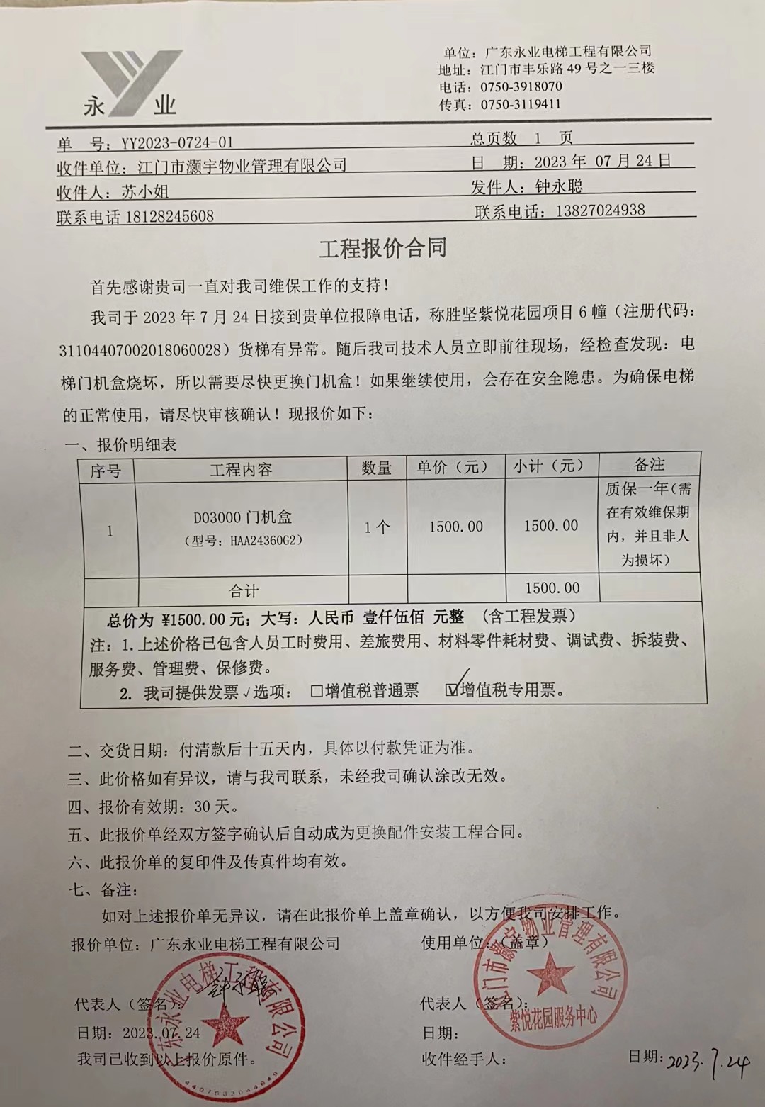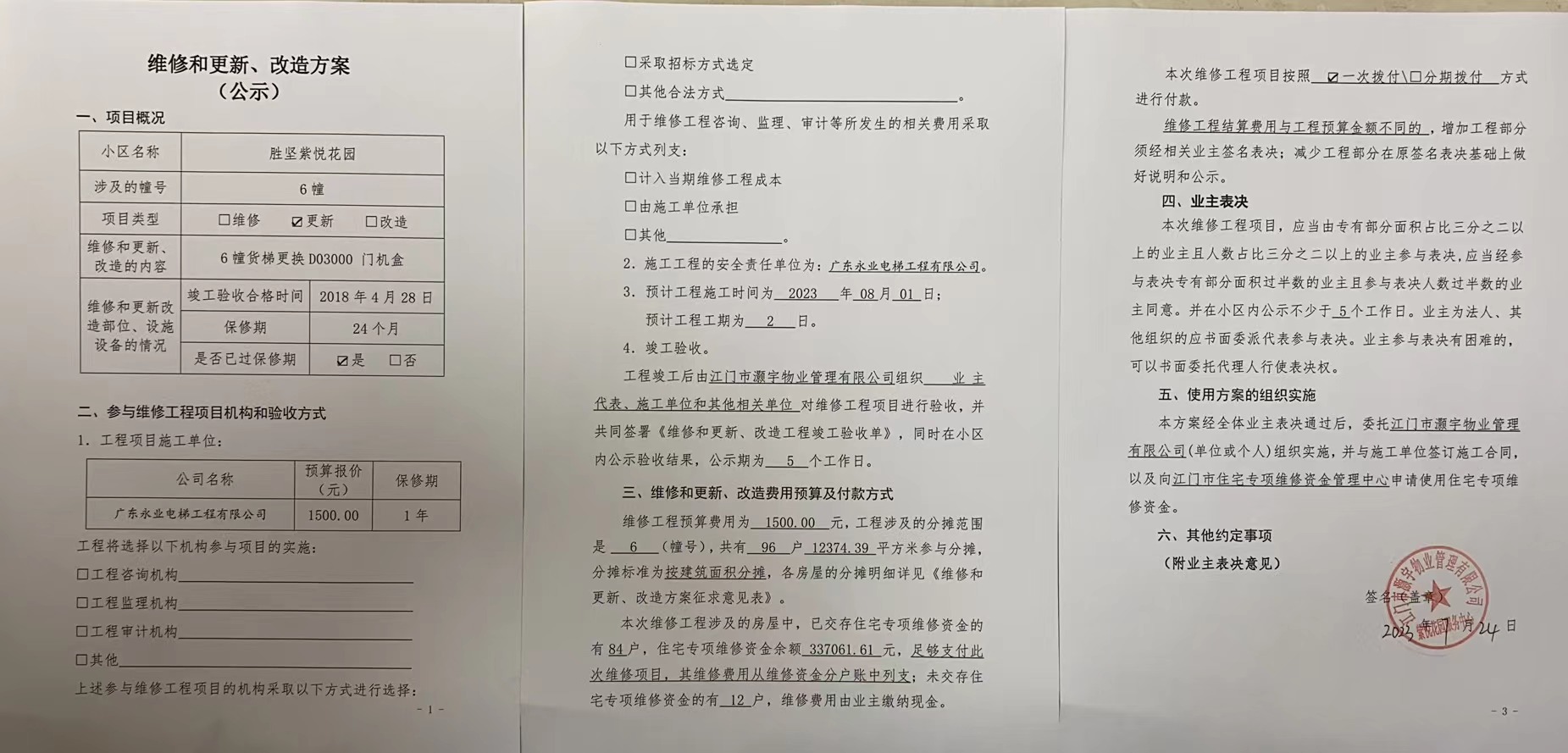 <td valign="top" values="" style="border-width:0" bindtype="0" rowspan="19" colspan="7" datasource="投票结果"><font style="font-size:14pt;"><p style="white-space: normal; font-family: 宋体; line-height: 1.75em;">蓬江区胜坚紫悦花园蓬江区胜坚紫悦花园6幢全体业主:</p><p style="white-space: normal; font-family: 宋体; line-height: 1.75em; text-indent: 2em;">本小区关于6幢货梯更换D03000 门机盒使用维修资金的投票的投票已表决结束,询异时间从2023年08月01日开始,投票询异公示期间,业主可通过微信查询自己的表决情况或可凭身份证件申请查询自己的表决情况;如公示的业主表决情况与查询的本人表决意见不一致的,可以以书面形式向投票组织机构申诉,投票组织机构予以纠正并重新公示表决结果。异议提出人对投票组织机构的处理仍有异议的,可以向街道办事处(镇人民政府)反映处理,涉及住宅专项维修资金的,可向属地住宅专项维修资金管理中心反映处理。</p><p style="white-space: normal;"><br></p><p style="white-space: normal; font-family: 宋体; line-height: 1.75em;"><strong>附件:</strong></p><p style="white-space: normal; font-family: 宋体; line-height: 1.75em;"><strong>一、投票范围</strong></p><p style="white-space: normal; font-family: 宋体; line-height: 1.75em; text-indent: 2em;">蓬江区胜坚紫悦花园蓬江区胜坚紫悦花园6幢</p><p style="white-space: normal; font-family: 宋体; line-height: 1.75em; text-indent: 2em;">总人数(专有部分人数之和):85</p><p style="white-space: normal; font-family: 宋体; line-height: 1.75em; text-indent: 2em;"><span style="font-family: 宋体, SimSun;">总户数:96</span></p><p style="white-space: normal; font-family: 宋体; line-height: 1.75em; text-indent: 2em;">建筑物总面积(专有部分面积之和):12374.39㎡</p><p style="white-space: normal; font-family: 宋体; line-height: 1.75em;"><strong>二、询异公示起止时间</strong></p><p dir="ltr" style="white-space: normal; font-family: 宋体; line-height: 1.75em; text-indent: 2em;"><span style="text-indent: 36px;">2023年08月01日至2023年08月07日</span></p><p style="white-space: normal; font-family: 宋体; line-height: 1.75em;"><strong>三、投票详细描述</strong></p><p style="white-space: normal; font-family: 宋体; line-height: 1.75em; text-indent: 2em;"></p><p><span style="font-family: 微软雅黑, " microsoft="" yahei";="" font-size:="" 16px;"=""><span style="font-family: 微软雅黑, " microsoft="" yahei";="" background-color:="" rgb(255,="" 255,="" 255);"="">本小区</span><span style="font-family: 微软雅黑, " microsoft="" yahei";"="">6栋货梯D03000 门机盒损坏</span><span style="font-family: 微软雅黑, " microsoft="" yahei";="" background-color:="" rgb(255,="" 255,="" 255);"="">,存在安全隐患,现立即停止使用电梯,需更换<span style="font-family: 微软雅黑, " microsoft="" yahei";"="">D03000 门机盒</span></span><span style="font-family: 微软雅黑, " microsoft="" yahei";="" background-color:="" rgb(255,="" 255,="" 255);"="">。由于6幢货梯已过保修期。现需申请使用维修资金对6幢货梯<span style="font-family: 微软雅黑, " microsoft="" yahei";="" background-color:="" rgb(255,="" 255,="" 255);"="">D03000 门机盒</span>进行更换,更换金额为:1500.00元,项目最终费用以报价合同签订金额为准。6幢货梯更换<span style="font-family: 微软雅黑, " microsoft="" yahei";="" background-color:="" rgb(255,="" 255,="" 255);"="">D03000 门机盒</span>费用的分摊标准为按建筑面积分摊,每平方约:0.121元,详见公示附件。如业主手机不能正常通过微信投票,请联系物业公司进行线下纸质投票,物业电话:0750-3339221。</span></span></p><p><span style="font-family: 仿宋; font-size: 21px;"></span></p><p></p><p style="white-space: normal; font-family: 宋体; line-height: 1.75em;"><strong>四、计票规则</strong></p><p style="white-space: normal; font-family: 宋体; line-height: 1.75em; text-indent: 2em;">表决事项:使用建筑物及其附属设施的维修资金<br></p><p style="text-align: left; font-family: 宋体; font-size: 16px; line-height: 1.75em; text-indent: 2em;">计票规则:弃权票不并入其它项 未表决票不并入其它项</p><p></p><p style="white-space: normal; font-family: 宋体; line-height: 1.75em;"><strong>五、通过规则</strong></p><p style="white-space: normal; font-family: 宋体; line-height: 1.75em; text-indent: 2em;">表决事项:使用建筑物及其附属设施的维修资金<br></p><p style="text-align: left; font-family: 宋体; font-size: 16px; line-height: 1.75em; text-indent: 2em;">通过规则:参与表决专有部分面积过半数的业主且参与表决人数过半数的业主同意</p><p></p><p style="white-space: normal; font-family: 宋体; line-height: 1.75em;"><strong>六、投票结果</strong></p><p style="white-space: normal; font-family: 宋体; line-height: 1.75em; text-indent: 2em;"></p><div id="resultTable"><table style="table-layout: fixed; font-size:12px; margin-top:10px" width="100%" border="0" cellspacing="0" cellpadding="0"><tbody><tr><td height="28" colspan="10" align="center" style="border: 1px solid #666"><strong style="font-size: 14px;"> 使用建筑物及其附属设施的维修资金</strong></td> </tr><tr id="trfirst"><td height="28" colspan="4" style="border-left: 1px solid #666; border-bottom: 1px solid #666"><strong> 申报单位:</strong> 江门市灏宇物业管理有限公司</td><td colspan="3" style="border-left: 1px solid #666; border-bottom: 1px solid #666"><strong> 联系方式:</strong> </td><td colspan="3" style="border-left: 1px solid #666; border-bottom: 1px solid #666; border-right: 1px solid #666"><strong> 申报日期:</strong> 2023年7月24日 </td></tr><tr> <td height="28" colspan="5" style="border-left: 1px solid #666; border-bottom: 1px solid #666"><st