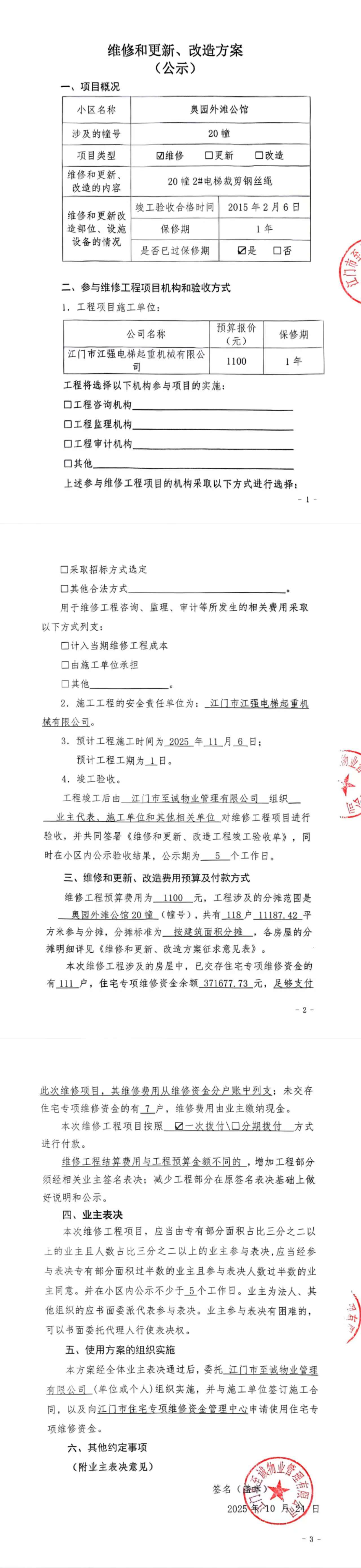 <td VALIGN="top" VALUES="" STYLE="border-width:0" BINDTYPE="0" ROWSPAN="19" COLSPAN="7" DATASOURCE="投票结果" ><font style="font-size:14pt;"><p style="white-space: normal; font-family: 宋体; line-height: 1.75em;">奥园外滩公馆蓬江区棠下镇奥园外滩公馆20幢全体业主:</p><p style="white-space: normal; font-family: 宋体; line-height: 1.75em; text-indent: 2em;">本小区关于奥园外滩公馆20幢2#电梯裁剪钢丝绳使用维修资金的投票的投票已表决结束,询异时间从2025年12月10日开始,投票询异公示期间,业主可通过微信查询自己的表决情况或可凭身份证件申请查询自己的表决情况;如公示的业主表决情况与查询的本人表决意见不一致的,可以以书面形式向投票组织机构申诉,投票组织机构予以纠正并重新公示表决结果。异议提出人对投票组织机构的处理仍有异议的,可以向街道办事处(镇人民政府)反映处理,涉及住宅专项维修资金的,可向属地住宅专项维修资金管理中心反映处理。</p><p style="white-space: normal;"><br/></p><p style="white-space: normal; font-family: 宋体; line-height: 1.75em;"><strong>附件:</strong></p><p style="white-space: normal; font-family: 宋体; line-height: 1.75em;"><strong>一、投票范围</strong></p><p style="white-space: normal; font-family: 宋体; line-height: 1.75em; text-indent: 2em;">奥园外滩公馆蓬江区棠下镇奥园外滩公馆20幢</p><p style="white-space: normal; font-family: 宋体; line-height: 1.75em; text-indent: 2em;">总人数(专有部分人数之和):118</p><p style="white-space: normal; font-family: 宋体; line-height: 1.75em; text-indent: 2em;"><span style="font-family: 宋体, SimSun;"><span style="font-family: 宋体; text-indent: 32px;"><span style="font-family: 宋体; text-indent: 32px;">总户数:118</span></span></span></p><p style="white-space: normal; font-family: 宋体; line-height: 1.75em; text-indent: 2em;">建筑物总面积(专有部分面积之和):11187.42㎡</p><p style="white-space: normal; font-family: 宋体; line-height: 1.75em;"><strong>二、询异公示起止时间</strong></p><p dir="ltr" style="white-space: normal; font-family: 宋体; line-height: 1.75em; text-indent: 2em;"><span style="text-indent: 36px;">2025年12月10日至2025年12月20日</span></p><p style="white-space: normal; font-family: 宋体; line-height: 1.75em;"><strong>三、投票详细描述</strong></p><p style="white-space: normal; font-family: 宋体; line-height: 1.75em; text-indent: 2em;"><p>小区20幢的电梯日常维保期间,维保发现2#电梯限速器钢丝绳老化,钢丝绳拉长严重,因使用时间较长,不能正常运行。</p><p> 现对20幢2#电梯进行维修,工程维修预算金额为1100元,项目最终费用以施工合同签订金额为准。因已过保修期,维修费用由相关业主按建筑面积分摊,每平方约0.1元,详见公示附件。如业主手机不能正常通过微信投票,请联系物业公司进行线下纸质投票,物业电话:0750-3851968。</p><p><br/></p></p><p style="white-space: normal; font-family: 宋体; line-height: 1.75em;"><strong>四、计票规则</strong></p><p style="white-space: normal; font-family: 宋体; line-height: 1.75em; text-indent: 2em;">表决事项:使用建筑物及其附属设施的维修资金<br /><p style='text-align: left; font-family: 宋体; font-size: 16px; line-height: 1.75em; text-indent: 2em;'>计票规则:弃权票不并入其它项 未表决票不并入其它项</p></p><p style="white-space: normal; font-family: 宋体; line-height: 1.75em;"><strong>五、通过规则</strong></p><p style="white-space: normal; font-family: 宋体; line-height: 1.75em;"><strong><strong style="white-space: normal;"><span style="font-family: 宋体, SimSun;"> 根据《中华人民共和国民法典》第二百七十八条规定:业主共同决定事项,应当由专有部分面积占比三分之二以上的业主且人数占比三分之二以上的业主参与表决。</span></strong></strong></p><p style="white-space: normal; font-family: 宋体; line-height: 1.75em; text-indent: 2em;">表决事项:使用建筑物及其附属设施的维修资金<br /><p style='text-align: left; font-family: 宋体; font-size: 16px; line-height: 1.75em; text-indent: 2em;'>通过规则:双2/3以上参与表决,参与表决双过半同意</p></p><p style="white-space: normal; font-family: 宋体; line-height: 1.75em;"><strong>六、投票结果</strong></p><p style="white-space: normal; font-family: 宋体; line-height: 1.75em; text-indent: 2em;"><div id='resultTable'><table style='table-layout: fixed; font-size:12px; margin-top:10px' width='100%' border='0' cellspacing='0' cellpadding='0'><tr><td height='28' colspan='10' align='center' style='border: 1px solid #666'><strong style='font-size: 14px;'> 使用建筑物及其附属设施的维修资金</strong></td> </tr><tr id='trfirst'><td height='28' colspan='4' style='border-left: 1px solid #666; border-bottom: 1px solid #666'><strong> 申报单位:</strong> 江门市至诚物业管理有限公司</td><td colspan='3' style='border-left: 1px solid #666; border-bottom: 1px solid #666'><strong> 联系方式:</strong> 3851968 </td><td colspan='3' style='border-left: 1px solid #666; border-bottom: 1px solid #666; border-right: 1px solid #666'><strong> 申报日期:</strong> 2025年10月24日 </td></tr><tr> <td height='28' colspan='5' style='border-left: 1px solid #666; border-bottom: 1px solid #666'><strong> 总人数(专有部分人数之和):</strong>118人 </td><td colspan='5' style='border-left: 1px solid #666; border-bottom: 1px solid #666; border-right: 1px solid #666'><strong> 建筑物总面积(专有部分面积之和):</strong>11187.42㎡ </td> </tr><tr><td height='28' colspan='10' bgcolor='#F3F3F3' style='border-left: 1px solid #666;border-bottom: 1px solid #666;border-right: 1px solid #666'><strong> 参与人数及面积统计</strong></td></tr><tr><td h