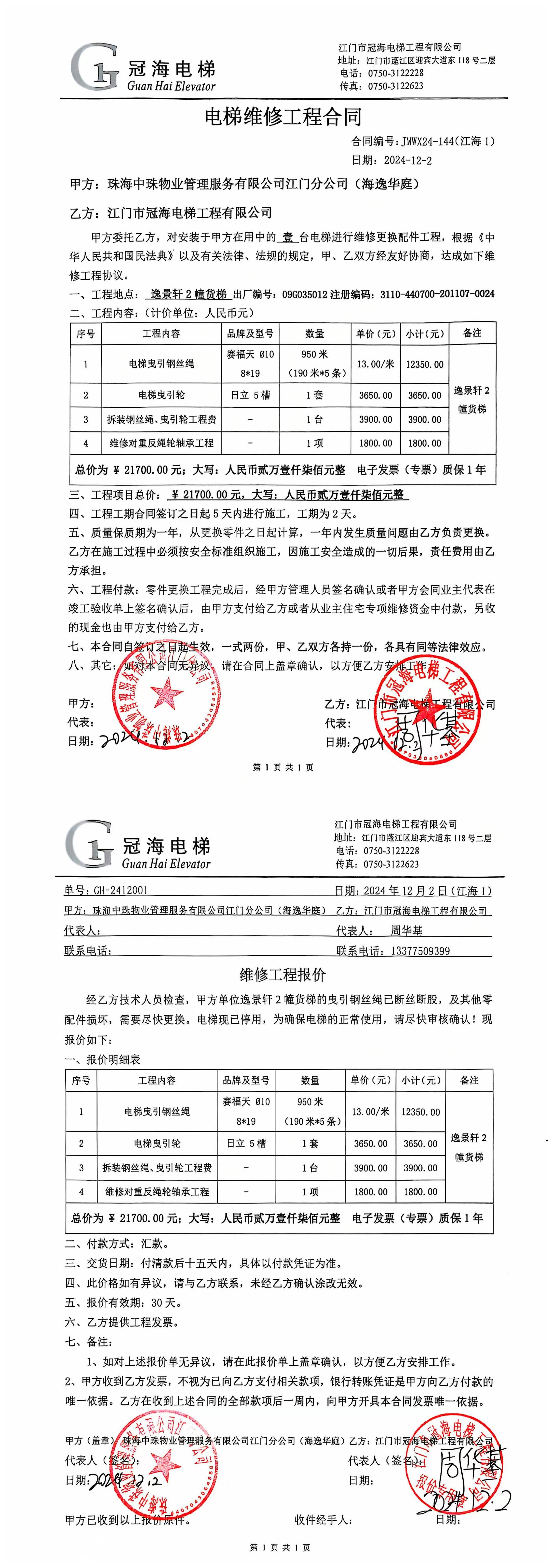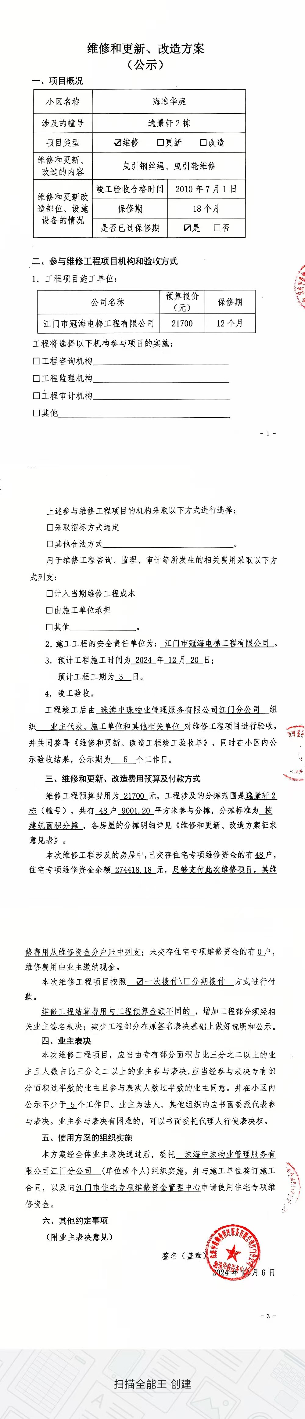 <td VALIGN="top" VALUES="" STYLE="border-width:0" BINDTYPE="0" ROWSPAN="19" COLSPAN="7" DATASOURCE="投票结果" ><font style="font-size:14pt;"><p style="white-space: normal; font-family: 宋体; line-height: 1.75em;">海逸华庭江海区外海海逸华庭逸景轩2幢全体业主:</p><p style="white-space: normal; font-family: 宋体; line-height: 1.75em; text-indent: 2em;">本小区关于江门海逸华庭逸景轩2栋货梯更换曳引钢丝绳、曳引轮使用维修资金的投票的投票已表决结束,询异时间从2025年01月03日开始,投票询异公示期间,业主可通过微信查询自己的表决情况或可凭身份证件申请查询自己的表决情况;如公示的业主表决情况与查询的本人表决意见不一致的,可以以书面形式向投票组织机构申诉,投票组织机构予以纠正并重新公示表决结果。异议提出人对投票组织机构的处理仍有异议的,可以向街道办事处(镇人民政府)反映处理,涉及住宅专项维修资金的,可向属地住宅专项维修资金管理中心反映处理。</p><p style="white-space: normal;"><br/></p><p style="white-space: normal; font-family: 宋体; line-height: 1.75em;"><strong>附件:</strong></p><p style="white-space: normal; font-family: 宋体; line-height: 1.75em;"><strong>一、投票范围</strong></p><p style="white-space: normal; font-family: 宋体; line-height: 1.75em; text-indent: 2em;">海逸华庭江海区外海海逸华庭逸景轩2幢</p><p style="white-space: normal; font-family: 宋体; line-height: 1.75em; text-indent: 2em;">总人数(专有部分人数之和):46</p><p style="white-space: normal; font-family: 宋体; line-height: 1.75em; text-indent: 2em;"><span style="font-family: 宋体, SimSun;"><span style="font-family: 宋体; text-indent: 32px;"><span style="font-family: 宋体; text-indent: 32px;">总户数:48</span></span></span></p><p style="white-space: normal; font-family: 宋体; line-height: 1.75em; text-indent: 2em;">建筑物总面积(专有部分面积之和):9001.20㎡</p><p style="white-space: normal; font-family: 宋体; line-height: 1.75em;"><strong>二、询异公示起止时间</strong></p><p dir="ltr" style="white-space: normal; font-family: 宋体; line-height: 1.75em; text-indent: 2em;"><span style="text-indent: 36px;">2025年01月03日至2025年01月13日</span></p><p style="white-space: normal; font-family: 宋体; line-height: 1.75em;"><strong>三、投票详细描述</strong></p><p style="white-space: normal; font-family: 宋体; line-height: 1.75em; text-indent: 2em;"><table class="formGrid" width="1387" style="width: 733px;"><tbody><tr class="firstRow"><td colspan="3" style="border-left-style: dotted; border-left-color: rgb(212, 212, 212); border-bottom-color: rgb(212, 212, 212); padding: 0px; max-width: 1000px; overflow-wrap: break-word;"><p>本小区江门海逸华庭逸景轩2栋的货梯,服务中心接到反映该电梯停止运行,经电梯维保公司现场检查,该栋电梯曳引钢丝绳已出现断股现象、曳引轮磨损,导致磨擦力不足,此问题会出现电梯运行不平层、振动、异响、打滑故障,需对该栋电梯更换曳引钢丝绳、曳引轮方能恢复电梯安全运行。</p><p> 现需申请使用维修资金对海逸华庭逸景轩2栋的货梯维修,工程维修预算金额为21700元,项目最终费用以施工合同签订金额为准。因已过保修期,维修费用<span style="font-family: 宋体;">由相关业主</span>按建筑面积分摊,每平方约:2.41元,详见公示附件。如业主手机不能通过正常的微信投票,请联系物业服务中心进行线下或短信投票,物业服务中心电话:0750-3776333。</p></td></tr></tbody></table><p><br/></p></p><p style="white-space: normal; font-family: 宋体; line-height: 1.75em;"><strong>四、计票规则</strong></p><p style="white-space: normal; font-family: 宋体; line-height: 1.75em; text-indent: 2em;">表决事项:使用建筑物及其附属设施的维修资金<br /><p style='text-align: left; font-family: 宋体; font-size: 16px; line-height: 1.75em; text-indent: 2em;'>计票规则:弃权票不并入其它项 未表决票不并入其它项</p></p><p style="white-space: normal; font-family: 宋体; line-height: 1.75em;"><strong>五、通过规则</strong></p><p style="white-space: normal; font-family: 宋体; line-height: 1.75em;"><strong><strong style="white-space: normal;"><span style="font-family: 宋体, SimSun;"> 根据《中华人民共和国民法典》第二百七十八条规定:业主共同决定事项,应当由专有部分面积占比三分之二以上的业主且人数占比三分之二以上的业主参与表决。</span></strong></strong></p><p style="white-space: normal; font-family: 宋体; line-height: 1.75em; text-indent: 2em;">表决事项:使用建筑物及其附属设施的维修资金<br /><p style='text-align: left; font-family: 宋体; font-size: 16px; line-height: 1.75em; text-indent: 2em;'>通过规则:双2/3以上参与表决,参与表决双过半同意</p></p><p style="white-space: normal; font-family: 宋体; line-height: 1.75em;"><strong>六、投票结果</strong></p><p style="white-space: normal; font-family: 宋体; line-height: 1.75em; text-indent: 2em;"><div id='resultTable'><table style='table-layout: fixed; font-size:12px; margin-top:10px' width='100%' border='0' cellspacing='0' cellpadding='0'><tr><td height='28' colspan='10' align='center' style='border: 1px solid #666'><strong style='font-size: 14px;'> 使用建筑物及其附属设施的维修资金</strong></td> </tr><tr id='trfirst'><td height='28' colspan='4' style='border-left: 1px solid #666; border-bottom: 1px solid #666'><strong> 申报单位:</strong> 珠海中珠物业管理服务有限公司江门分公司</td><td colspan='3' style='border-left: 1px solid #666; border-bottom: 1px solid #666'><strong> 联系方式:</strong> 3181899 </td><td colspan='3' style='border-left: 1px solid #666; border-bottom: 1px solid #666