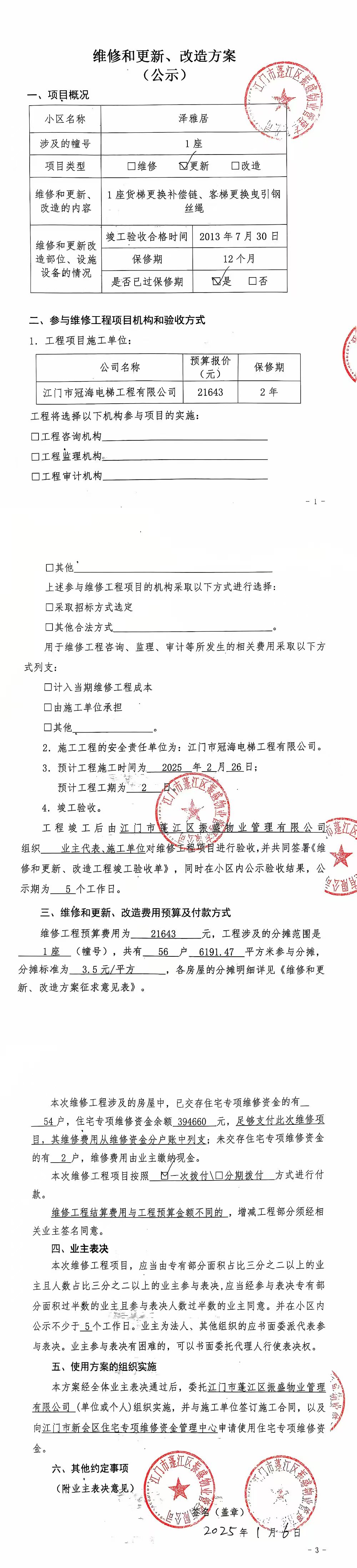 <td VALIGN="top" VALUES="" STYLE="border-width:0" BINDTYPE="0" ROWSPAN="19" COLSPAN="7" DATASOURCE="投票结果" ><font style="font-size:14pt;"><p style="white-space: normal; font-family: 宋体; line-height: 1.75em;">泽雅居安泽路8号1座全体业主:</p><p style="white-space: normal; font-family: 宋体; line-height: 1.75em; text-indent: 2em;">本小区关于泽雅居1座货梯更换补偿链、客梯更换曳引钢丝绳使用维修资金的投票的投票已表决结束,询异时间从2025年01月13日开始,投票询异公示期间,业主可通过微信查询自己的表决情况或可凭身份证件申请查询自己的表决情况;如公示的业主表决情况与查询的本人表决意见不一致的,可以以书面形式向投票组织机构申诉,投票组织机构予以纠正并重新公示表决结果。异议提出人对投票组织机构的处理仍有异议的,可以向街道办事处(镇人民政府)反映处理,涉及住宅专项维修资金的,可向属地住宅专项维修资金管理中心反映处理。</p><p style="white-space: normal;"><br/></p><p style="white-space: normal; font-family: 宋体; line-height: 1.75em;"><strong>附件:</strong></p><p style="white-space: normal; font-family: 宋体; line-height: 1.75em;"><strong>一、投票范围</strong></p><p style="white-space: normal; font-family: 宋体; line-height: 1.75em; text-indent: 2em;">泽雅居安泽路8号1座</p><p style="white-space: normal; font-family: 宋体; line-height: 1.75em; text-indent: 2em;">总人数(专有部分人数之和):56</p><p style="white-space: normal; font-family: 宋体; line-height: 1.75em; text-indent: 2em;"><span style="font-family: 宋体, SimSun;"><span style="font-family: 宋体; text-indent: 32px;"><span style="font-family: 宋体; text-indent: 32px;">总户数:56</span></span></span></p><p style="white-space: normal; font-family: 宋体; line-height: 1.75em; text-indent: 2em;">建筑物总面积(专有部分面积之和):6191.47㎡</p><p style="white-space: normal; font-family: 宋体; line-height: 1.75em;"><strong>二、询异公示起止时间</strong></p><p dir="ltr" style="white-space: normal; font-family: 宋体; line-height: 1.75em; text-indent: 2em;"><span style="text-indent: 36px;">2025年01月13日至2025年01月23日</span></p><p style="white-space: normal; font-family: 宋体; line-height: 1.75em;"><strong>三、投票详细描述</strong></p><p style="white-space: normal; font-family: 宋体; line-height: 1.75em; text-indent: 2em;"><p style="font-family: "Helvetica Neue", Helvetica, Arial, sans-serif; font-size: 14px; text-wrap: wrap; background-color: rgb(255, 255, 255);">泽雅居1座货梯<span style="font-family: 宋体;">【</span>梯11粤JX0535(19)<span style="font-family: 宋体;">】</span>更换补偿链、客梯<span style="font-family: 宋体;">【</span>梯11粤JX0532(19)<span style="font-family: 宋体;">】</span>更换曳引钢丝绳。由于近段时间2台电梯出现频繁的异响经保养公司检测,发现货梯的补偿链表面保护层老化破损、客梯的曳引钢丝绳已断股。</p><p style="font-family: "Helvetica Neue", Helvetica, Arial, sans-serif; font-size: 14px; text-wrap: wrap; background-color: rgb(255, 255, 255);"> 现对1座货梯、客梯进行维修更换,工程维修预算金额为21643元,项目最终费用以合同签订为准,因已过保修期,维修费用由相关业主按建筑面积分摊,每平方约3.5元,详见公示附件。如业主手机不能正常通过微信投票,请联系物业公司进行线下纸质投票,物业电话:0750-6893006</p><p><br/></p></p><p style="white-space: normal; font-family: 宋体; line-height: 1.75em;"><strong>四、计票规则</strong></p><p style="white-space: normal; font-family: 宋体; line-height: 1.75em; text-indent: 2em;">表决事项:使用建筑物及其附属设施的维修资金<br /><p style='text-align: left; font-family: 宋体; font-size: 16px; line-height: 1.75em; text-indent: 2em;'>计票规则:弃权票不并入其它项 未表决票不并入其它项</p></p><p style="white-space: normal; font-family: 宋体; line-height: 1.75em;"><strong>五、通过规则</strong></p><p style="white-space: normal; font-family: 宋体; line-height: 1.75em;"><strong><strong style="white-space: normal;"><span style="font-family: 宋体, SimSun;"> 根据《中华人民共和国民法典》第二百七十八条规定:业主共同决定事项,应当由专有部分面积占比三分之二以上的业主且人数占比三分之二以上的业主参与表决。</span></strong></strong></p><p style="white-space: normal; font-family: 宋体; line-height: 1.75em; text-indent: 2em;">表决事项:使用建筑物及其附属设施的维修资金<br /><p style='text-align: left; font-family: 宋体; font-size: 16px; line-height: 1.75em; text-indent: 2em;'>通过规则:双2/3以上参与表决,参与表决双过半同意</p></p><p style="white-space: normal; font-family: 宋体; line-height: 1.75em;"><strong>六、投票结果</strong></p><p style="white-space: normal; font-family: 宋体; line-height: 1.75em; text-indent: 2em;"><div id='resultTable'><table style='table-layout: fixed; font-size:12px; margin-top:10px' width='100%' border='0' cellspacing='0' cellpadding='0'><tr><td height='28' colspan='10' align='center' style='border: 1px solid #666'><strong style='font-size: 14px;'> 使用建筑物及其附属设施的维修资金</strong></td> </tr><tr id='trfirst'><td height='28' colspan='4' style='border-left: 1px solid #666; border-bottom: 1px solid #666'><strong> 申报单位:</strong> 江门市蓬江区振盛物业管理有限公司</td><td colspan='3' style='border-left: 1px solid #666; border-bottom: 1px solid #666'><strong> 联系方式:</strong> 0750-6685883 </td><td colspan='3' style='border-left: 1px solid #666; border-bottom: 1px solid #666; border-right: 1px solid #666'><strong> 申报日期:</strong> 2025年1月3日 </td></tr><tr> <td height='28' colspan='5' style='b