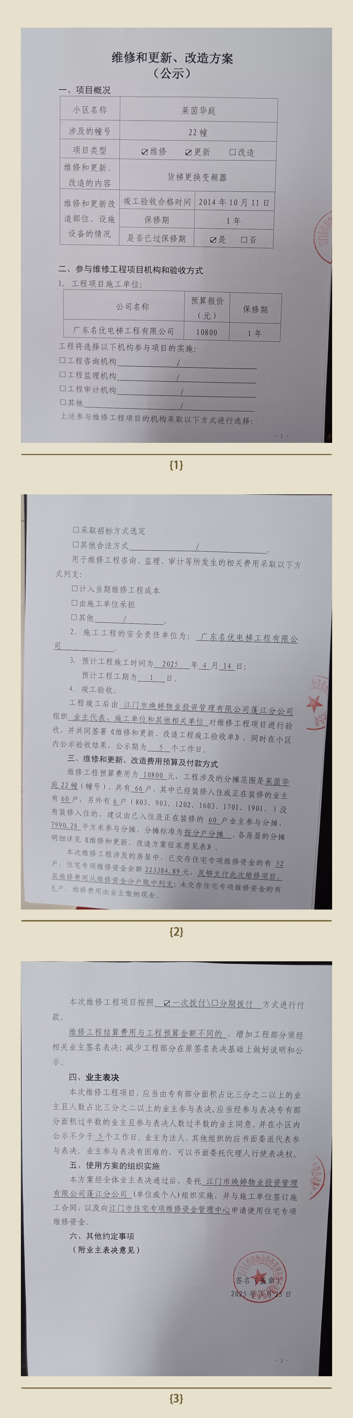 <td VALIGN="top" VALUES="" STYLE="border-width:0" BINDTYPE="0" ROWSPAN="19" COLSPAN="7" DATASOURCE="投票结果" ><font style="font-size:14pt;"><p style="white-space: normal; font-family: 宋体; line-height: 1.75em;">莱茵华庭蓬江区莱茵华庭22幢全体业主:</p><p style="white-space: normal; font-family: 宋体; line-height: 1.75em; text-indent: 2em;">本小区关于莱茵华庭小区22幢货梯更换变频器使用维修资金的投票的投票已表决结束,询异时间从2025年04月30日开始,投票询异公示期间,业主可通过微信查询自己的表决情况或可凭身份证件申请查询自己的表决情况;如公示的业主表决情况与查询的本人表决意见不一致的,可以以书面形式向投票组织机构申诉,投票组织机构予以纠正并重新公示表决结果。异议提出人对投票组织机构的处理仍有异议的,可以向街道办事处(镇人民政府)反映处理,涉及住宅专项维修资金的,可向属地住宅专项维修资金管理中心反映处理。</p><p style="white-space: normal;"><br/></p><p style="white-space: normal; font-family: 宋体; line-height: 1.75em;"><strong>附件:</strong></p><p style="white-space: normal; font-family: 宋体; line-height: 1.75em;"><strong>一、投票范围</strong></p><p style="white-space: normal; font-family: 宋体; line-height: 1.75em; text-indent: 2em;">莱茵华庭蓬江区莱茵华庭22幢</p><p style="white-space: normal; font-family: 宋体; line-height: 1.75em; text-indent: 2em;">总人数(专有部分人数之和):60</p><p style="white-space: normal; font-family: 宋体; line-height: 1.75em; text-indent: 2em;"><span style="font-family: 宋体, SimSun;"><span style="font-family: 宋体; text-indent: 32px;"><span style="font-family: 宋体; text-indent: 32px;">总户数:60</span></span></span></p><p style="white-space: normal; font-family: 宋体; line-height: 1.75em; text-indent: 2em;">建筑物总面积(专有部分面积之和):7990.28㎡</p><p style="white-space: normal; font-family: 宋体; line-height: 1.75em;"><strong>二、询异公示起止时间</strong></p><p dir="ltr" style="white-space: normal; font-family: 宋体; line-height: 1.75em; text-indent: 2em;"><span style="text-indent: 36px;">2025年04月30日至2025年05月10日</span></p><p style="white-space: normal; font-family: 宋体; line-height: 1.75em;"><strong>三、投票详细描述</strong></p><p style="white-space: normal; font-family: 宋体; line-height: 1.75em; text-indent: 2em;"><p> 小区22幢的货梯在运行时出现急停复位现象,经检查,是由于货梯变频器输出功率不足、内部电子元件损坏引起故障,需要更换变频器才能保障电梯的正常运行。</p><p> 现对22幢货梯进行维修,工程维修预算金额为10800元,项目最终费用以施工合同签订金额为准。因已过保修期,维修费用由相关业主按分户分摊,每户约180元,详见公示附件。如业主手机不能正常通过微信投票,请联系物业公司进行线下纸质投票,物业电话:0750-3212633。</p><p><br/></p></p><p style="white-space: normal; font-family: 宋体; line-height: 1.75em;"><strong>四、计票规则</strong></p><p style="white-space: normal; font-family: 宋体; line-height: 1.75em; text-indent: 2em;">表决事项:使用建筑物及其附属设施的维修资金<br /><p style='text-align: left; font-family: 宋体; font-size: 16px; line-height: 1.75em; text-indent: 2em;'>计票规则:弃权票不并入其它项 未表决票不并入其它项</p></p><p style="white-space: normal; font-family: 宋体; line-height: 1.75em;"><strong>五、通过规则</strong></p><p style="white-space: normal; font-family: 宋体; line-height: 1.75em;"><strong><strong style="white-space: normal;"><span style="font-family: 宋体, SimSun;"> 根据《中华人民共和国民法典》第二百七十八条规定:业主共同决定事项,应当由专有部分面积占比三分之二以上的业主且人数占比三分之二以上的业主参与表决。</span></strong></strong></p><p style="white-space: normal; font-family: 宋体; line-height: 1.75em; text-indent: 2em;">表决事项:使用建筑物及其附属设施的维修资金<br /><p style='text-align: left; font-family: 宋体; font-size: 16px; line-height: 1.75em; text-indent: 2em;'>通过规则:双2/3以上参与表决,参与表决双过半同意</p></p><p style="white-space: normal; font-family: 宋体; line-height: 1.75em;"><strong>六、投票结果</strong></p><p style="white-space: normal; font-family: 宋体; line-height: 1.75em; text-indent: 2em;"><div id='resultTable'><table style='table-layout: fixed; font-size:12px; margin-top:10px' width='100%' border='0' cellspacing='0' cellpadding='0'><tr><td height='28' colspan='10' align='center' style='border: 1px solid #666'><strong style='font-size: 14px;'> 使用建筑物及其附属设施的维修资金</strong></td> </tr><tr id='trfirst'><td height='28' colspan='4' style='border-left: 1px solid #666; border-bottom: 1px solid #666'><strong> 申报单位:</strong> 江门市焕婷物业投资管理有限公司蓬江分公司</td><td colspan='3' style='border-left: 1px solid #666; border-bottom: 1px solid #666'><strong> 联系方式:</strong> 3211392 </td><td colspan='3' style='border-left: 1px solid #666; border-bottom: 1px solid #666; border-right: 1px solid #666'><strong> 申报日期:</strong> 2025年3月26日 </td></tr><tr> <td height='28' colspan='5' style='border-left: 1px solid #666; border-bottom: 1px solid #666'><strong> 总人数(专有部分人数之和):</strong>60人 </td><td colspan='5' style='border-left: 1px solid #666; border-bottom: 1px solid #666; border-right: 1px solid #666'><strong> 建筑物总面积(专有部分面积之和):</strong>7990.28㎡ </td> </tr><tr><td height='28' colspan='10' bgcolor='#F3F3F3' style='border-left: 1px solid #666;border-bottom: 1px solid #666;border-right: 1px solid #666'><strong> 参与人数及面积统计</strong>