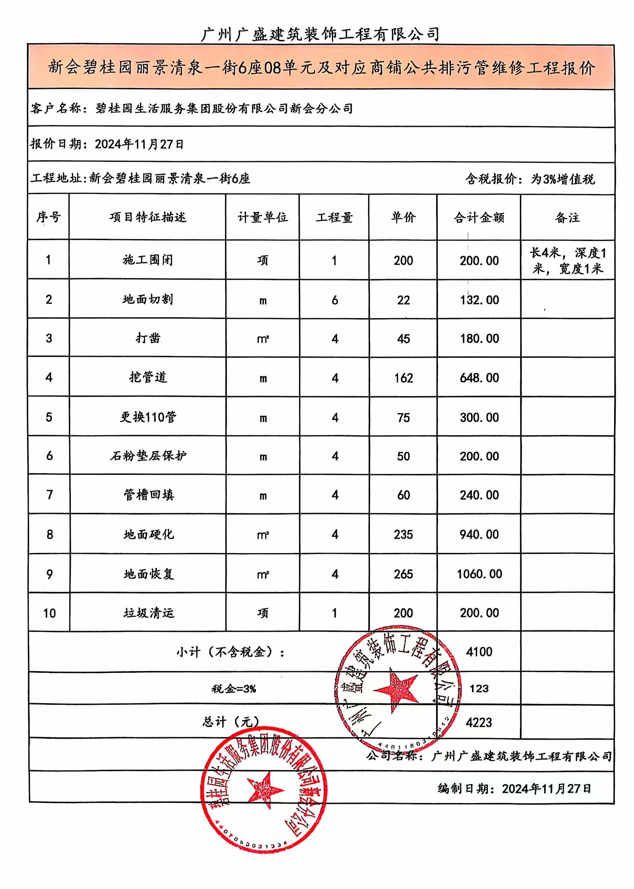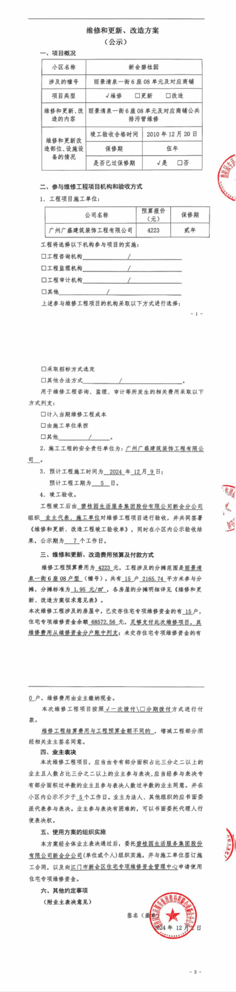 <td VALIGN="top" VALUES="" STYLE="border-width:0" BINDTYPE="0" ROWSPAN="19" COLSPAN="7" DATASOURCE="投票结果" ><font style="font-size:14pt;"><p style="white-space: normal; font-family: 宋体; line-height: 1.75em;">新会碧桂园丽景清泉一街6座、新会大道中23号全体业主:</p><p style="white-space: normal; font-family: 宋体; line-height: 1.75em; text-indent: 2em;">本小区关于新会碧桂园丽景清泉一街6座08单元及对应商铺公共排污管维修使用维修资金的投票的投票已表决结束,询异时间从2024年12月05日开始,投票询异公示期间,业主可通过微信查询自己的表决情况或可凭身份证件申请查询自己的表决情况;如公示的业主表决情况与查询的本人表决意见不一致的,可以以书面形式向投票组织机构申诉,投票组织机构予以纠正并重新公示表决结果。异议提出人对投票组织机构的处理仍有异议的,可以向街道办事处(镇人民政府)反映处理,涉及住宅专项维修资金的,可向属地住宅专项维修资金管理中心反映处理。</p><p style="white-space: normal;"><br/></p><p style="white-space: normal; font-family: 宋体; line-height: 1.75em;"><strong>附件:</strong></p><p style="white-space: normal; font-family: 宋体; line-height: 1.75em;"><strong>一、投票范围</strong></p><p style="white-space: normal; font-family: 宋体; line-height: 1.75em; text-indent: 2em;">新会碧桂园丽景清泉一街6座、新会大道中23号</p><p style="white-space: normal; font-family: 宋体; line-height: 1.75em; text-indent: 2em;">总人数(专有部分人数之和):15</p><p style="white-space: normal; font-family: 宋体; line-height: 1.75em; text-indent: 2em;"><span style="font-family: 宋体, SimSun;"><span style="font-family: 宋体; text-indent: 32px;"><span style="font-family: 宋体; text-indent: 32px;">总户数:15</span></span></span></p><p style="white-space: normal; font-family: 宋体; line-height: 1.75em; text-indent: 2em;">建筑物总面积(专有部分面积之和):2165.74㎡</p><p style="white-space: normal; font-family: 宋体; line-height: 1.75em;"><strong>二、询异公示起止时间</strong></p><p dir="ltr" style="white-space: normal; font-family: 宋体; line-height: 1.75em; text-indent: 2em;"><span style="text-indent: 36px;">2024年12月05日至2024年12月15日</span></p><p style="white-space: normal; font-family: 宋体; line-height: 1.75em;"><strong>三、投票详细描述</strong></p><p style="white-space: normal; font-family: 宋体; line-height: 1.75em; text-indent: 2em;"><p>新会碧桂园丽景清泉一街6座08户型排污管有反涌现象,经检查,是由于丽景清泉一街6座08户型公共排污管堵塞导致有反涌现象,已过保修期。现申请使用维修资金对新会碧桂园丽景清泉一街6座08户型共用排污管进行换管维修,工程维修预算约4223元,项目最终费用以施工合同签订为准,维修费用的分摊标准按建筑面积分摊,每平方约1.95元,详见公示,如果有业主手机不能正常通过微信投票的,请联系物业公司进行线下纸质投票,物业电话18088896991王管家. </p></p><p style="white-space: normal; font-family: 宋体; line-height: 1.75em;"><strong>四、计票规则</strong></p><p style="white-space: normal; font-family: 宋体; line-height: 1.75em; text-indent: 2em;">表决事项:使用建筑物及其附属设施的维修资金<br /><p style='text-align: left; font-family: 宋体; font-size: 16px; line-height: 1.75em; text-indent: 2em;'>计票规则:弃权票不并入其它项 未表决票不并入其它项</p></p><p style="white-space: normal; font-family: 宋体; line-height: 1.75em;"><strong>五、通过规则</strong></p><p style="white-space: normal; font-family: 宋体; line-height: 1.75em;"><strong><strong style="white-space: normal;"><span style="font-family: 宋体, SimSun;"> 根据《中华人民共和国民法典》第二百七十八条规定:业主共同决定事项,应当由专有部分面积占比三分之二以上的业主且人数占比三分之二以上的业主参与表决。</span></strong></strong></p><p style="white-space: normal; font-family: 宋体; line-height: 1.75em; text-indent: 2em;">表决事项:使用建筑物及其附属设施的维修资金<br /><p style='text-align: left; font-family: 宋体; font-size: 16px; line-height: 1.75em; text-indent: 2em;'>通过规则:双2/3以上参与表决,参与表决双过半同意</p></p><p style="white-space: normal; font-family: 宋体; line-height: 1.75em;"><strong>六、投票结果</strong></p><p style="white-space: normal; font-family: 宋体; line-height: 1.75em; text-indent: 2em;"><div id='resultTable'><table style='table-layout: fixed; font-size:12px; margin-top:10px' width='100%' border='0' cellspacing='0' cellpadding='0'><tr><td height='28' colspan='10' align='center' style='border: 1px solid #666'><strong style='font-size: 14px;'> 使用建筑物及其附属设施的维修资金</strong></td> </tr><tr id='trfirst'><td height='28' colspan='4' style='border-left: 1px solid #666; border-bottom: 1px solid #666'><strong> 申报单位:</strong> 碧桂园生活服务集团股份有限公司新会分公司</td><td colspan='3' style='border-left: 1px solid #666; border-bottom: 1px solid #666'><strong> 联系方式:</strong> </td><td colspan='3' style='border-left: 1px solid #666; border-bottom: 1px solid #666; border-right: 1px solid #666'><strong> 申报日期:</strong> 2024年12月3日 </td></tr><tr> <td height='28' colspan='5' style='border-left: 1px solid #666; border-bottom: 1px solid #666'><strong> 总人数(专有部分人数之和):</strong>15人 </td><td colspan='5' style='border-left: 1px solid #666; border-bottom: 1px solid #666; border-right: 1px solid #666'><strong> 建筑物总面积(专有部分面积之和):</strong>2165.74㎡ </td> </tr><tr><td height='28' colspan='10' bgcolor='#F3F3F3' style='border-left: 1px solid #666;border-bottom: 1p