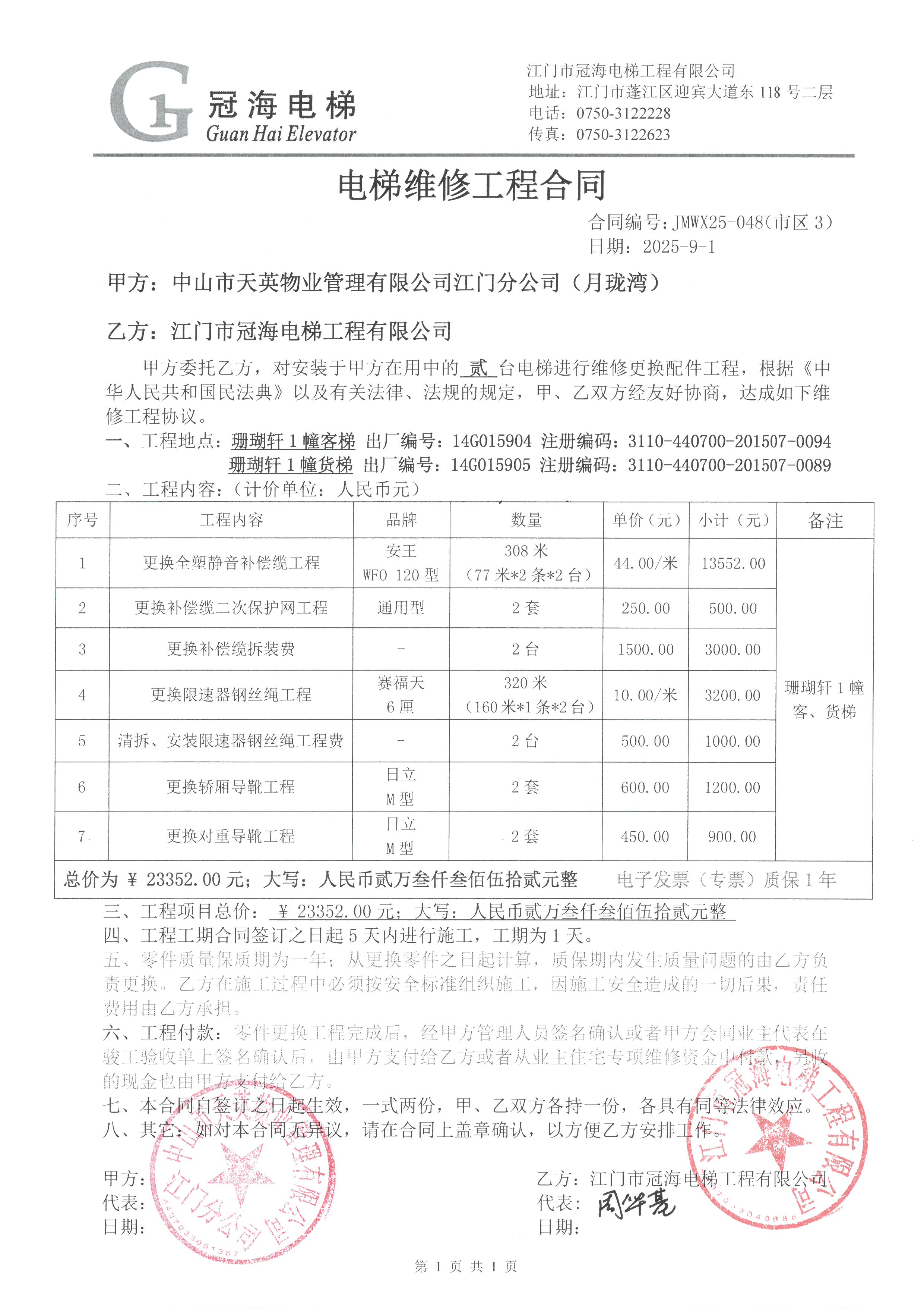 <br/>现对珊瑚轩1幢客梯、货梯进行维修,工程维修预算金额为23352元,项目最终费用以施工合同签订金额为准。因已过保修期,维修费用由相关业主按建筑面积分摊,每平方约2.54元,详见公示附件。如业主手机不能正常通过微信投票,请联系物业公司或者管家进行线下纸质投票,物业电话:0750-2037899或者联系管家号码:18026834750。</p></p><p style="white-space: normal; font-family: 宋体; line-height: 1.75em;"><strong>四、计票规则</strong></p><p style="white-space: normal; font-family: 宋体; line-height: 1.75em; text-indent: 2em;">表决事项:月珑湾豪庭珊瑚轩1幢客梯、货梯更换补偿链、限速钢丝绳、轿厢导靴、对重导靴使用维修资金的投票<br /><p style='text-align: left; font-family: 宋体; font-size: 16px; line-height: 1.75em; text-indent: 2em;'>计票规则:弃权票不并入其它项 未表决票不并入其它项</p></p><p style="white-space: normal; font-family: 宋体; line-height: 1.75em;"><strong>五、通过规则</strong></p><p style="white-space: normal; font-family: 宋体; line-height: 1.75em;"><strong><strong style="white-space: normal;"><span style="font-family: 宋体, SimSun;"> 根据《中华人民共和国民法典》第二百七十八条规定:业主共同决定事项,应当由专有部分面积占比三分之二以上的业主且人数占比三分之二以上的业主参与表决。</span></strong></strong></p><p style="white-space: normal; font-family: 宋体; line-height: 1.75em; text-indent: 2em;">表决事项:月珑湾豪庭珊瑚轩1幢客梯、货梯更换补偿链、限速钢丝绳、轿厢导靴、对重导靴使用维修资金的投票<br /><p style='text-align: left; font-family: 宋体; font-size: 16px; line-height: 1.75em; text-indent: 2em;'>通过规则:双2/3以上参与表决,参与表决双过半同意</p></p><p style="white-space: normal; font-family: 宋体; line-height: 1.75em;"><strong>六、投票结果</strong></p><p style="white-space: normal; font-family: 宋体; line-height: 1.75em; text-indent: 2em;"><div id='resultTable'><table style='table-layout: fixed; font-size:12px; margin-top:10px' width='100%' border='0' cellspacing='0' cellpadding='0'><tr><td height='28' colspan='10' align='center' style='border: 1px solid #666'><strong style='font-size: 14px;'> 月珑湾豪庭珊瑚轩1幢客梯、货梯更换补偿链、限速钢丝绳、轿厢导靴、对重导靴使用维修资金的投票</strong></td> </tr><tr id='trfirst'><td height='28' colspan='4' style='border-left: 1px solid #666; border-bottom: 1px solid #666'><strong> 申报单位:</strong> 中山市天英物业管理有限公司江门分公司</td><td colspan='3' style='border-left: 1px solid #666; border-bottom: 1px solid #666'><strong> 联系方式:</strong> 2037899 </td><td colspan='3' style='border-left: 1px solid #666; border-bottom: 1px solid #666; border-right: 1px solid #666'><strong> 申报日期:</strong> 2025年10月25日 </td></tr><tr> <td height='28' colspan='5' style='border-left: 1px solid #666; border-bottom: 1px solid #666'><strong> 总人数(专有部分人数之和):</strong>90人 </td><td colspan='5' style='border-left: 1px solid #666; border-bottom: 1px solid #666; border-right: 1px solid #666'><strong> 建筑物总面积(专有部分面积之和):</strong>9211.16㎡ </td> </tr><tr><td height='28' colspan='10' bgcolor='#F3F3F3' style='border-left: 1px solid #666;border-bottom: 1px solid #666;border-right: 1px solid #666'><strong> 参与人数及面积统计</strong></td></tr><tr><td height='28' colspan='5' style='border-left: 1px solid #666; border-bottom: 1px solid #666'><strong> 参与表决专有部分人数之和:</strong>61人</td><td colspan='5' style='border-left: 1px solid #666; border-bottom: 1px solid #666; border-right: 1px solid #666'><strong> 参与表决占有表决权总人数比例:</strong>67.78%</td></tr><tr><td height='28' colspan='5' style='border-left: 1px solid #666; border-bottom: 1px solid #666'><strong> 参与表决专有部分面积之和:</strong>6239.36㎡</td><td colspan='5' style='border-left: 1px solid #666; border-bottom: 1px solid #666; border-right: 1px solid #666'><strong> 参与表决占有表决权总面积比例:</strong>67.74%</td></tr><tr><td height='28' colspan='10' bgcolor='#F3F3F3' style='border-left: 1px solid #666; border-bottom: 1px solid #666;border-right: 1px solid #666'> <strong> 参与表决同意人数及面积统计</strong></td> </tr><tr><td height='28' colspan='5' style='border-left: 1px solid #666; border-bottom: 1px solid #666'><strong> 参与表决同意人数:</strong>58人 </td><td colspan='5' style='border-left: 1px solid #666; border-bottom: 1px solid #666; border-right: 1px solid #666'><strong> 参与表决同意人数占参与表决人数比例:</strong>95.08%</td></tr><tr><td height='28' colspan='5' style='border-left: 1px solid #666; border-bottom: 1px solid #666'><strong> 参与表决同意面积:</strong>5875.10㎡</td><td colspan='5' style='border-left: 1px solid #666; border-bottom: 1px solid #666; border-right: 1px solid #666'><strong> 参与表决同意面积占参与表决面积比例:</strong>94.16% </td> </tr><tr><td width='6%' rowspan='2' align='center' bgcolor='#F3F3F3' style='border-left: 1px solid #666; border-bottom: 1px solid #666'><strong>序号</strong></td><td width='11%' rowspan='2' align='center' bgcolor='#F3F3F3' style='border-left: 1px solid #666; border-bottom: 1px solid #666'><strong>候选项</strong></td><td height='28' colspan='2' align='center' bgcolor='#F3F3F3' style='border-left: 1px solid #666; border-bottom: 1px solid #666'><strong>表决人数情况</strong> </td><td colspan='2' align='center' bgcolor='#F3F3F3' style='border-left: 1px solid #666; border-bottom: 1px solid #666'><strong>表决面积情况</strong></td><td colspan='4' align='center' bgcolor='#F3F3F3' style='border-left: 1px solid #666; border-bottom: 1px solid #666; border-r