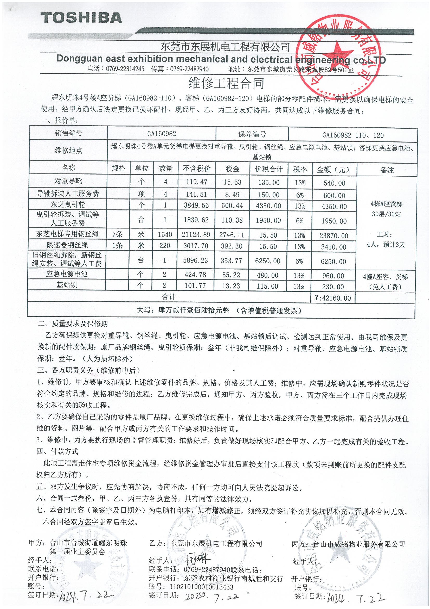 <td VALIGN="top" VALUES="" STYLE="border-width:0" BINDTYPE="0" ROWSPAN="19" COLSPAN="7" DATASOURCE="投票结果" ><font style="font-size:14pt;"><p style="white-space: normal; font-family: 宋体; line-height: 1.75em;">耀东明珠花园4号楼A座全体业主:</p><p style="white-space: normal; font-family: 宋体; line-height: 1.75em; text-indent: 2em;">本小区关于耀东明珠花园4号楼A座客梯更换电源电池、基站锁,货梯更换钢丝绳等配件使用维修资金投票的投票已表决结束,询异时间从2024年08月16日开始,投票询异公示期间,业主可通过微信查询自己的表决情况或可凭身份证件申请查询自己的表决情况;如公示的业主表决情况与查询的本人表决意见不一致的,可以以书面形式向投票组织机构申诉,投票组织机构予以纠正并重新公示表决结果。异议提出人对投票组织机构的处理仍有异议的,可以向街道办事处(镇人民政府)反映处理,涉及住宅专项维修资金的,可向属地住宅专项维修资金管理中心反映处理。</p><p style="white-space: normal;"><br/></p><p style="white-space: normal; font-family: 宋体; line-height: 1.75em;"><strong>附件:</strong></p><p style="white-space: normal; font-family: 宋体; line-height: 1.75em;"><strong>一、投票范围</strong></p><p style="white-space: normal; font-family: 宋体; line-height: 1.75em; text-indent: 2em;">耀东明珠花园4号楼A座</p><p style="white-space: normal; font-family: 宋体; line-height: 1.75em; text-indent: 2em;">总人数(专有部分人数之和):108</p><p style="white-space: normal; font-family: 宋体; line-height: 1.75em; text-indent: 2em;"><span style="font-family: 宋体, SimSun;"><span style="font-family: 宋体; text-indent: 32px;"><span style="font-family: 宋体; text-indent: 32px;">总户数:108</span></span></span></p><p style="white-space: normal; font-family: 宋体; line-height: 1.75em; text-indent: 2em;">建筑物总面积(专有部分面积之和):14079.96㎡</p><p style="white-space: normal; font-family: 宋体; line-height: 1.75em;"><strong>二、询异公示起止时间</strong></p><p dir="ltr" style="white-space: normal; font-family: 宋体; line-height: 1.75em; text-indent: 2em;"><span style="text-indent: 36px;">2024年08月16日至2024年08月22日</span></p><p style="white-space: normal; font-family: 宋体; line-height: 1.75em;"><strong>三、投票详细描述</strong></p><p style="white-space: normal; font-family: 宋体; line-height: 1.75em; text-indent: 2em;"><p style="text-indent: 2em;"><span style="font-size: 14px; text-wrap: wrap; background-color: rgb(255, 255, 255); font-family: 宋体;">小区</span><span style="font-size: 14px; text-wrap: wrap; background-color: rgb(255, 255, 0);"><span style="font-family:Calibri">4号楼A座</span></span><span style="font-size: 14px; text-wrap: wrap; background-color: rgb(255, 255, 255); font-family: 宋体;">的</span><span style="font-size: 14px; text-wrap: wrap; font-family: 宋体; background: rgb(255, 255, 0);">货梯日常运行时出现严重异响,</span><span style="font-size: 14px; text-wrap: wrap; background-color: rgb(255, 255, 255); font-family: 宋体;">经检查,是由于</span><span style="font-size: 14px; text-wrap: wrap; font-family: 宋体; background: rgb(255, 255, 0);">货梯4个对重导靴老化磨损,<span style="font-family: 宋体; font-size: 14px; text-indent: 32px; text-wrap: wrap; background-color: rgb(255, 255, 0);">应急电源电池<span style="font-family: 宋体; font-size: 14px; text-indent: 32px; text-wrap: wrap; background-color: rgb(255, 255, 0);">损坏</span>,基站锁<span style="font-family: 宋体; font-size: 14px; text-indent: 32px; text-wrap: wrap; background-color: rgb(255, 255, 0);">损坏</span>,</span>钢丝绳老化严重、无张力,已超出60%以上的松弛度,<span style="font-family: 宋体; font-size: 14px; text-indent: 32px; text-wrap: wrap; background-color: rgb(255, 255, 0);">曳引轮老化磨损,其中第6条绳槽有轻微凹陷,</span>如遇天气冷时有出现严重油泥堆积情况,随时会出现电梯钢丝绳脱槽、断股和绷断的风险,以上原因</span><span style="font-size: 14px; font-family: 宋体; background: rgb(255, 255, 0);">存在安全隐患,导致货梯暂时无法使用,客梯关电后五方通话和轿厢照明不能正常运作,应急电源电池、<span style="font-family: 宋体; font-size: 14px; text-indent: 32px; text-wrap: wrap; background-color: rgb(255, 255, 0);">基站锁<span style="font-family: 宋体; font-size: 14px; text-indent: 32px; text-wrap: wrap; background-color: rgb(255, 255, 0);">均</span></span><span style="font-family: 宋体; font-size: 14px; text-indent: 32px; text-wrap: wrap; background-color: rgb(255, 255, 0);">损坏,</span>需更换。</span></p><p style="text-indent: 2em;"><span style="font-size: 14px; background-color: rgb(255, 255, 255); font-family: 宋体;">现对</span><span style="font-size: 14px; background-color: rgb(255, 255, 255);"><span style="font-family:Calibri">4号楼A座的</span></span><span style="font-size: 14px; font-family: 宋体; background: rgb(255, 255, 0);">货梯、客梯进行维修</span><span style="font-size: 14px; background-color: rgb(255, 255, 255); font-family: 宋体;">,工程维修预算金额为</span><span style="font-size: 14px; font-family: 宋体; background: rgb(255, 255, 0);"><span style="font-family: Calibri;">42160</span>元</span><span style="font-size: 14px; background-color: rgb(255, 255, 255); font-family: 宋体;">,项目最终费用以施工合同签订金额为准。因已过保修期,维修费用由相关业主</span><span style="font-size: 14px; font-family: 宋体; background: rgb(255, 255, 0);">按建筑面积</span><span style="font-size: 14px; background-color: rgb(255, 255, 255); font-family: 宋体;">分摊,</span><span style="font-size: 14px; font-family: 宋体; background: rgb(255, 255, 0);">每平方约</span><span 
